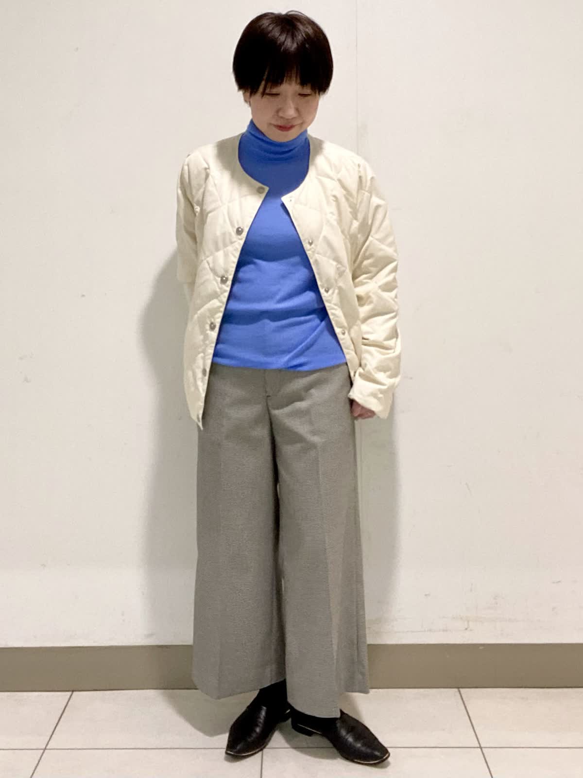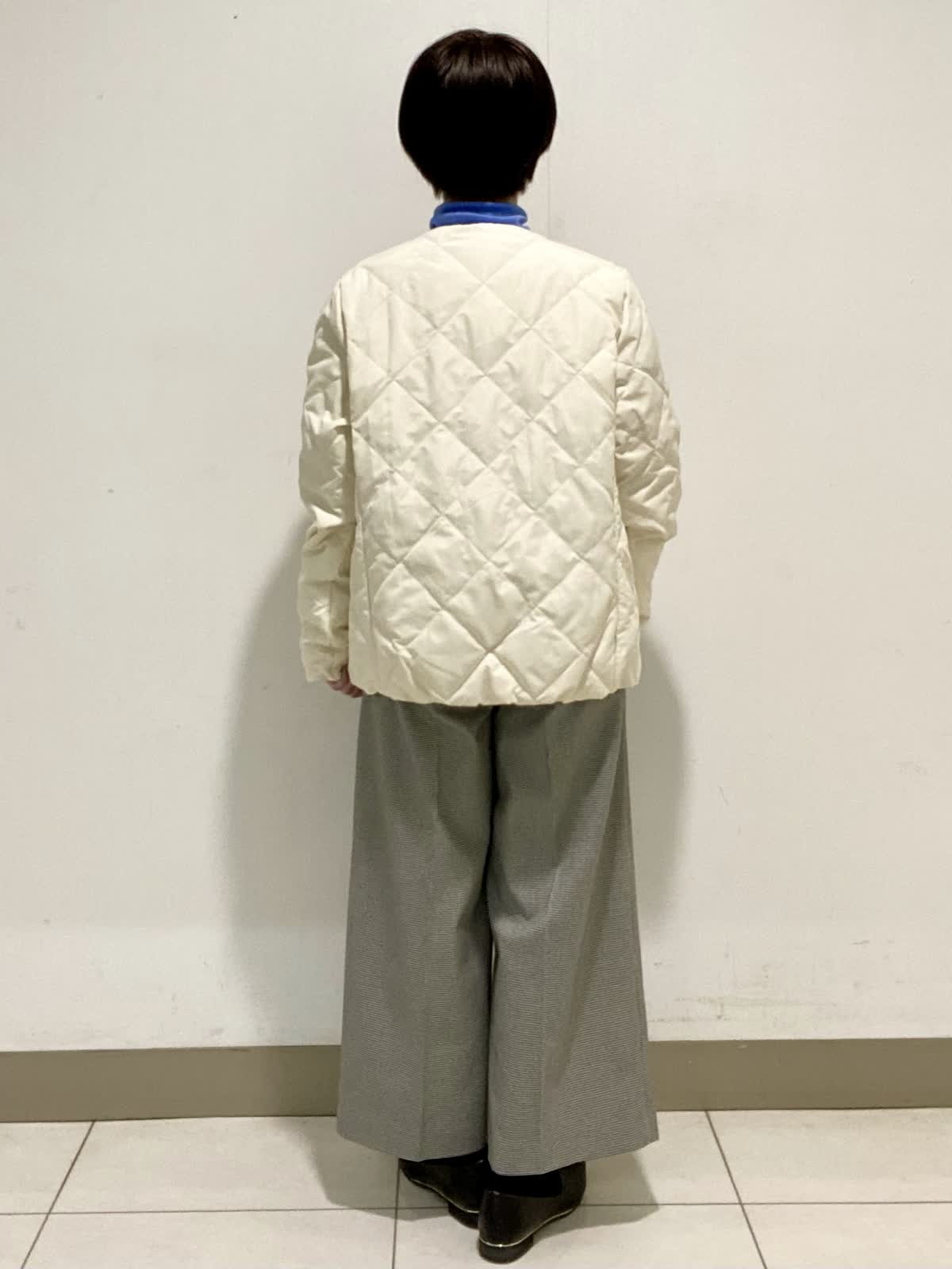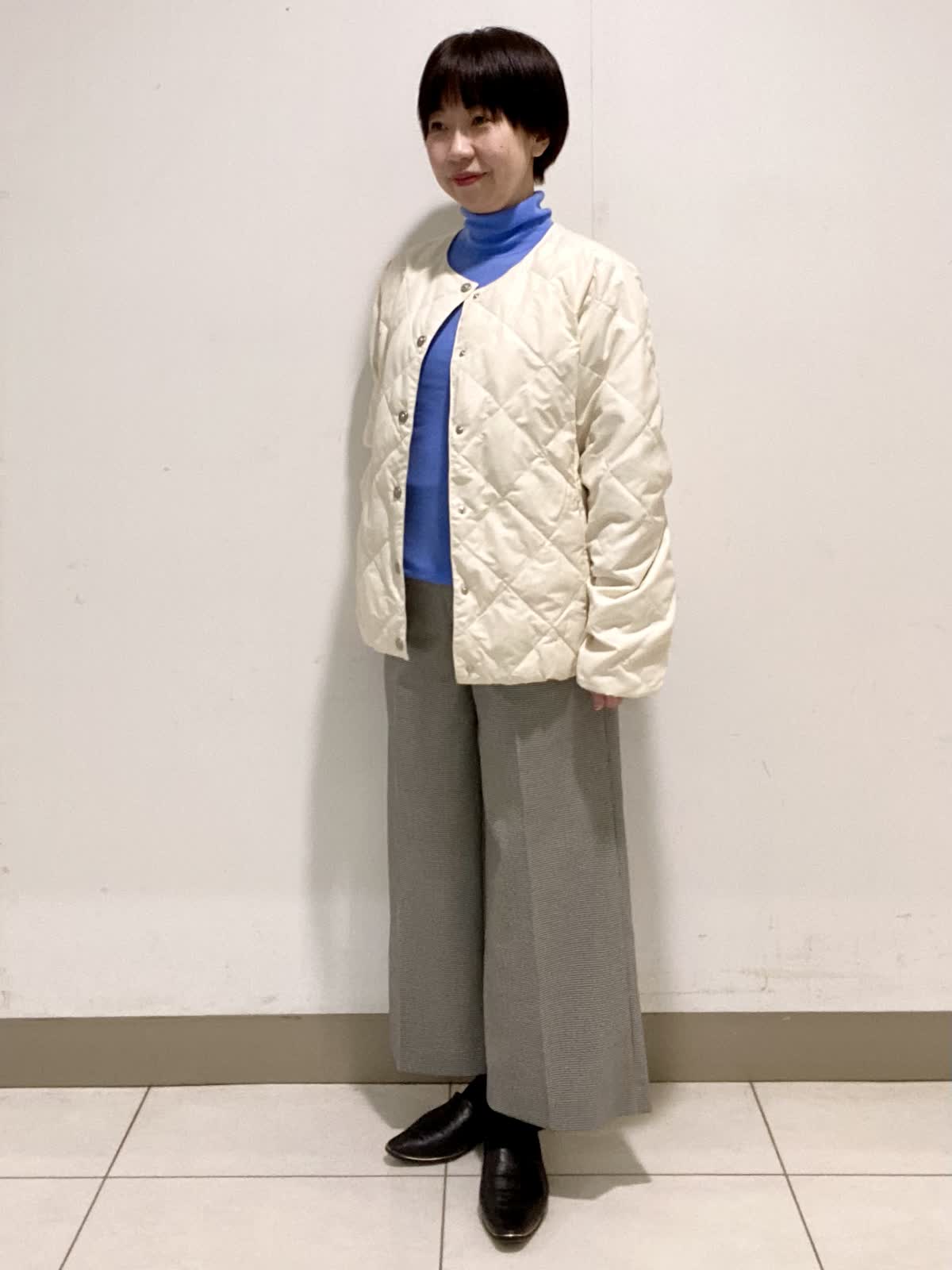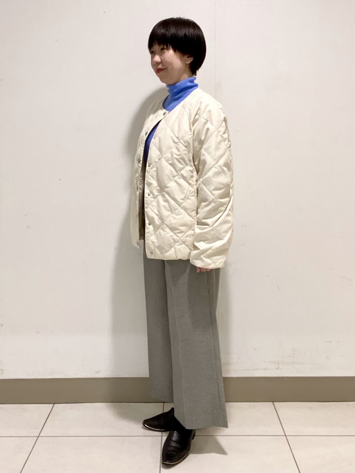 【着用サイズ】ジャケット:9号 ニット:フリー パンツ9号 TAIONとのコラボレーションダウンジャケットはシンプルなデザインで程よいサイズ感が◎。ボリュームを抑えているのでインナーダウンとしても使いやすく持っていると大活躍のアウターです。ウール100%のハイネックニットは軽いのに暖かく着心地抜群。色違いで欲しくなる1枚です。スッキリとしたシルエットのワイドクロップトパンツはソフトな肌触りで履き心地◎。これからの季節はブーツと合わせてオシャレを楽しめます。