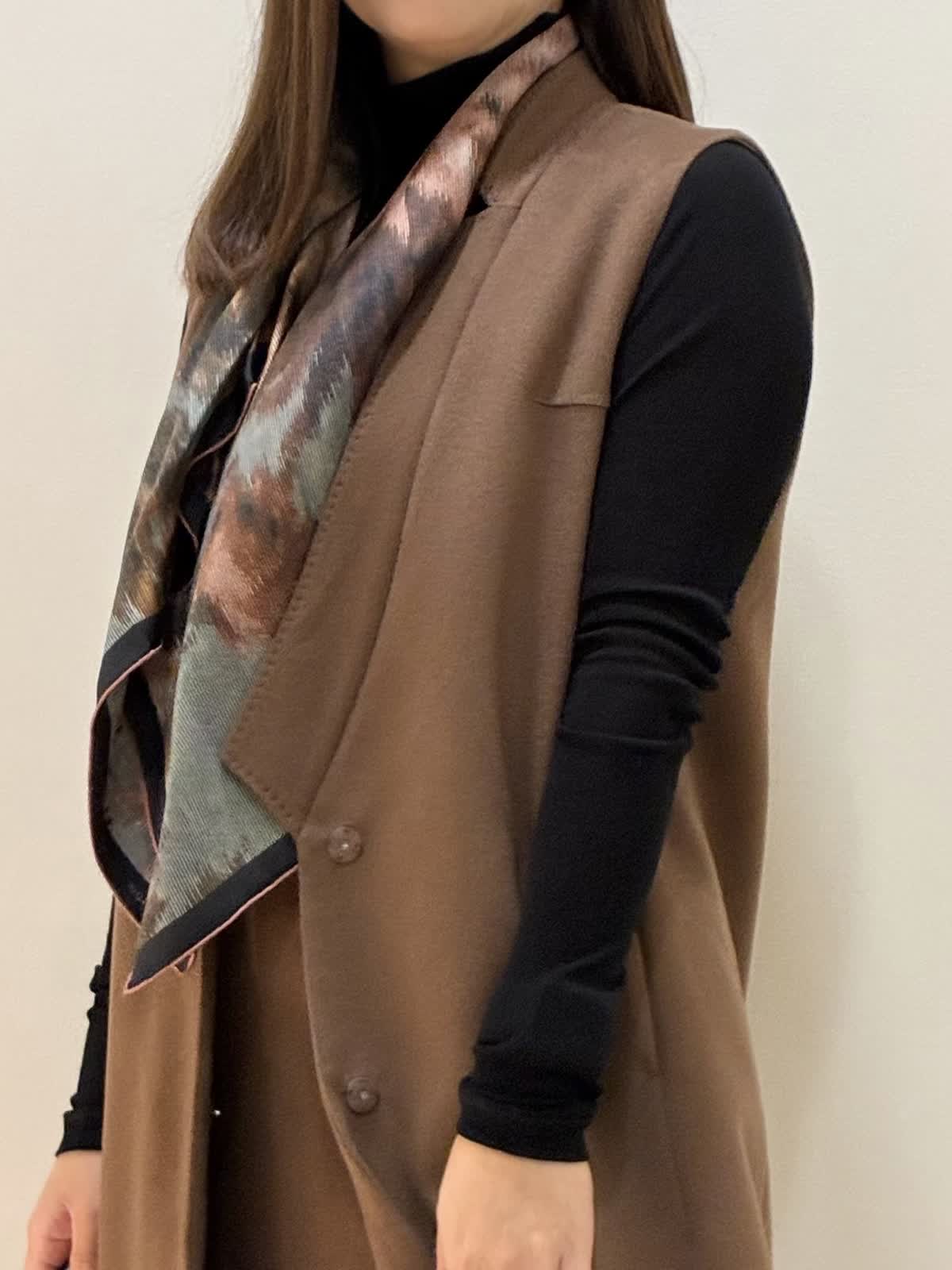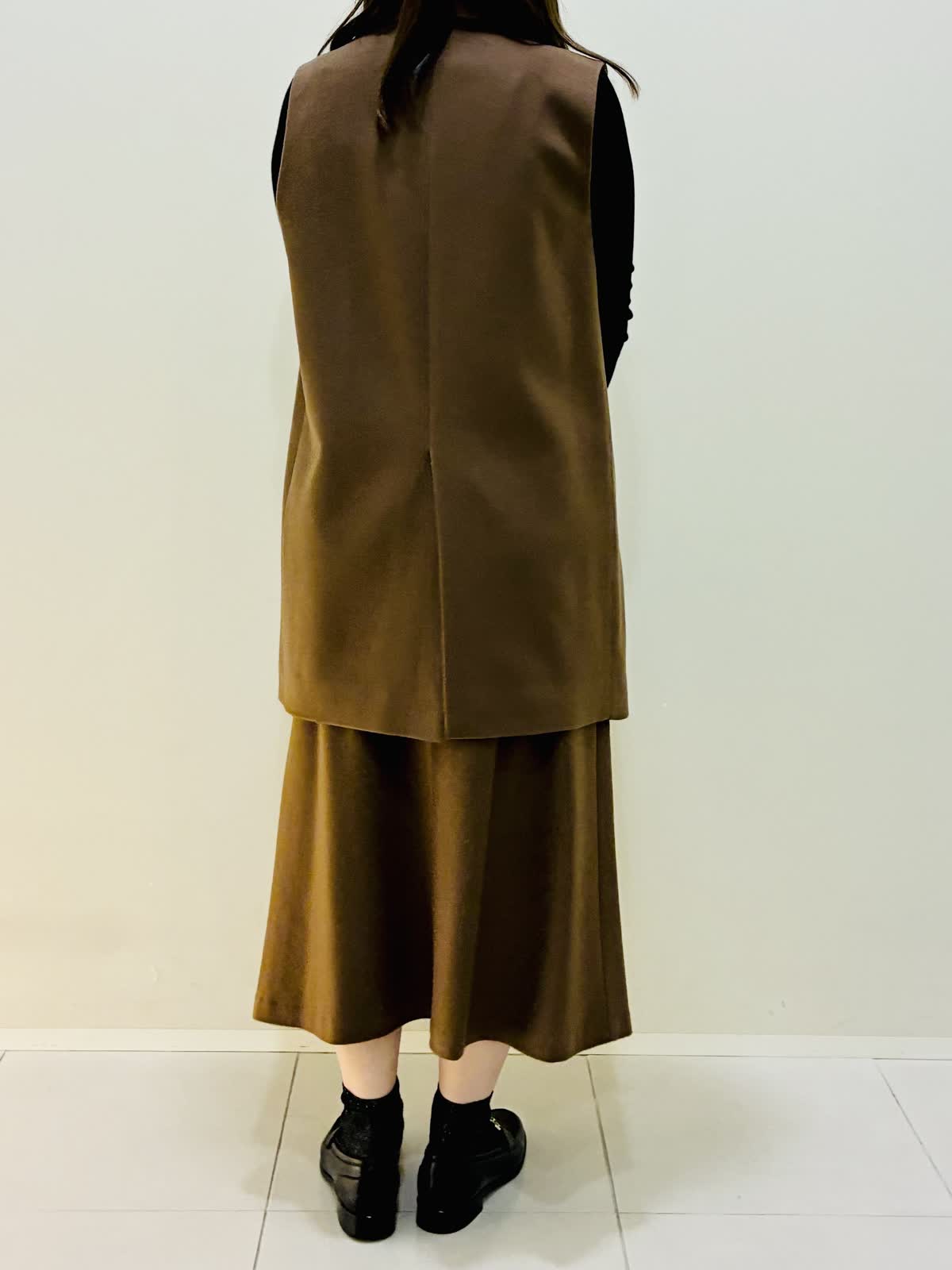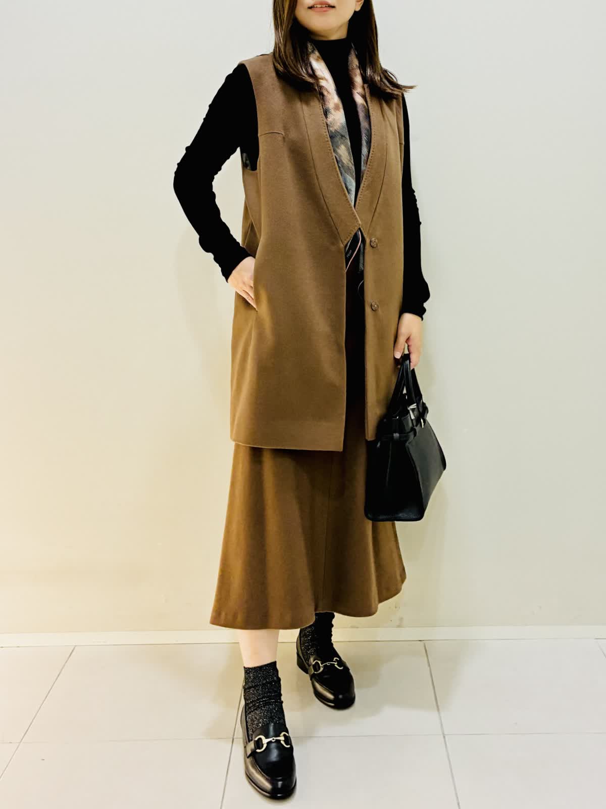 【着用サイズ】 ジレ:キンチャ:9号サイズ スカート:キンチャ:9号サイズ ニット:ブラック:9号サイズ バッグ:ブラック スカーフ:ブルー 『セットアップスタイリング』 ゴールデンブラウンの深みのあるカラーに縦線を強調するスッキリとしたラインのセットアップです。? 低ヒールでもスタイリッシュにきこなせます。 カシミヤ素材で薄手でも保温性があり軽いのでストレスなく着れます。 スカーフのビンテージな色味がブラウンと合います。