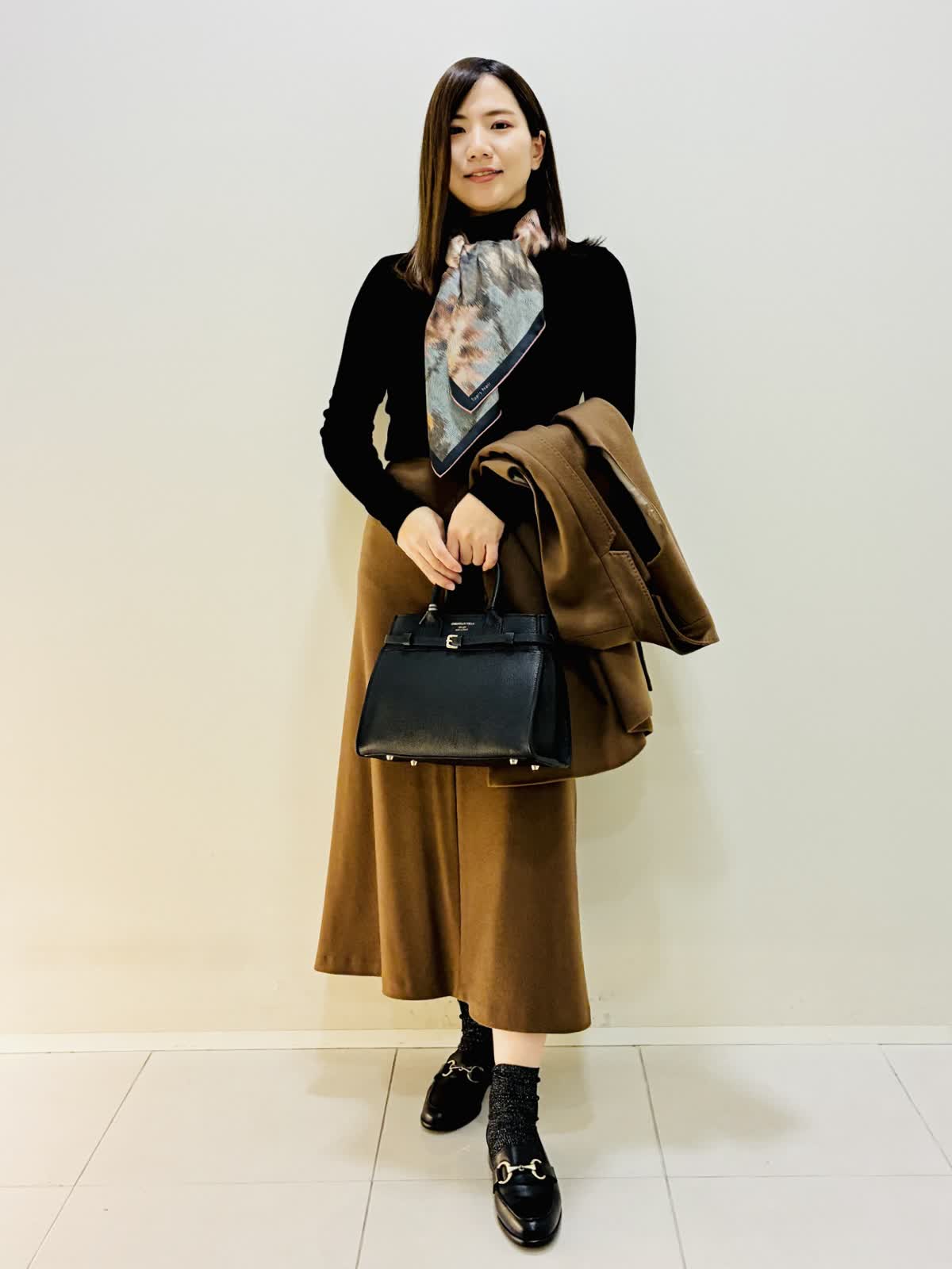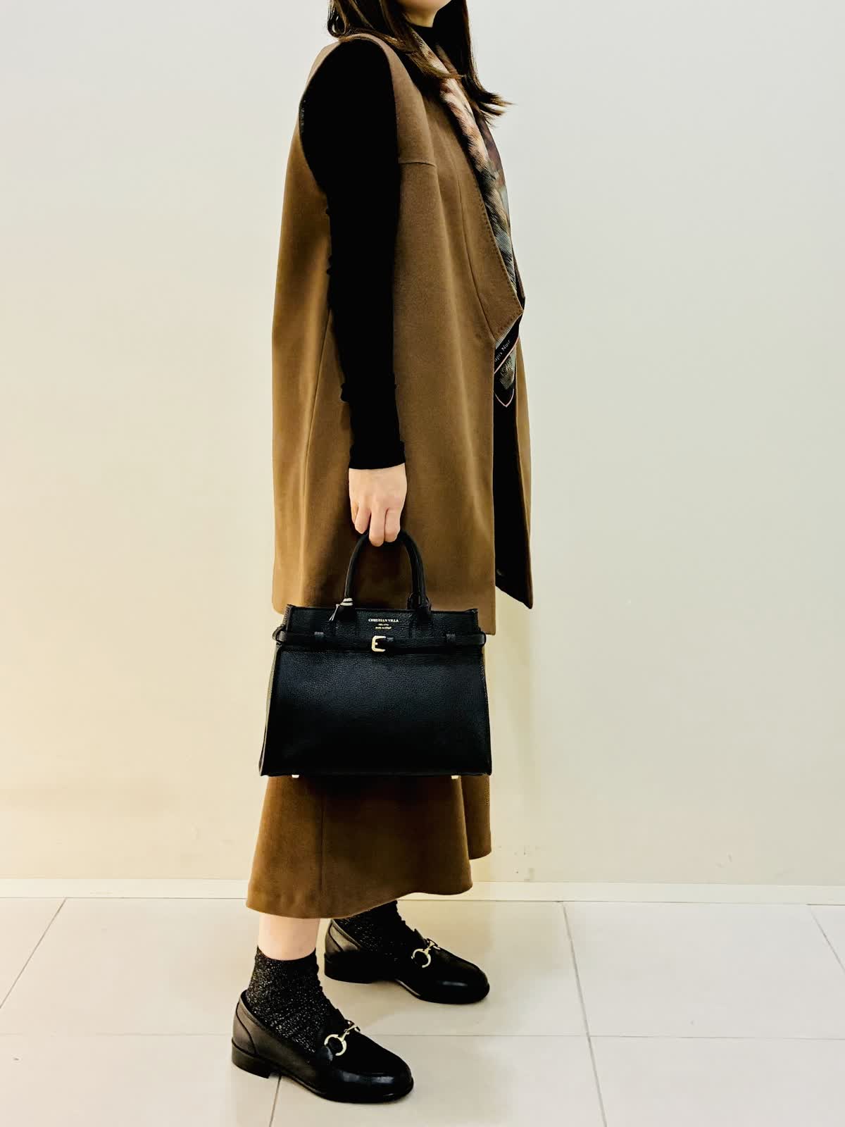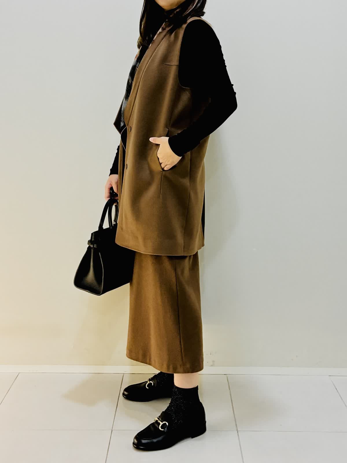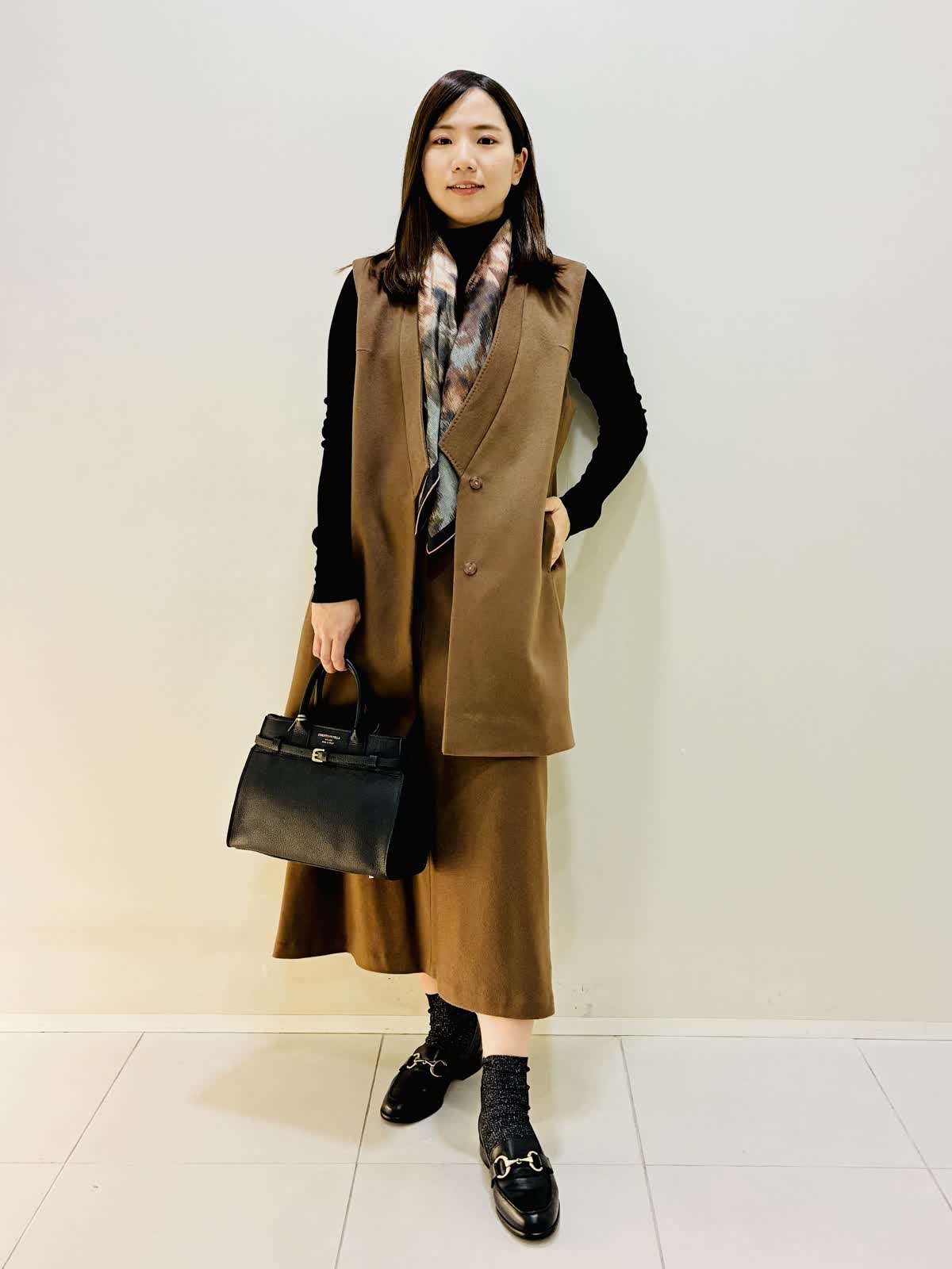 【着用サイズ】 ジレ:キンチャ:9号サイズ スカート:キンチャ:9号サイズ ニット:ブラック:9号サイズ バッグ:ブラック スカーフ:ブルー 『セットアップスタイリング』 ゴールデンブラウンの深みのあるカラーに縦線を強調するスッキリとしたラインのセットアップです。? 低ヒールでもスタイリッシュにきこなせます。 カシミヤ素材で薄手でも保温性があり軽いのでストレスなく着れます。 スカーフのビンテージな色味がブラウンと合います。