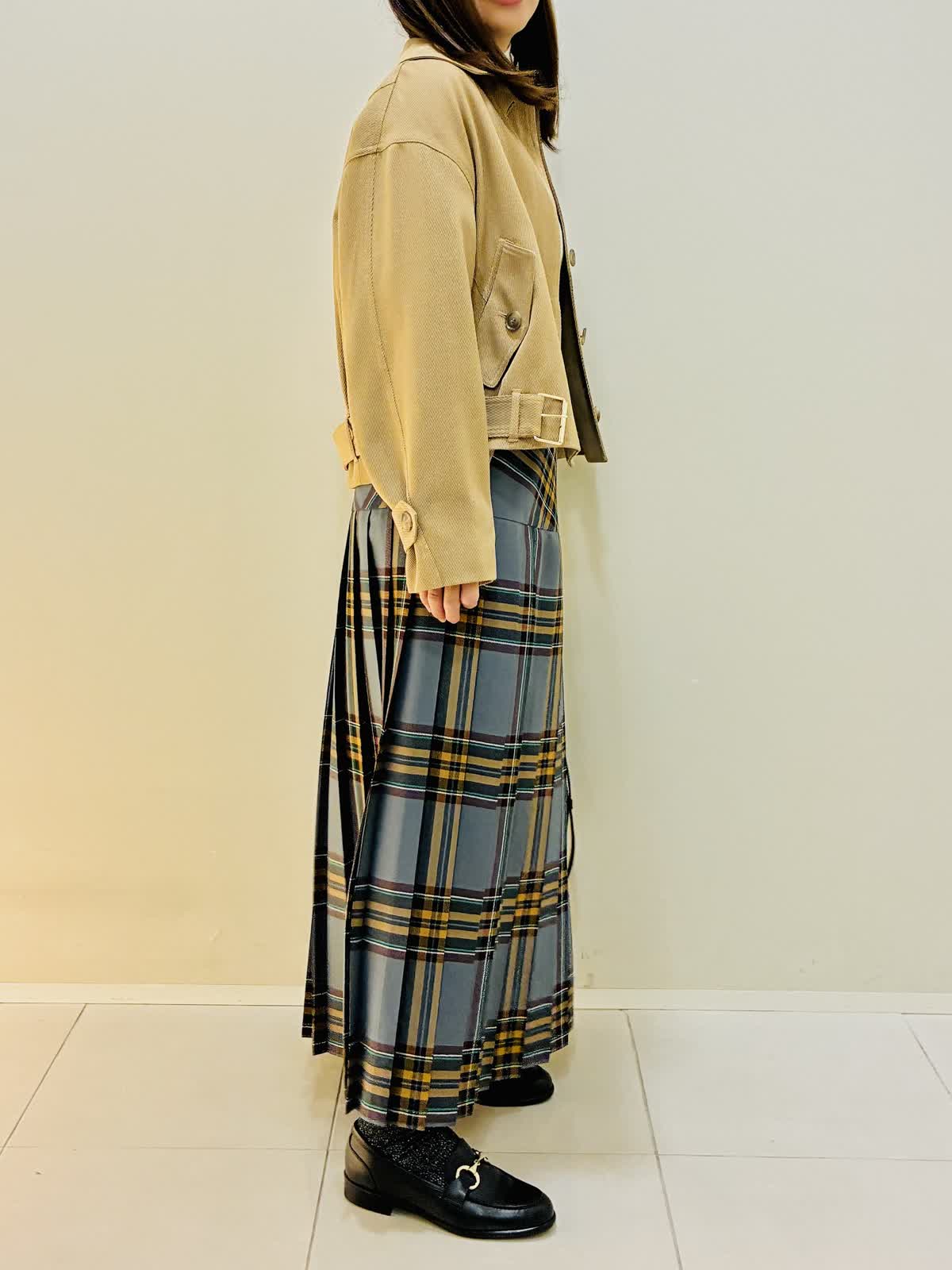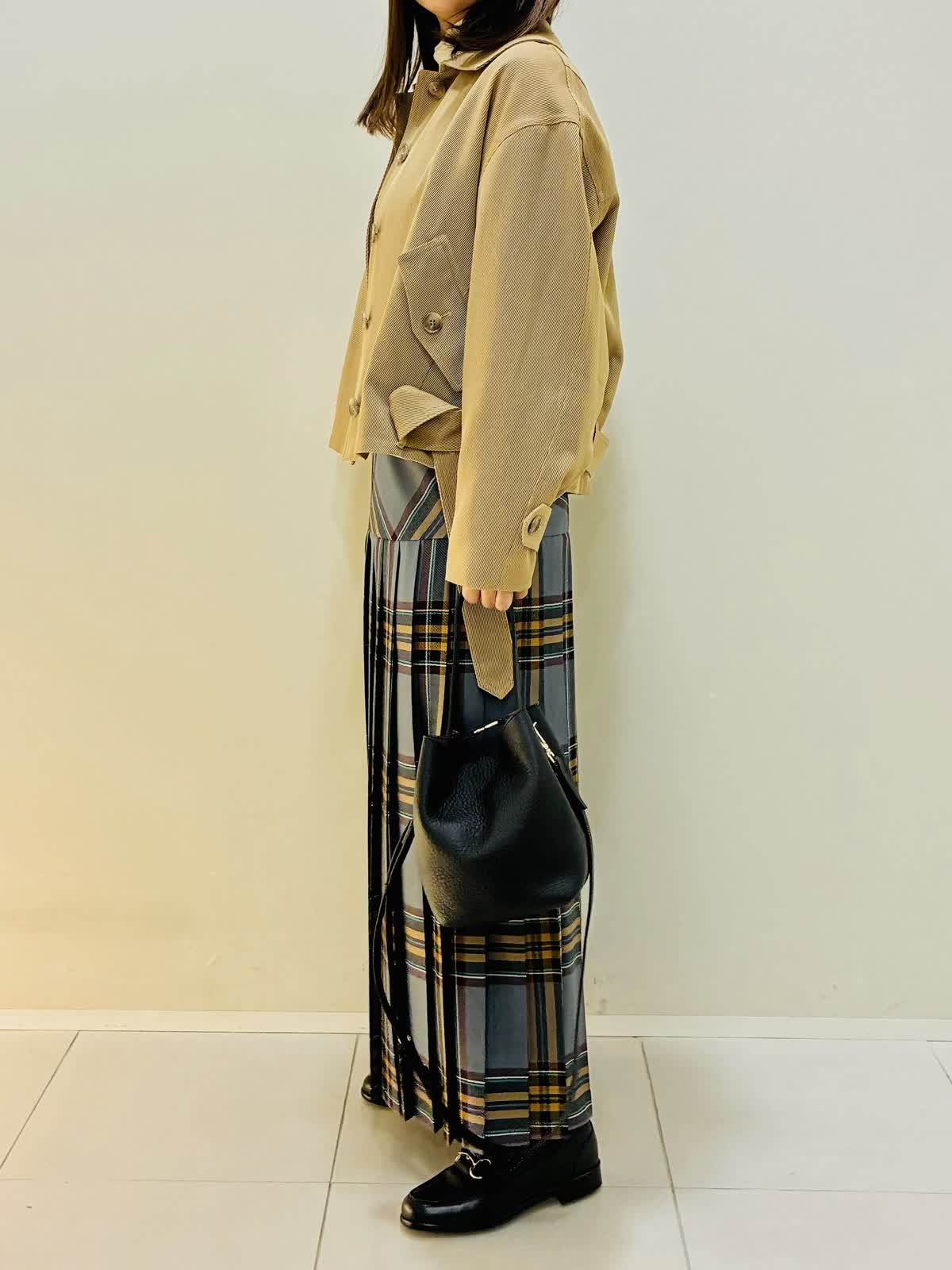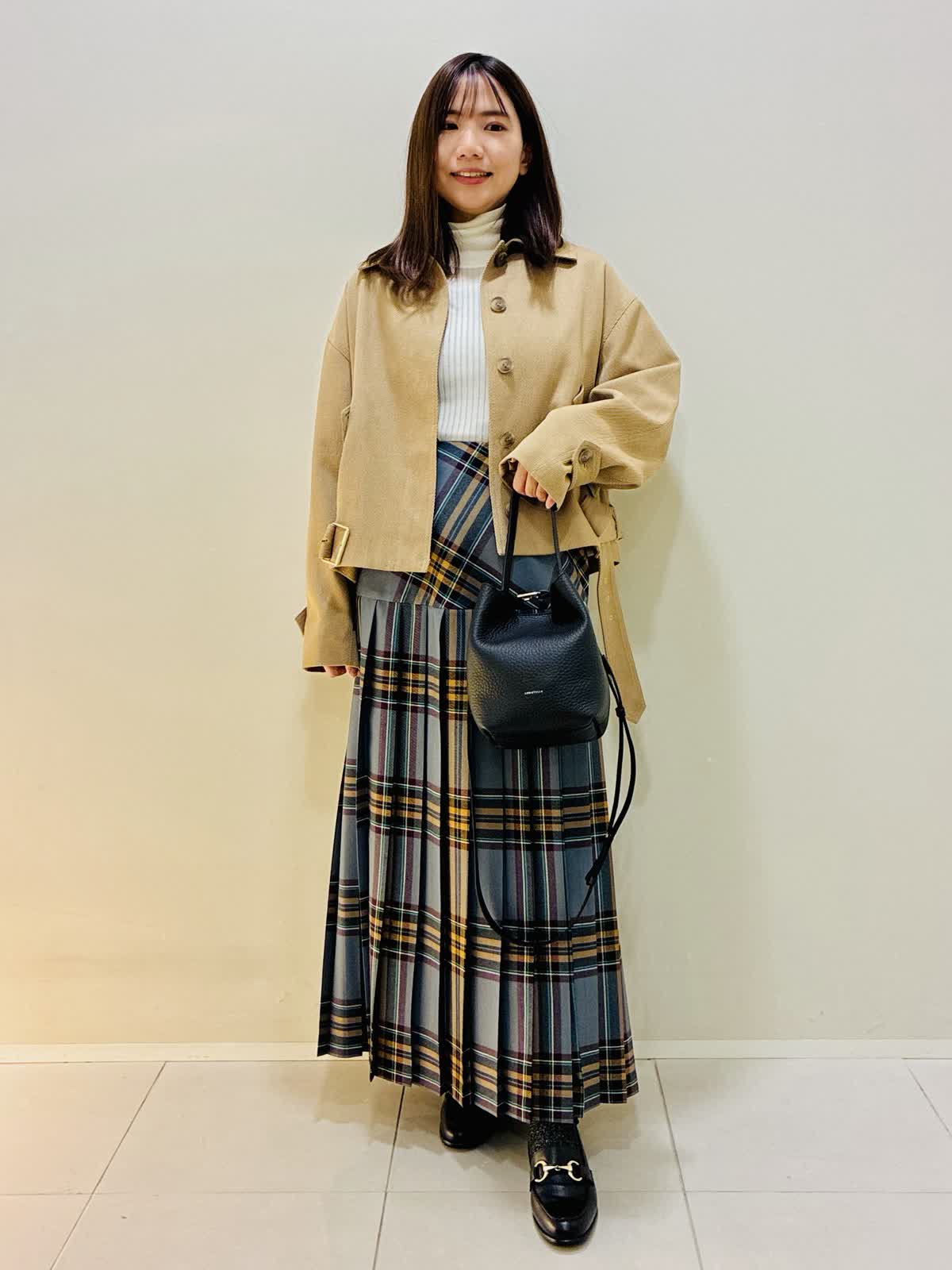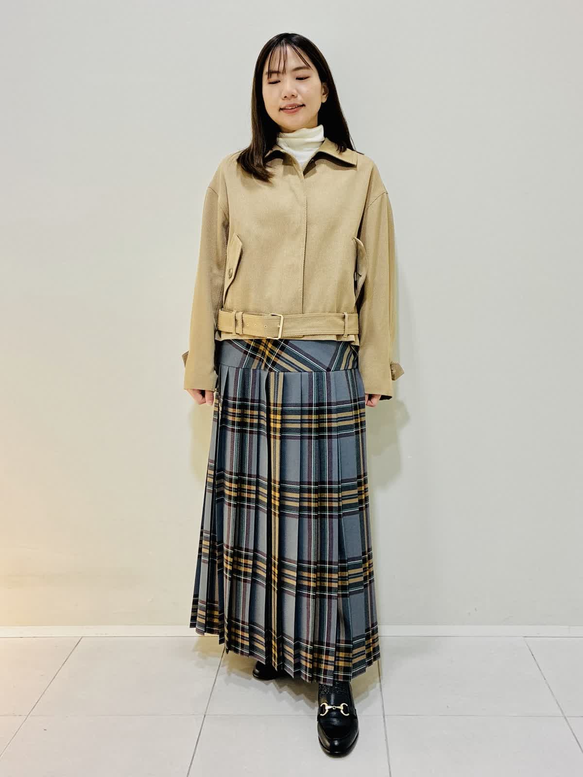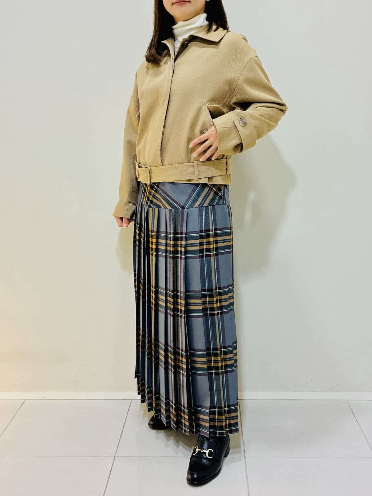 【着用サイズ】 ブルゾン:ベージュ:9号サイズ ニット:グレーベージュ:9号サイズ スカート:ブルーグレー:9号サイズ バッグ:ブラック ローファー:23.5セcm 『キレイめブルゾンスタイリング』 ブルゾンはしっかりした生地なので暖かく着れます。ゆったりしているので、厚手なニットも中に着れそうです。 袖口はボタンの位置で絞れます。 スカートは大きめチェックでキレイなプリーツが特徴です。ウエストラインは気にならないデザインです。 タートルニットは首と手首がオフホワイトのバイカラーになっているのがかわいいです。