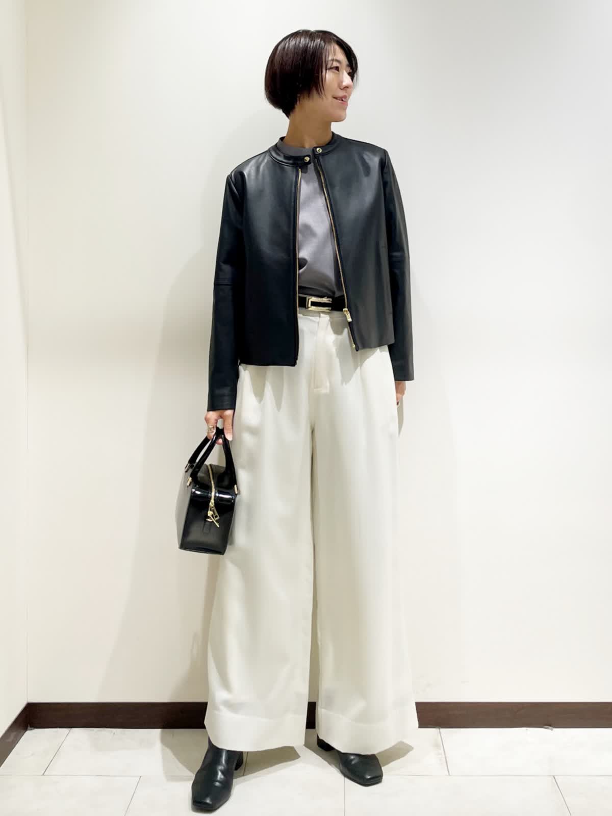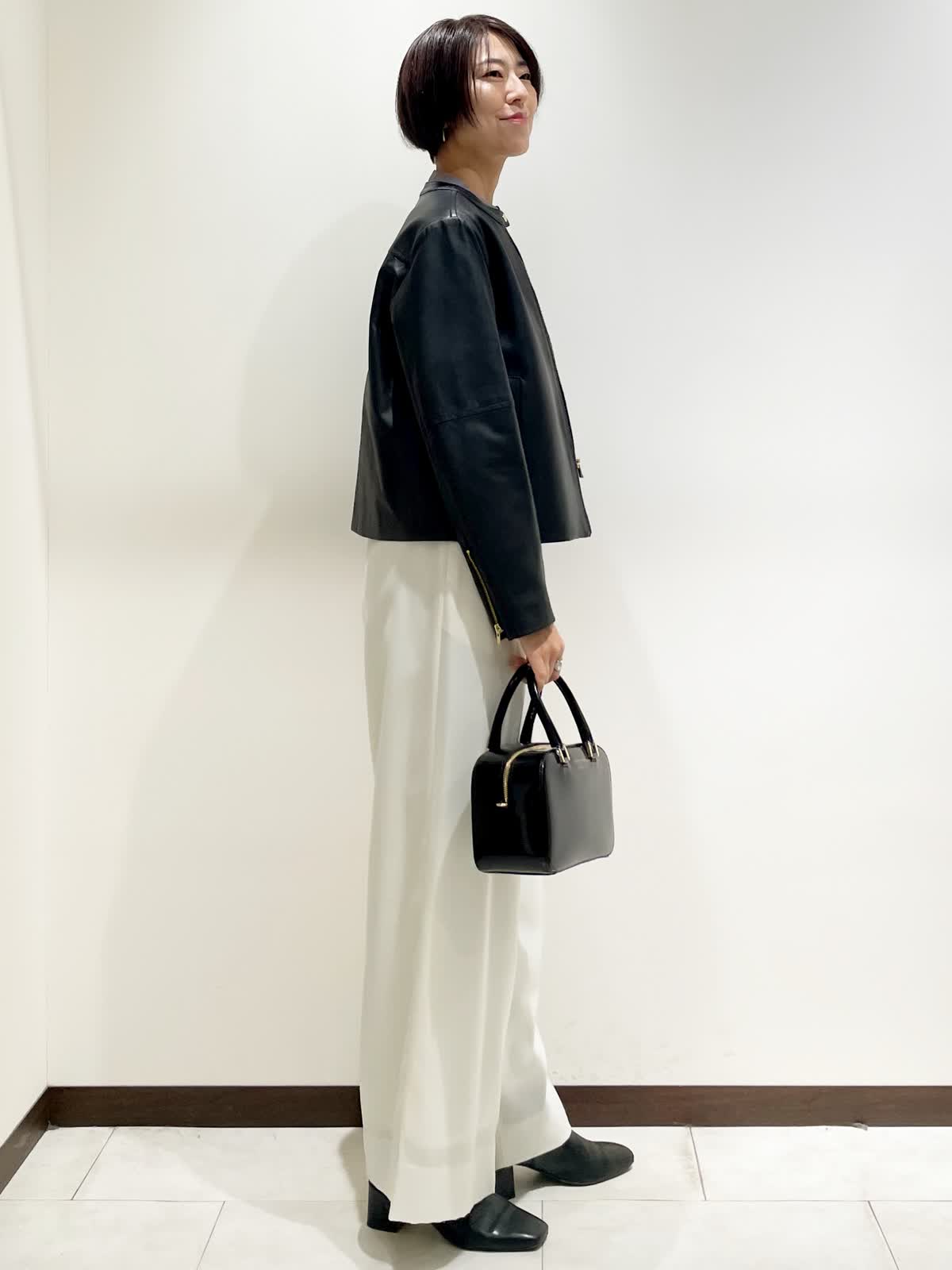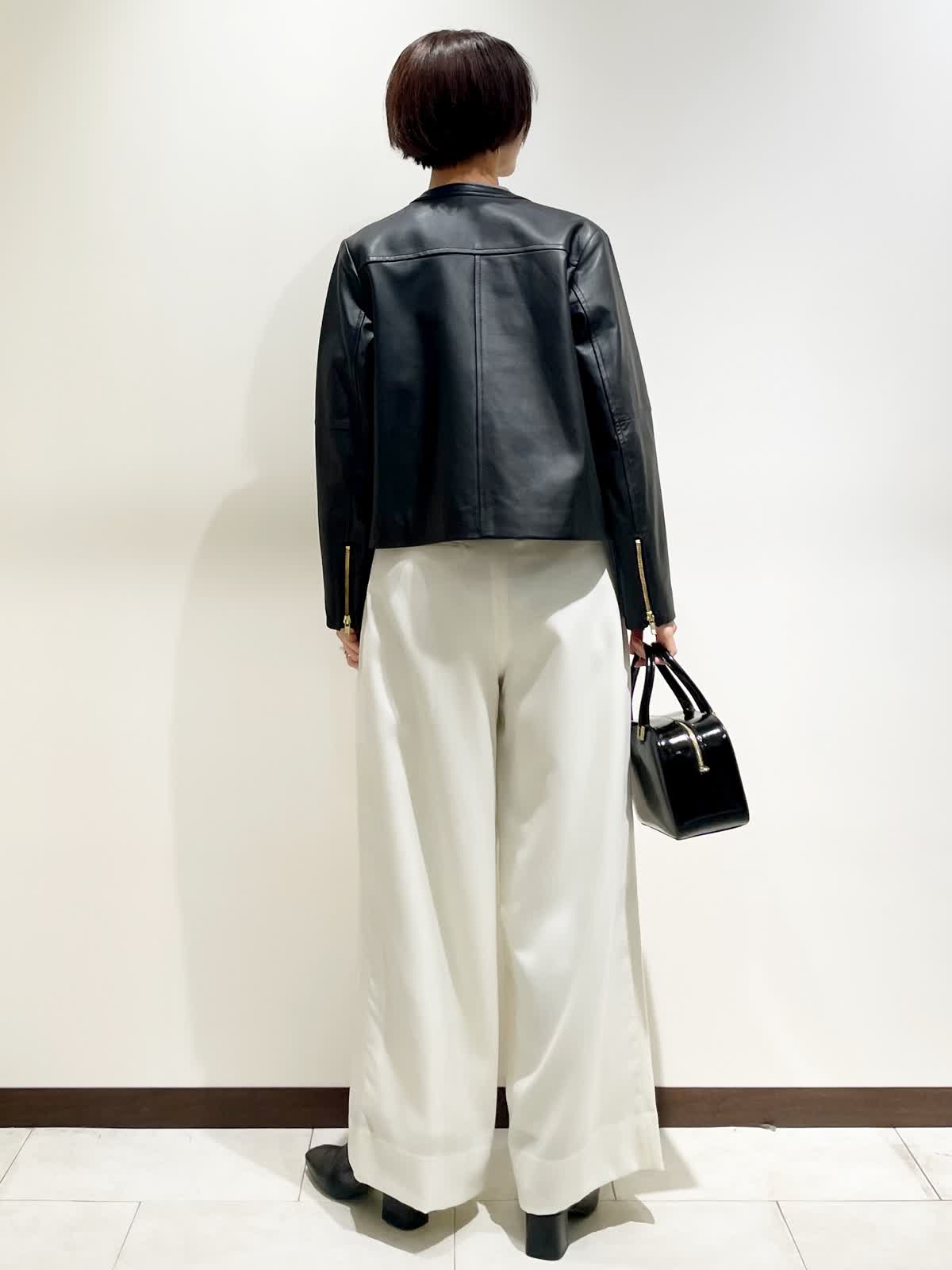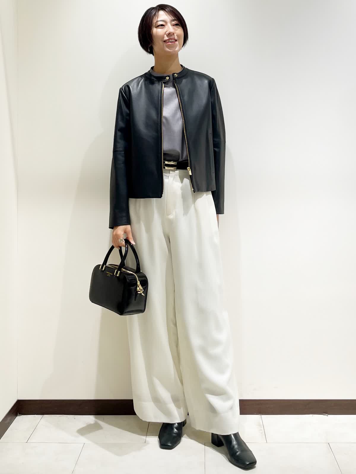 【着用サイズ】全て9号 【カラー】レザーブルゾン:ブラック パンツ:ホワイト ブラウス:グレー バック:ブラック ベルト:ブラウン(リバーシブル仕様ブラック) 【コーディネートテーマ】 ミニマルな大人ライダースブルゾンコーデ 【サイズ感】 レザーブルゾン:標準 程よく緩さがあるのでニットやパーカーをインナーに着れます。 ブラウス:コンパクトに見えて腕周りはゆとりがあるので楽に着れます。 パンツ:標準 いつものおサイズでお選びください。 163p 普段9号サイズ 骨格ウェーブで上半身に比べてヒップがやや大きい