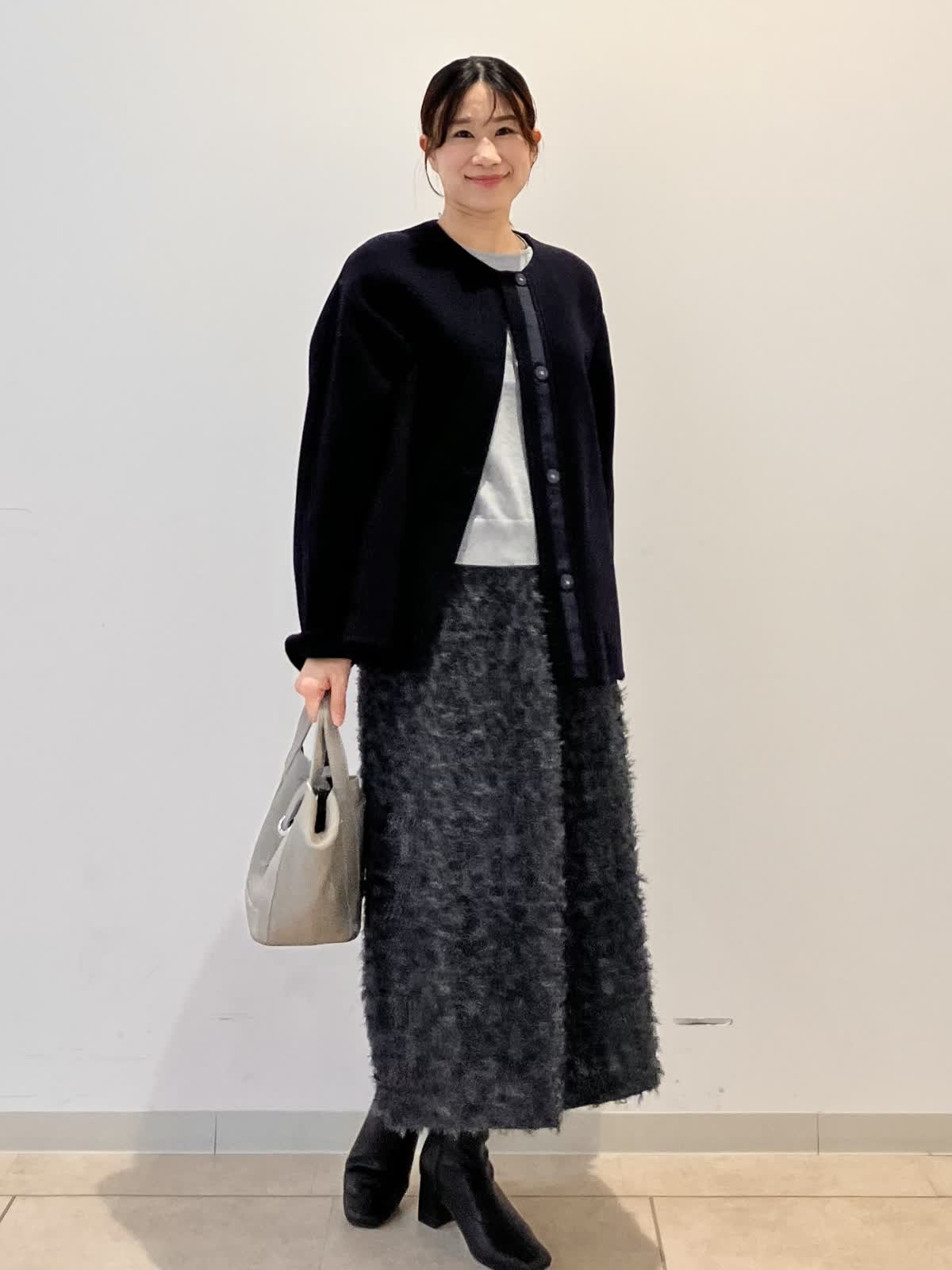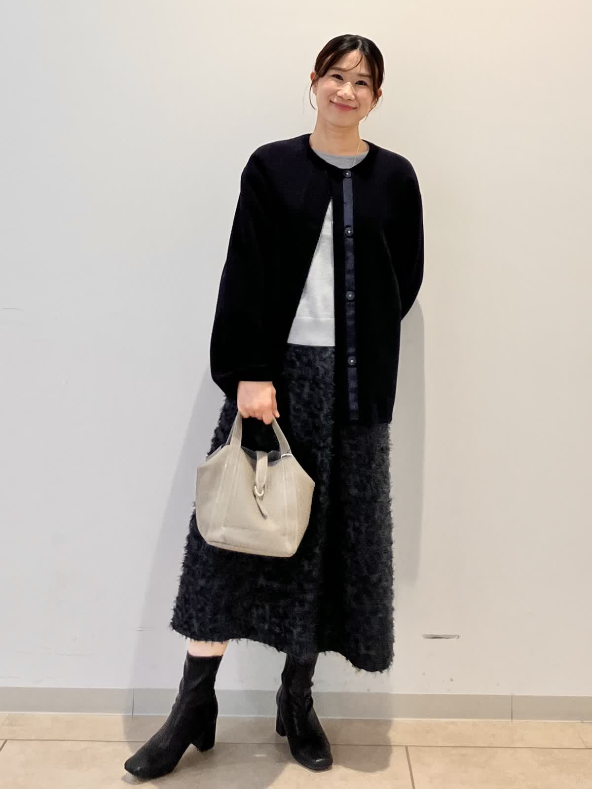 【着用サイズ】カーディガン:フリー カットソー:フリー スカート:9号 「シックな大人アウターコーデ」 どの場面にもオススメカラーなネイビーのアウター。そしてこの丈感、パンツでもスカートでもワンピースでも◎着たままでも動きやすい万能アウターです!柔らかなウール素材でとても軽い! 前を開けても留めても様になる使いやすいアウターです。