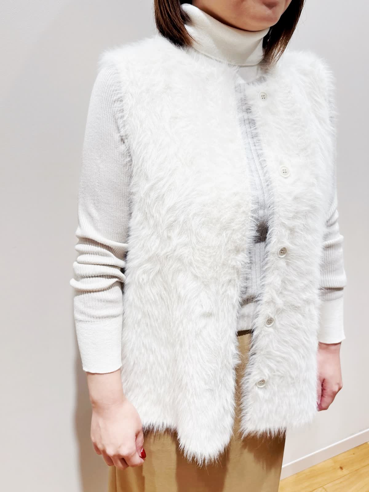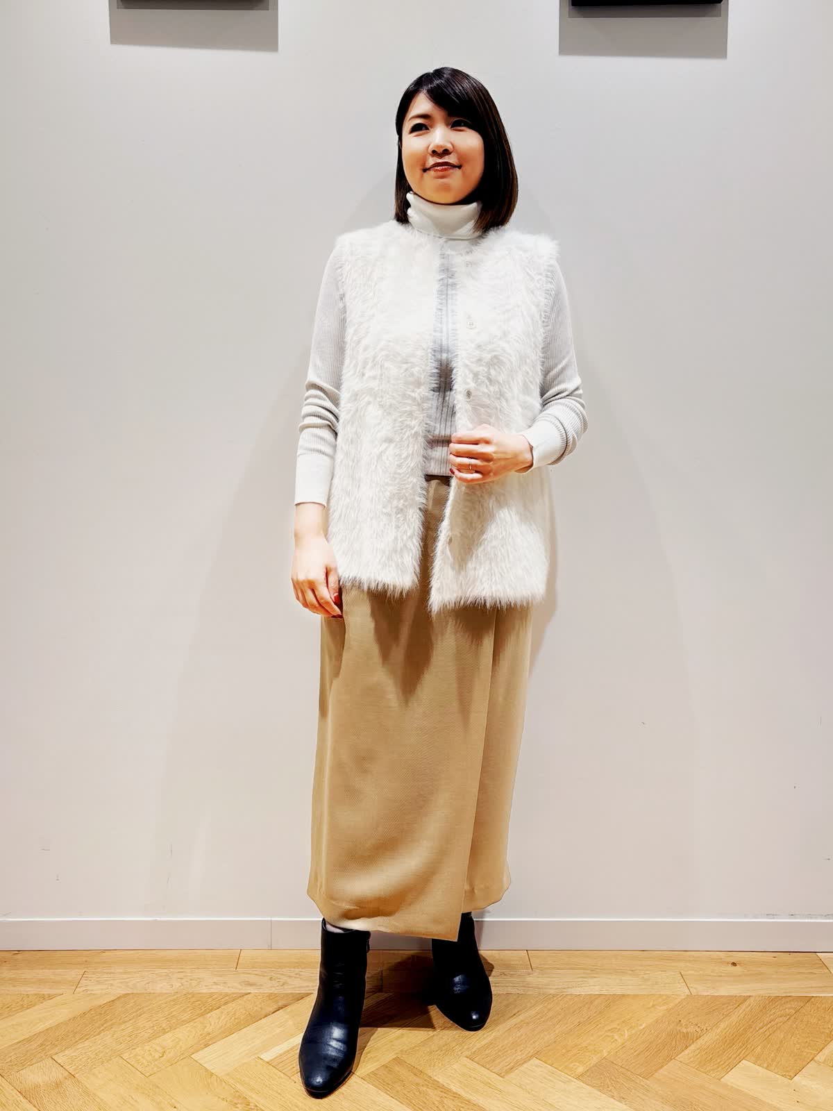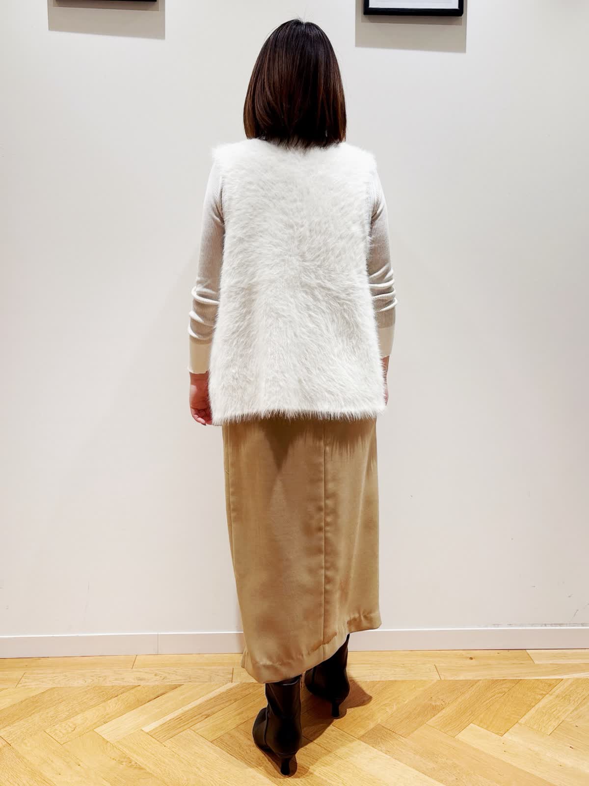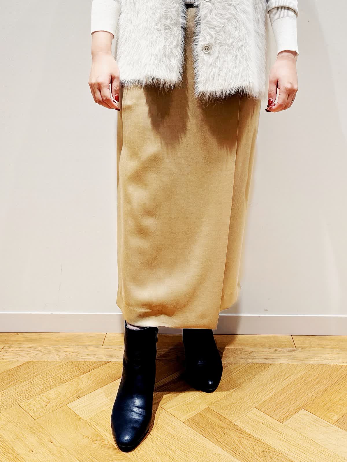 【着用サイズ】全て9号 【着用カラー】ジレ:オフホワイト ニット:グレーベージュ スカート:ベージュ 秋のお出かけコーディネート。今年トレンドのファージレ。しっかりふわふわ感がありながら着膨れしないデザインです。軽い着心地で毛の抜けも気にならないです。スカートはサラッとした素材ですが、適度なハリ感がある、大人上品にも着こなしができるスカートです。ややタイトですが、スリットがあるので動きやすいです。低身長の方でも挑戦しやすい丈感です。