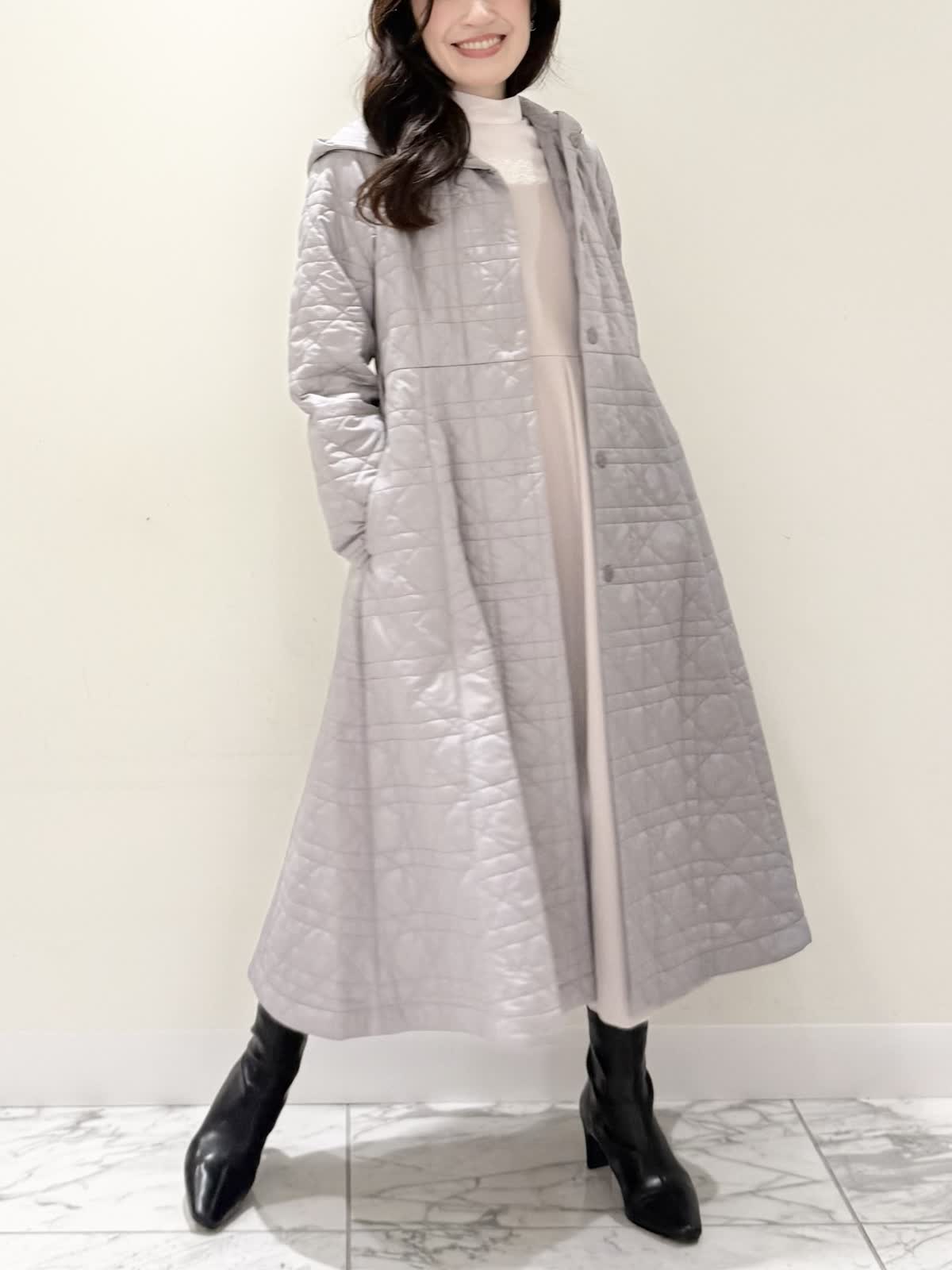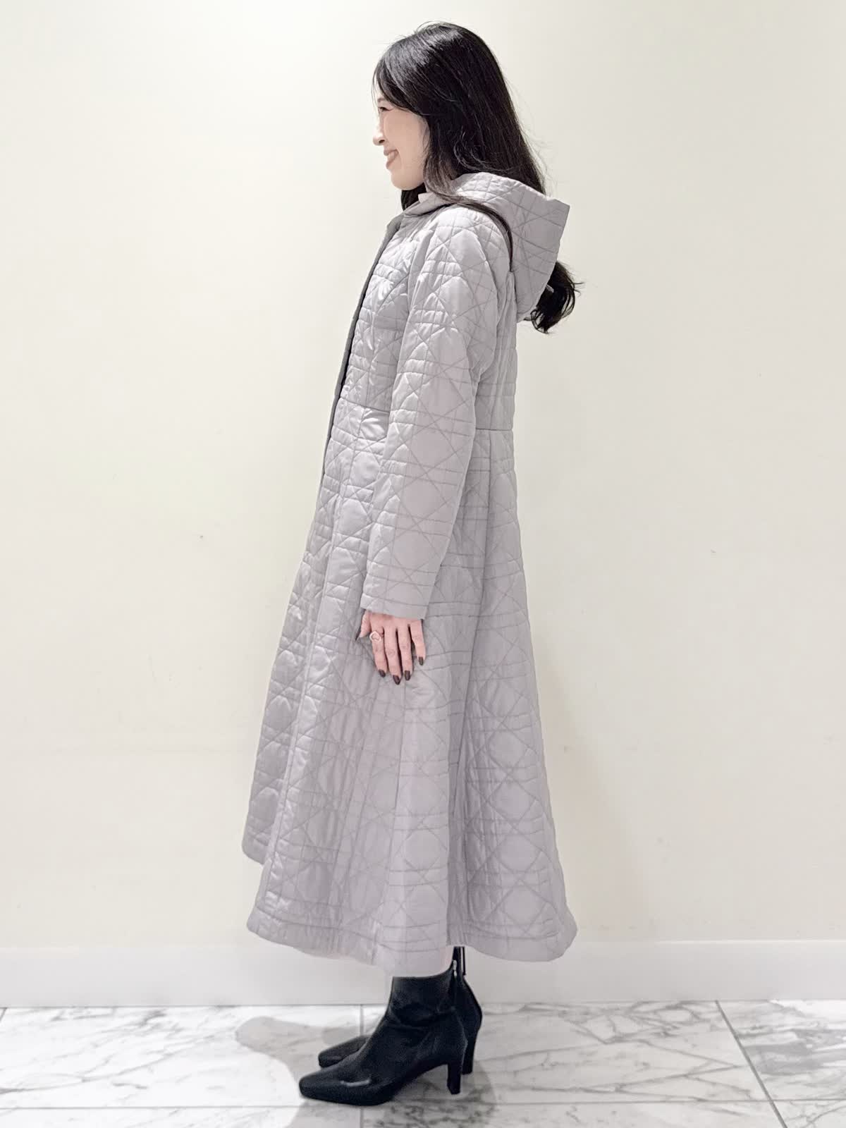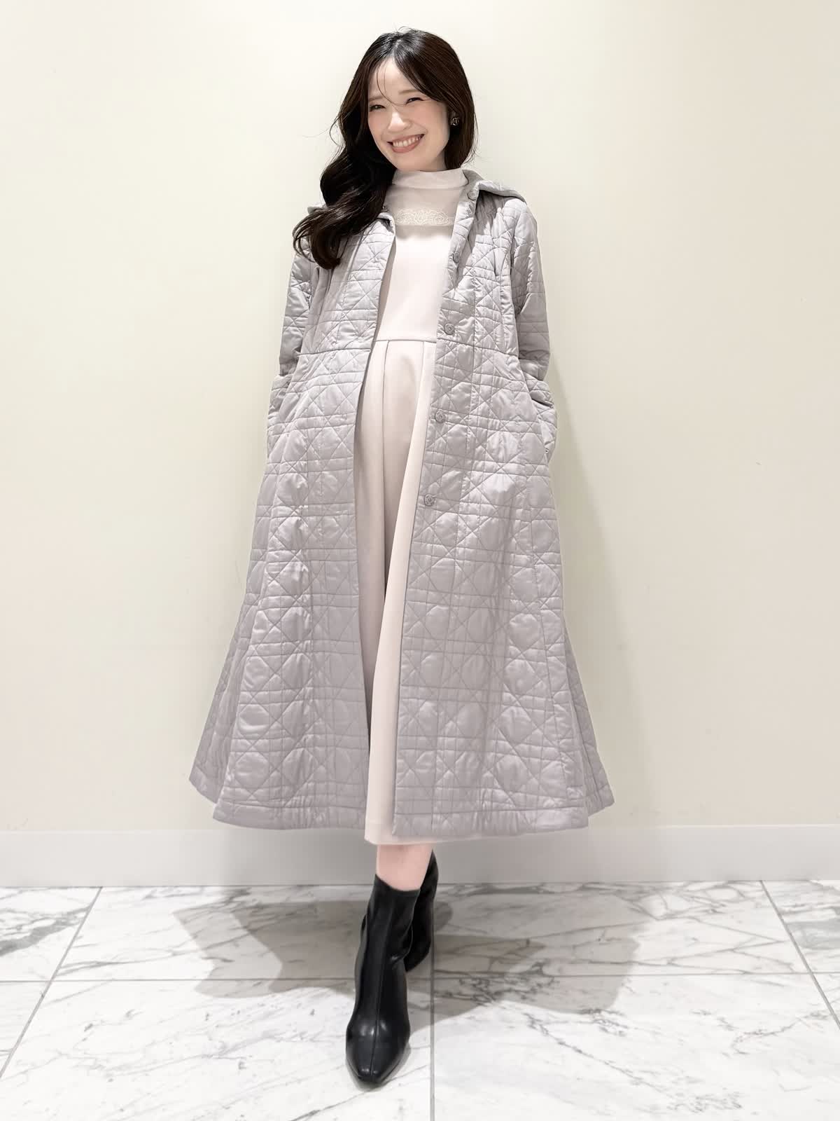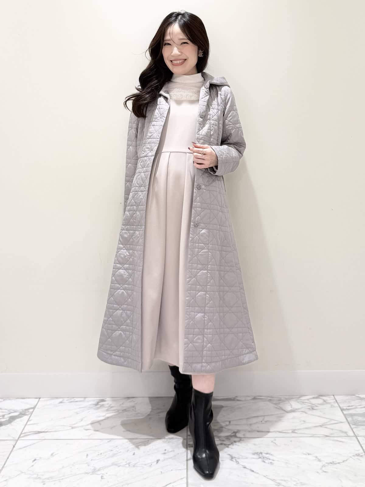 【着用サイズ/カラー】全て:7号 トーンを合わせた大人可愛いコーディネート♪ 360℃美シルエットのアウターは幾何学柄のオリジナルキルティング生地のロング丈フーディーコート。ベージュは同色のプレーンステッチで上品に仕上げた1着。ウエストをベルトでキュッと絞るとフィット&フレアの綺麗なシルエット。腕周り、アームホールは程よいゆとりがあるのでニットの上からでも着られます。ジャケットの上から羽織りたい方は1サイズ大きめなおすすめです。ロング丈でもとても軽く羽織れるので、デイリー使いもしやすいです。合わせは人気のフラワーモチーフワンピースにシアーレースブラウスのコーディネート。ワンピースは高め切り替えからのタック入りでボリューム出過ぎないフレアシルエット。表地はサラサラとしており、やや伸縮性を感じる生地で着心地◎計算された位置のフラワー刺繍がポイント。7号着用で程よいゆとりがありました。ジャストで着たい方はいつものサイズを、程よいゆとりが欲しい方は1サイズ大きめでも良いかと思います。インナーはレース使いが綺麗なブラウス。ハイネックしすぎず、ネック周りは余裕があるので窮屈感なく着られます。裏地はなく、表地にしっかりとした薄手のオーガンジーを生地を合わせた2枚仕立てなので、透け感は緩和されますが淡い色味なので同色系のインナーを着るのが良いかと思います。