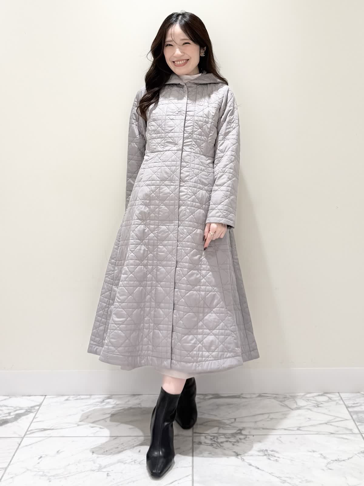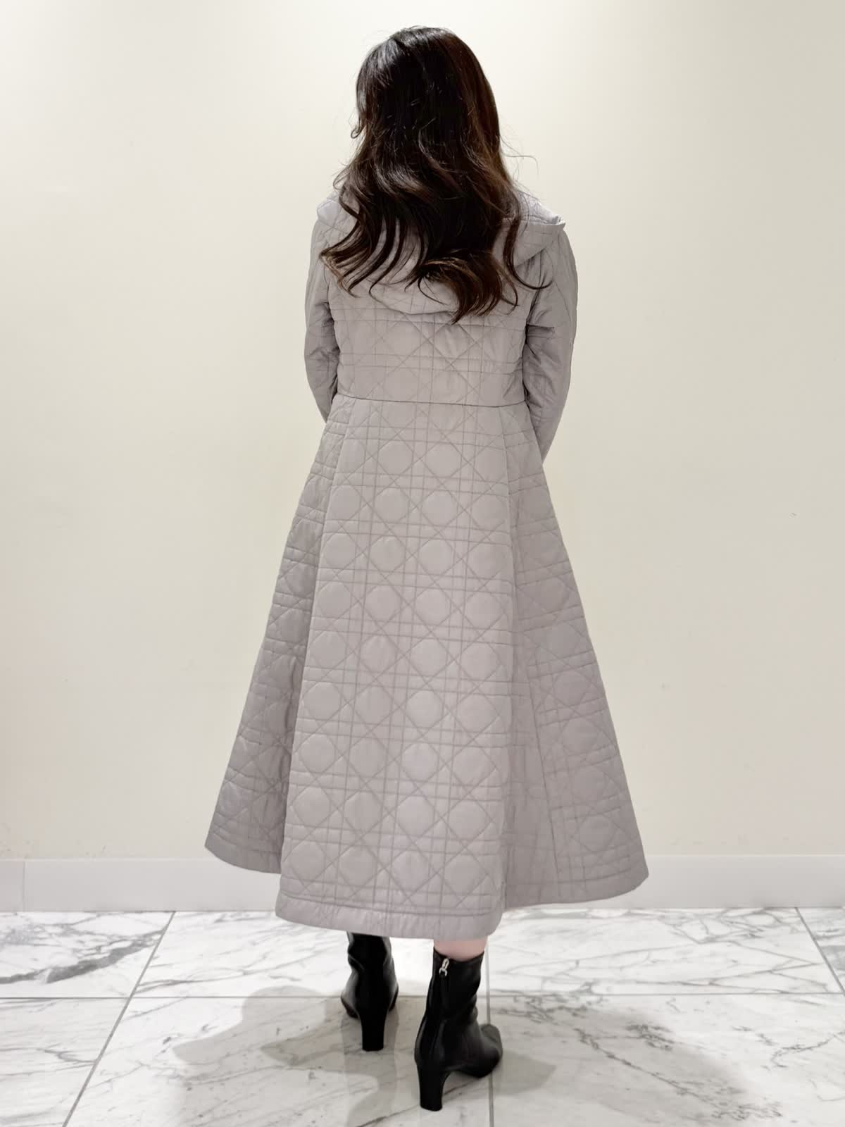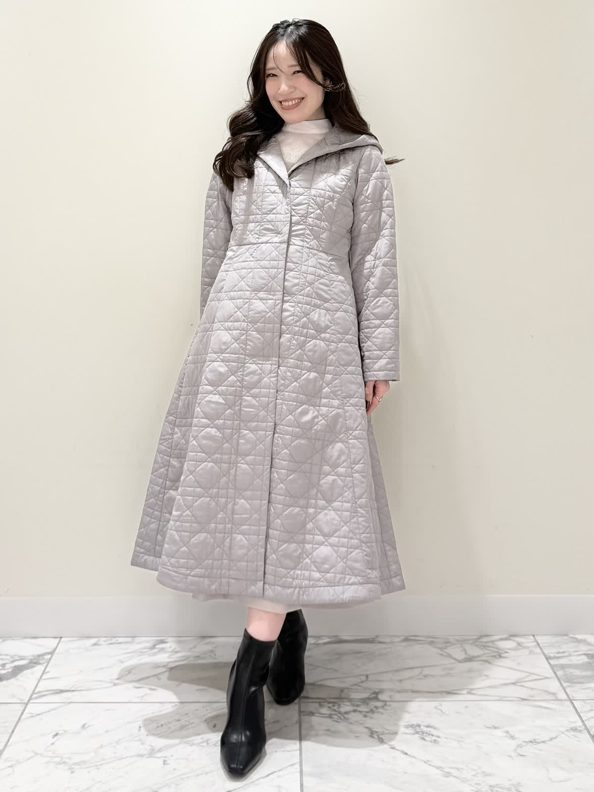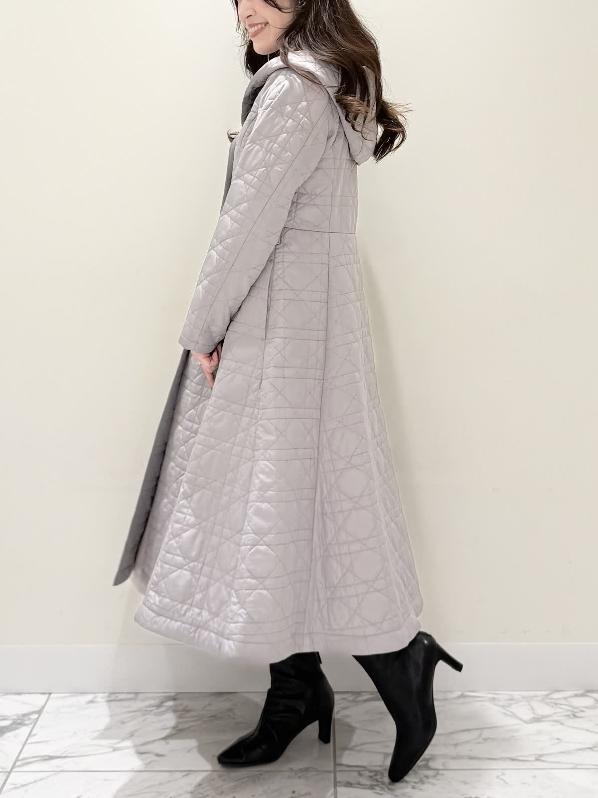 【着用サイズ/カラー】全て:7号 トーンを合わせた大人可愛いコーディネート♪ 360℃美シルエットのアウターは幾何学柄のオリジナルキルティング生地のロング丈フーディーコート。ベージュは同色のプレーンステッチで上品に仕上げた1着。ウエストをベルトでキュッと絞るとフィット&フレアの綺麗なシルエット。腕周り、アームホールは程よいゆとりがあるのでニットの上からでも着られます。ジャケットの上から羽織りたい方は1サイズ大きめなおすすめです。ロング丈でもとても軽く羽織れるので、デイリー使いもしやすいです。合わせは人気のフラワーモチーフワンピースにシアーレースブラウスのコーディネート。ワンピースは高め切り替えからのタック入りでボリューム出過ぎないフレアシルエット。表地はサラサラとしており、やや伸縮性を感じる生地で着心地◎計算された位置のフラワー刺繍がポイント。7号着用で程よいゆとりがありました。ジャストで着たい方はいつものサイズを、程よいゆとりが欲しい方は1サイズ大きめでも良いかと思います。インナーはレース使いが綺麗なブラウス。ハイネックしすぎず、ネック周りは余裕があるので窮屈感なく着られます。裏地はなく、表地にしっかりとした薄手のオーガンジーを生地を合わせた2枚仕立てなので、透け感は緩和されますが淡い色味なので同色系のインナーを着るのが良いかと思います。