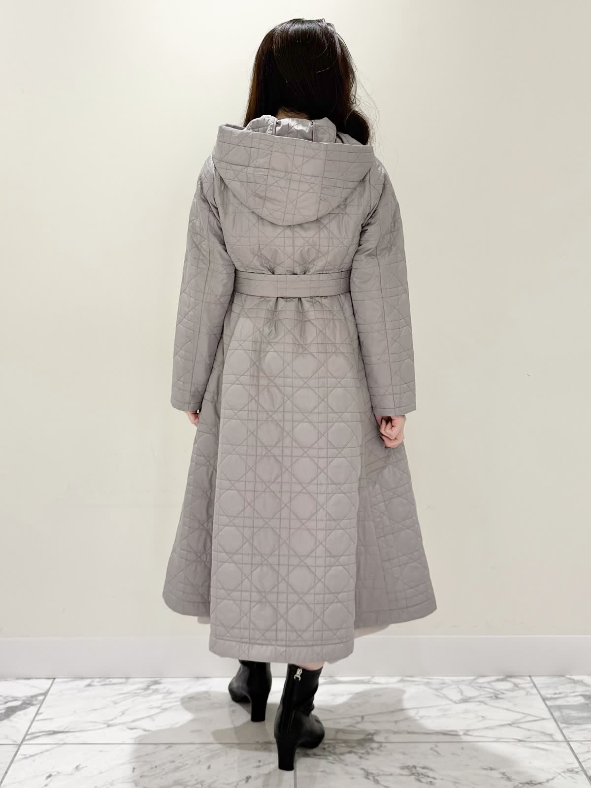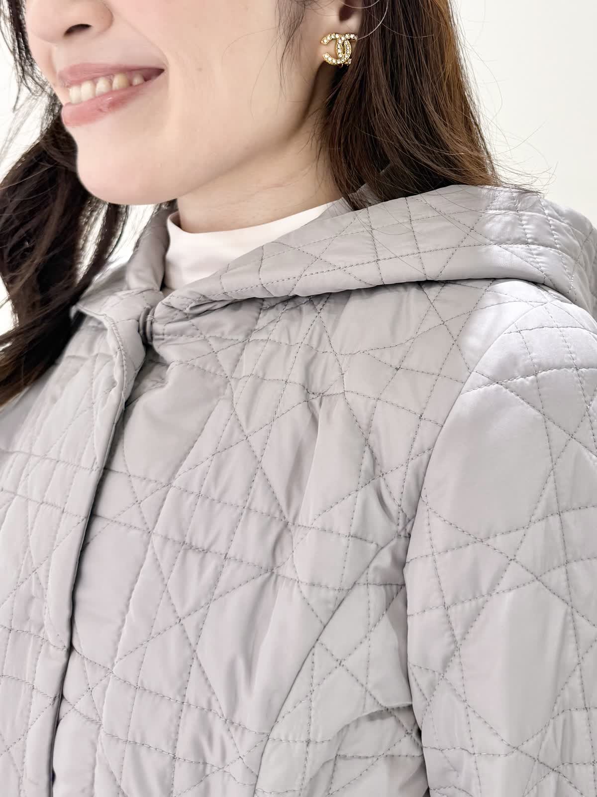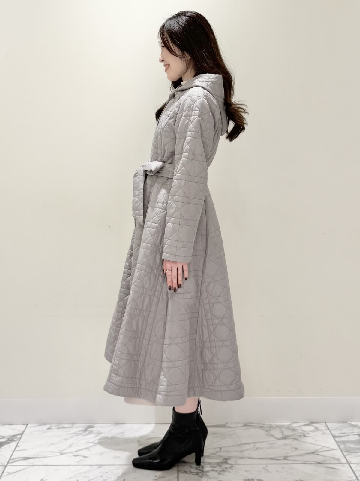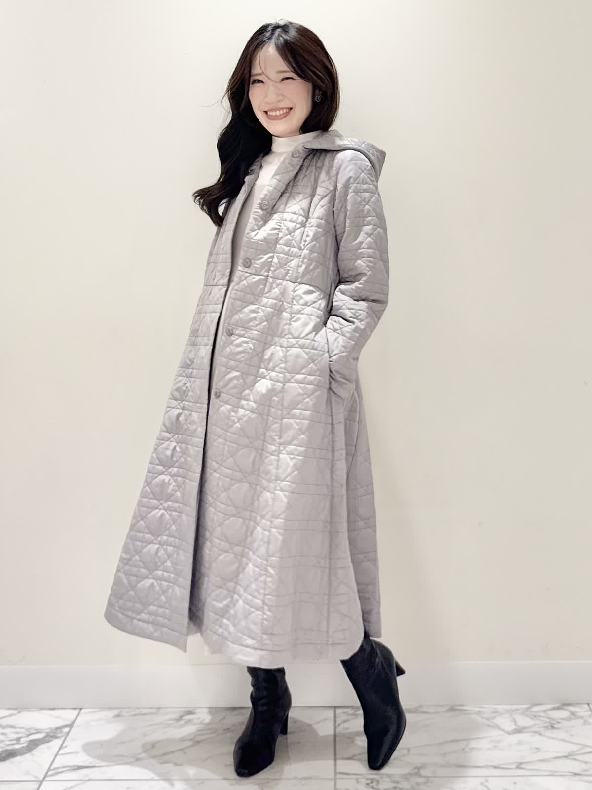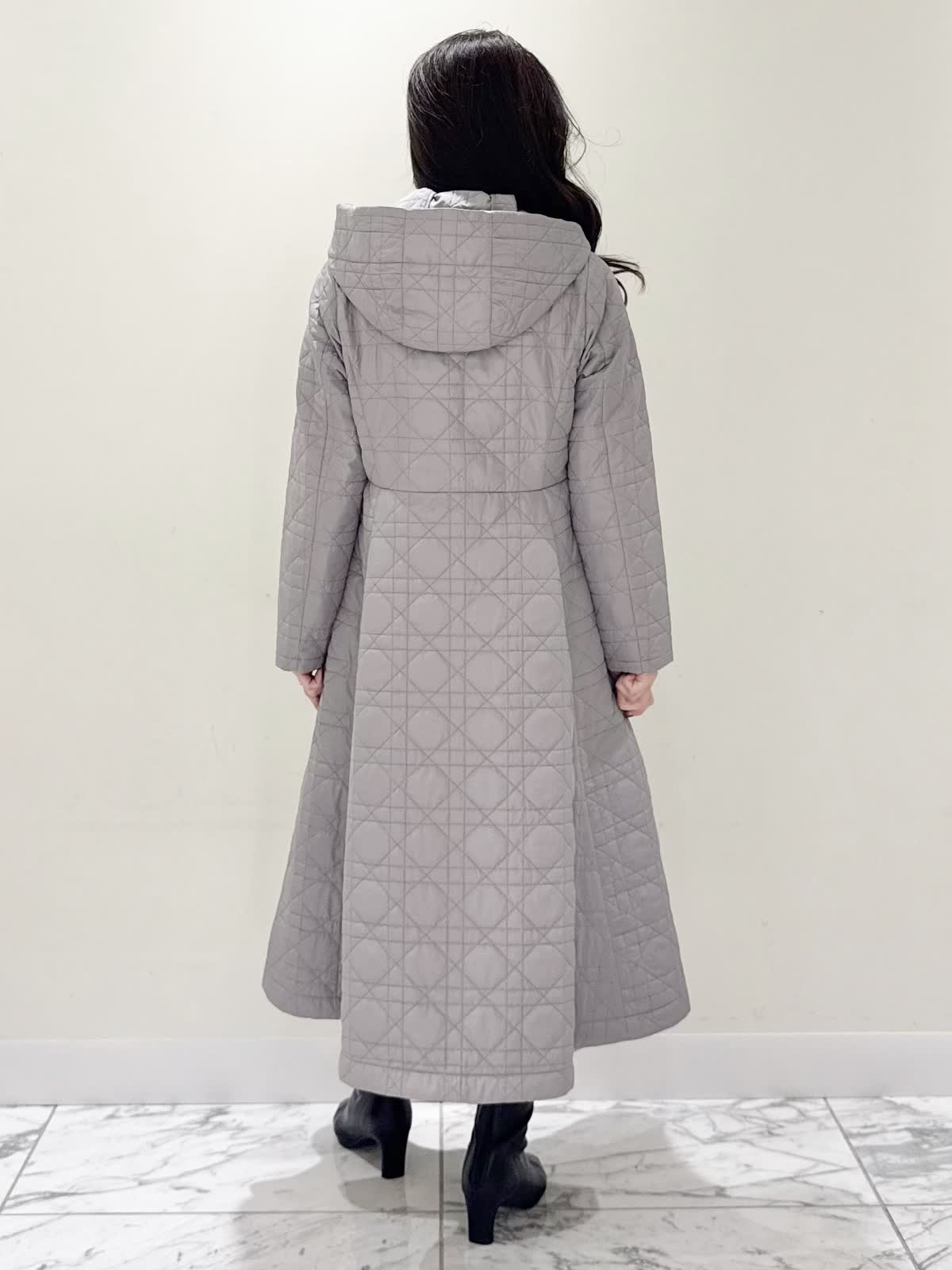 【着用サイズ/カラー】全て:7号 トーンを合わせた大人可愛いコーディネート♪ 360℃美シルエットのアウターは幾何学柄のオリジナルキルティング生地のロング丈フーディーコート。ベージュは同色のプレーンステッチで上品に仕上げた1着。ウエストをベルトでキュッと絞るとフィット&フレアの綺麗なシルエット。腕周り、アームホールは程よいゆとりがあるのでニットの上からでも着られます。ジャケットの上から羽織りたい方は1サイズ大きめなおすすめです。ロング丈でもとても軽く羽織れるので、デイリー使いもしやすいです。合わせは人気のフラワーモチーフワンピースにシアーレースブラウスのコーディネート。ワンピースは高め切り替えからのタック入りでボリューム出過ぎないフレアシルエット。表地はサラサラとしており、やや伸縮性を感じる生地で着心地◎計算された位置のフラワー刺繍がポイント。7号着用で程よいゆとりがありました。ジャストで着たい方はいつものサイズを、程よいゆとりが欲しい方は1サイズ大きめでも良いかと思います。インナーはレース使いが綺麗なブラウス。ハイネックしすぎず、ネック周りは余裕があるので窮屈感なく着られます。裏地はなく、表地にしっかりとした薄手のオーガンジーを生地を合わせた2枚仕立てなので、透け感は緩和されますが淡い色味なので同色系のインナーを着るのが良いかと思います。