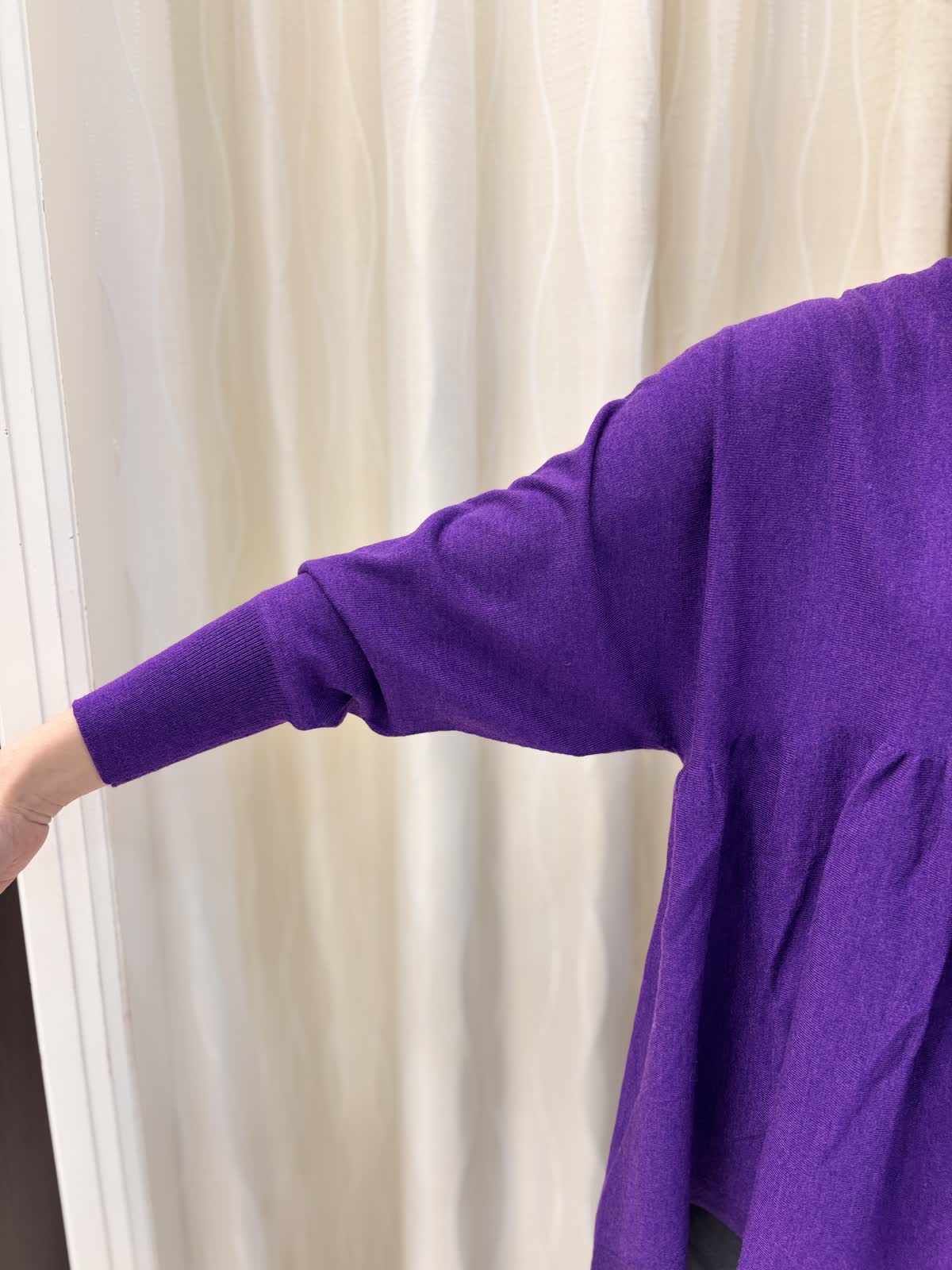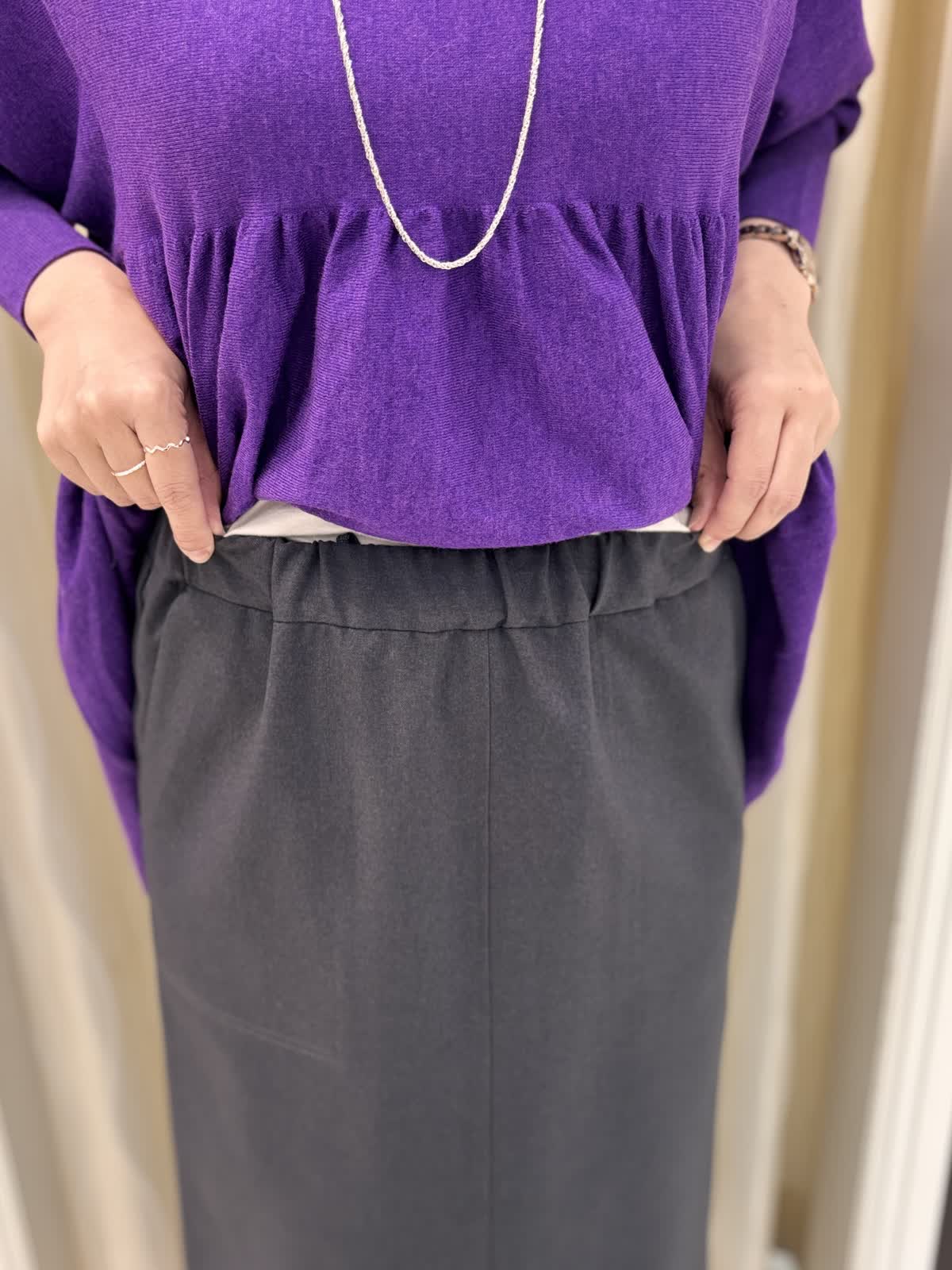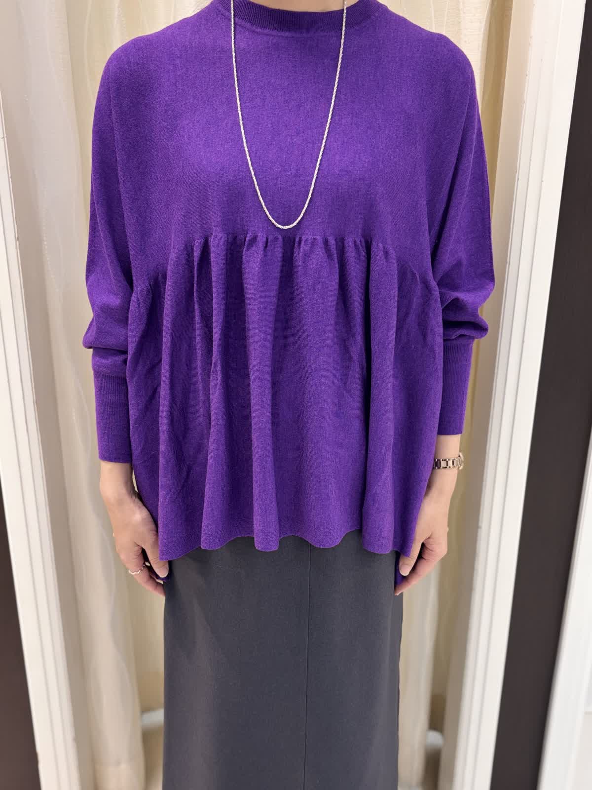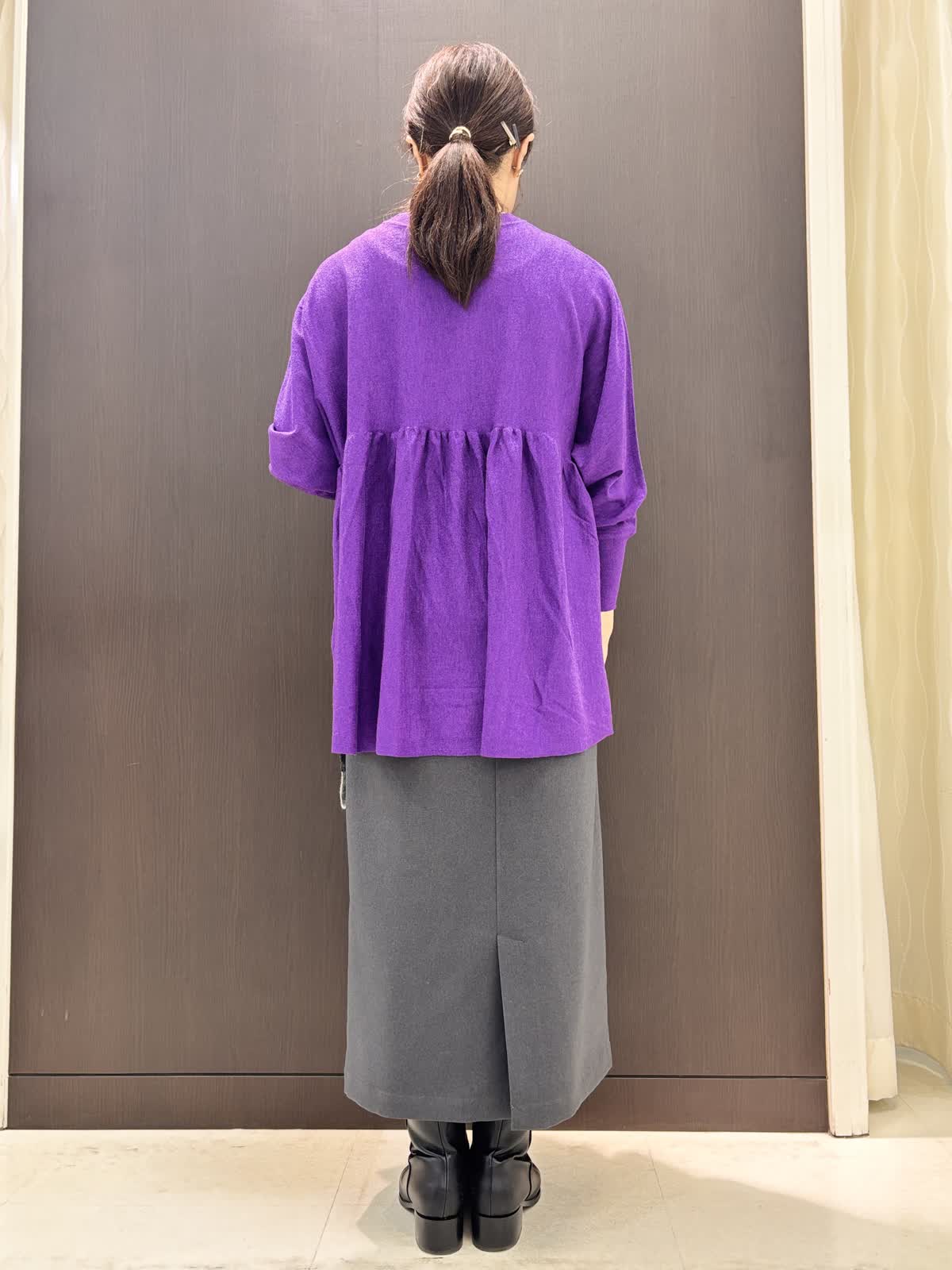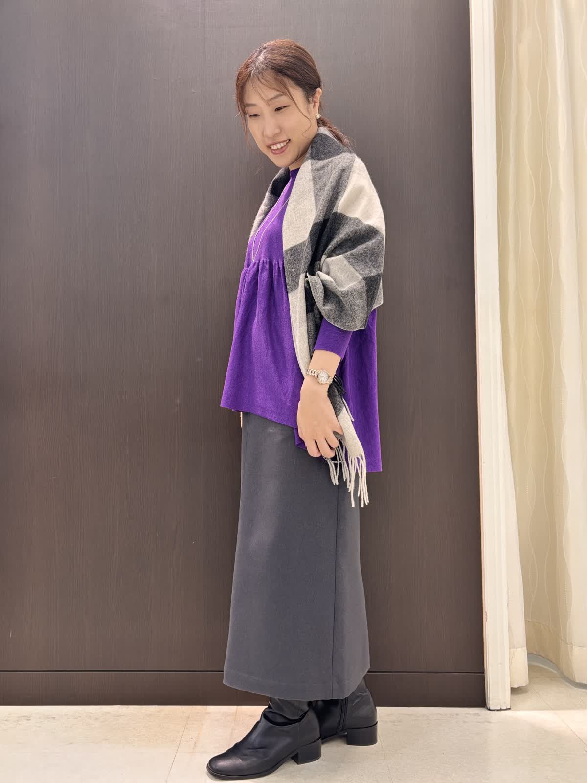 パープルのニットがよく映える寒い空気の日には暖かいニットブルゾンをお供に。朝晩はしっかりアウターで日中は軽くショールを肩掛けしても◎ニットはとてもゆったり楽に着れます。意外とボリュームなく、広がらないのでタイトスカートがよく合います。後ろが長めのデザインなのでヒップ周りを隠せますよ。軽いウール素材がふわふわで暖かいです。