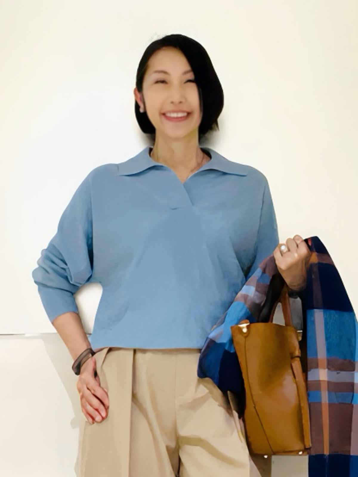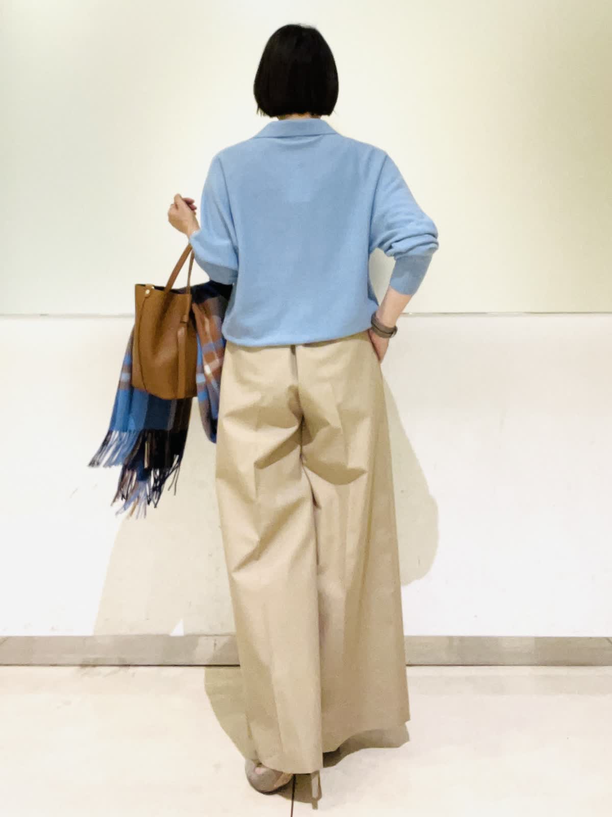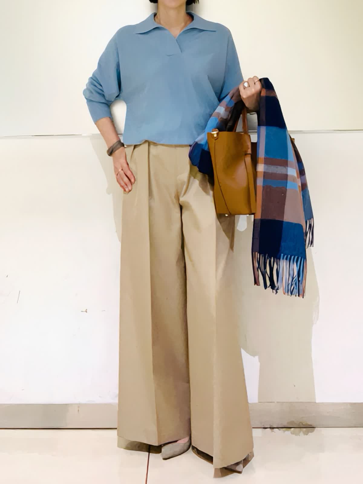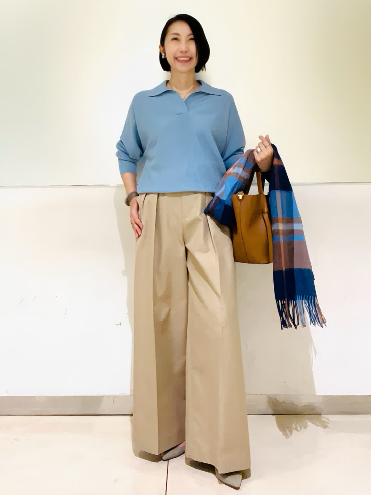【着用アイテム】すべて9号 【着用カラー】ニット:サックス パンツ:ベージュ 秋のお出かけコーディネート。1枚でスタイリングが決まるポロ衿ニット。ドルマンスリーブのゆとりのあるシルエットにコンパクトな着丈が絶妙なバランス。ベージュのワイドパンツとの組み合わせがきれい目にな着こなしにぴったりです。