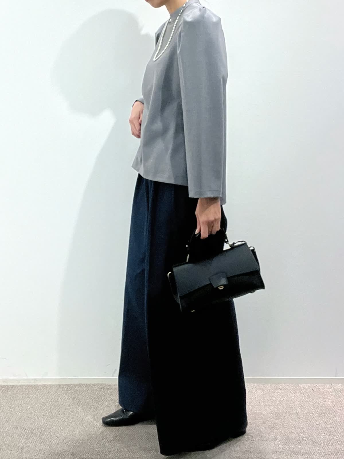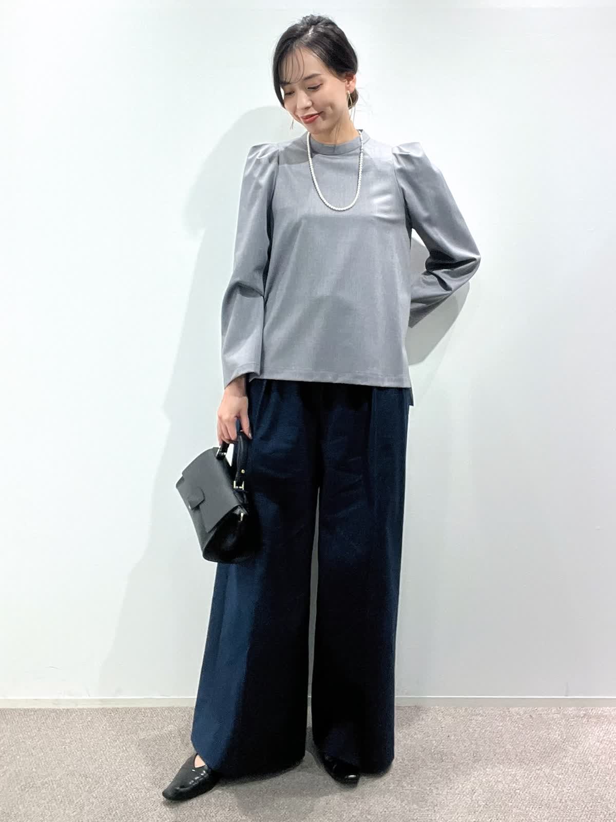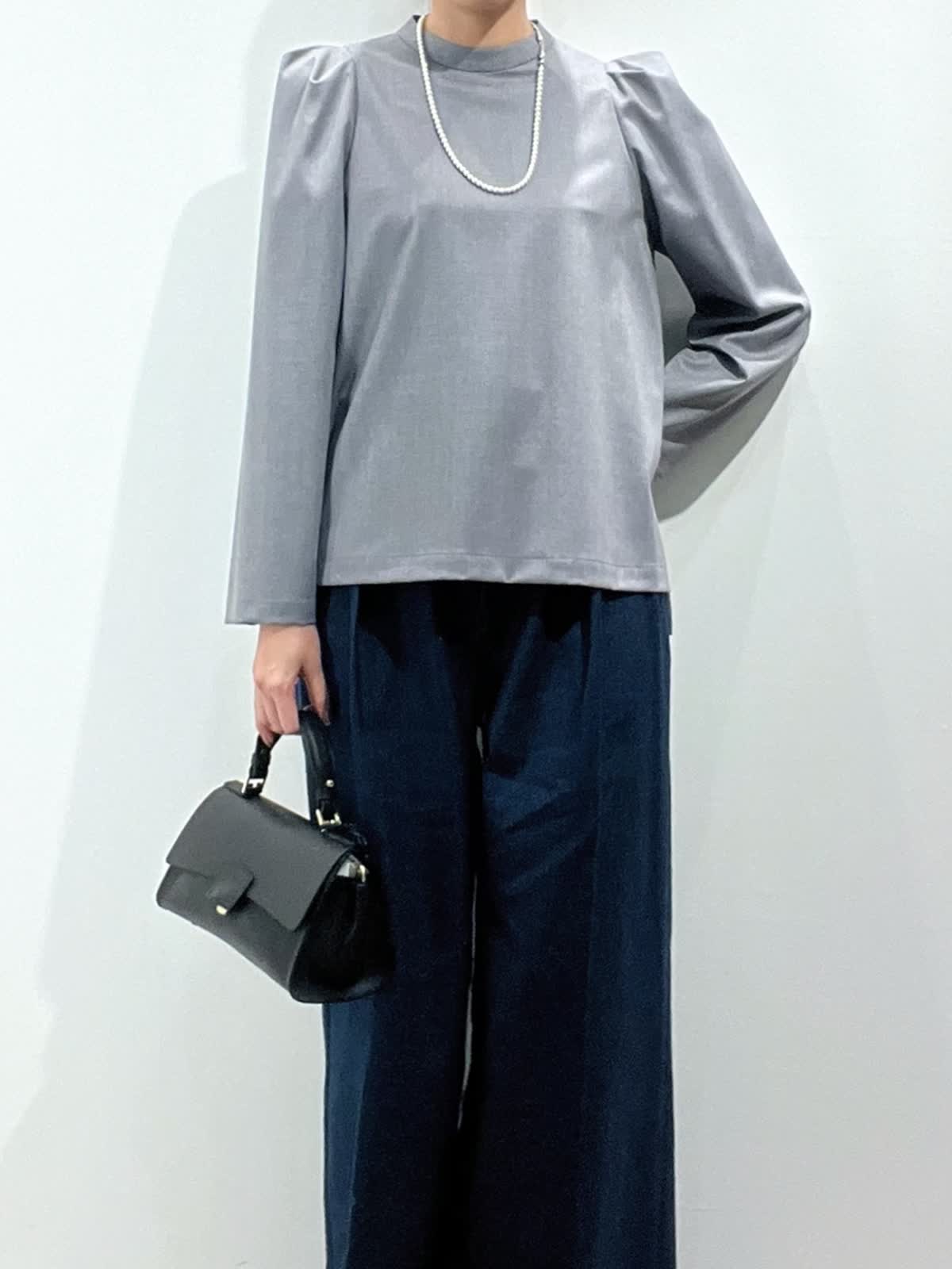 【着用サイズ】ブラウス:9号 パンツ:9号 【着用カラー】ブラウス:グレー パンツ:ダークネイビー バッグ:ブラック 「華やかブラウスで上品グレーの洗練スタイル」 シルエットと上質な素材感が際立つ三尋木奈保さんコラボの盛り袖ブラウス。ボトルネックラインがクラシカルな印象。計算された袖のタックが、華奢見えするデザインです。ハリ感がありながら、しなやかで薄手の素材なので、着心地良く1枚でもインナー使いでも活躍するアイテム。サイドはスリット入りなので、オーバーでもバランス良く着ていただける丈感です。ボトムは、ワイドパンツで大人の落ち着いた印象のスタイルに。お仕事やデイリーにも活躍するおすすめコーデです。