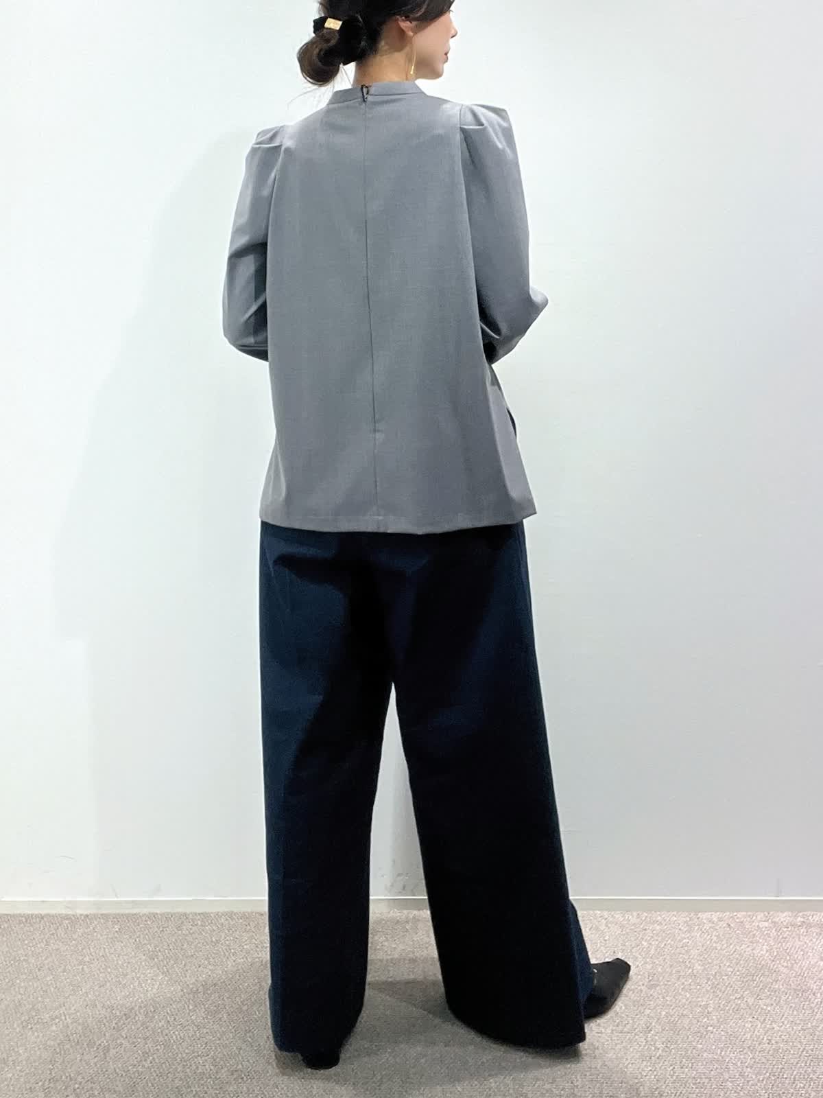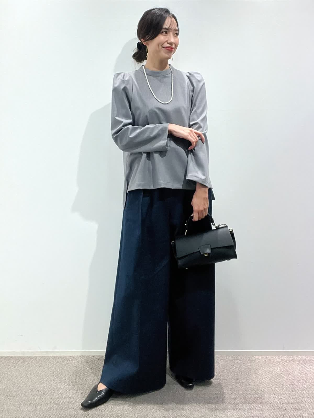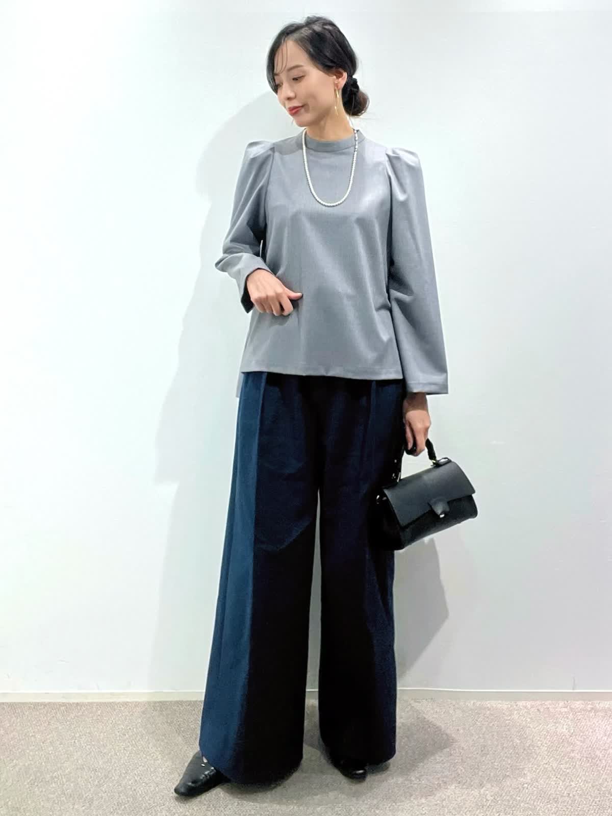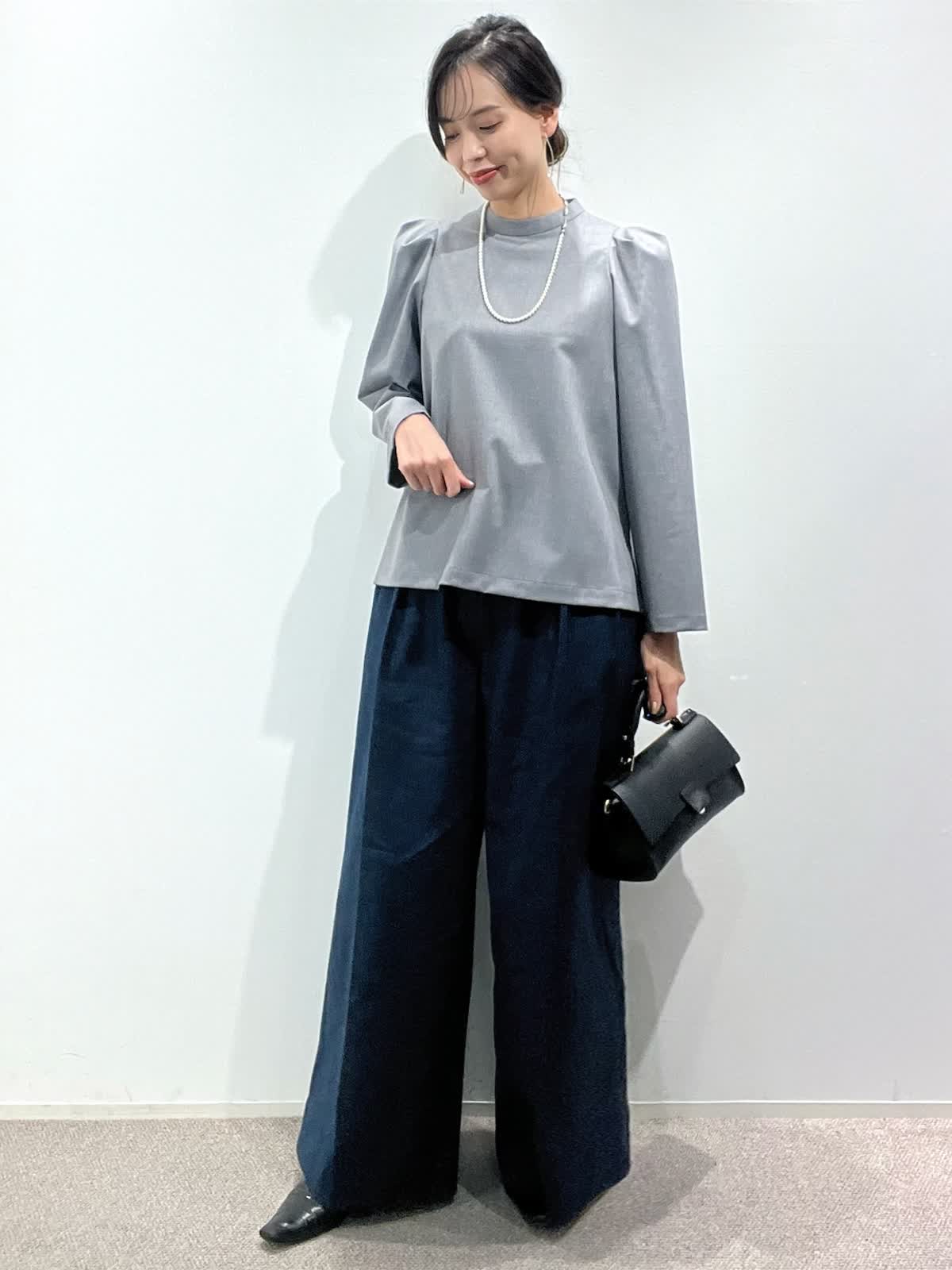 【着用サイズ】ブラウス:9号 パンツ:9号 【着用カラー】ブラウス:グレー パンツ:ダークネイビー バッグ:ブラック 「華やかブラウスで上品グレーの洗練スタイル」 シルエットと上質な素材感が際立つ三尋木奈保さんコラボの盛り袖ブラウス。ボトルネックラインがクラシカルな印象。計算された袖のタックが、華奢見えするデザインです。ハリ感がありながら、しなやかで薄手の素材なので、着心地良く1枚でもインナー使いでも活躍するアイテム。サイドはスリット入りなので、オーバーでもバランス良く着ていただける丈感です。ボトムは、ワイドパンツで大人の落ち着いた印象のスタイルに。お仕事やデイリーにも活躍するおすすめコーデです。