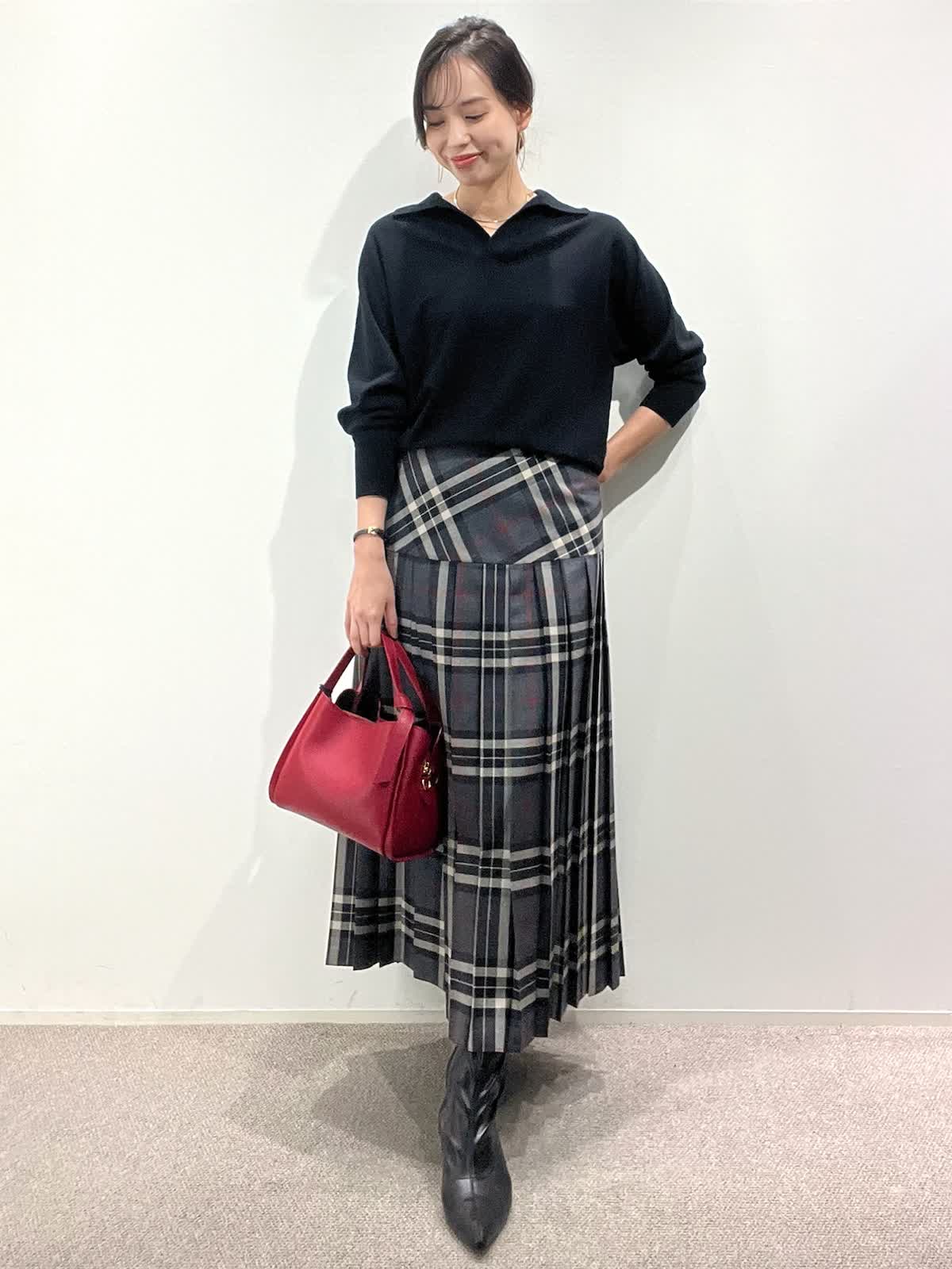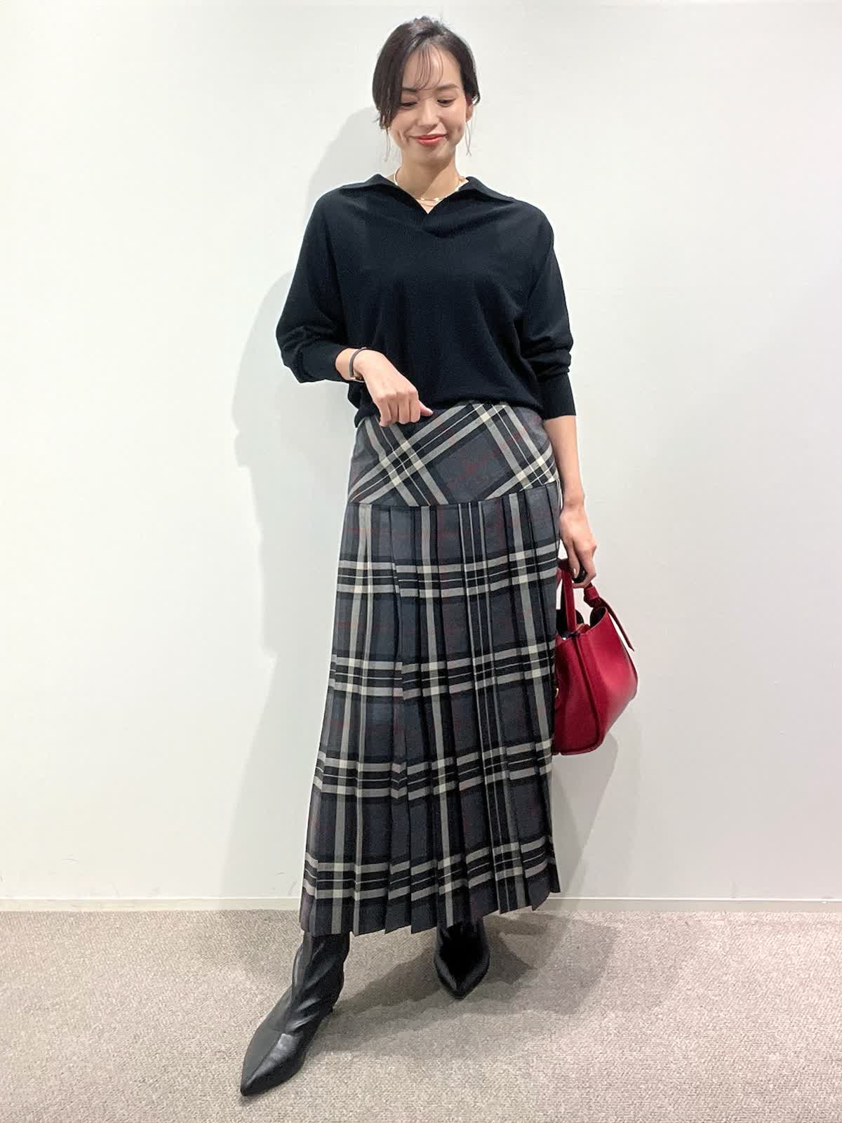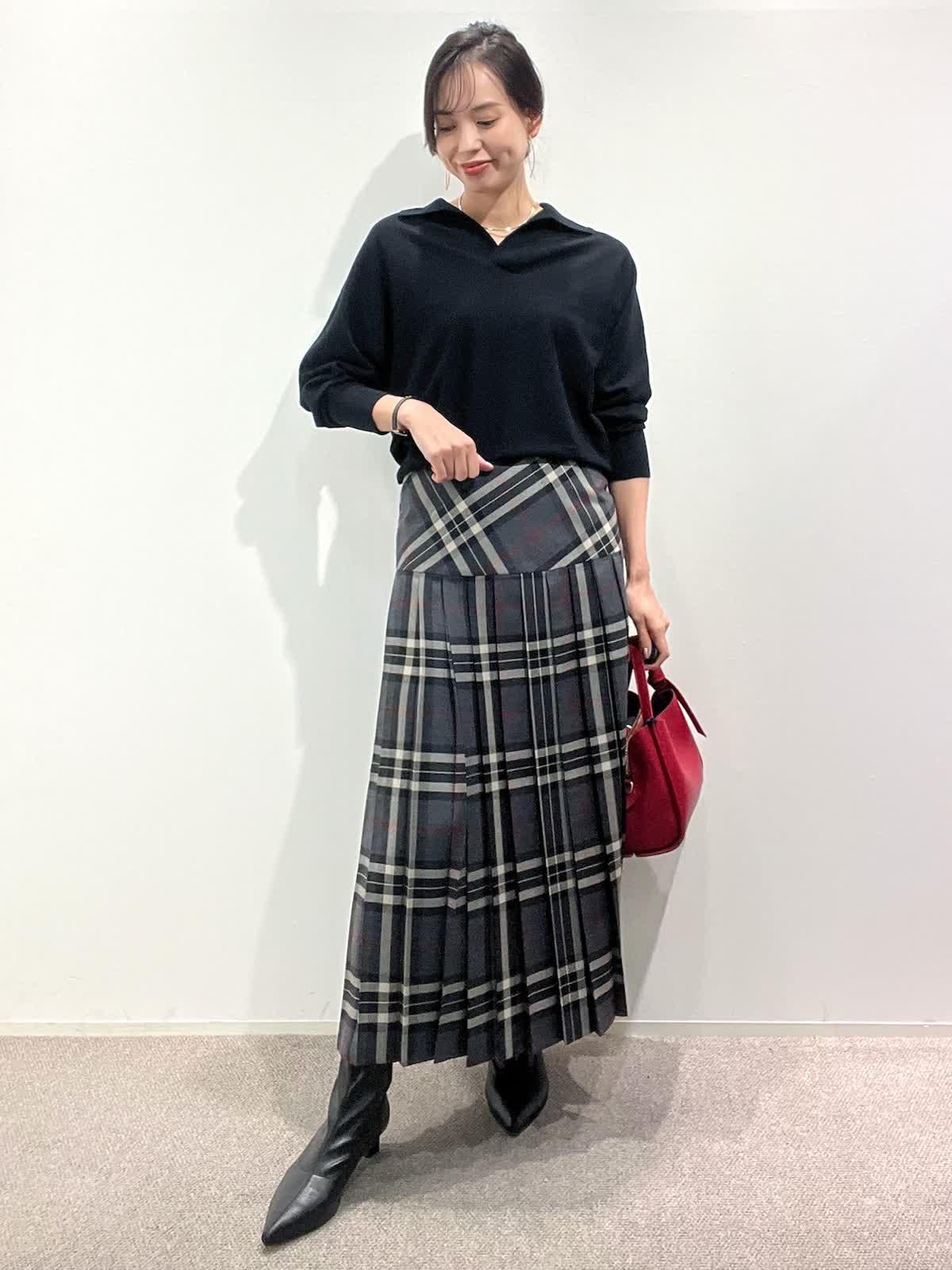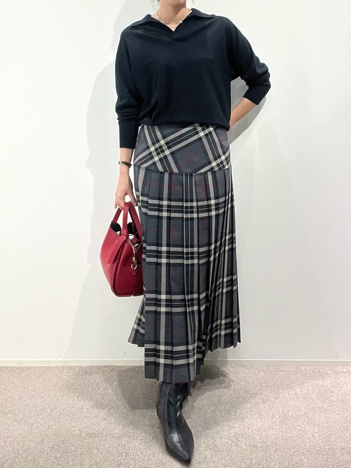 【着用サイズ】ニット:9号 スカート:9号 【着用カラー】ニット:ブラック スカート:グレー バッグ:レッド 「大人カジュアルトラッドコーデ」 クラシカルなチェック柄スカートが主役のトラッドスタイル。抜け感のあるポロ衿ニットは、上質ウール100%を使用した柔らかくあたたかい素材感。スキッパー衿が今年らしい大人な抜け感ニットです。スカートは広がりすぎないヨーク切り替えで、すっきり見えるシルエット。小物を赤のバッグで差し色にしたクラシカルスタイルで、秋のおすすめコーデです。