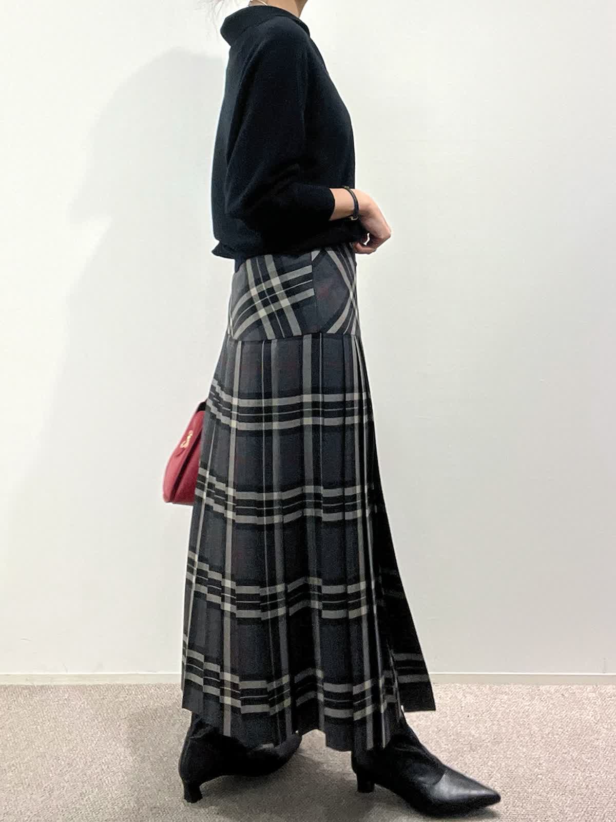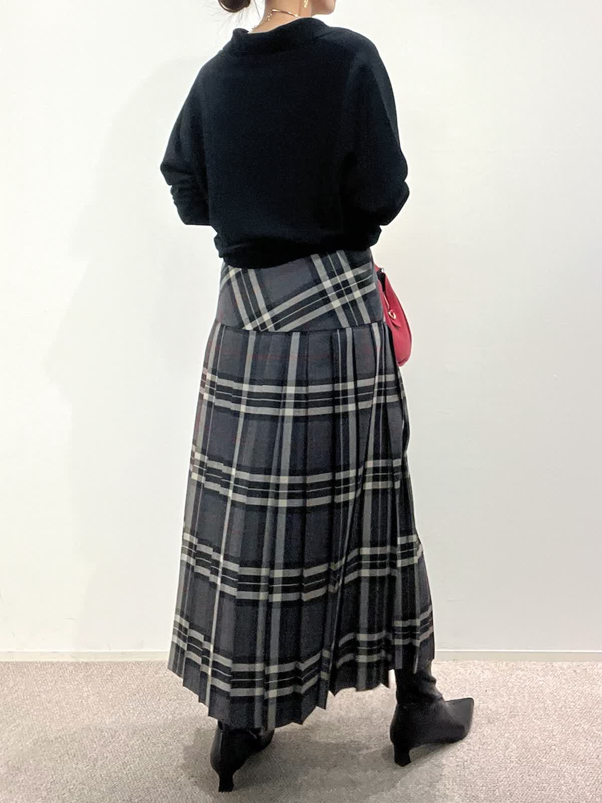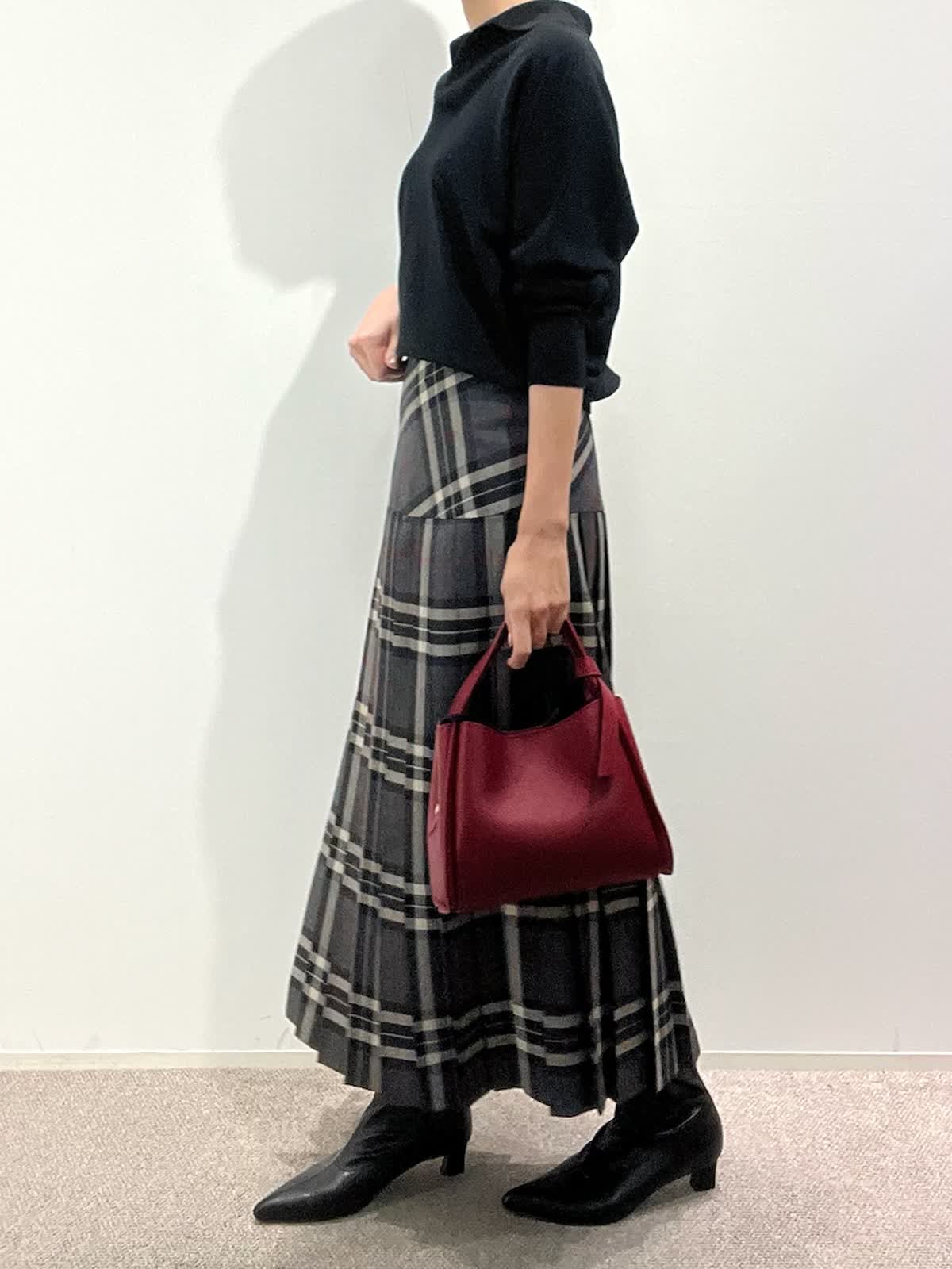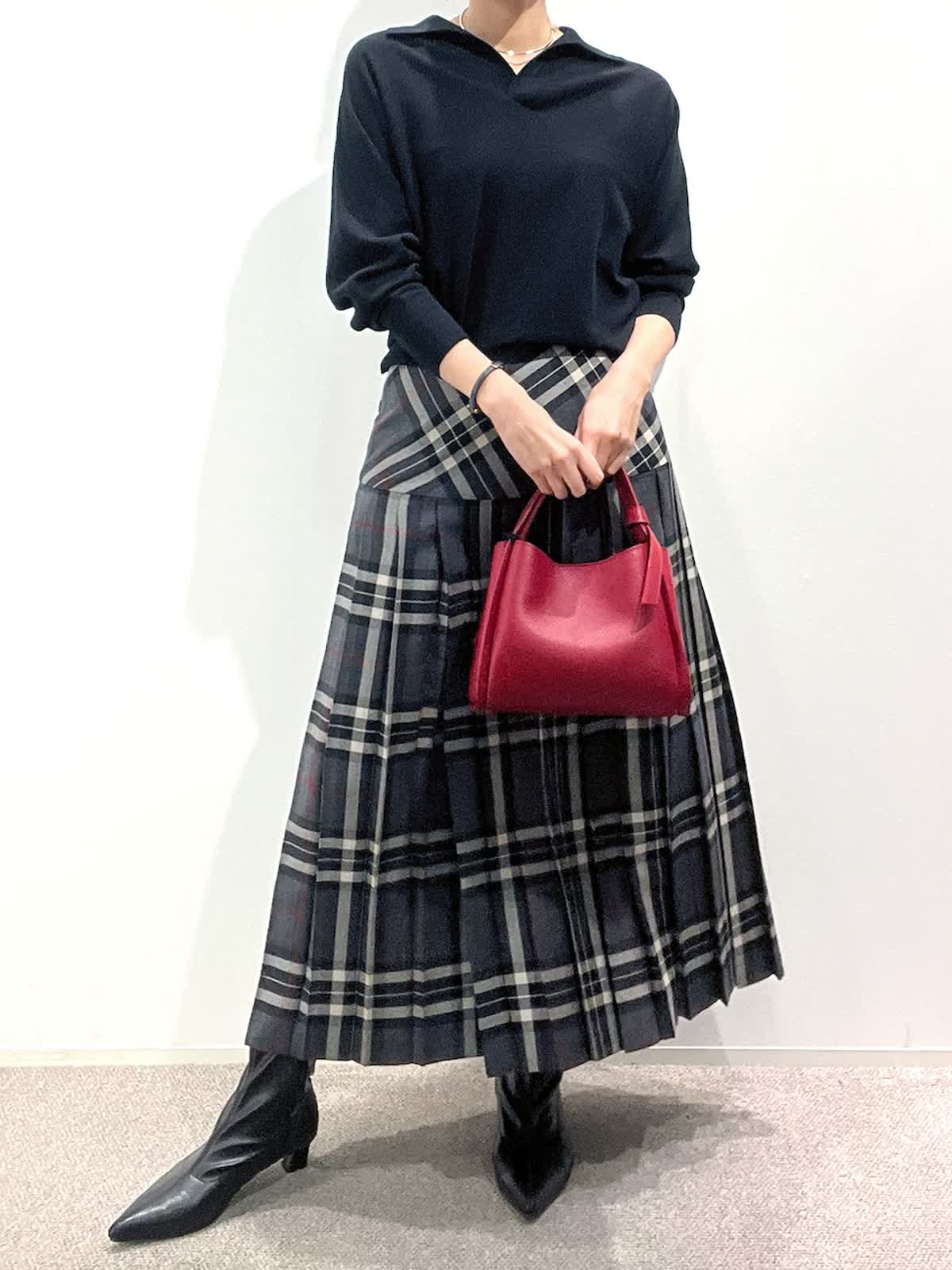 【着用サイズ】ニット:9号 スカート:9号 【着用カラー】ニット:ブラック スカート:グレー バッグ:レッド 「大人カジュアルトラッドコーデ」 クラシカルなチェック柄スカートが主役のトラッドスタイル。抜け感のあるポロ衿ニットは、上質ウール100%を使用した柔らかくあたたかい素材感。スキッパー衿が今年らしい大人な抜け感ニットです。スカートは広がりすぎないヨーク切り替えで、すっきり見えるシルエット。小物を赤のバッグで差し色にしたクラシカルスタイルで、秋のおすすめコーデです。