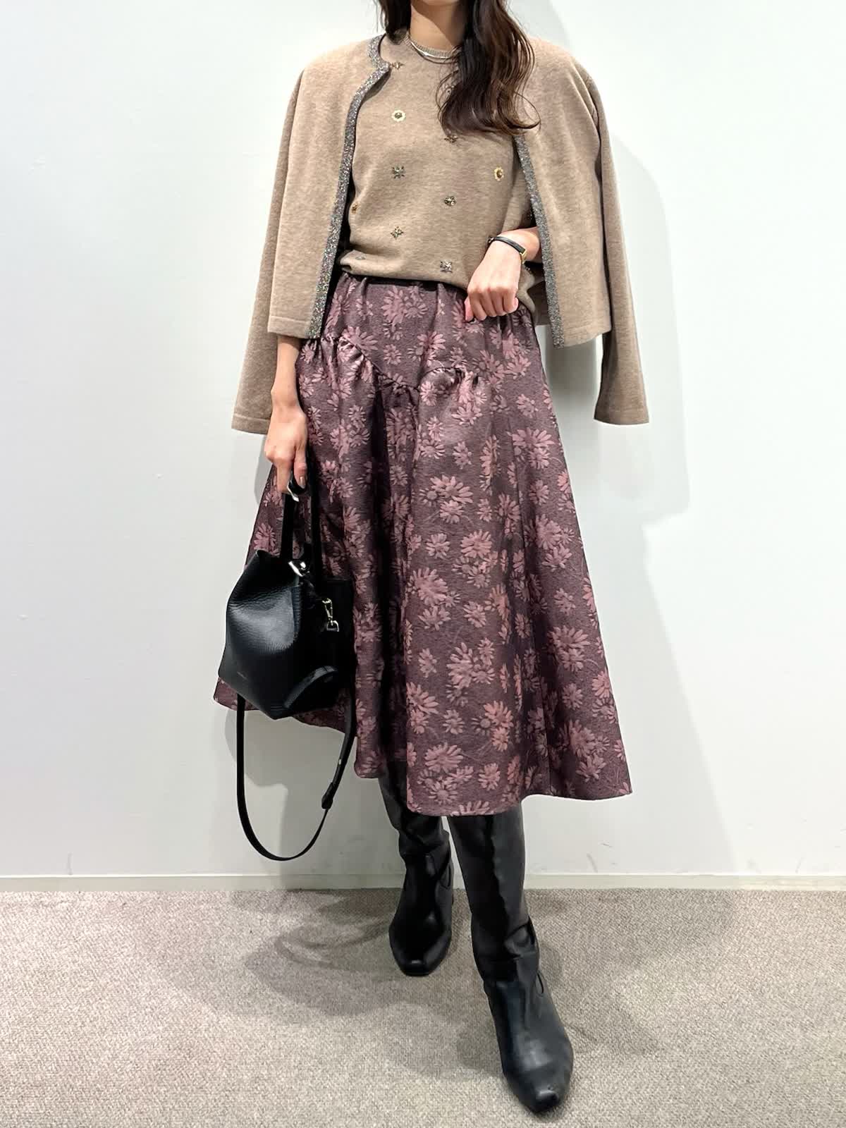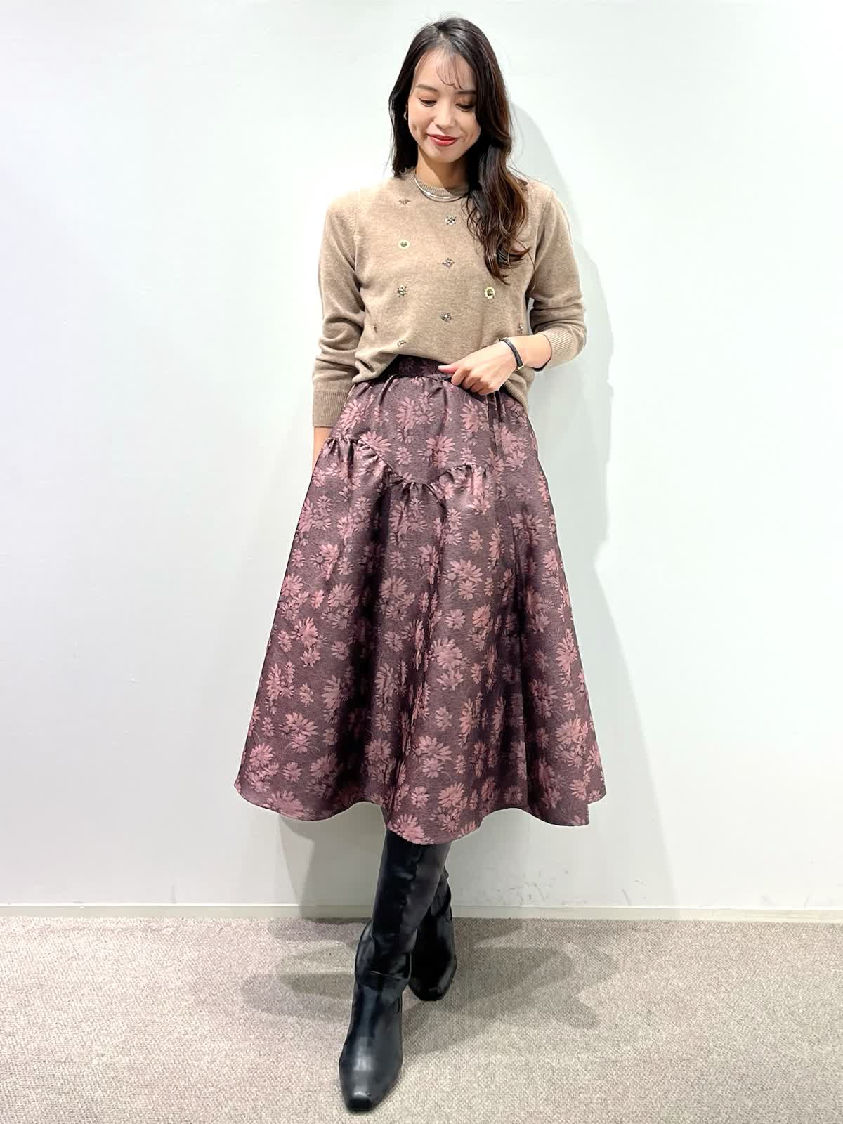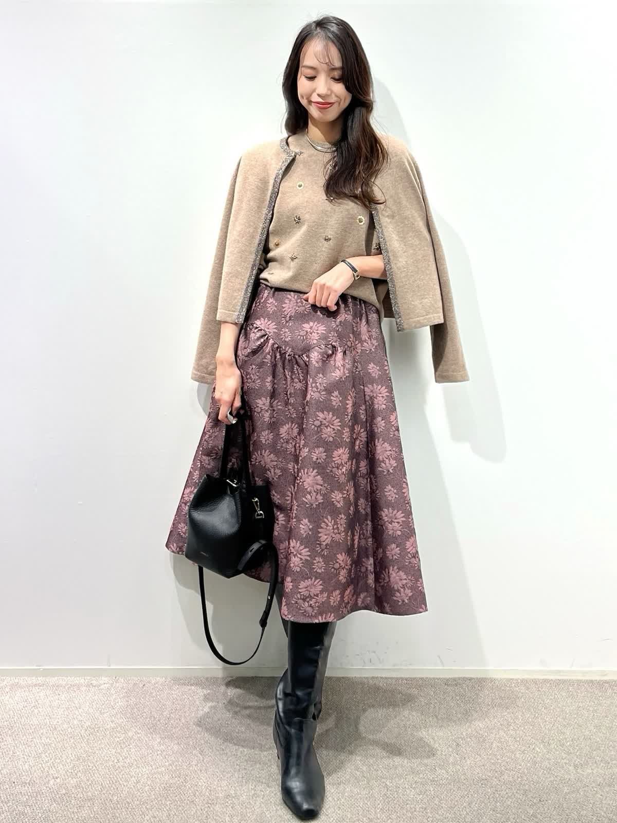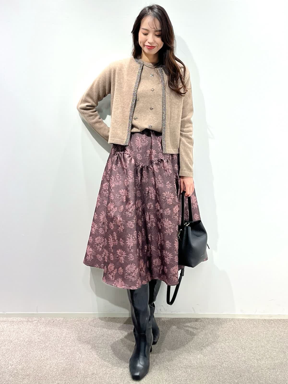 【着用サイズ】カーディガン:9号 ニット:9号 スカート:9号 【着用カラー】カーディガン:ベージュ ニット:ベージュ スカート:ピンク バッグ:ブラック 「デザインニットとスカートで華やかに着こなすクラシカルフェミニンコーデ」 コンパクトなカーディガン、華やかビジューの刺繍ニットとジャガードスカートの上品スタイル。ベージュトーンとカラースカートで秋らしいカラーの着こなしに。 カーディガンは、パイピングのラメ糸がポイントで、ジャケット感覚に羽織れるアイテム。アンサンブルで、ビジュー風刺繍ニットもおすすめ。上質ウール100%使用した柔らかくあたたかい素材感で1枚着でも華やかさアップ。 フクレジャガードのオリジナルフラワー柄のスカートで着映えするフェミニンコーデの完成。 秋から冬の季節はアウターに映えるスタイリングです。