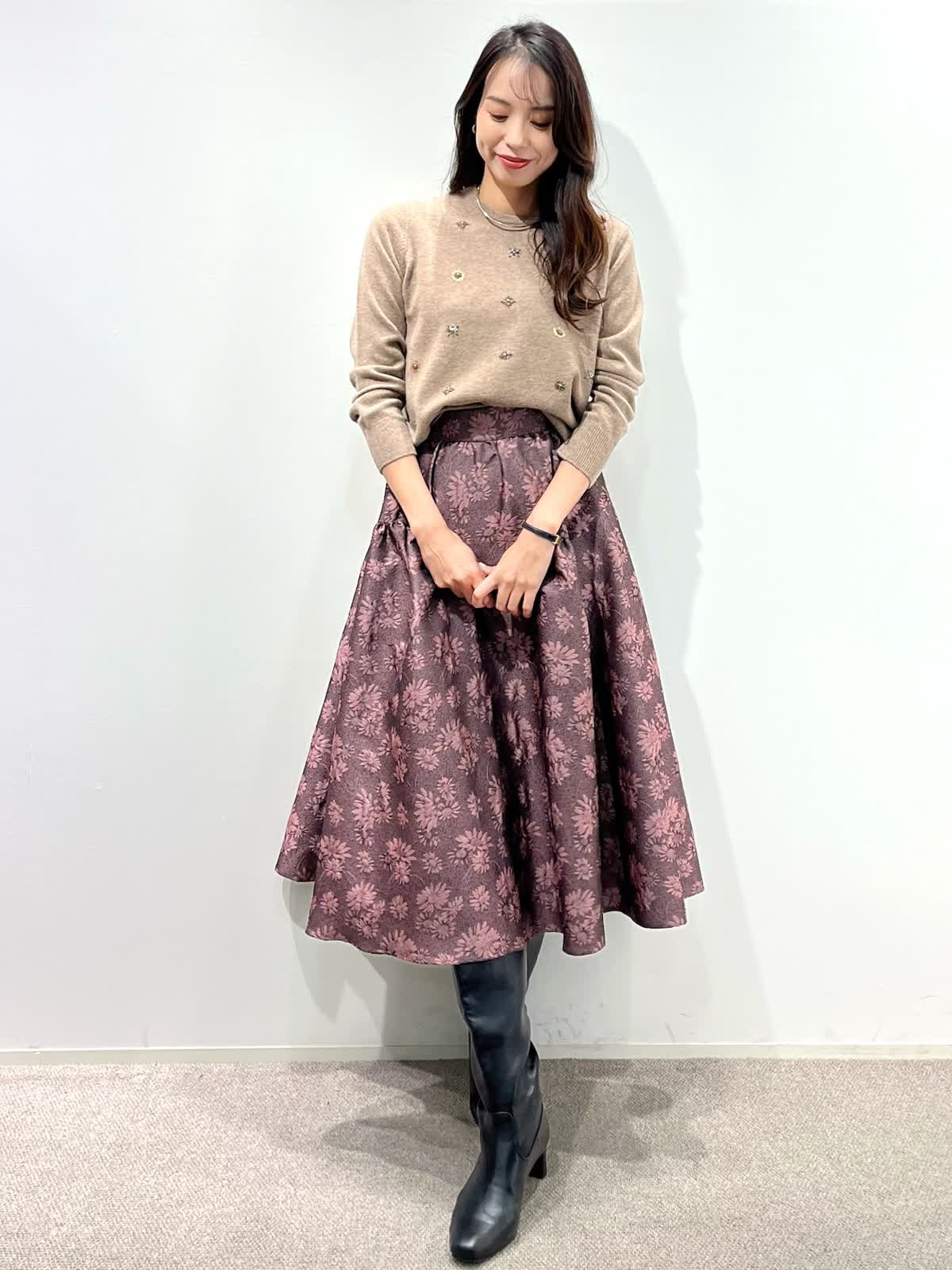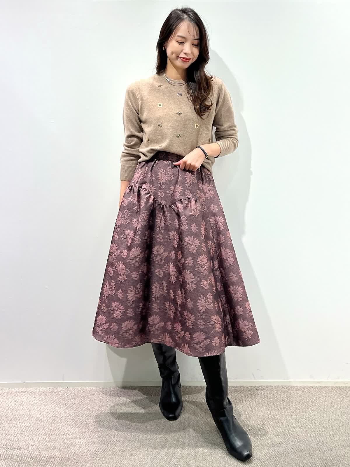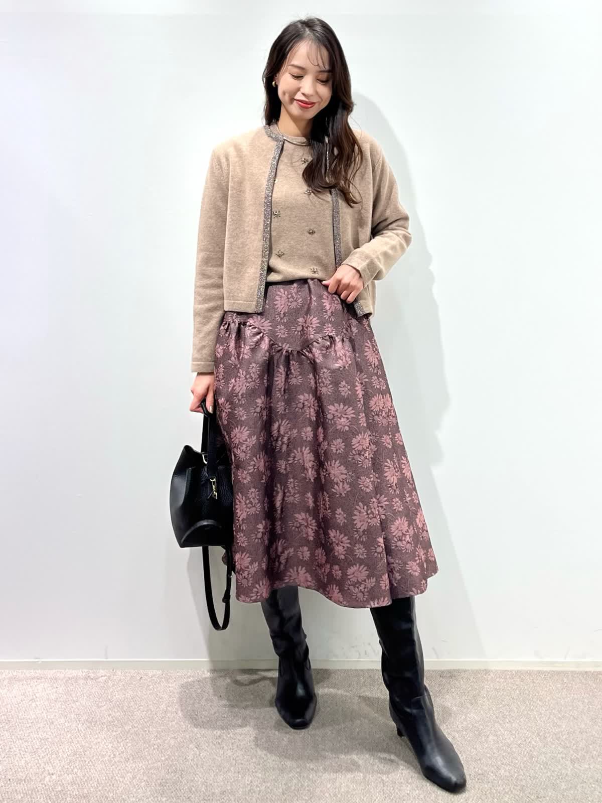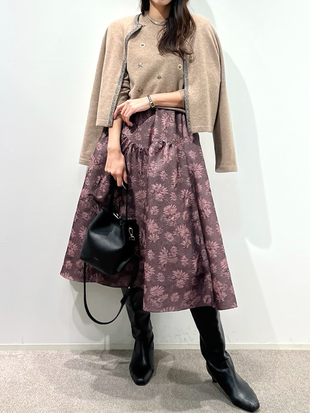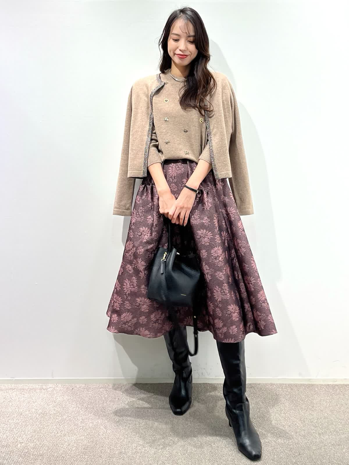 【着用サイズ】カーディガン:9号 ニット:9号 スカート:9号 【着用カラー】カーディガン:ベージュ ニット:ベージュ スカート:ピンク バッグ:ブラック 「デザインニットとスカートで華やかに着こなすクラシカルフェミニンコーデ」 コンパクトなカーディガン、華やかビジューの刺繍ニットとジャガードスカートの上品スタイル。ベージュトーンとカラースカートで秋らしいカラーの着こなしに。 カーディガンは、パイピングのラメ糸がポイントで、ジャケット感覚に羽織れるアイテム。アンサンブルで、ビジュー風刺繍ニットもおすすめ。上質ウール100%使用した柔らかくあたたかい素材感で1枚着でも華やかさアップ。 フクレジャガードのオリジナルフラワー柄のスカートで着映えするフェミニンコーデの完成。 秋から冬の季節はアウターに映えるスタイリングです。