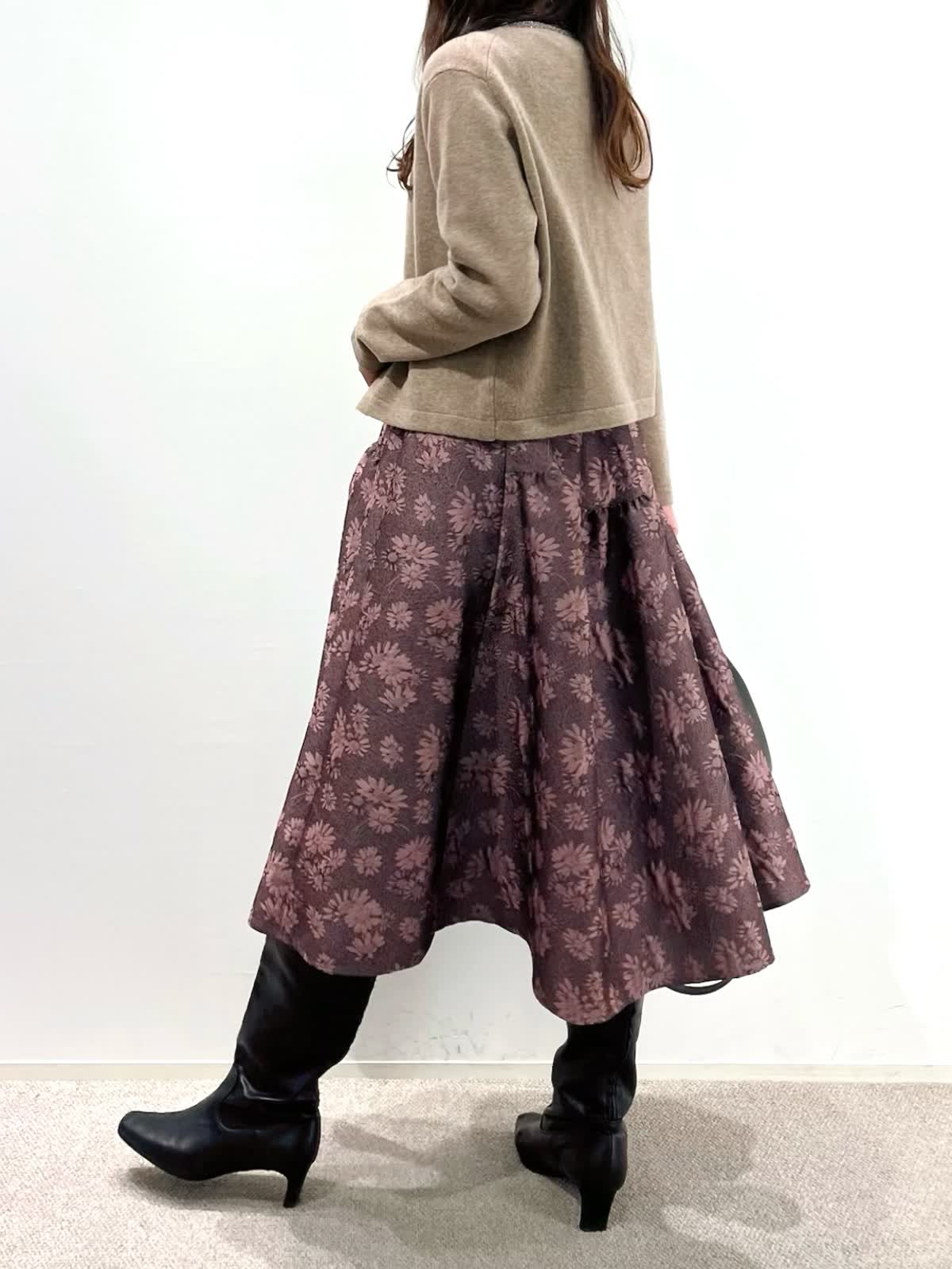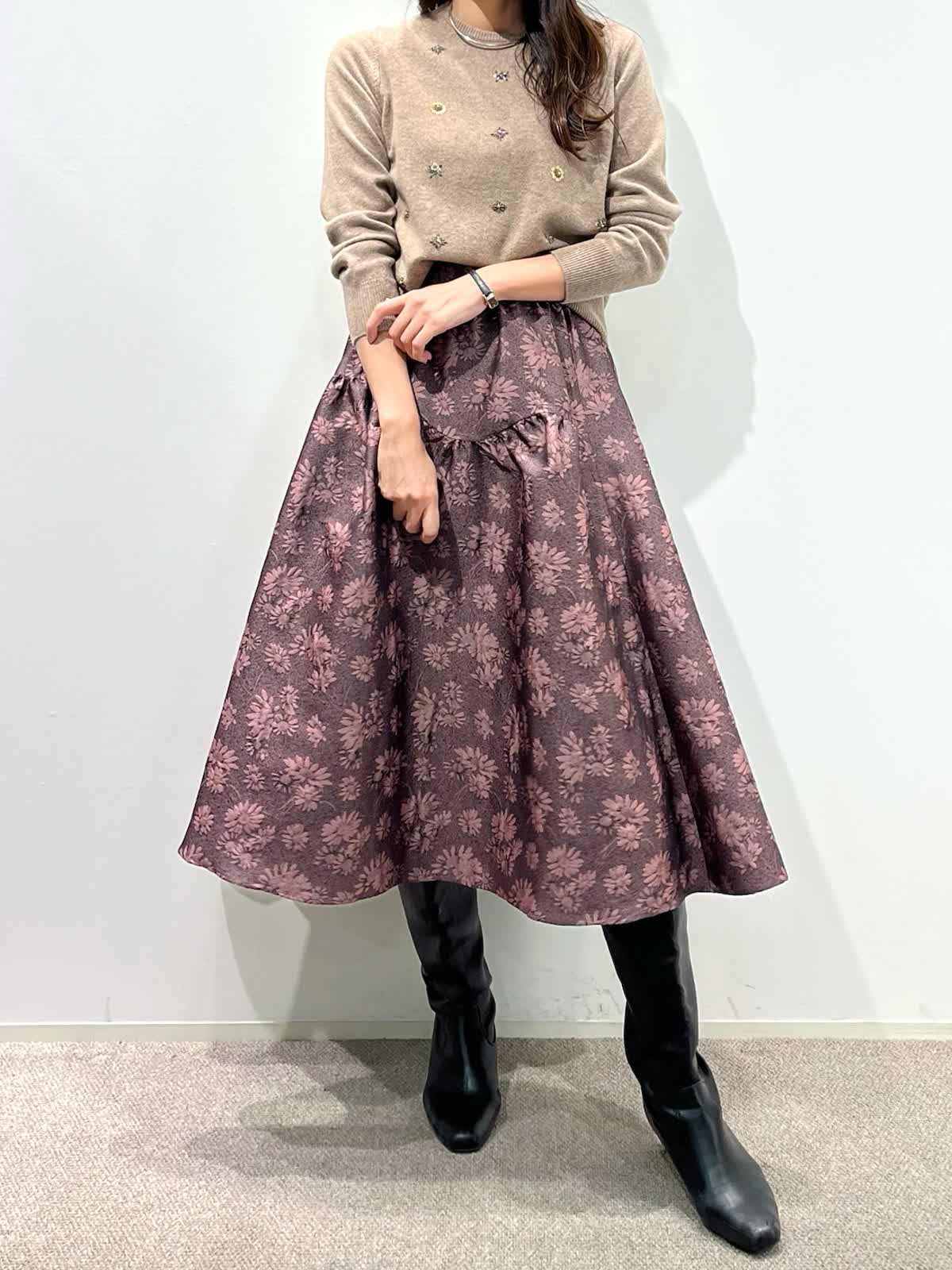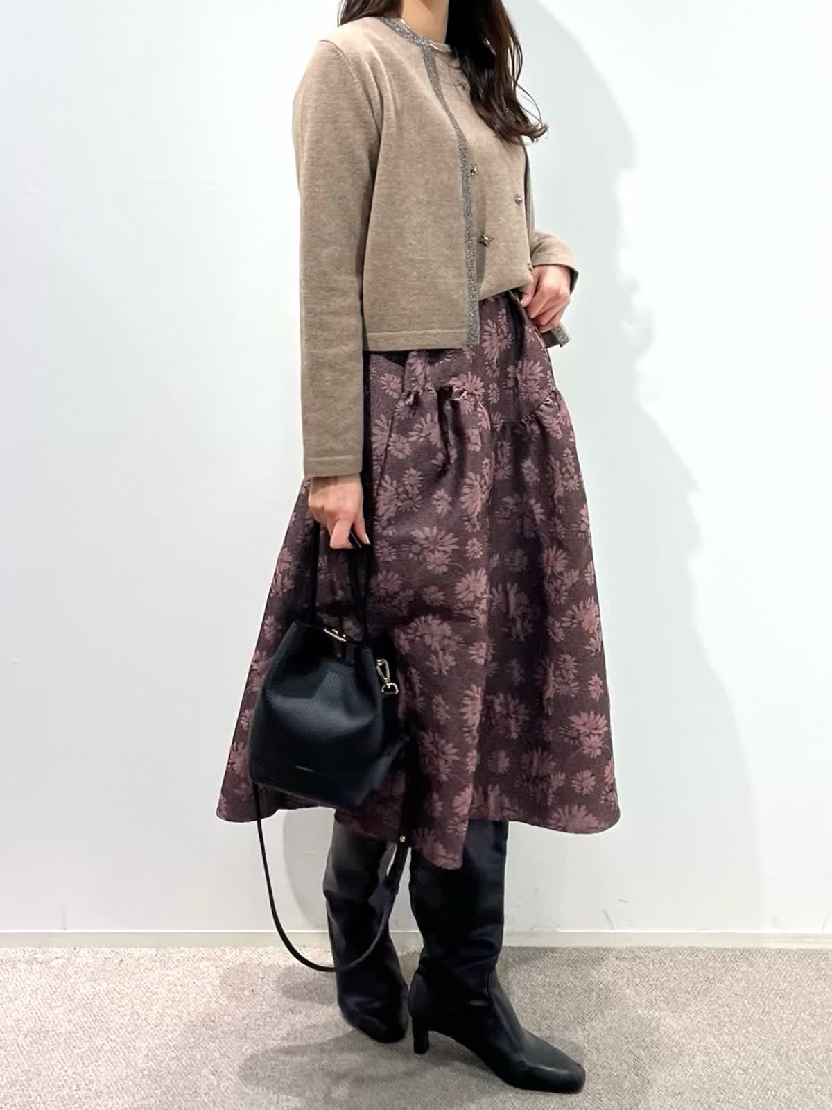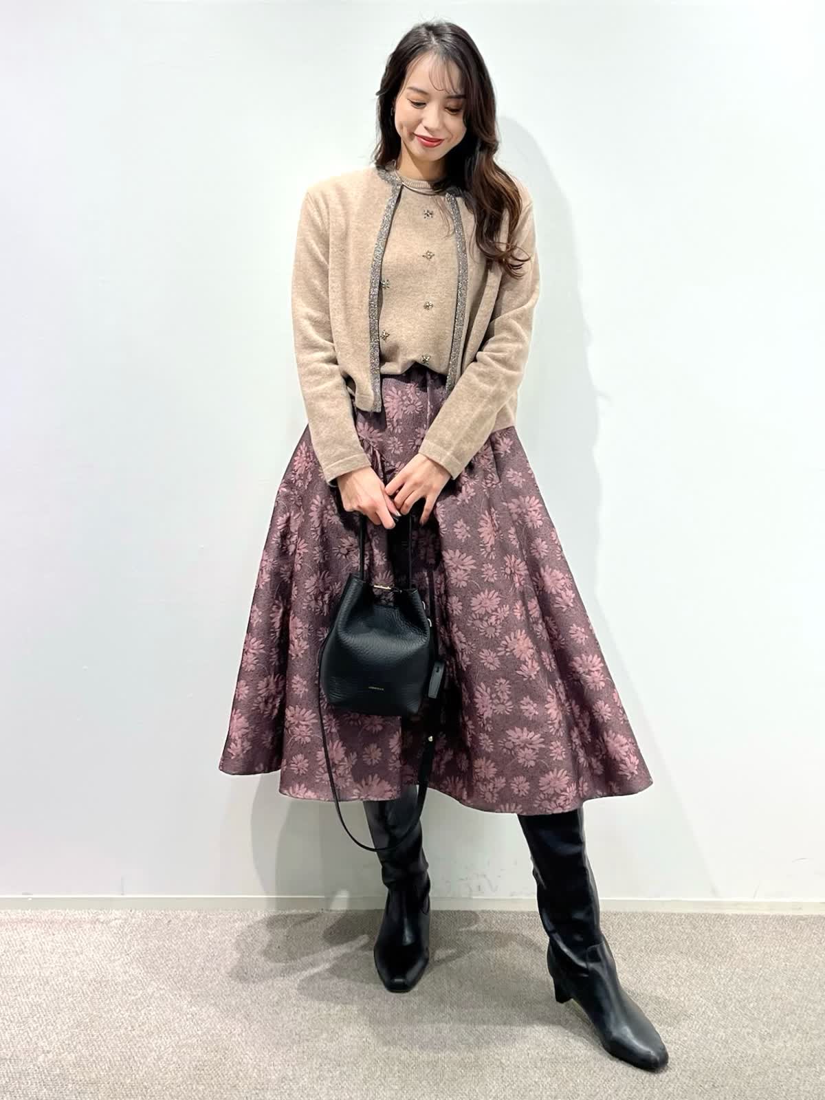 【着用サイズ】カーディガン:9号 ニット:9号 スカート:9号 【着用カラー】カーディガン:ベージュ ニット:ベージュ スカート:ピンク バッグ:ブラック 「デザインニットとスカートで華やかに着こなすクラシカルフェミニンコーデ」 コンパクトなカーディガン、華やかビジューの刺繍ニットとジャガードスカートの上品スタイル。ベージュトーンとカラースカートで秋らしいカラーの着こなしに。 カーディガンは、パイピングのラメ糸がポイントで、ジャケット感覚に羽織れるアイテム。アンサンブルで、ビジュー風刺繍ニットもおすすめ。上質ウール100%使用した柔らかくあたたかい素材感で1枚着でも華やかさアップ。 フクレジャガードのオリジナルフラワー柄のスカートで着映えするフェミニンコーデの完成。 秋から冬の季節はアウターに映えるスタイリングです。