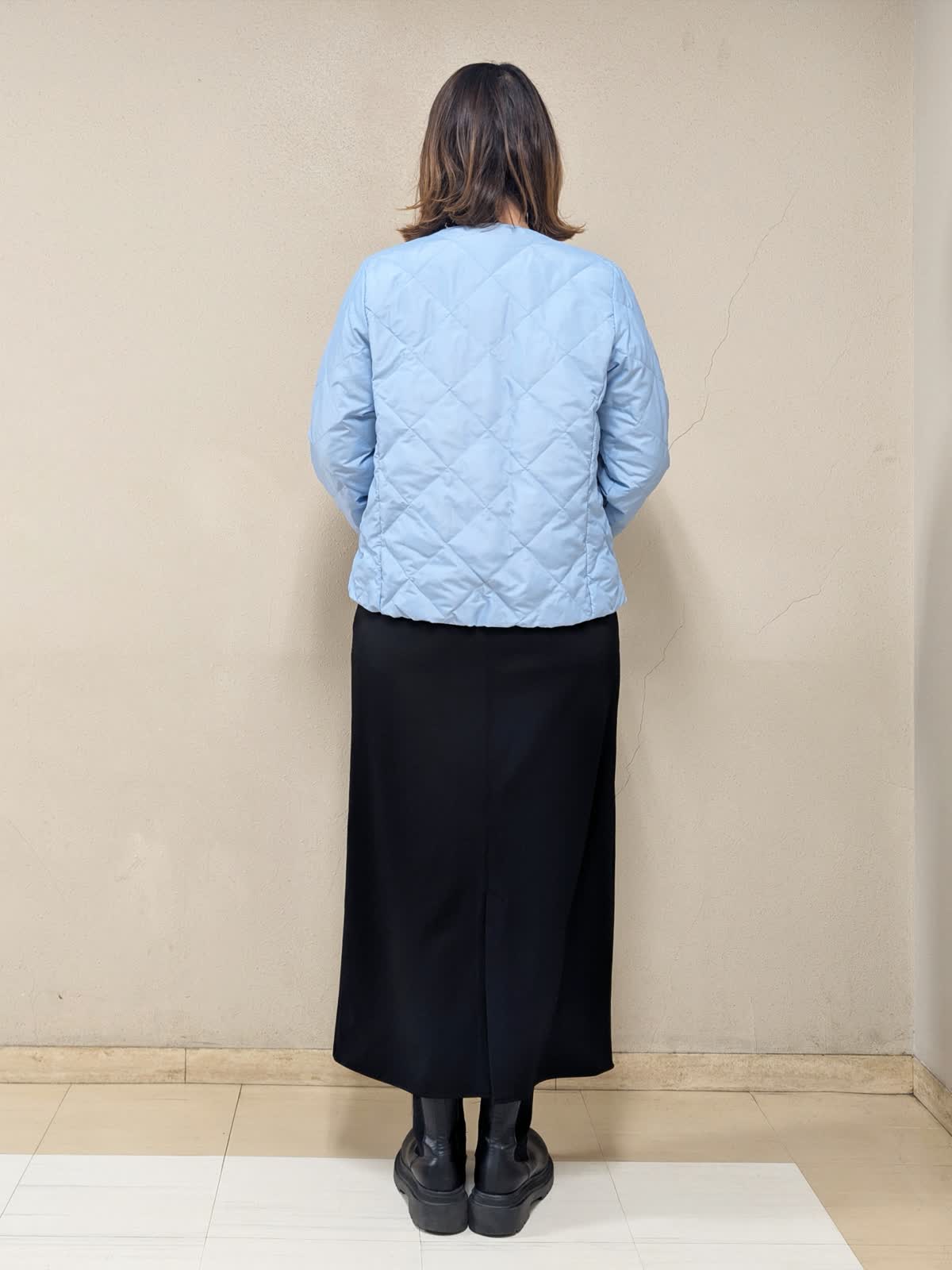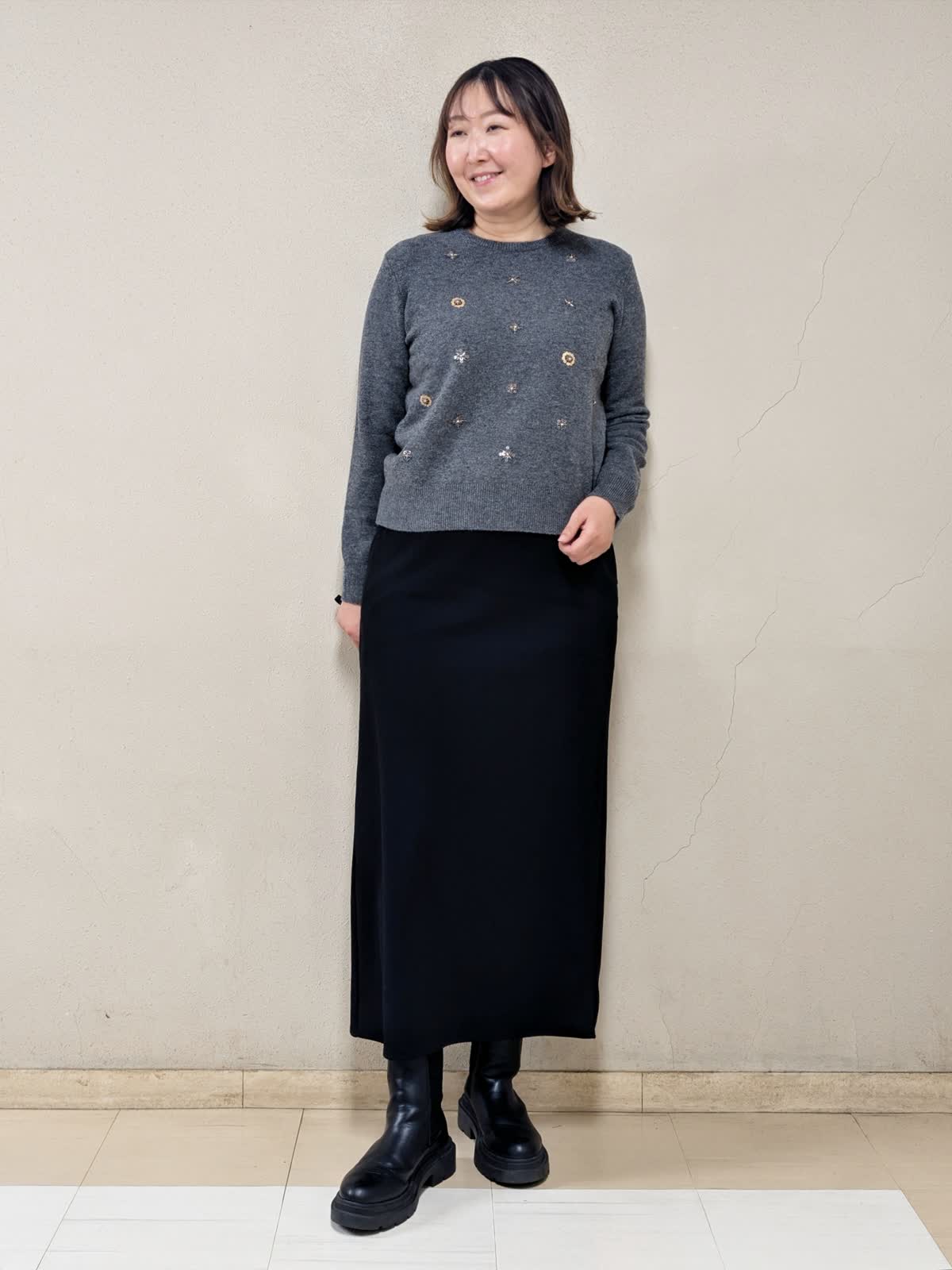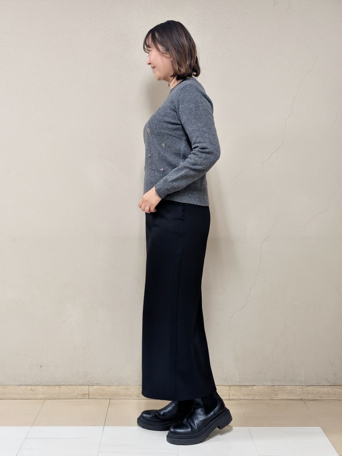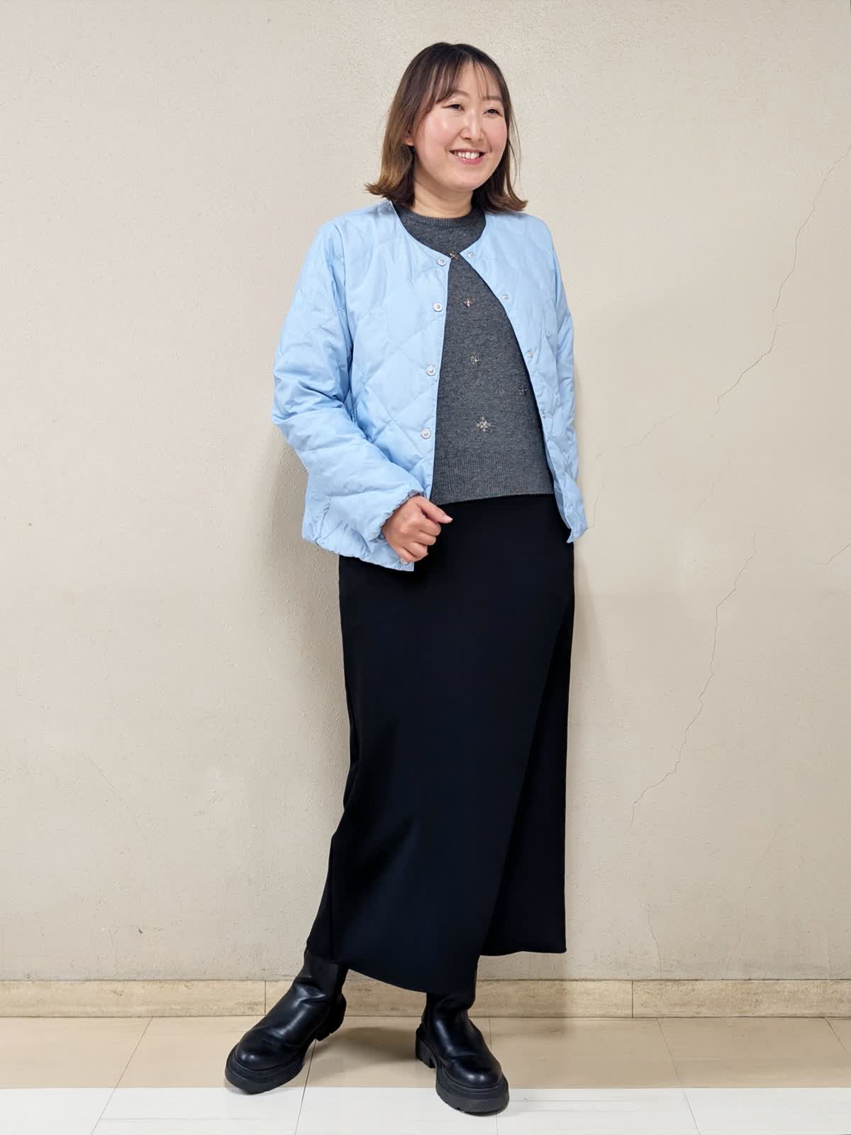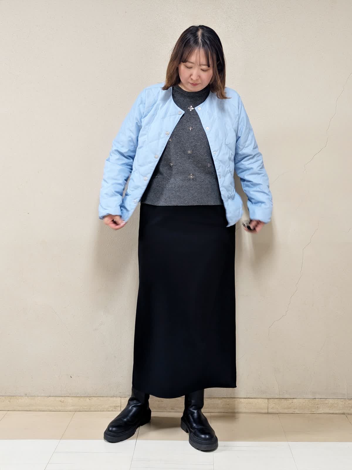 【着用サイズ】ダウン、ニット:9号 スカート:フリー【着用カラー】ダウン:サックス ニット:グレー スカート:ブラック きれいめカジュアルコーディネートです。通勤にも休日にも着回せる、万能アイテムを組み合わせました。タイオンコラボのダウンは軽くて暖かく、着膨れせずスッキリ着られます。アウターとしてはもちろん、インナーダウンとしても着ていただけます。ニットはビジューが華やかな印象に。コンパクトなのでスカートとの相性抜群です。合わせたスカートは、タイト目ながらもストレッチが効いていて伸びるので動きやすいです。