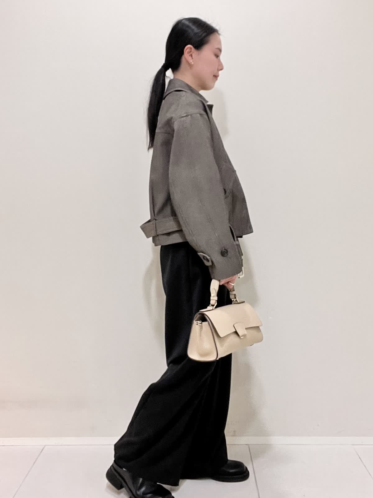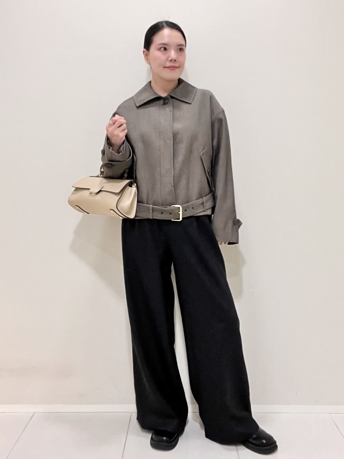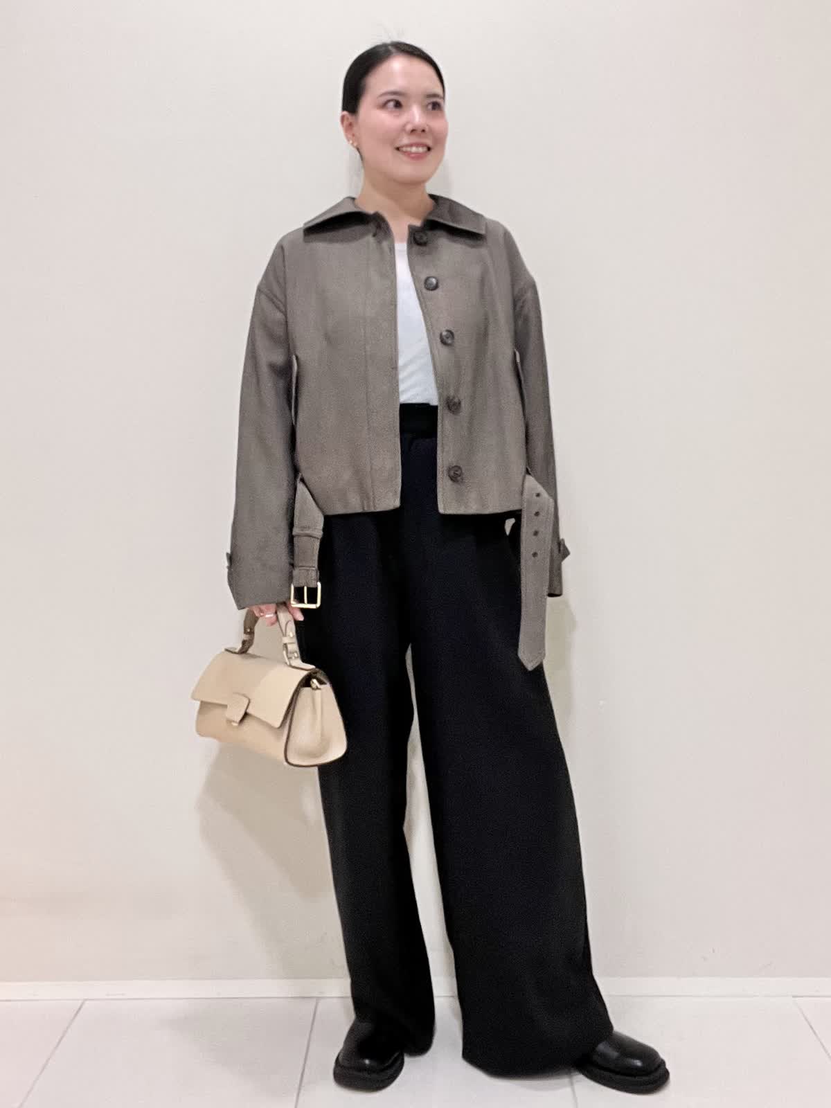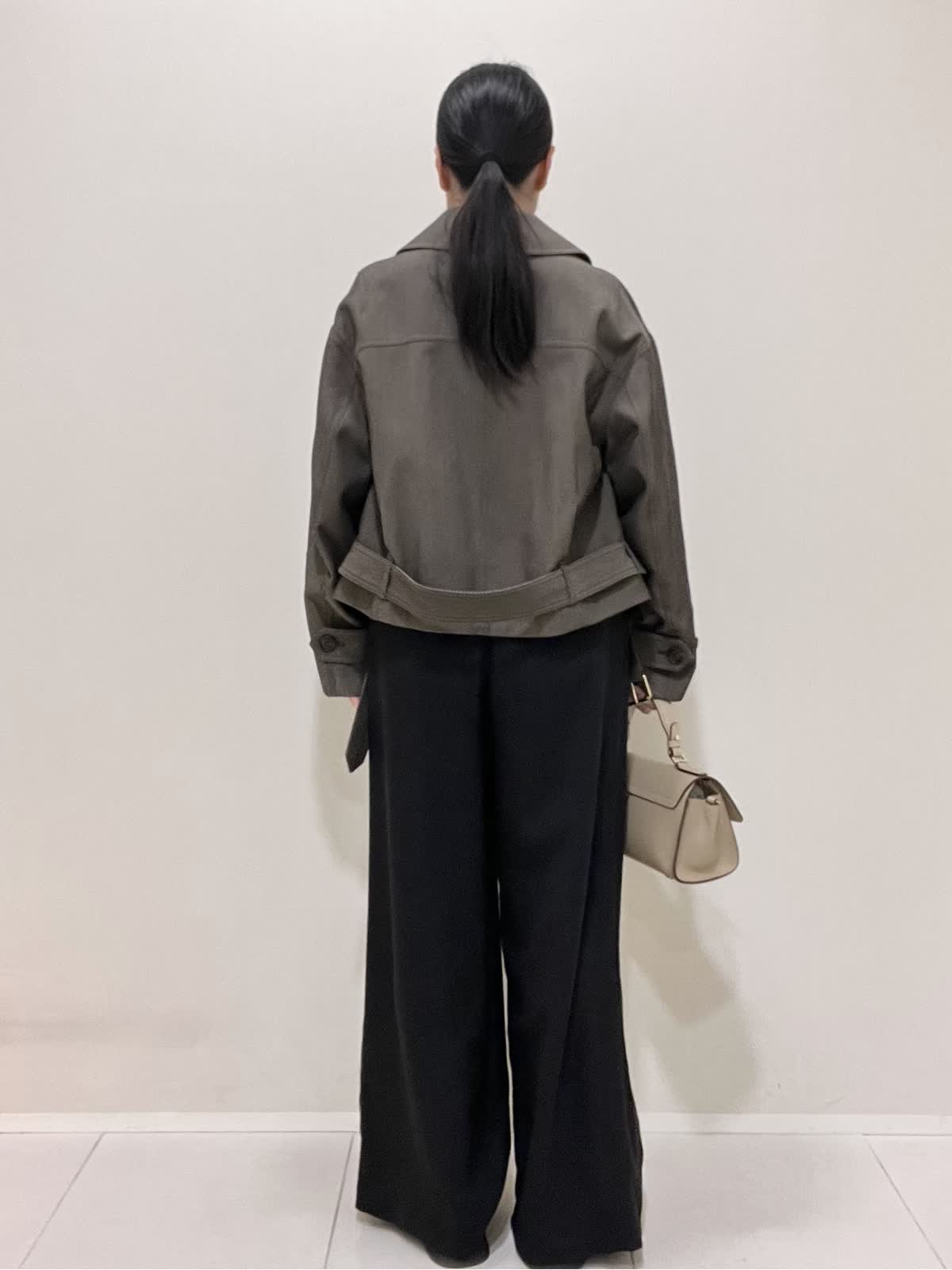 【着用サイズ/カラー】ブルゾン:9号 ダークブラウン カットソー:9号 オフホワイト パンツ:7号 ブラック バッグ:ベージュ 綺麗めカジュアルコーデ。コラボブルゾンは丈がコンパクトなので、ワイドパンツにも合います。パンツのベルトは外して着用しました。インナーには、シアーカットソーをチョイス。ブルゾンとカットソーを秋カラーにしたので、インナーの白で軽さをプラスしました。