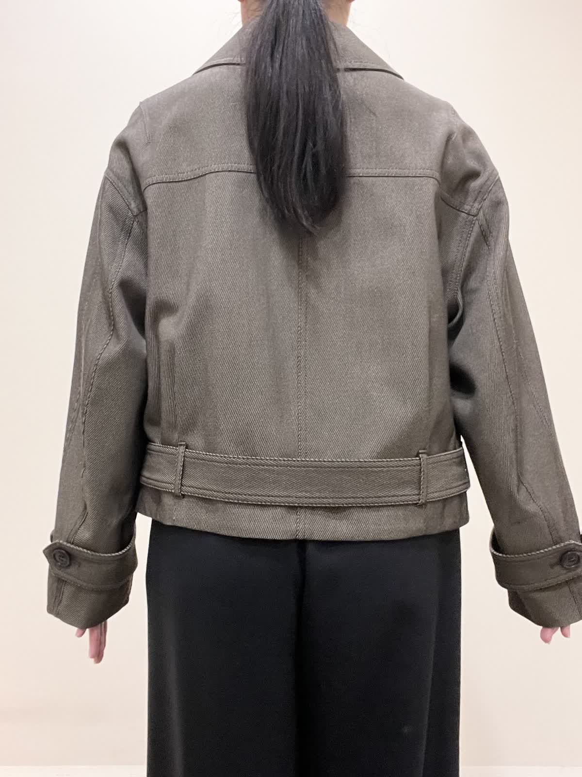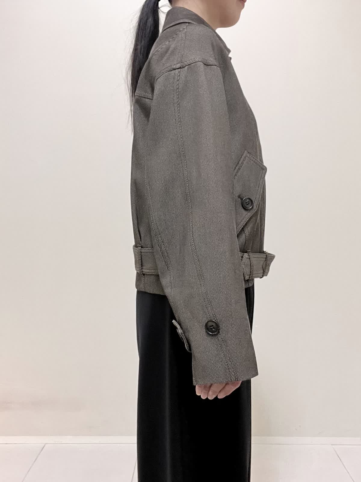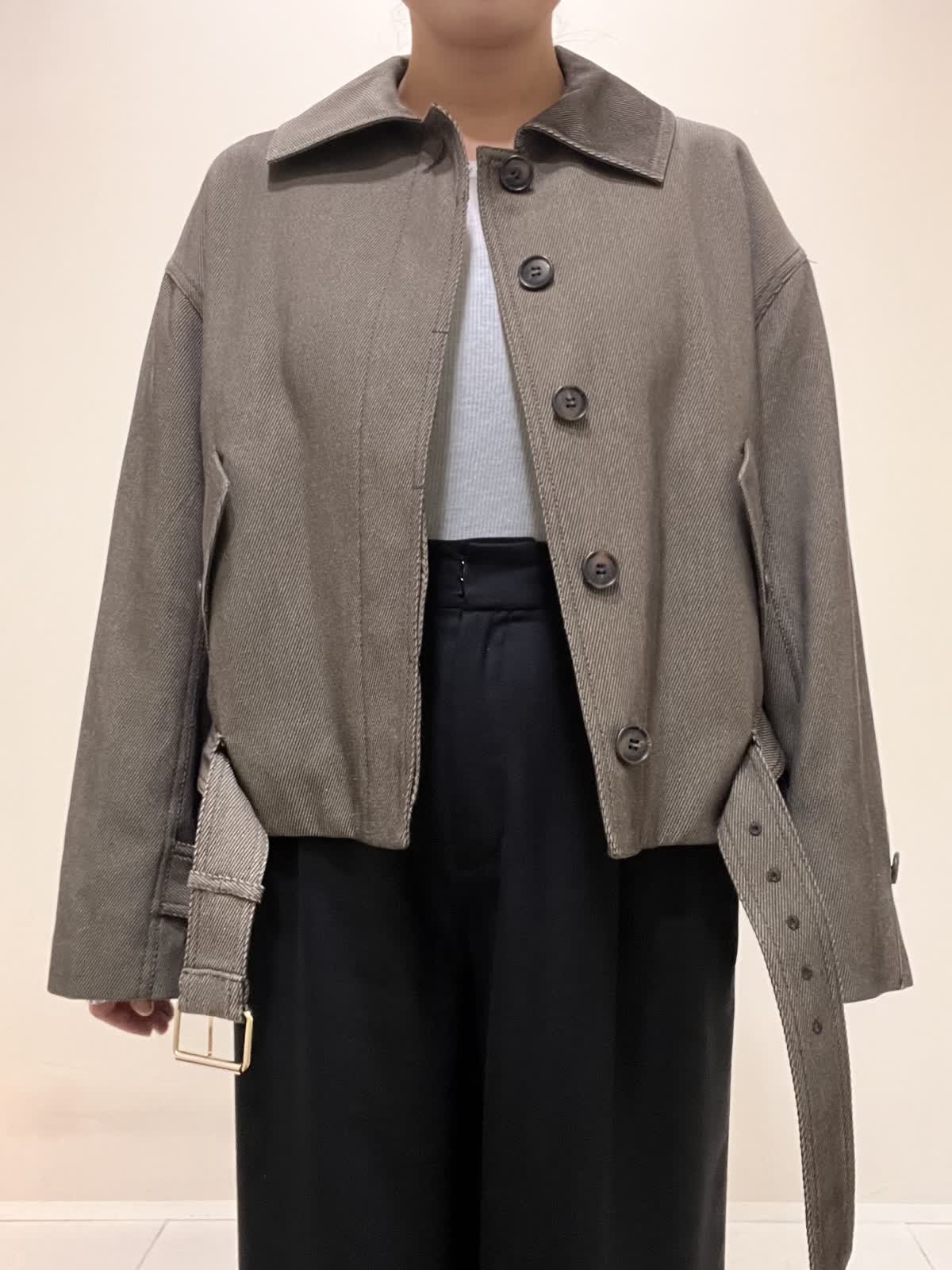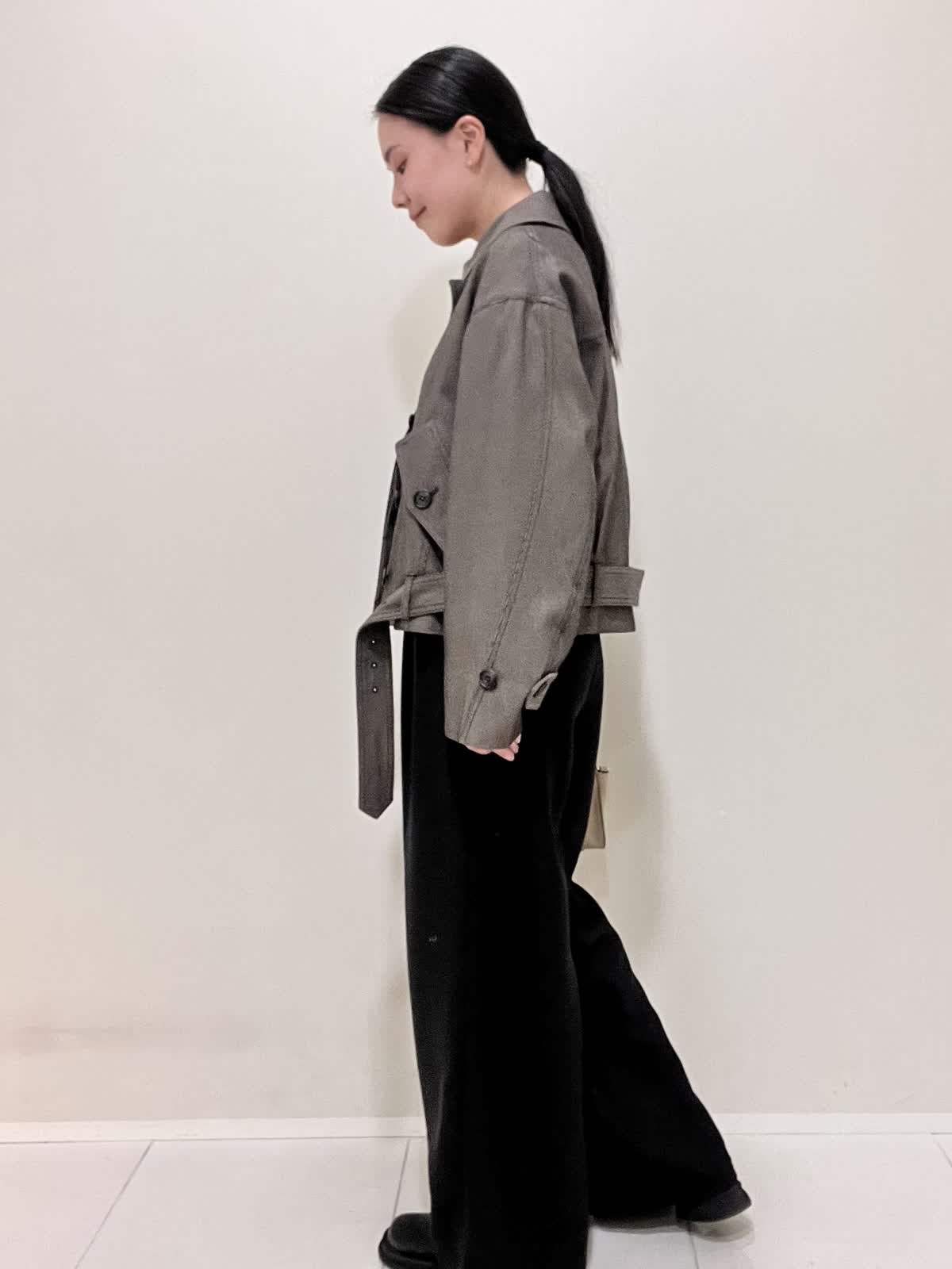 【着用サイズ/カラー】ブルゾン:9号 ダークブラウン カットソー:9号 オフホワイト パンツ:7号 ブラック バッグ:ベージュ 綺麗めカジュアルコーデ。コラボブルゾンは丈がコンパクトなので、ワイドパンツにも合います。パンツのベルトは外して着用しました。インナーには、シアーカットソーをチョイス。ブルゾンとカットソーを秋カラーにしたので、インナーの白で軽さをプラスしました。