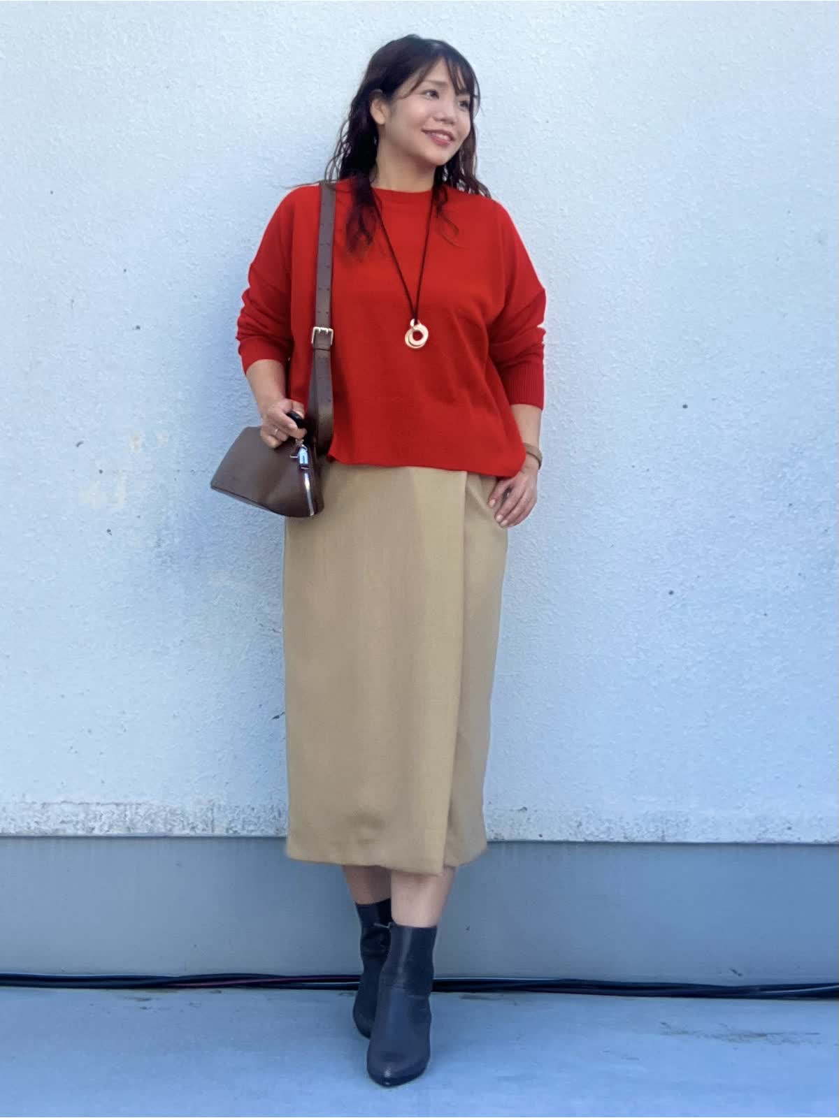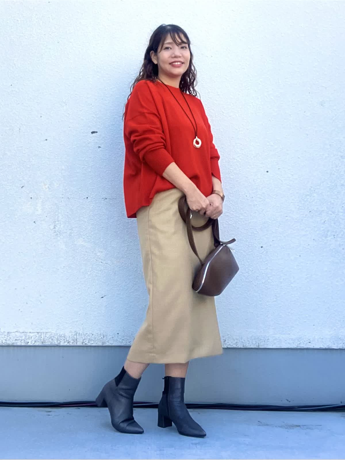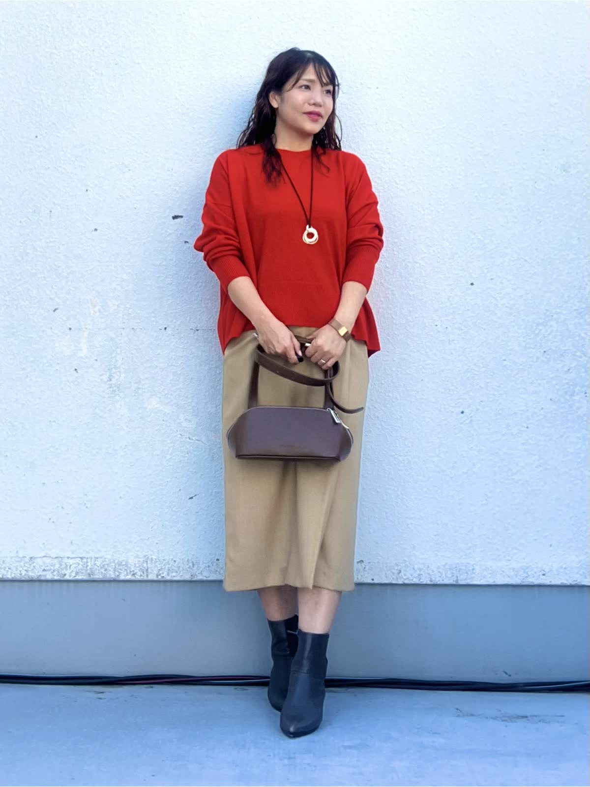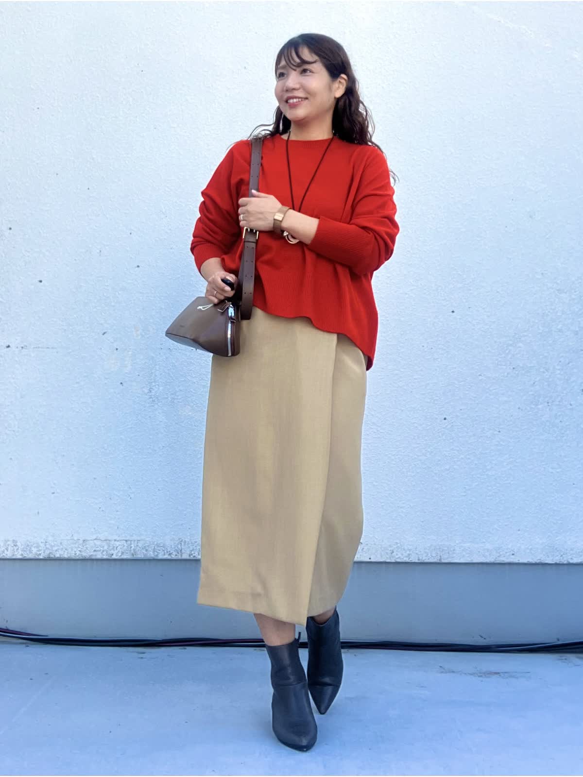 【着用アイテム:カラー/サイズ】 ニット:シュイロ/9号 スカート:ベージュ/11号 発色の良い赤が明るく見せシンプルながら存在感のある一枚。ゆるめのシルエットで着心地も抜群です。ベージュのタイトスカートを合わせ上品にまとめました。