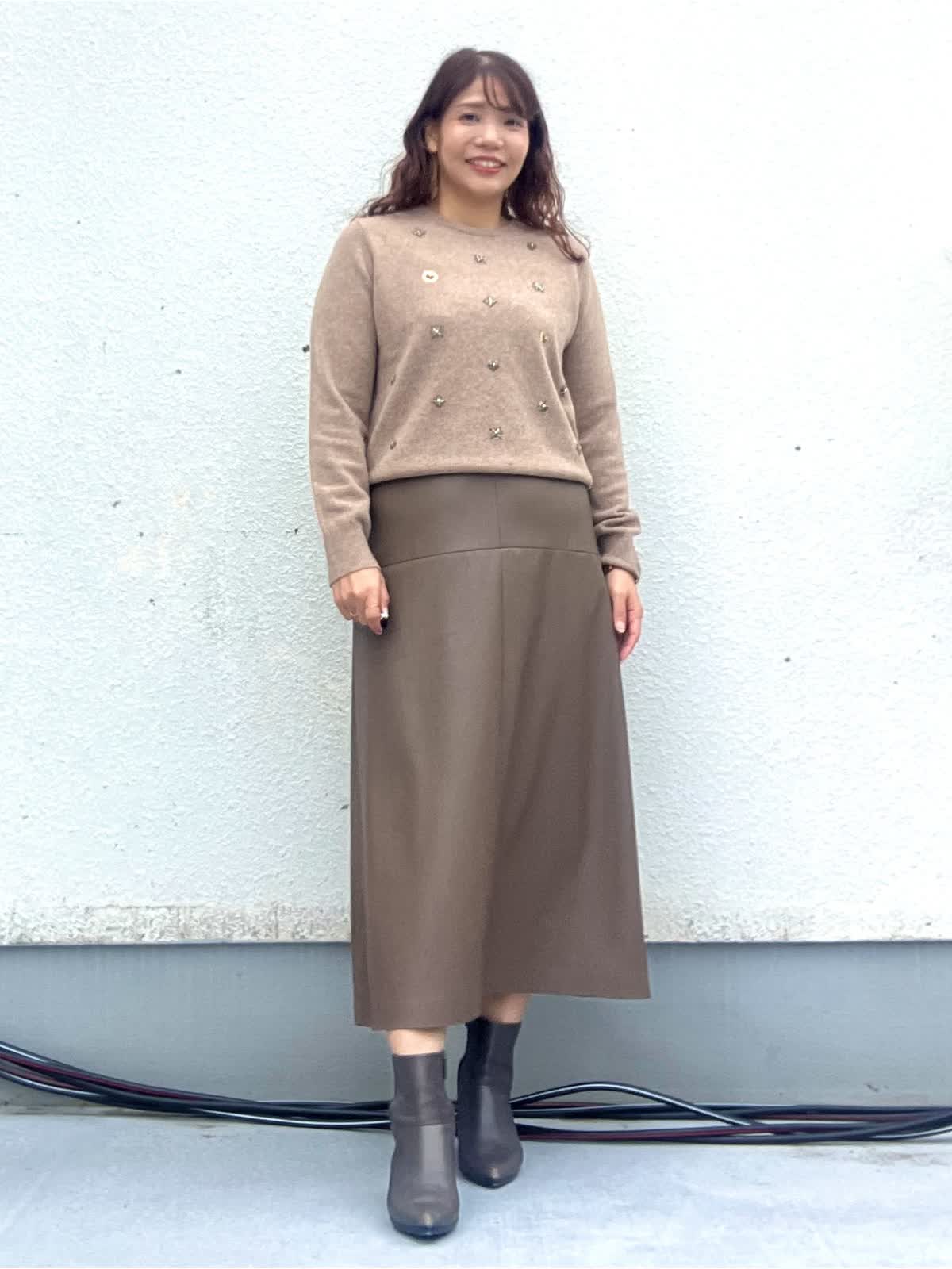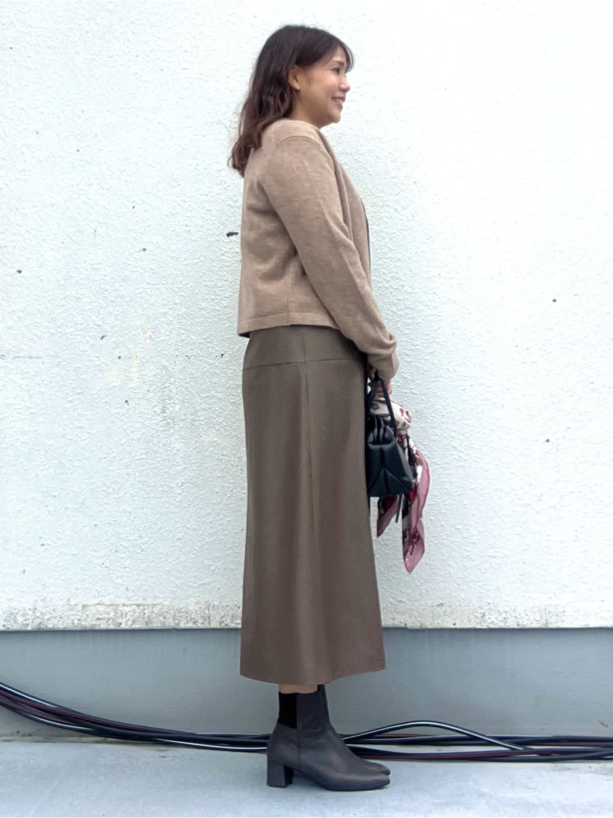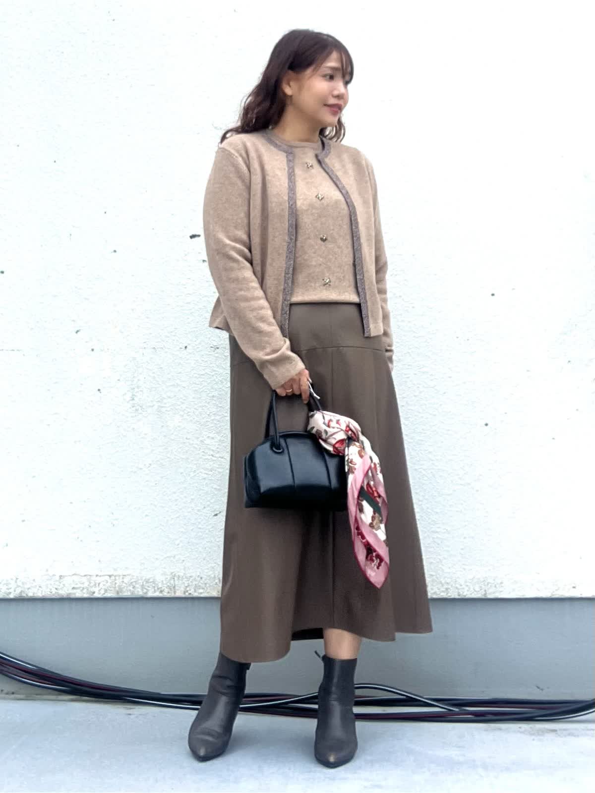 【着用アイテム:カラー/サイズ】 ニット:ベージュ/9号 カーディガン:ベージュ/9号 スカート:ブラウン/11号 ノーカラーカーデは襟と前立てにラメが入っておりとても華やかな印象に。インナーは煌めくジュエリーのようなビジューがアクセントのニット。スカートも茶系でワントーンコーデにしました。