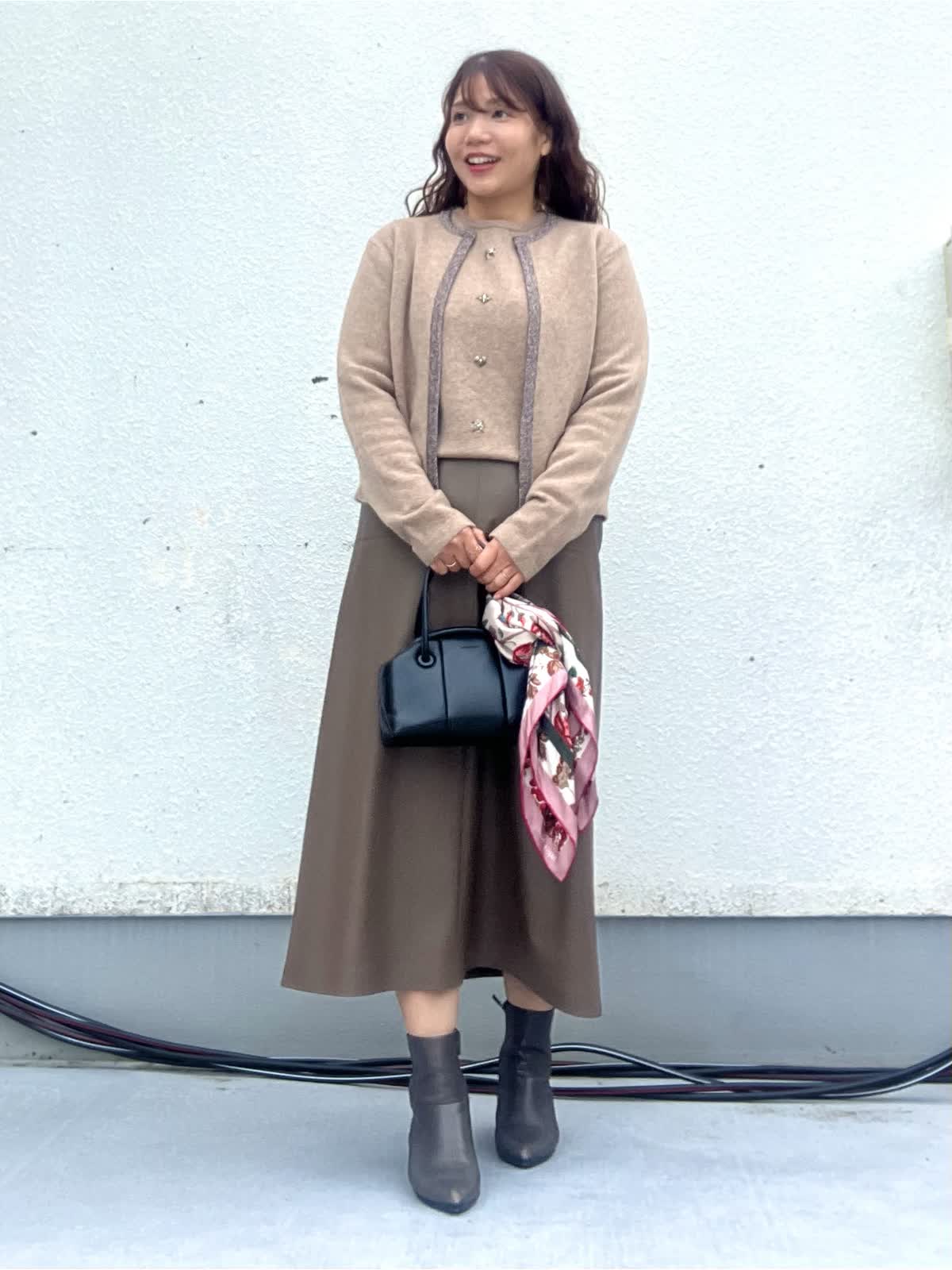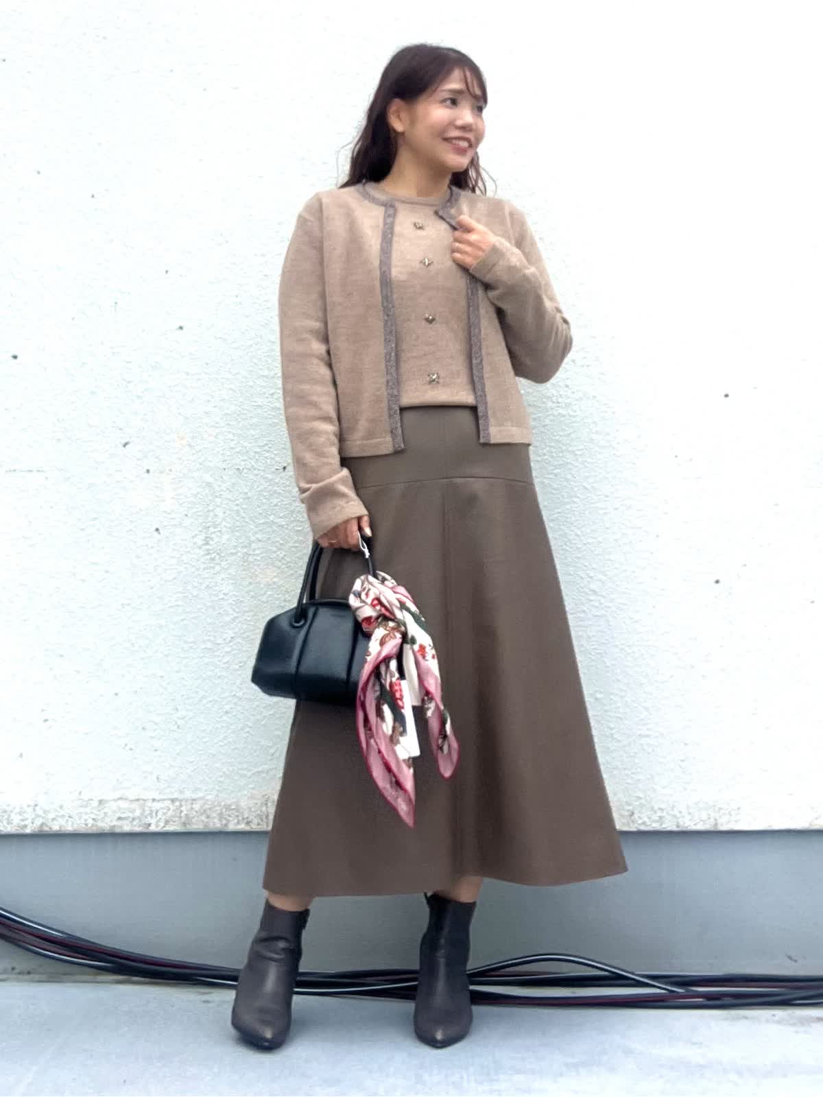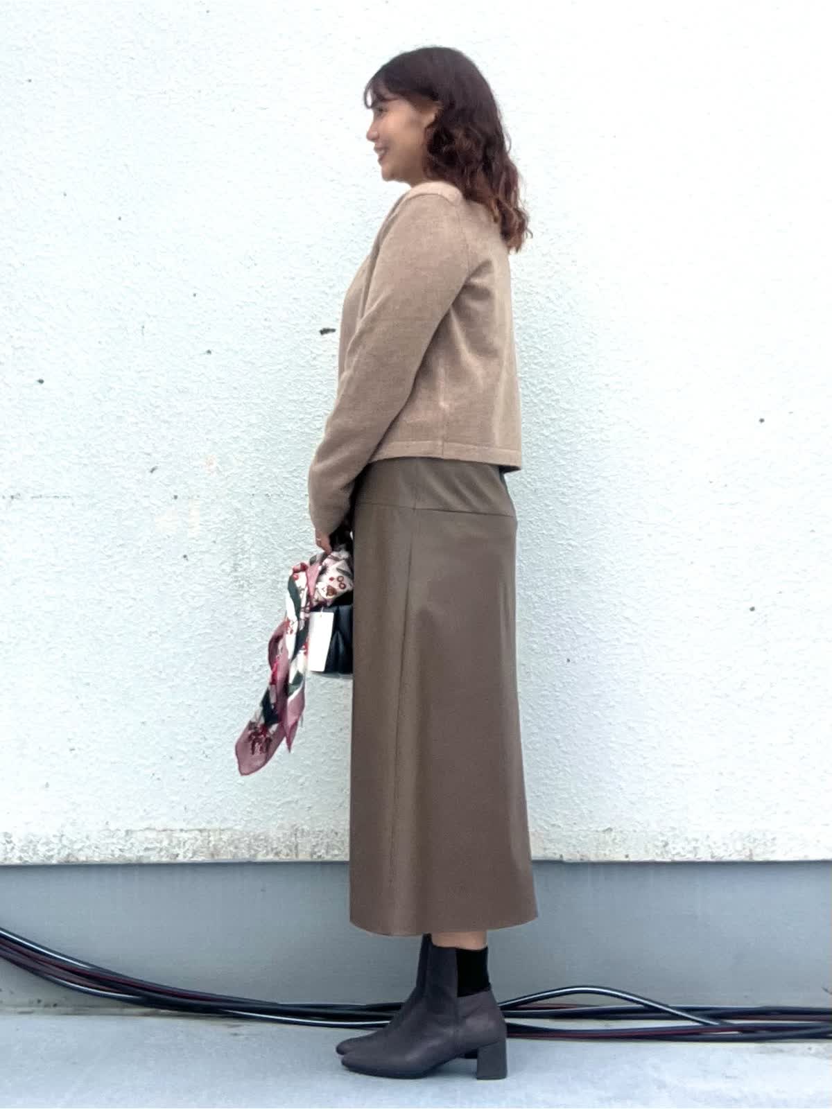 【着用アイテム:カラー/サイズ】 ニット:ベージュ/9号 カーディガン:ベージュ/9号 スカート:ブラウン/11号 ノーカラーカーデは襟と前立てにラメが入っておりとても華やかな印象に。インナーは煌めくジュエリーのようなビジューがアクセントのニット。スカートも茶系でワントーンコーデにしました。