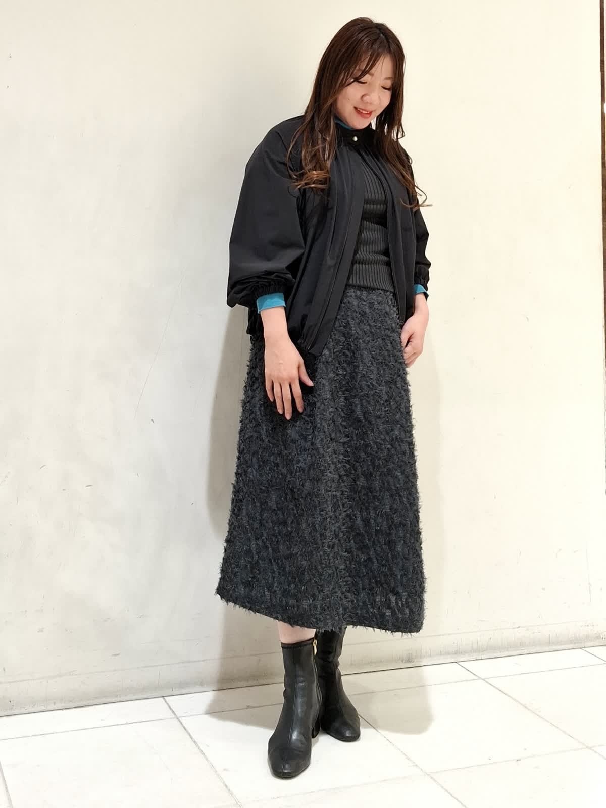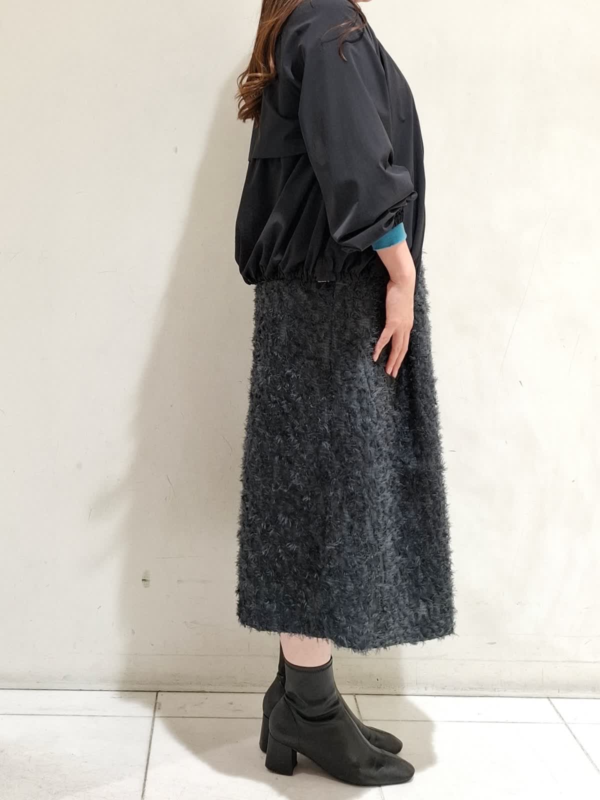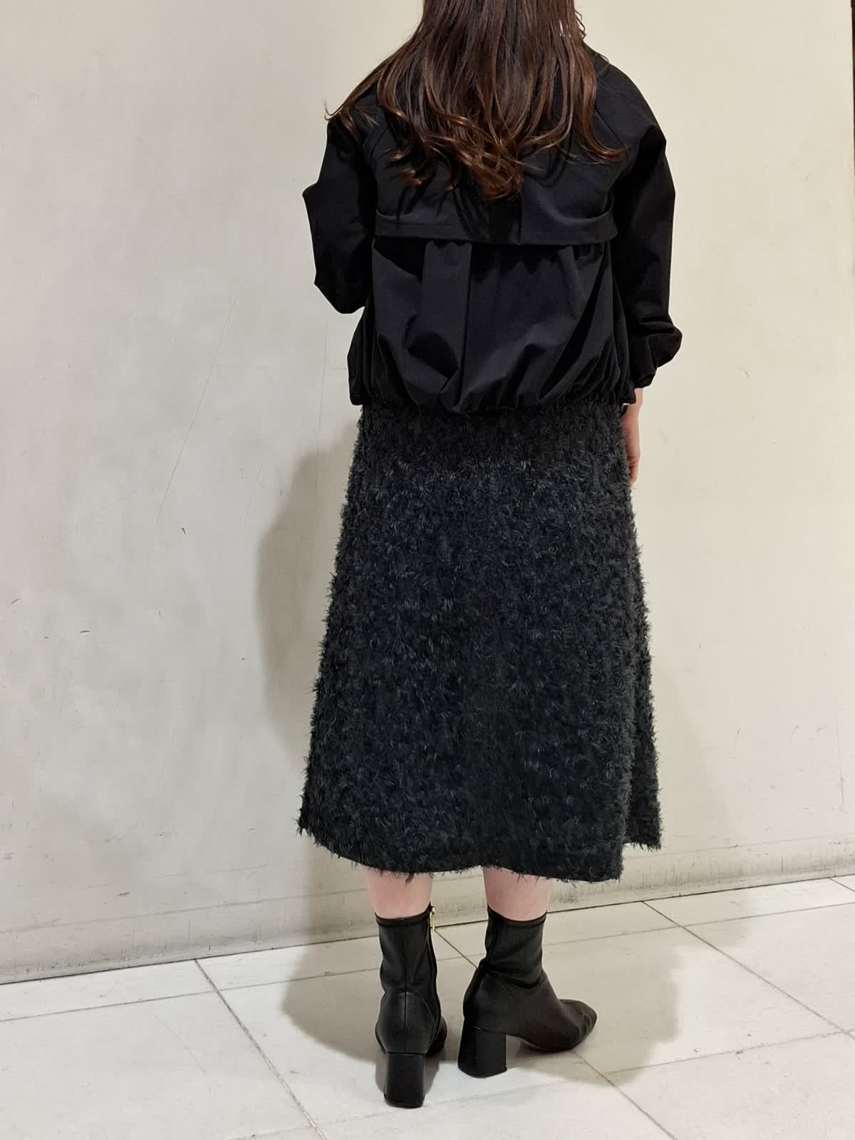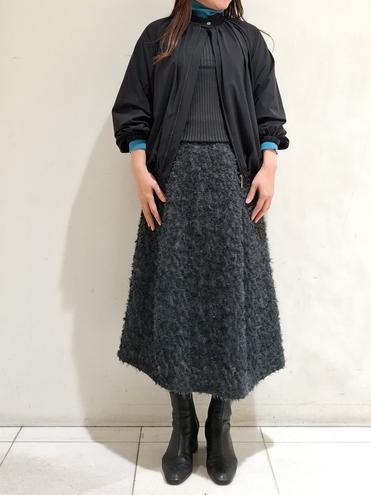 【着用サイズ】ブルゾン:フリーサイズ ブラック ニット:9号サイズ スミクロ スカート:9号サイズ チャコールグレー 軽くて伸縮性とハリのある素材感のブルゾン。撥水加工で季節の変わり目など、シーズンレスで活躍してくれます。ニットは、サラッとした肌触りのよい素材で、一枚でもインナーとしても着やすいです。スカートは、ふんわりとして柔らかく、広がりすぎないフレアシルエットがはくだけで女性らしさを引き立ててくれます。