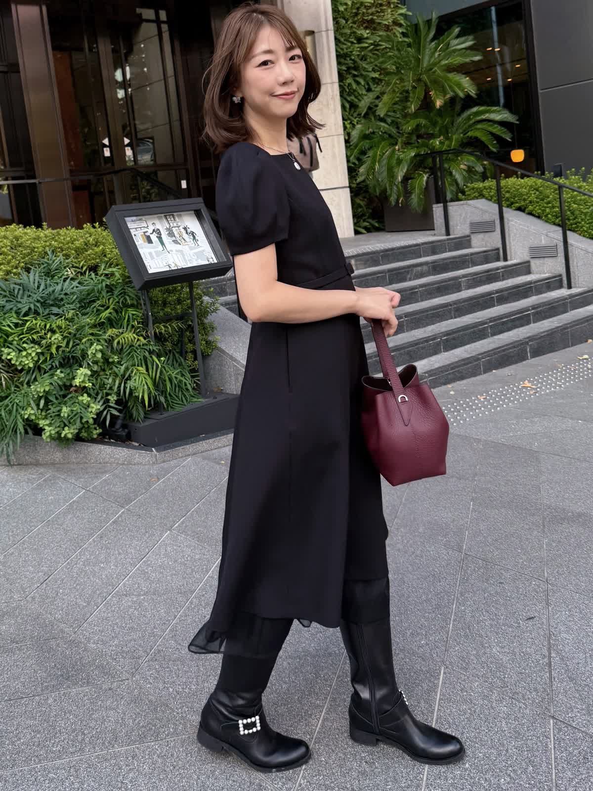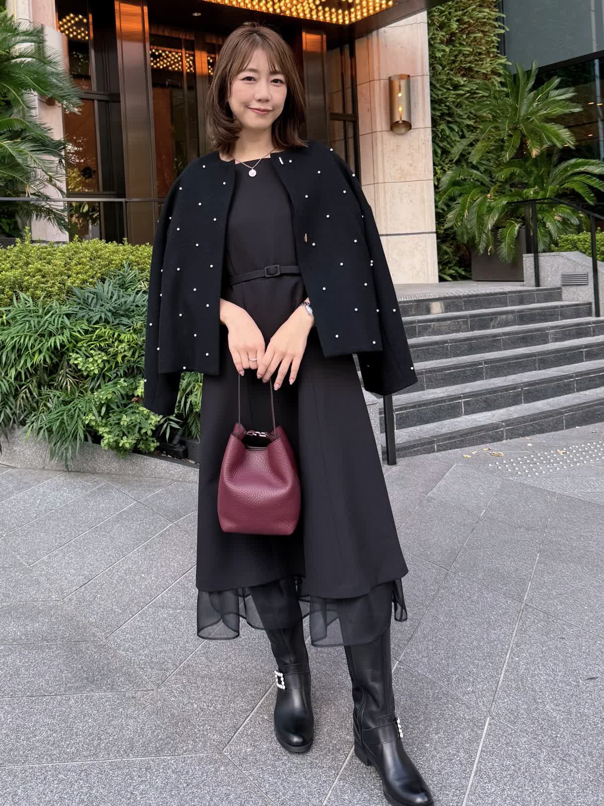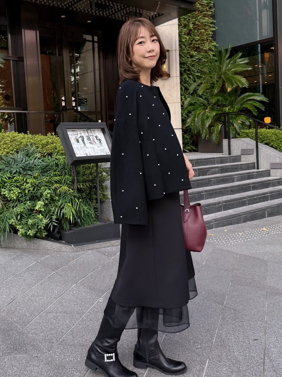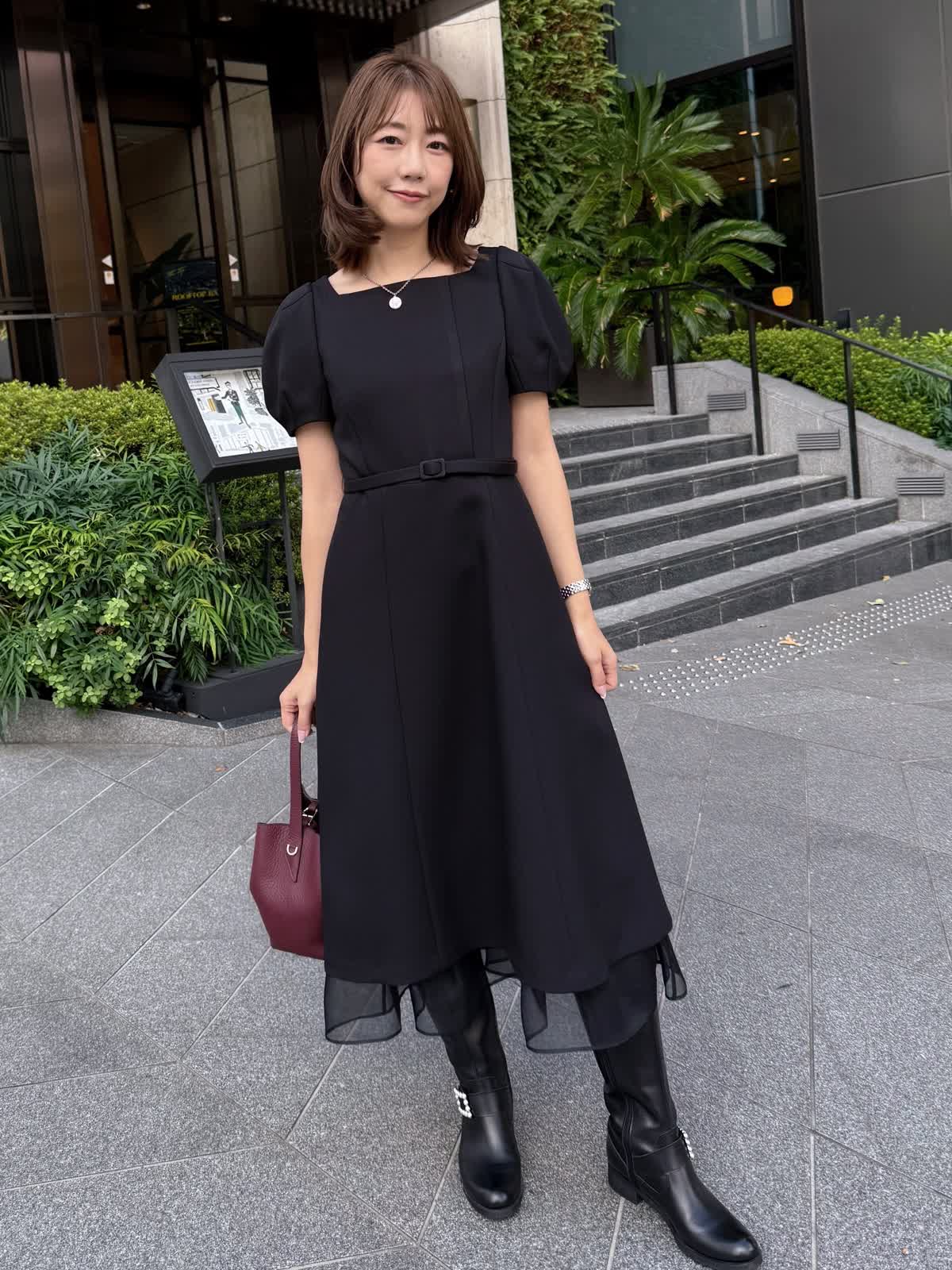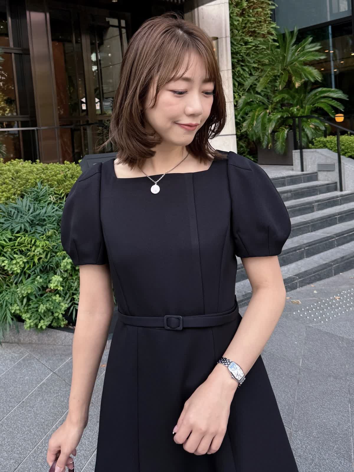 【着用サイズ】ワンピース:7号 曽田茉莉江さんとのコラボワンピース。ハリと軽さのある素材感で着るだけで上品なフィット&フレアシルエットに。アクセサリーが映える上品なスクエアネックと、映え袖がバランスよく、中にタートルを着たりカーディガンなど着回しも抜群。裾からのオーガンジーで透け感をプラスし、ウエストは共地のベルトでポイントに。シーズンレスで着れる素材ですがこれからの冬のお出かけシーンにぜひ。パールショートコートとのブラックコーデもおすすめ。