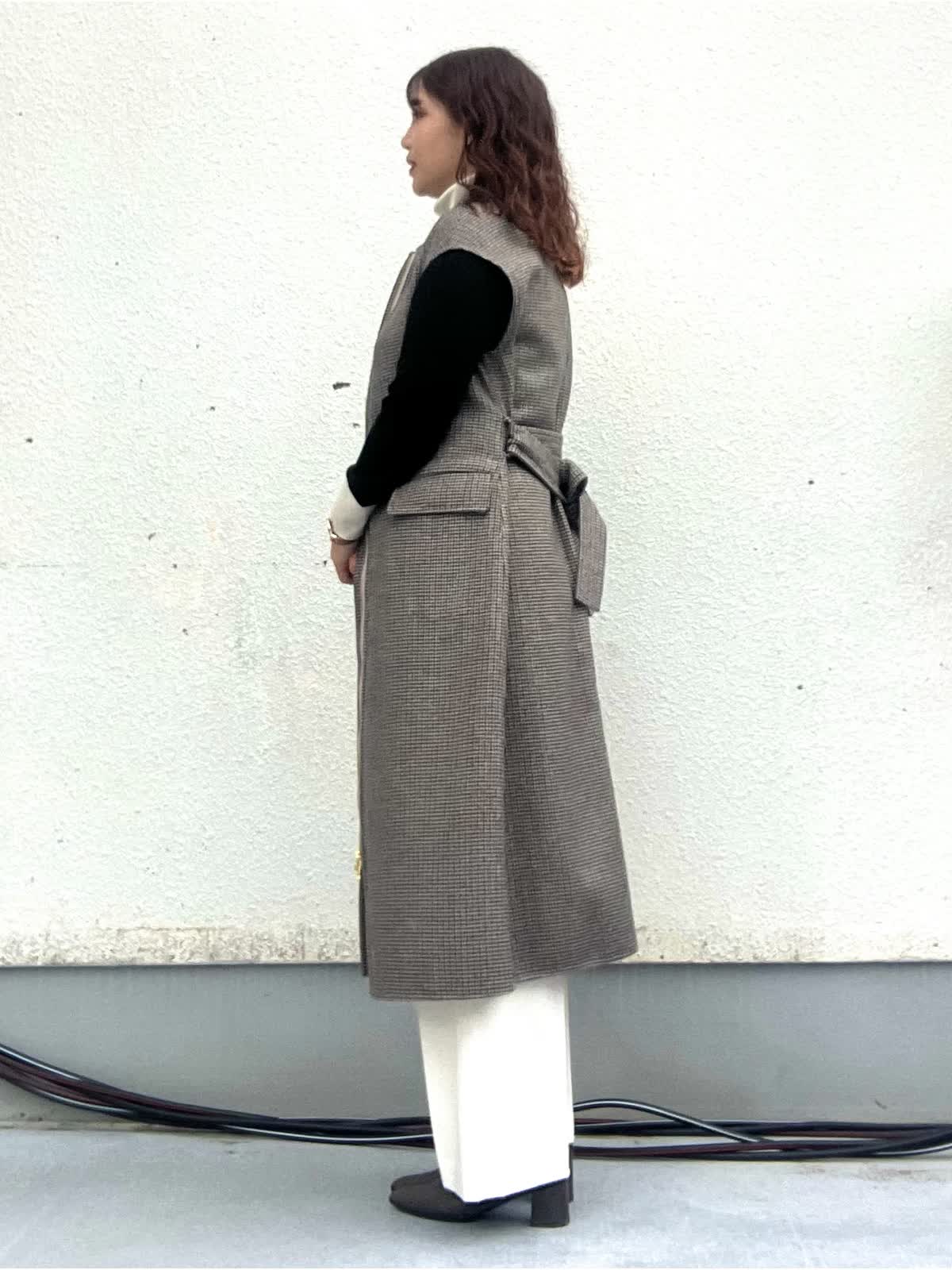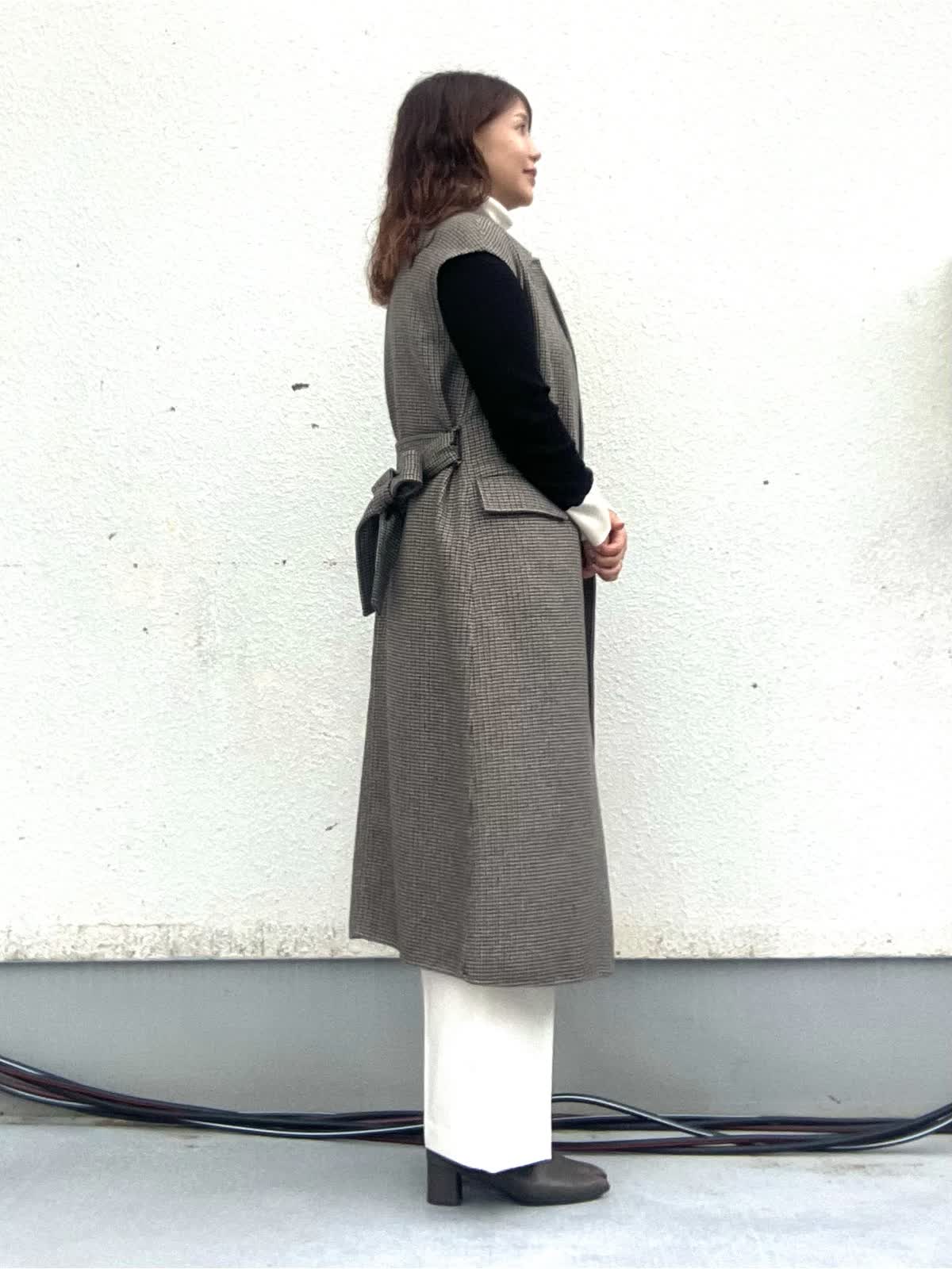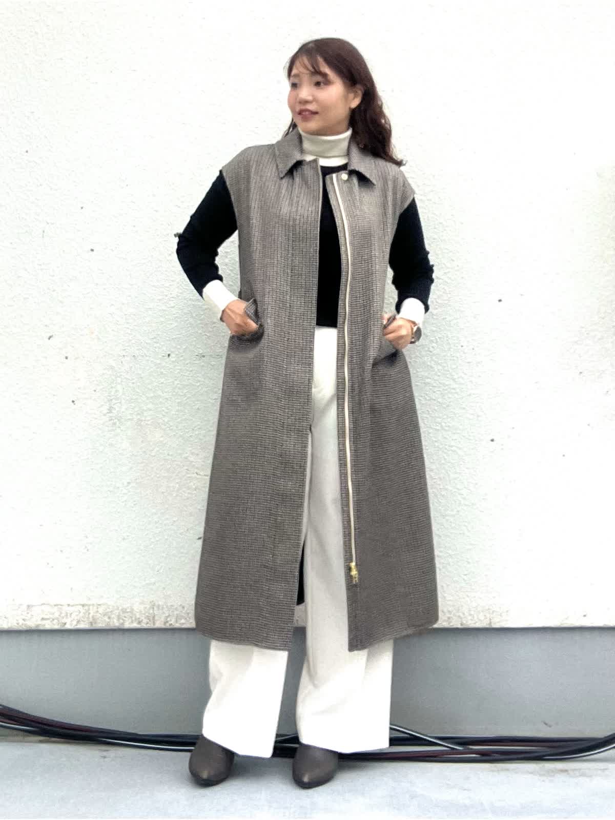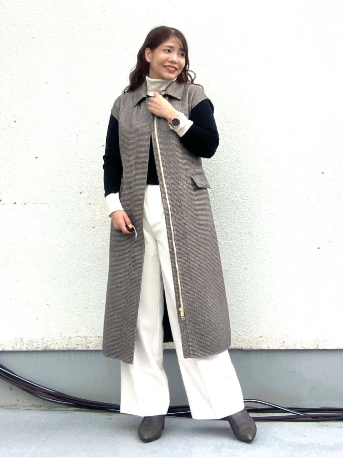【着用アイテム:カラー/サイズ】 ジレ:柄小/9号 ニット:ソノタ/11号 パンツ:オフホワイト/9号 ロングジレはフロントジップが両開きのデザインでワンピースとしても着れる2WAY仕様です。Iラインシルエットでとても着回しが効きます。白のワイドパンツと配色タートルを合わせ大人シックなコーディネートにしました。