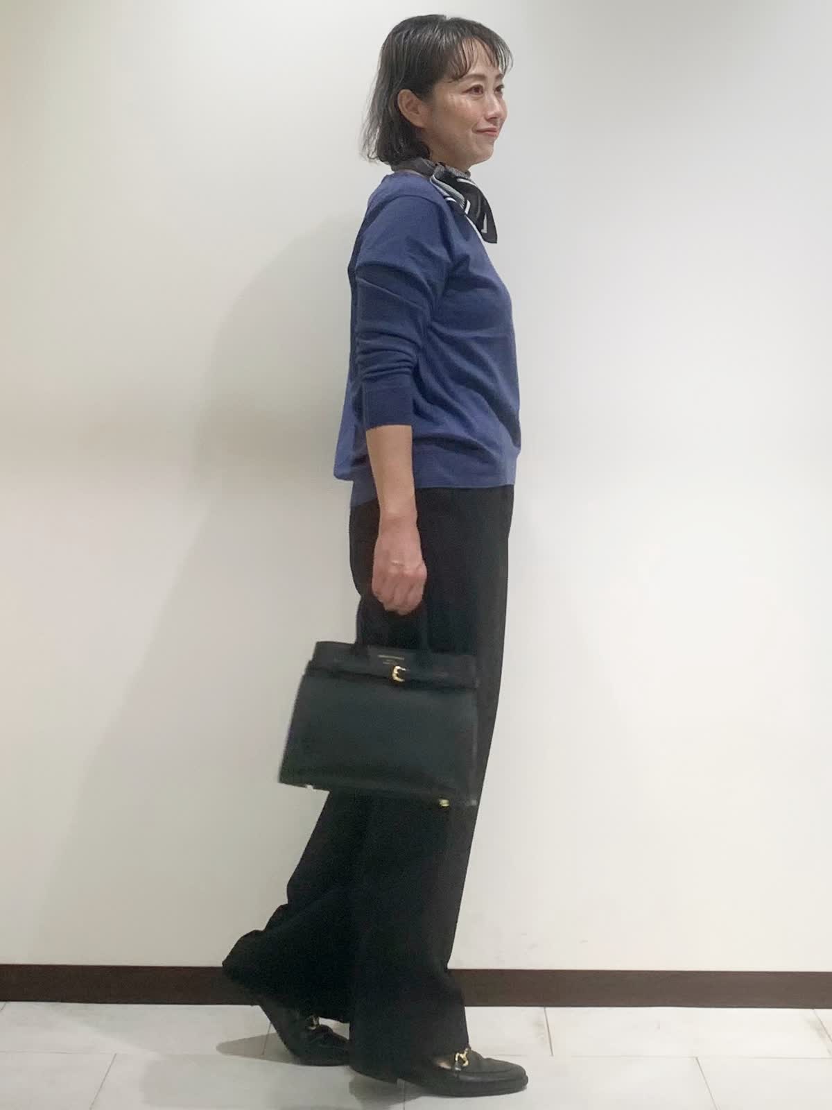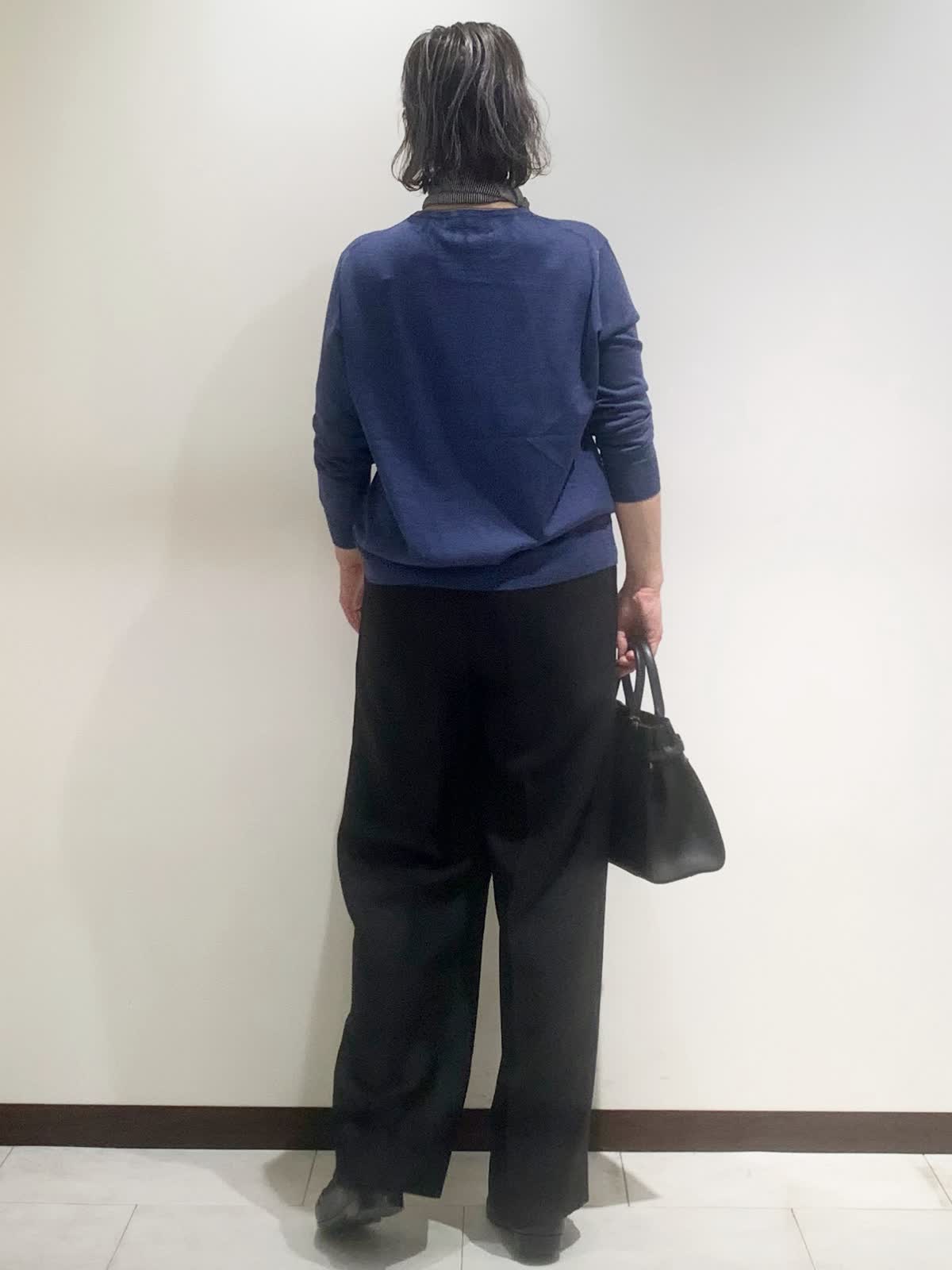 【着用サイズ】全て9号サイズ 【着用カラー】ニット:ブルーグレー パンツ:ブラック バッグ:ブラック ニットは程よいゆとりで、裾がカーブ形状になっているため気になるお腹周りを上手にカバーしてくれます。襟先のシアーな部分がさりげなく素敵なデザインです。ツータックパンツは腰回りをスッキリ見せてくれる優秀なパンツ。軽やかな柔らかい素材感もオススメです。