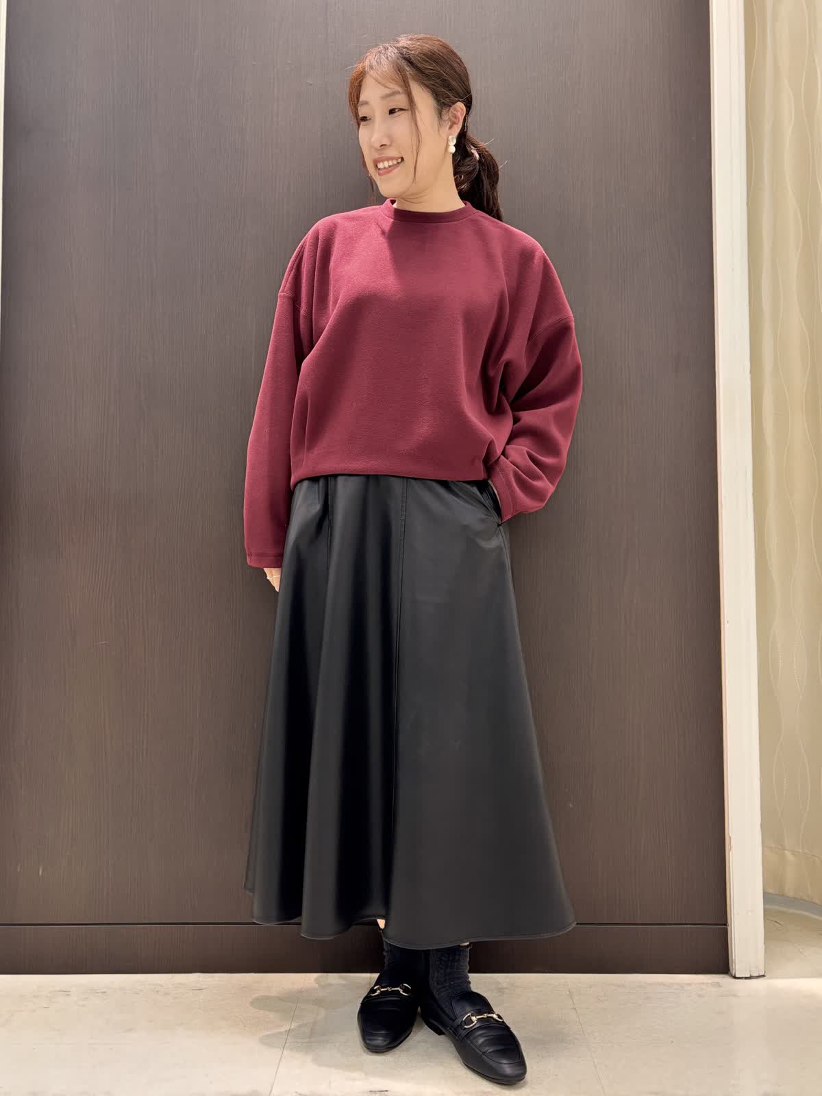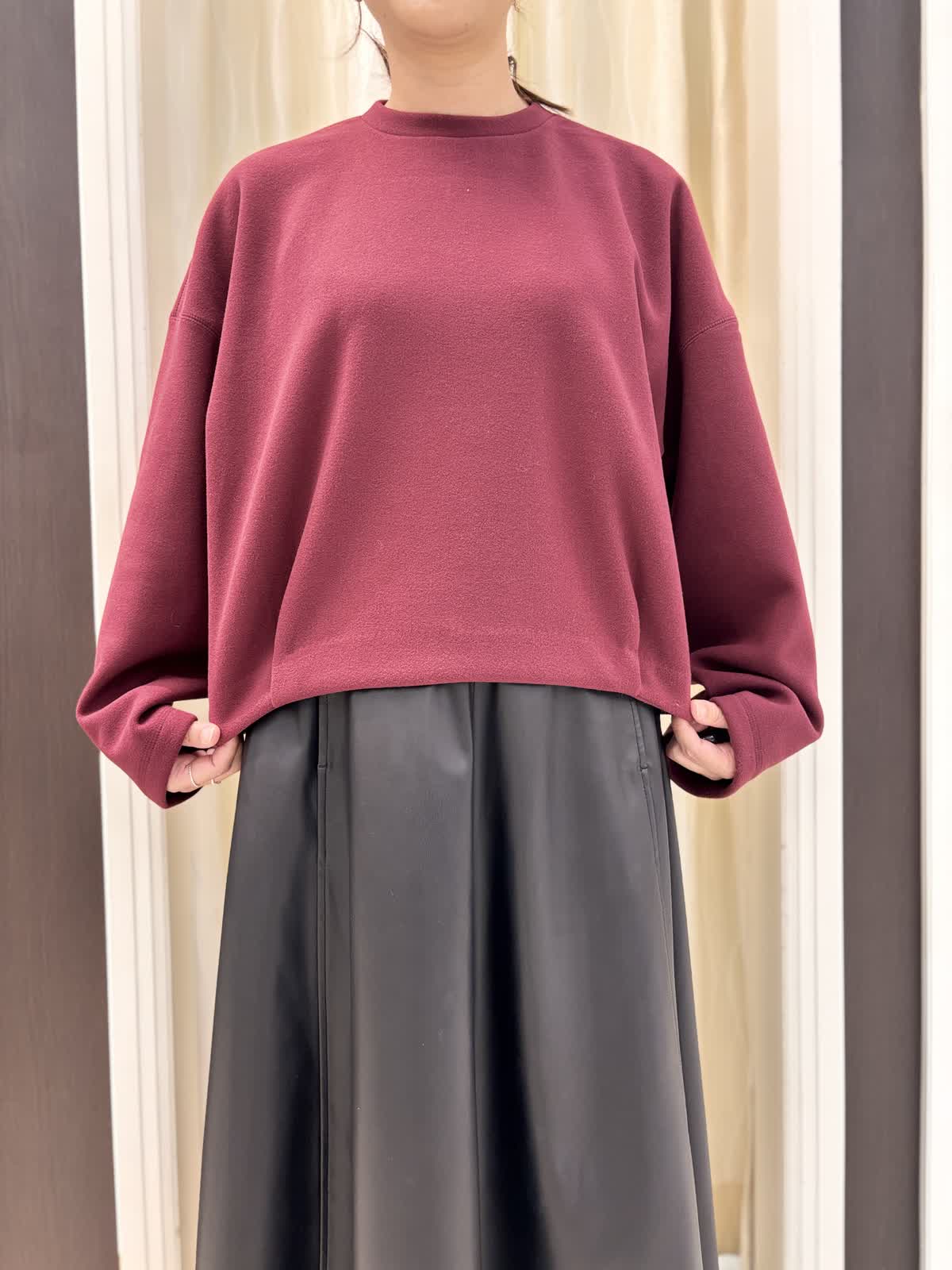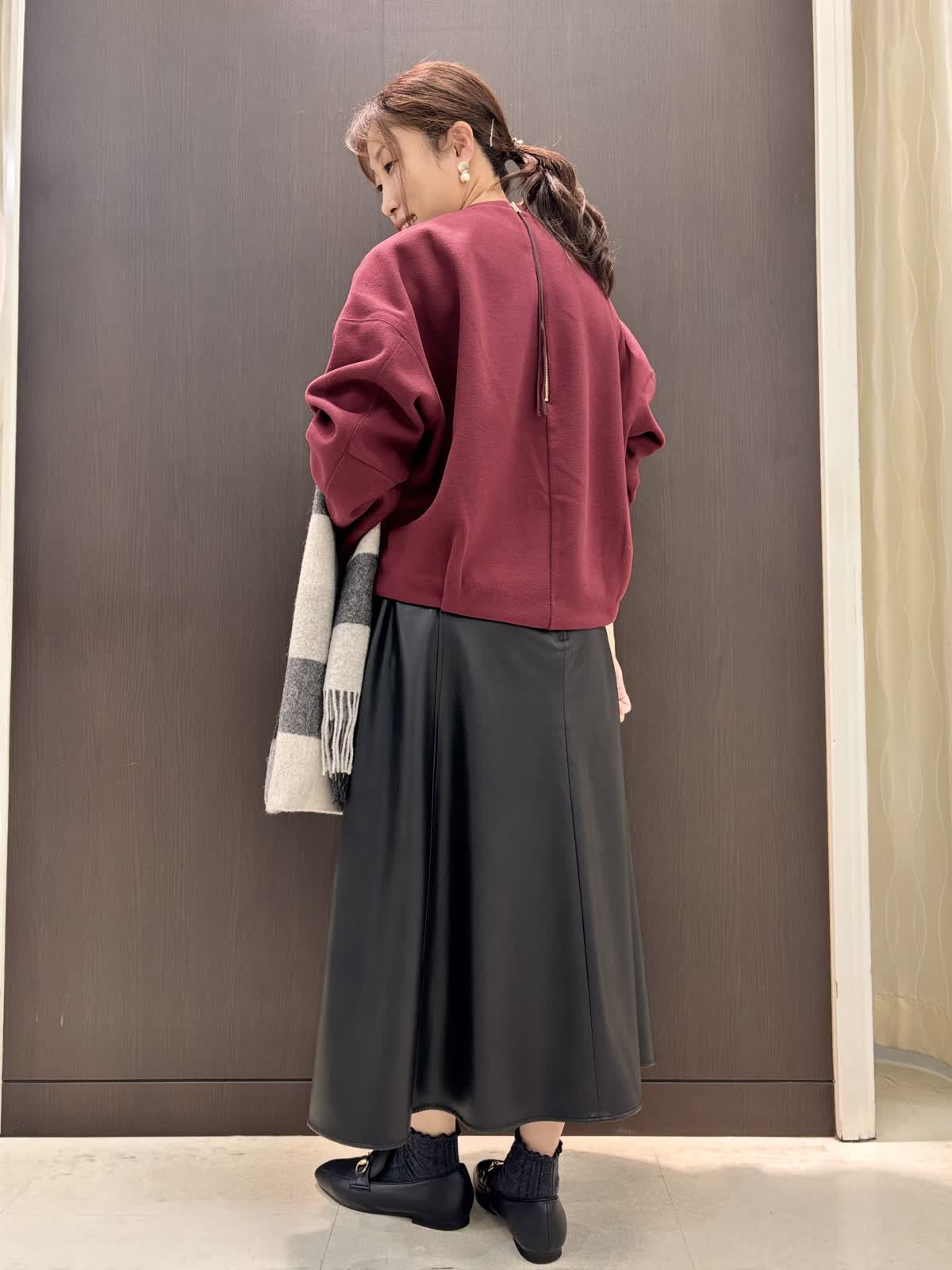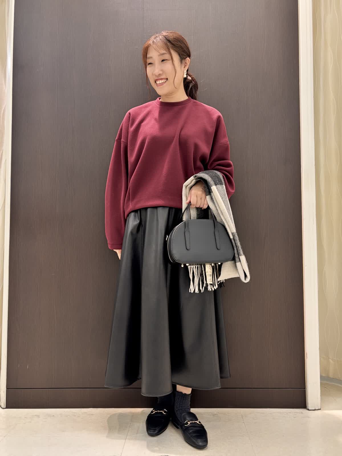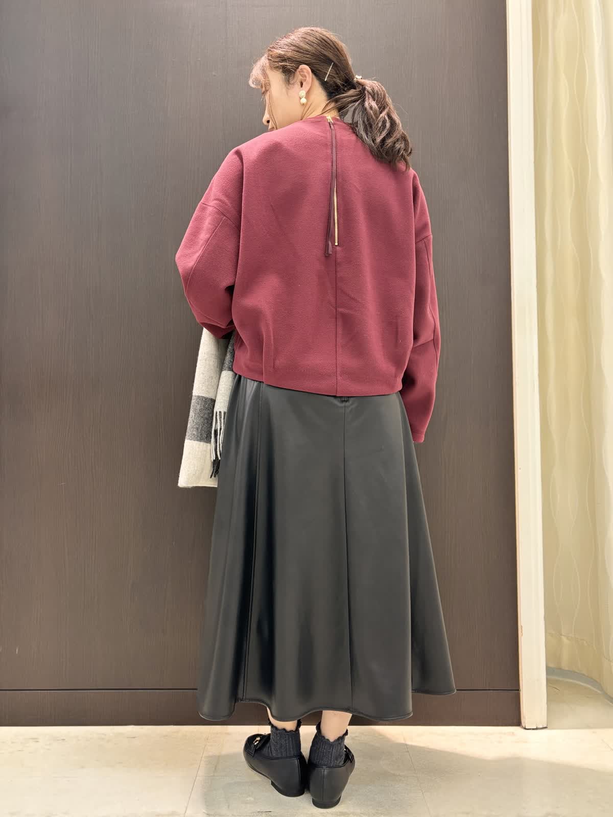 【着用カラー】プルオーバー:ボルドー スカート、ストール:ブラック
