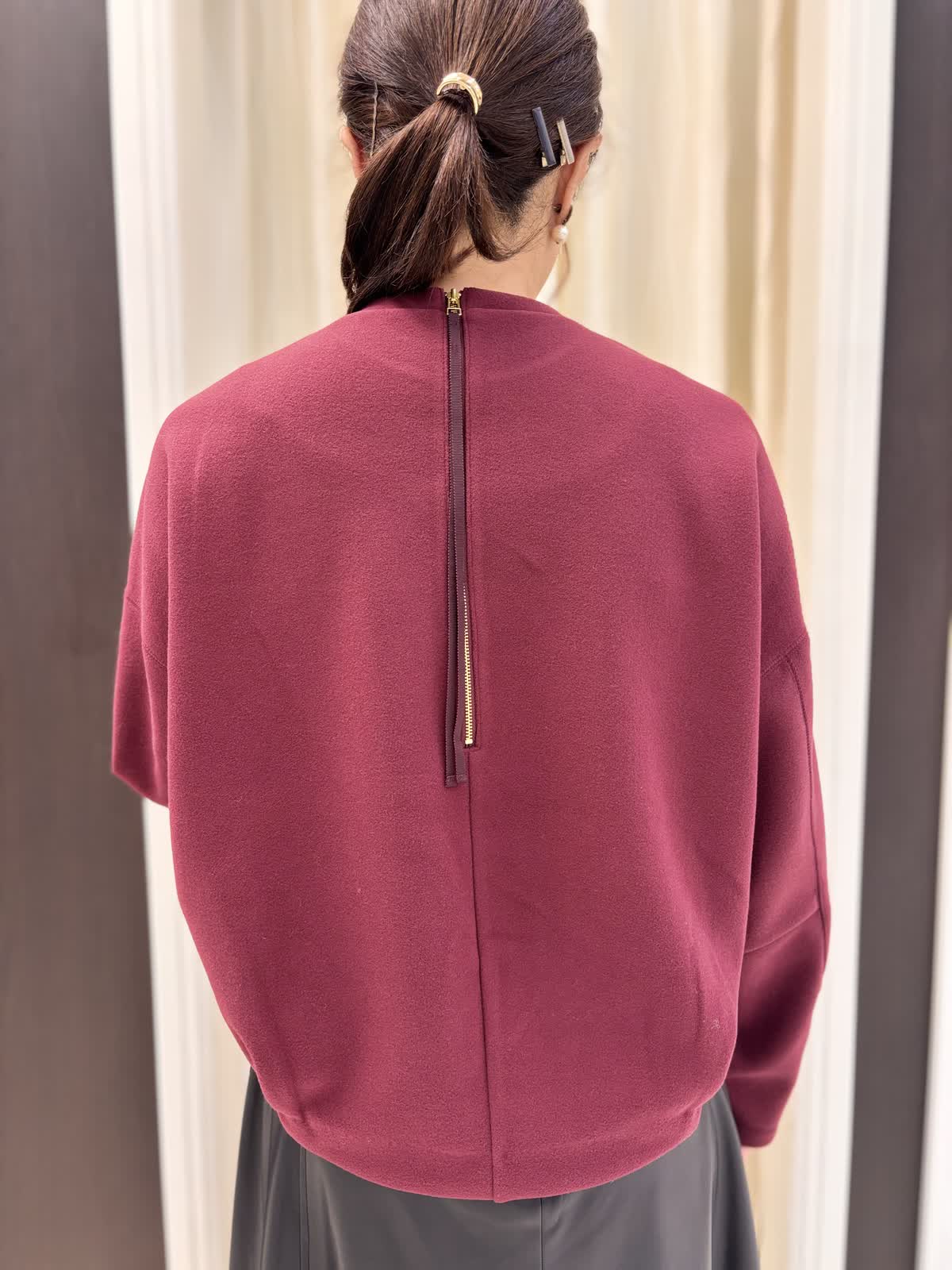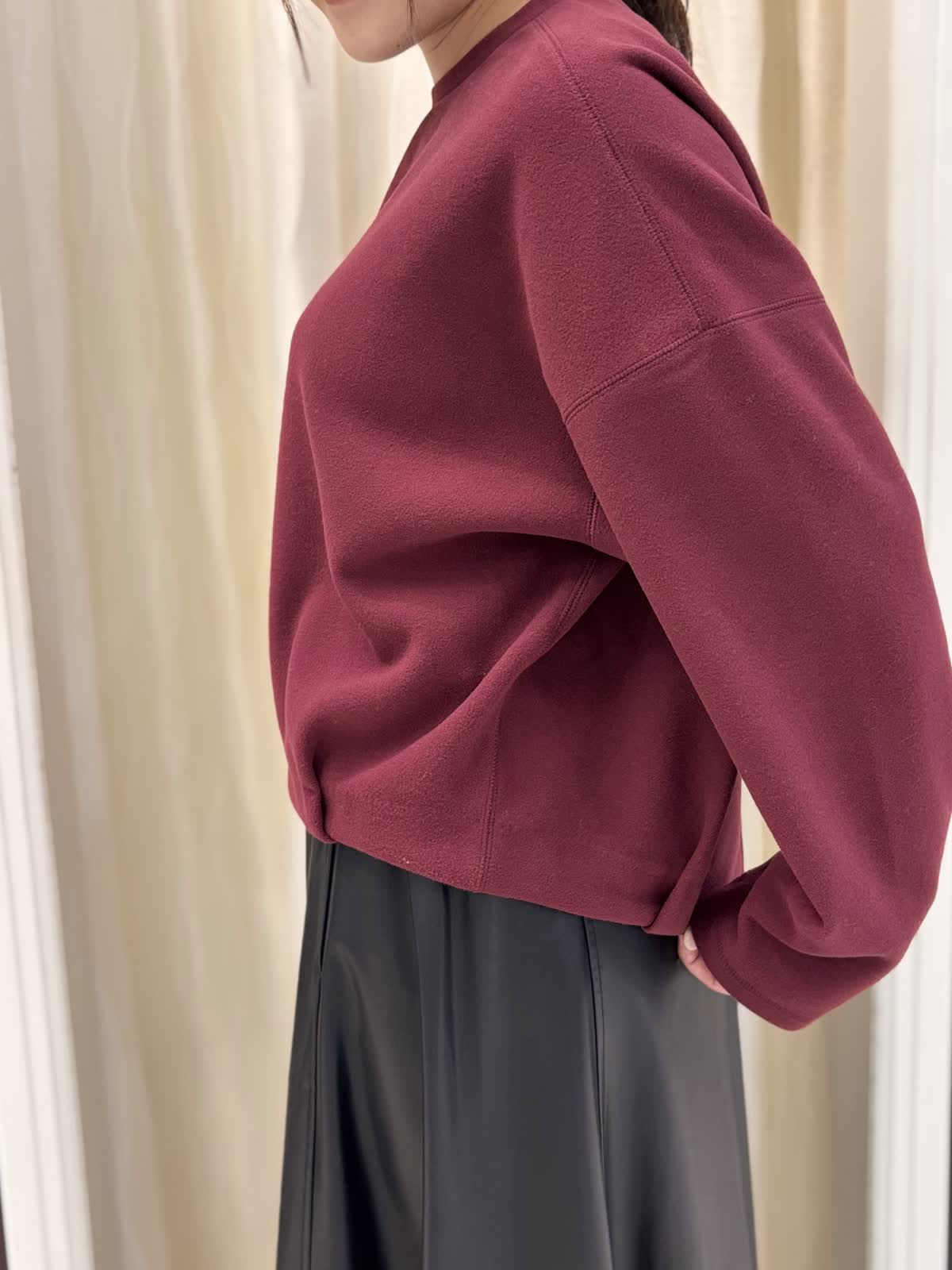 暖かく起毛感のある圧縮ジャージートップスは今からの季節にぴったり。軽い着心地でとっても着やすいのに着るだけで可愛さ満点!ボルドーの色味は深みもありおすすめのカラーです。後ろジップや裾のタックがポイントでカジュアルの中にもフェミニンな要素がたくさんです!
