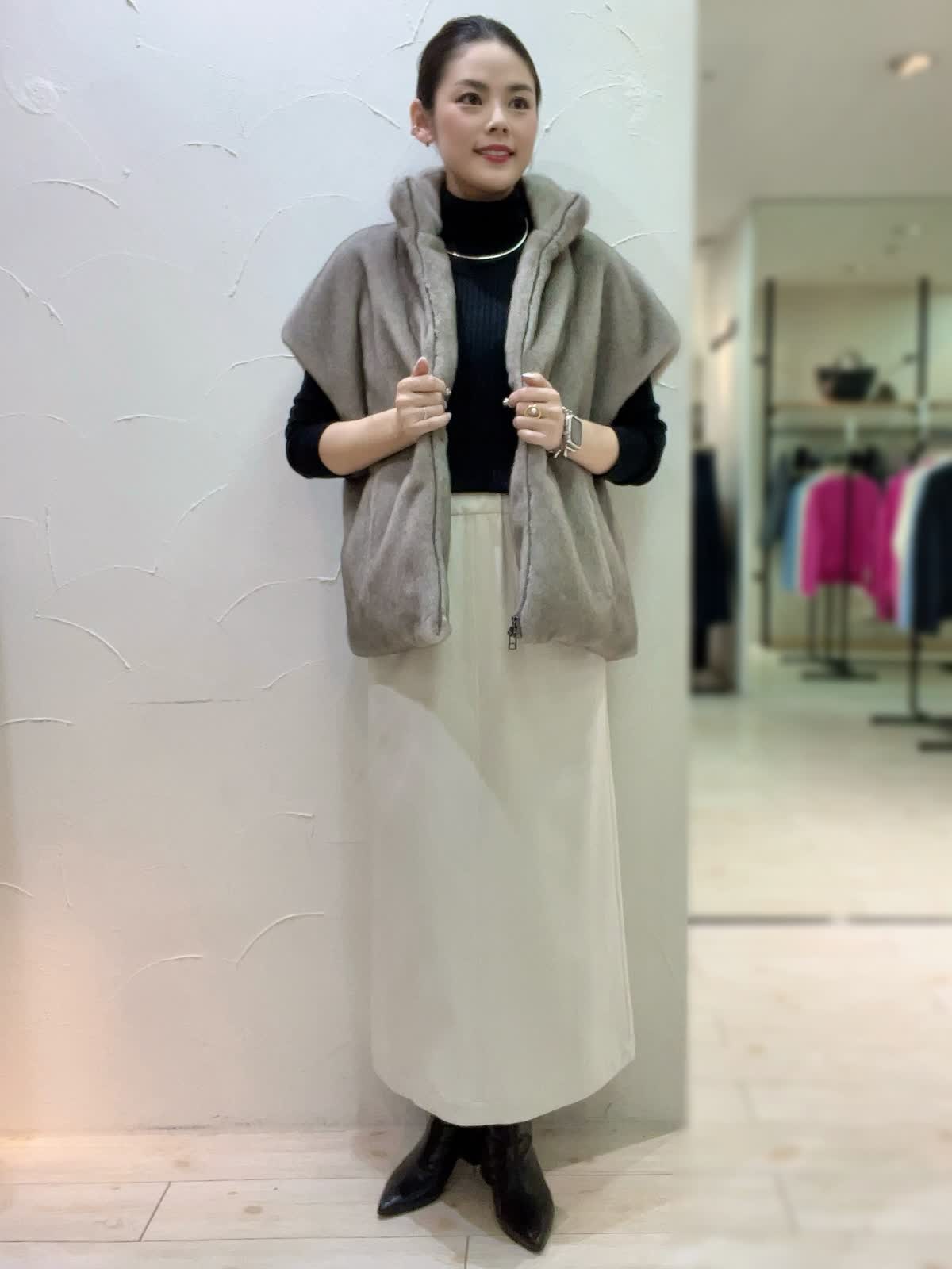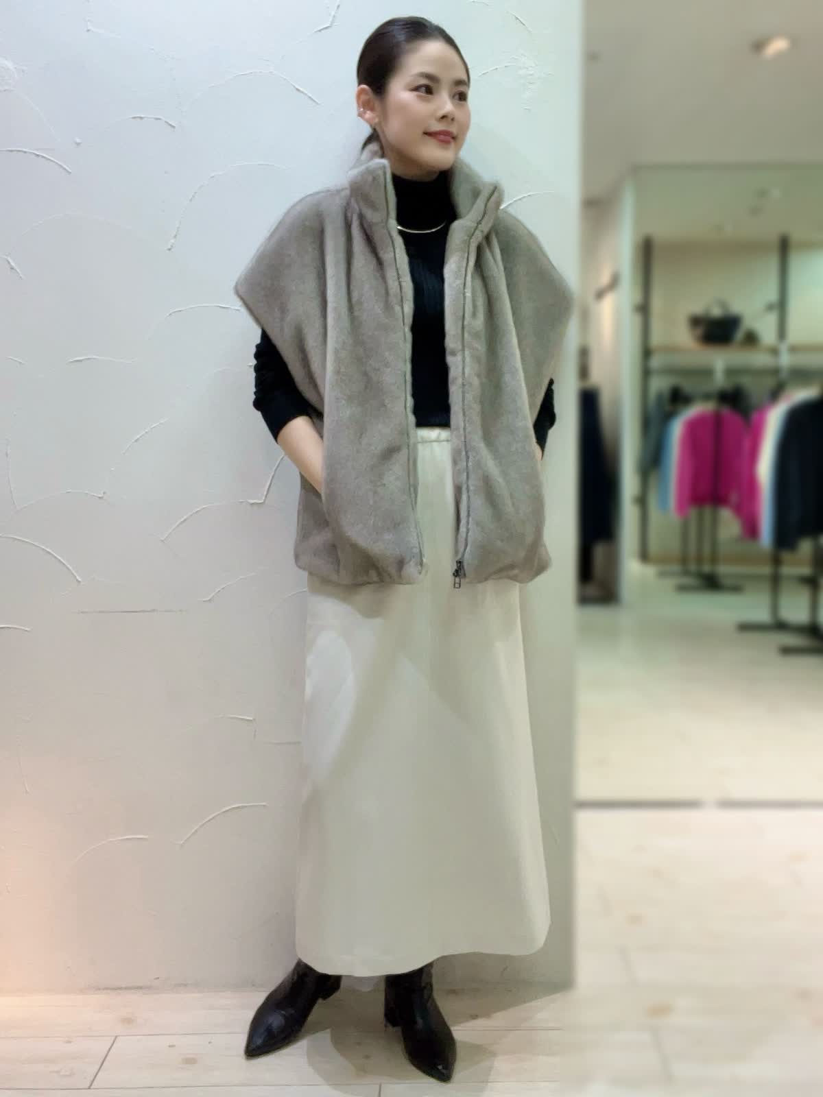 【着用サイズ】全て9号orフリーサイズ 【着用カラー】ブルゾン:グレー ニット:ブラック スカート:オフホワイト バッグ:シルバー 冬のお出かけコーディネート。エコファーのブルゾンを使ったレイヤードスタイル。ふんわりとしたファーが冬にあたたかみを感じさせるコーディネートです。スッキリとしたスカートで女性らしい印象に仕上げました。