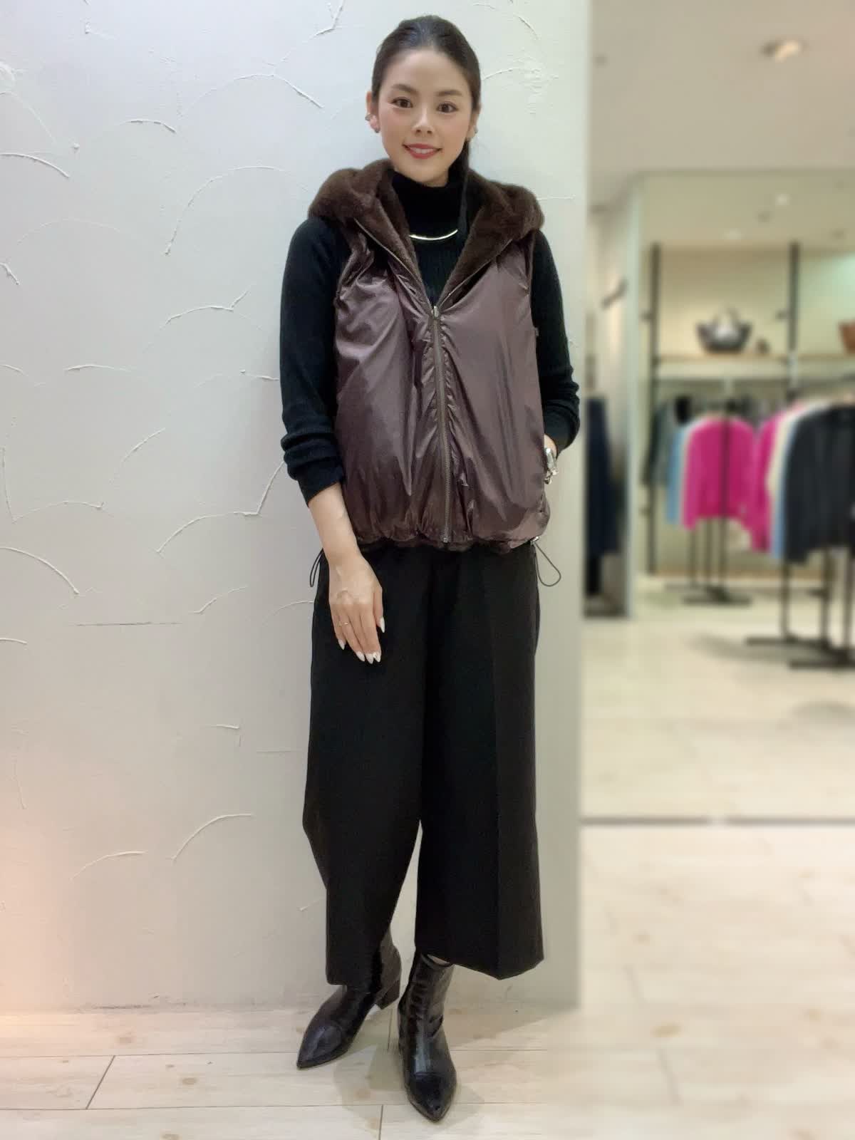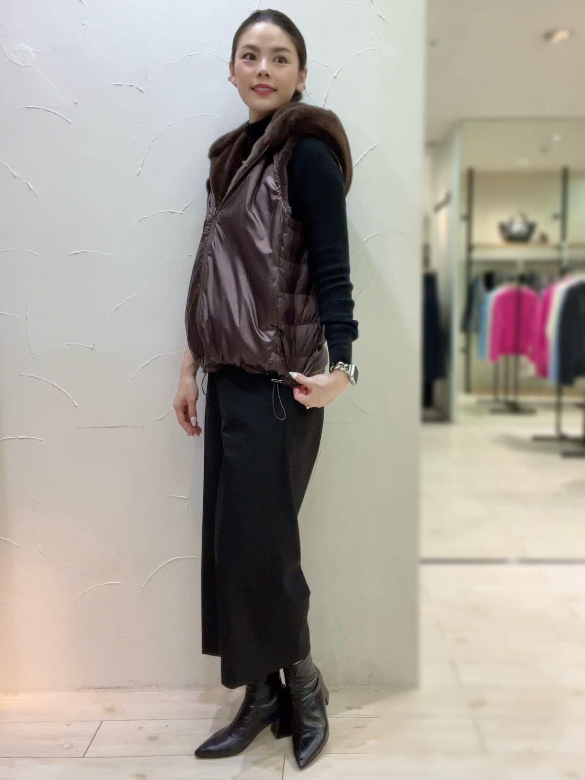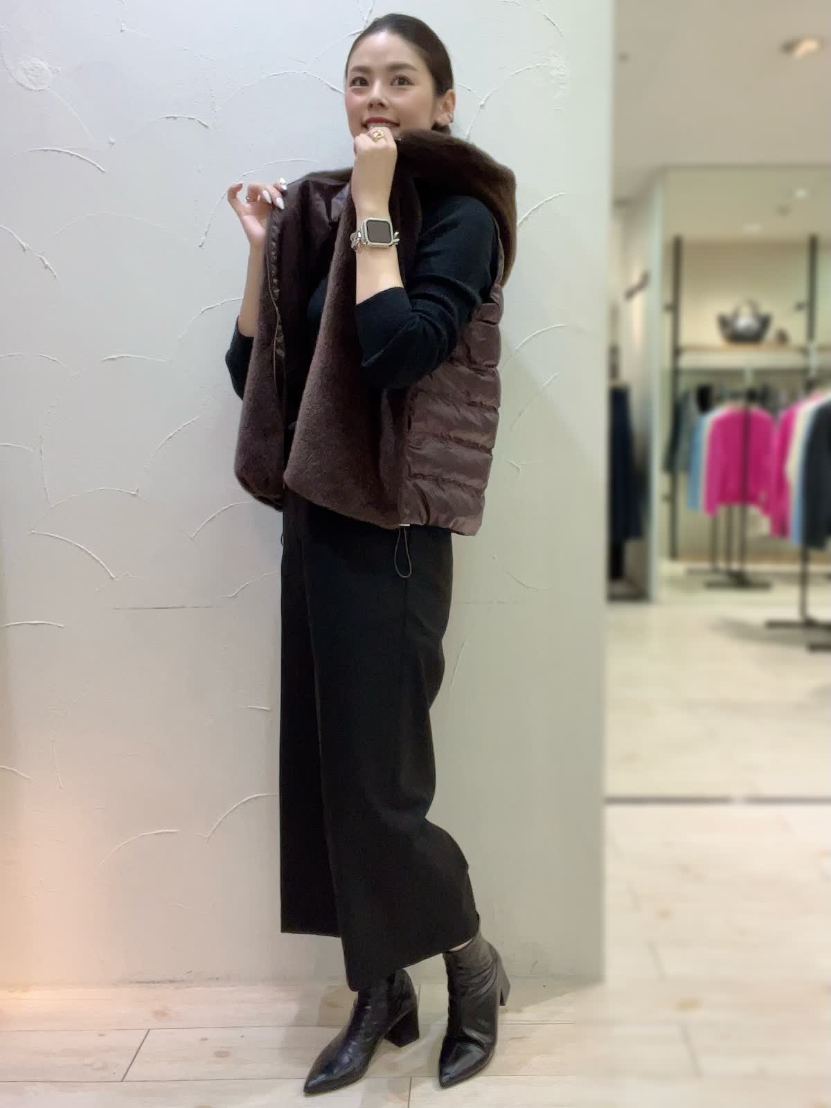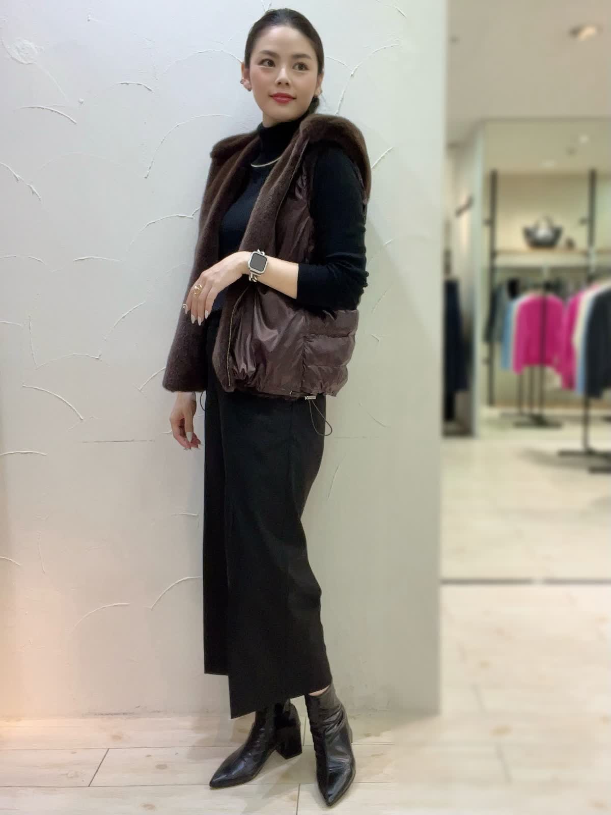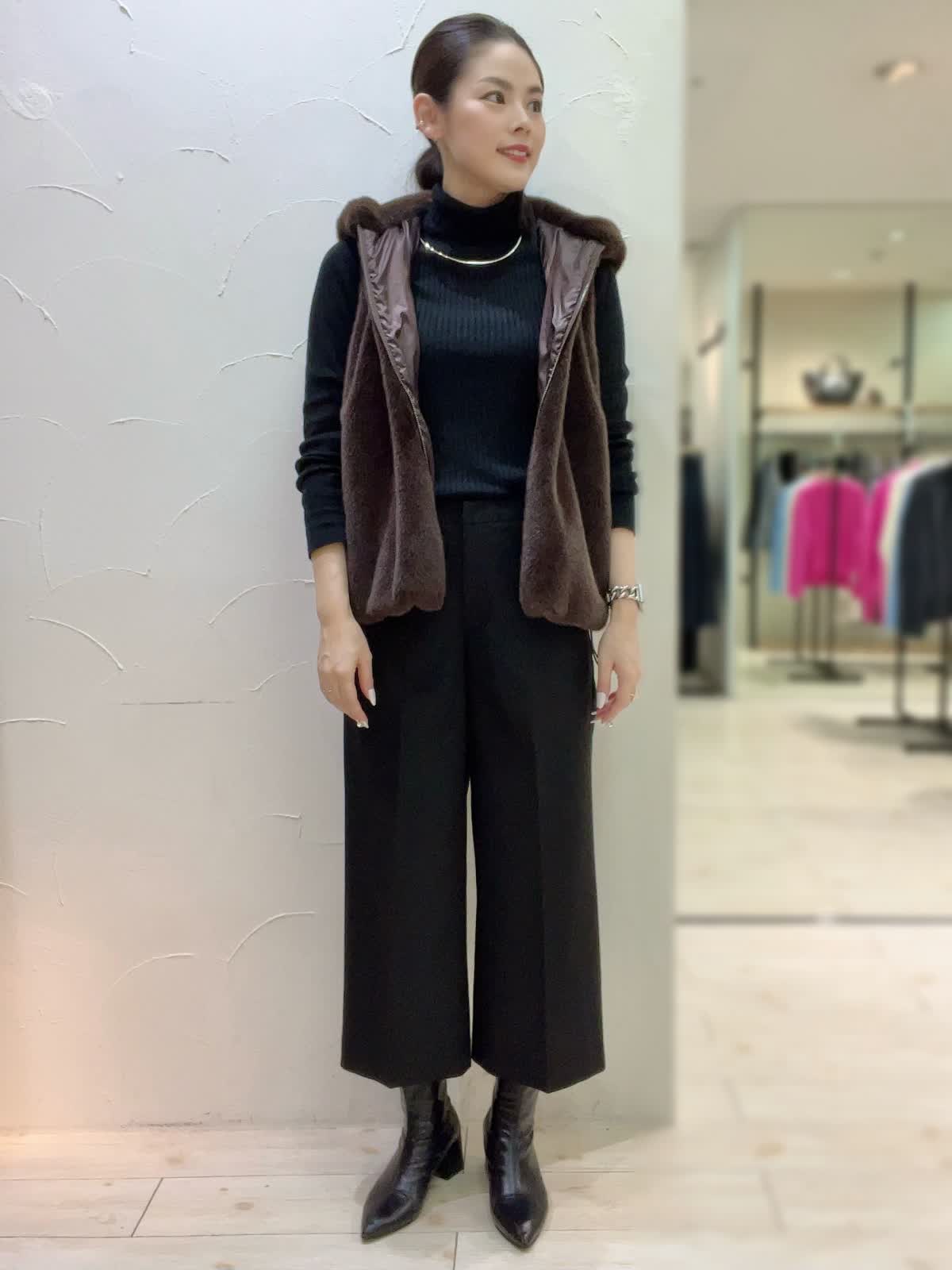 フェイクファージレを使ったレイヤードスタイリング。リバーシブルで着られる中綿のジレ。シンプルなスタイリングに羽織るだけでコーディネートのポイントになります。端境期の軽アウターとしてもおすすめ。ボトムはDAY by DAY I.T.'S. international定番のクロップドワイドパンツを合わせて大人な印象に