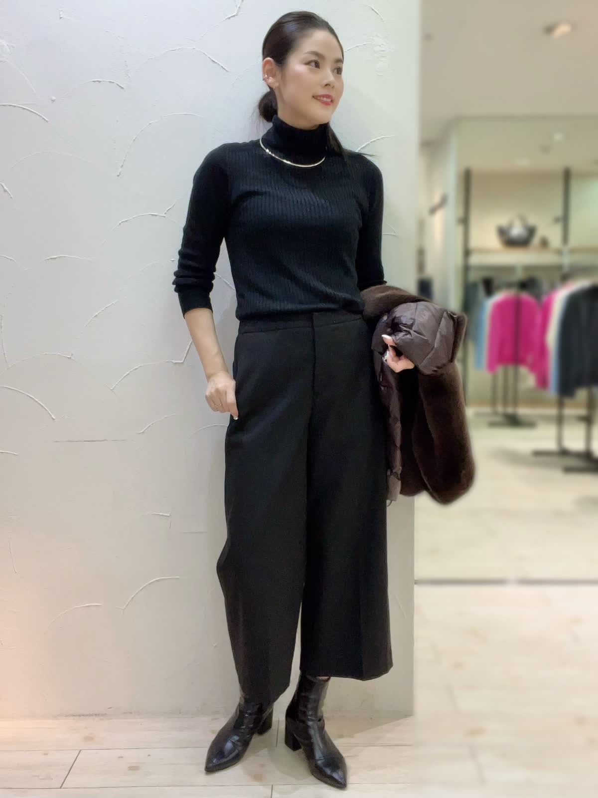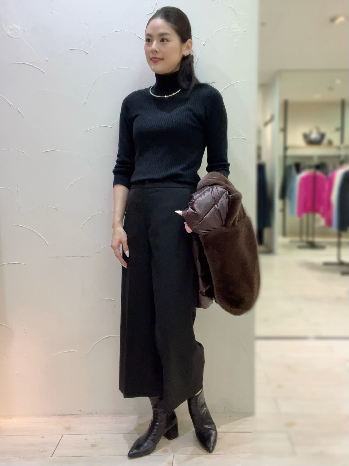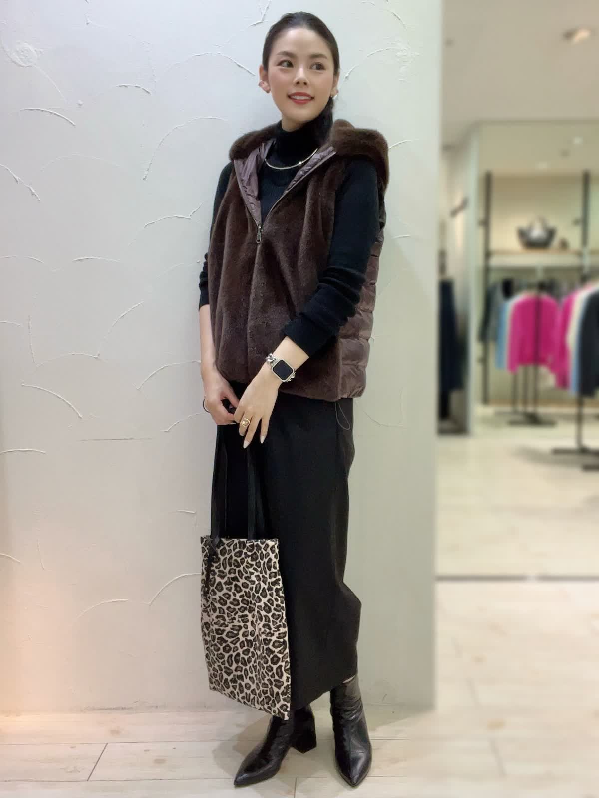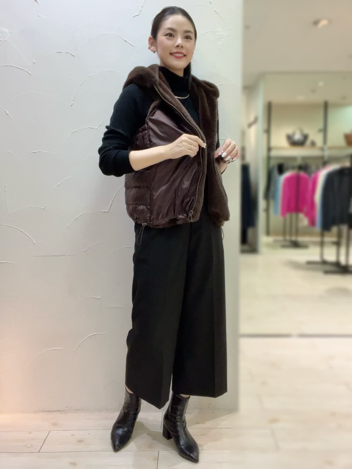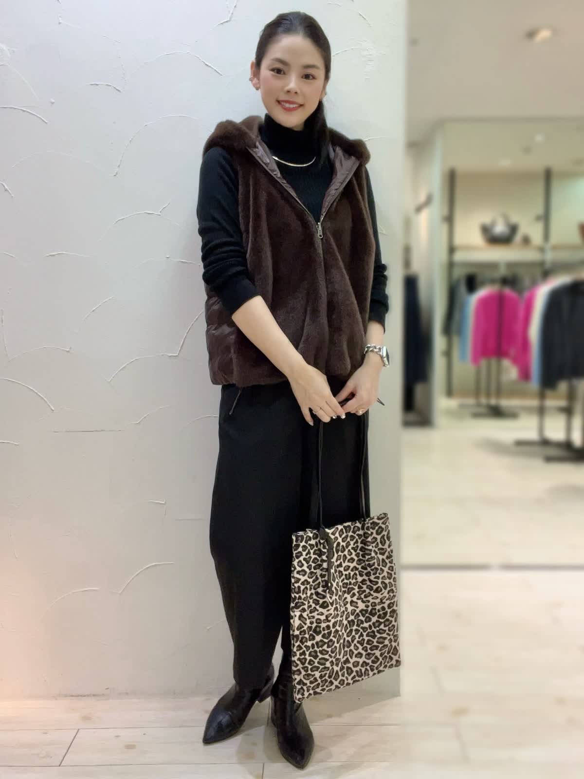 フェイクファージレを使ったレイヤードスタイリング。リバーシブルで着られる中綿のジレ。シンプルなスタイリングに羽織るだけでコーディネートのポイントになります。端境期の軽アウターとしてもおすすめ。ボトムはDAY by DAY I.T.'S. international定番のクロップドワイドパンツを合わせて大人な印象に