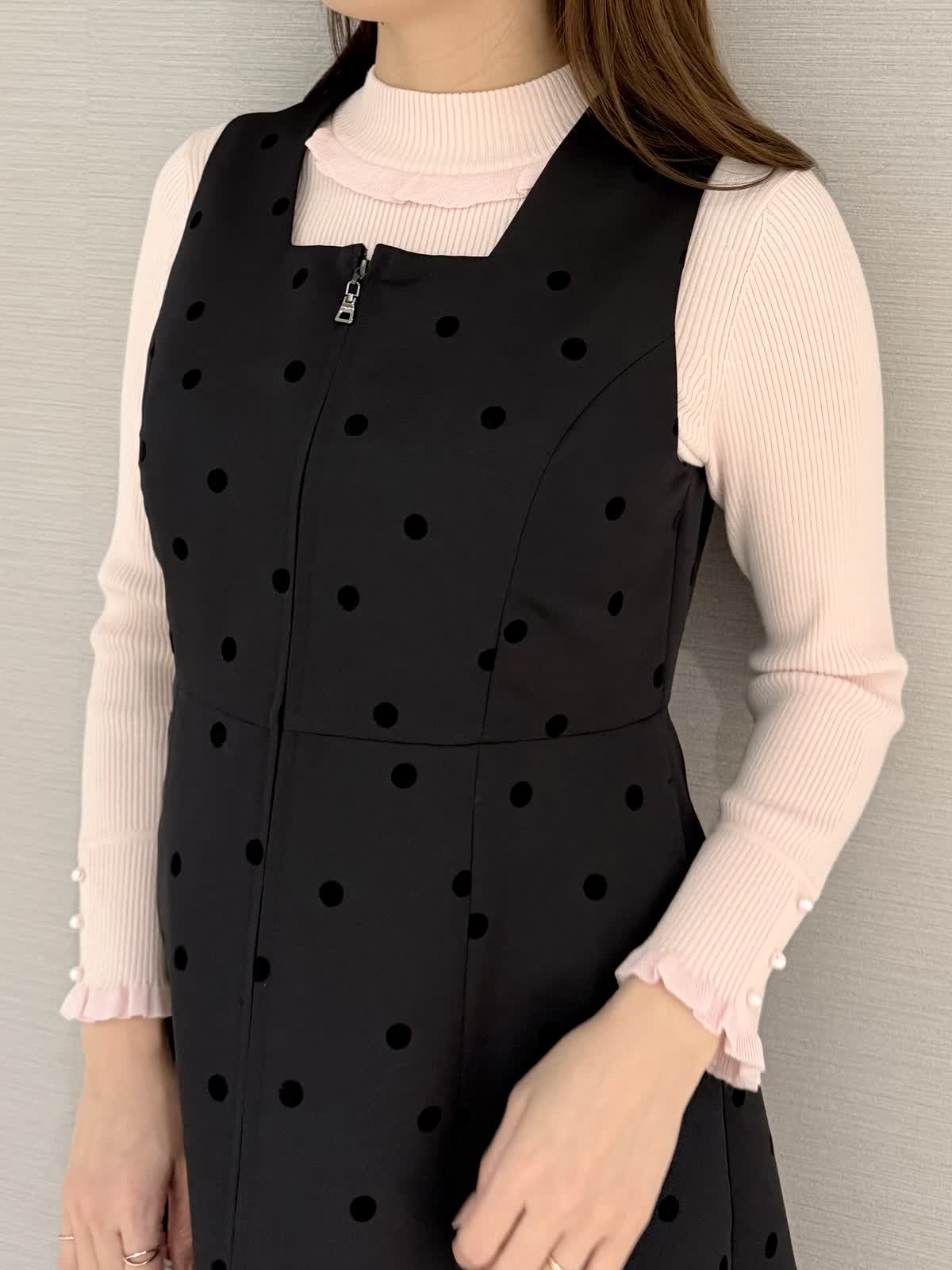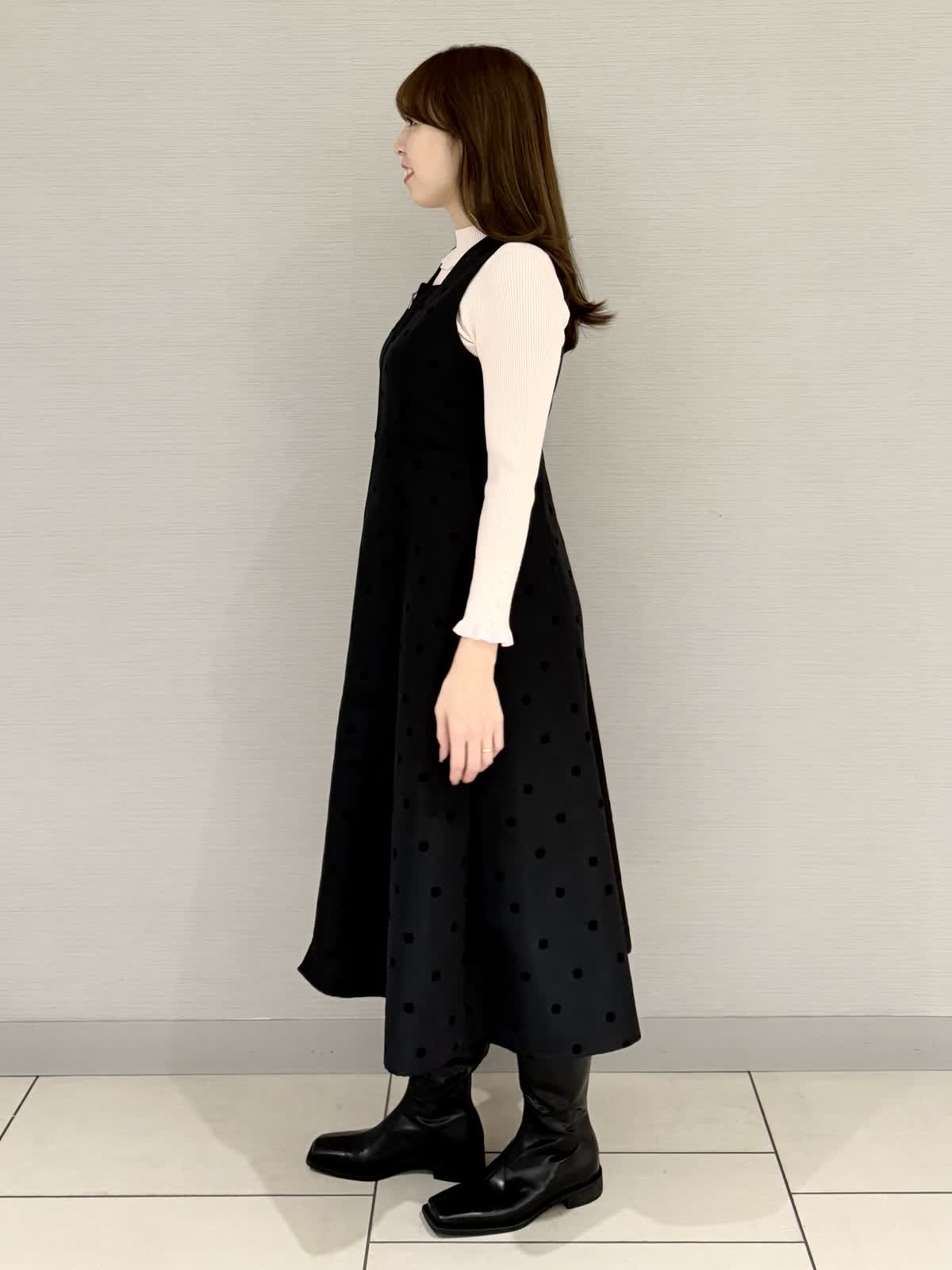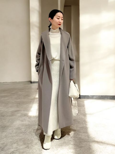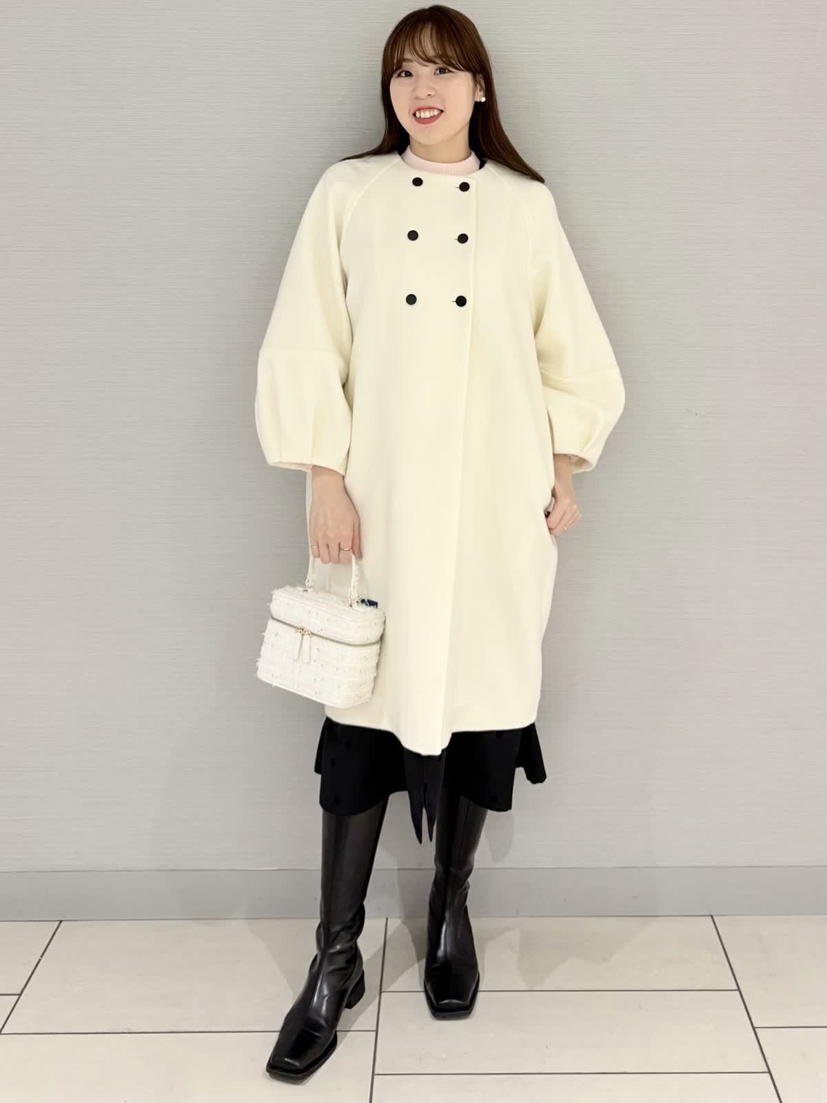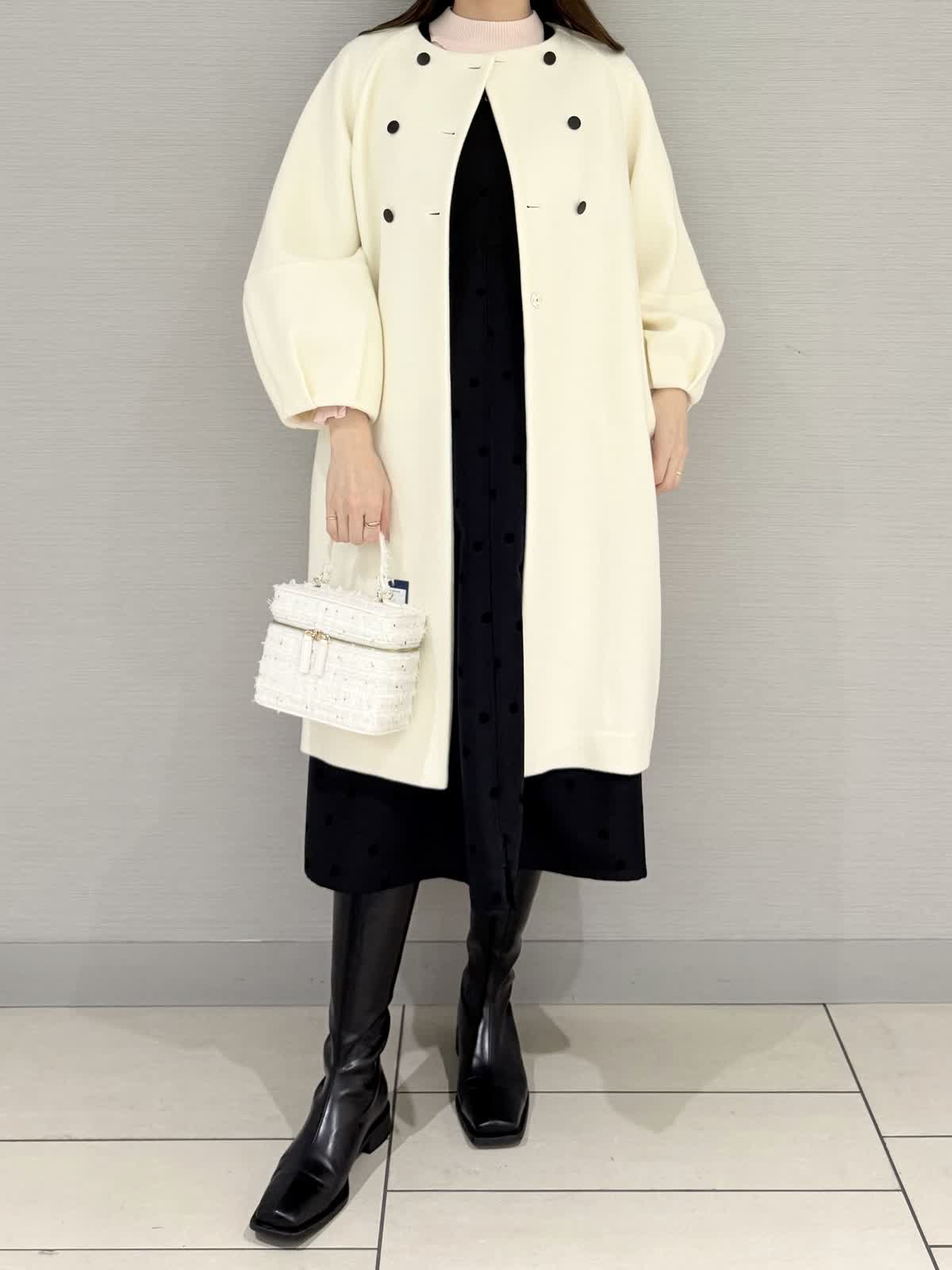 【着用サイズ/カラー】コート:9号/オフホワイトニット:9号/ピンクワンピース:9号/ブラック《ホリデーシーズンにぴったりなホワイトカラーのアウターを合わせたコーディネートです。コートは真っ白に近いお色味で、寒い冬に映える1着♪ボリューム袖と裾のコクーンシルエットがモード感をプラス。合わせているワンピースは、大人かわいくお召しいただけ、ニットやブラウスと合わせてコーディネートをお楽しみください。【サイズ感】どれもいつものサイズでちょうどよかったです。ワンピースは薄いニットを合わせても違和感なく着用できました。
