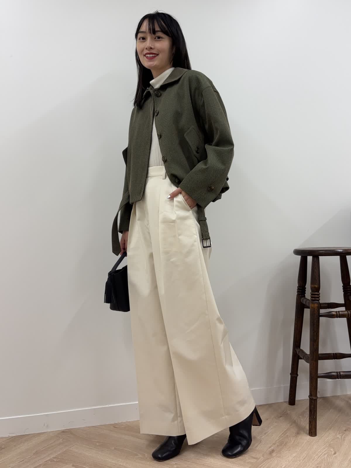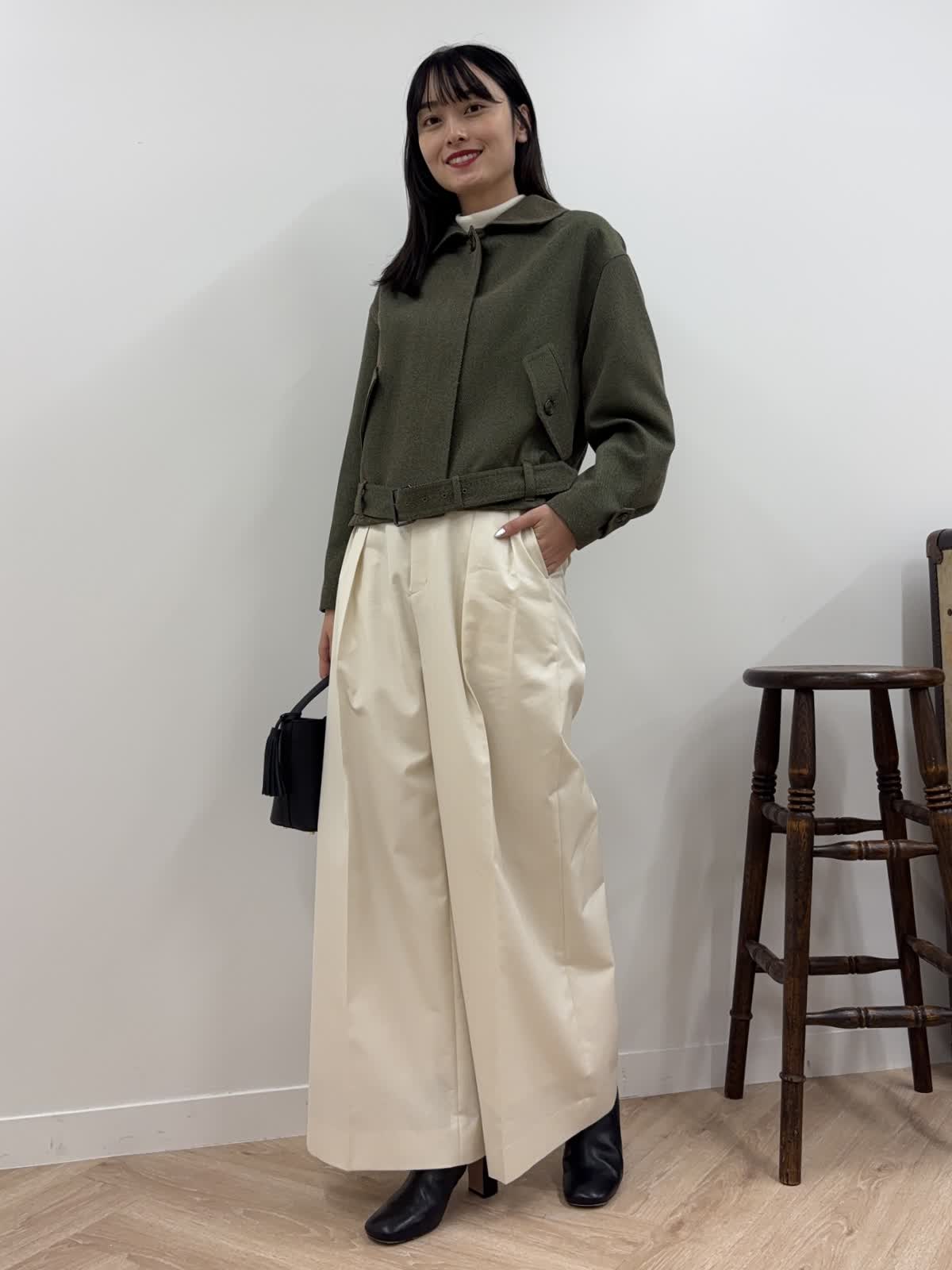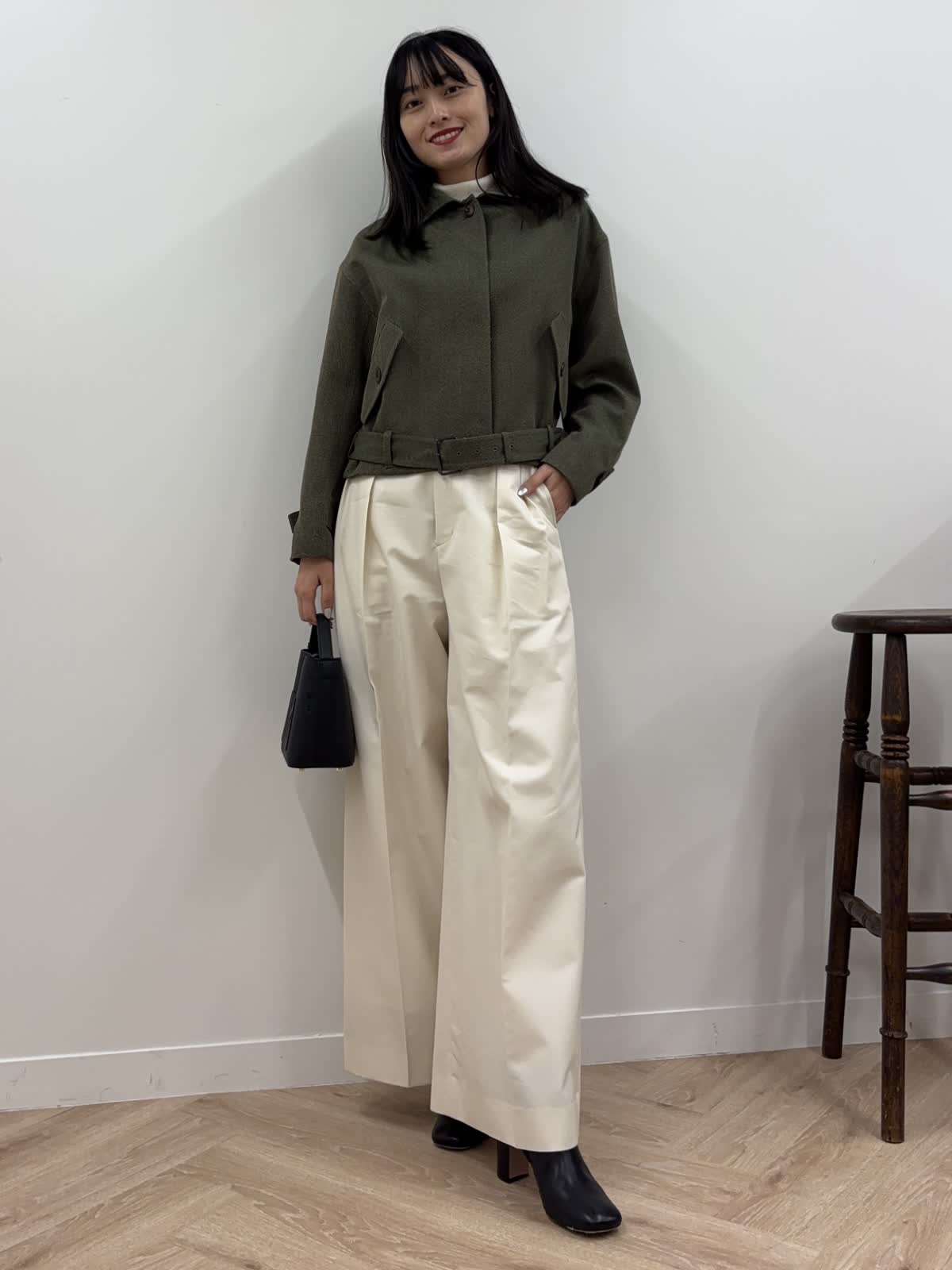 【着用カラー】ブルゾン:カーキ、ニット:オフホワイト、パンツ:オフホワイト、バッグ:ブラック 【着用サイズ】ブルゾン:9号、ニット:9号、パンツ:9号 コーディネートのテーマは秋のおでかけコーデです。エディターの三尋木さんコラボのブルゾンは、若干短めで、ワイドパンツやスカート合わせも決まるアイテム。太めの袖やショルダーの丸みが今年らしく、羽織るだけで今年の秋冬はばっちり。前のボタンを開けても、閉じてウエストのベルトをしめても、違ったシルエットが楽しめるアイテムです。中はカットソーやニット、ワンピースなど様々なアイテムを組み合わせることができます。今回はタートルネックのニットにしてみました。ちなみにカーキはweb・POP UP・一部店舗の限定カラー。パンツは9月発売の三尋木さんコラボのワイドチノ。結構ワイドなので、足さばきもよく楽ちん。ニットの白と合わせて、統一感のあるコーデを意識しました。ブーツとバッグは黒でかっこよくしめて、秋の少しハンサムなお出かけコーデを組んでみました。
