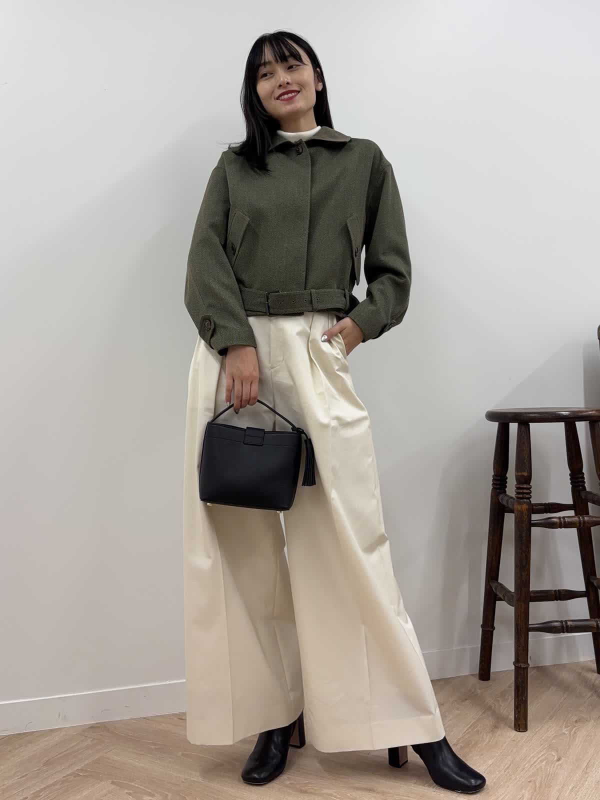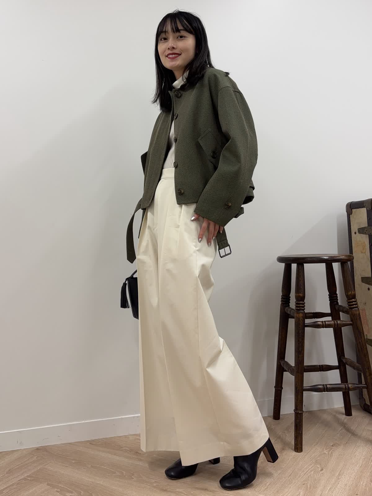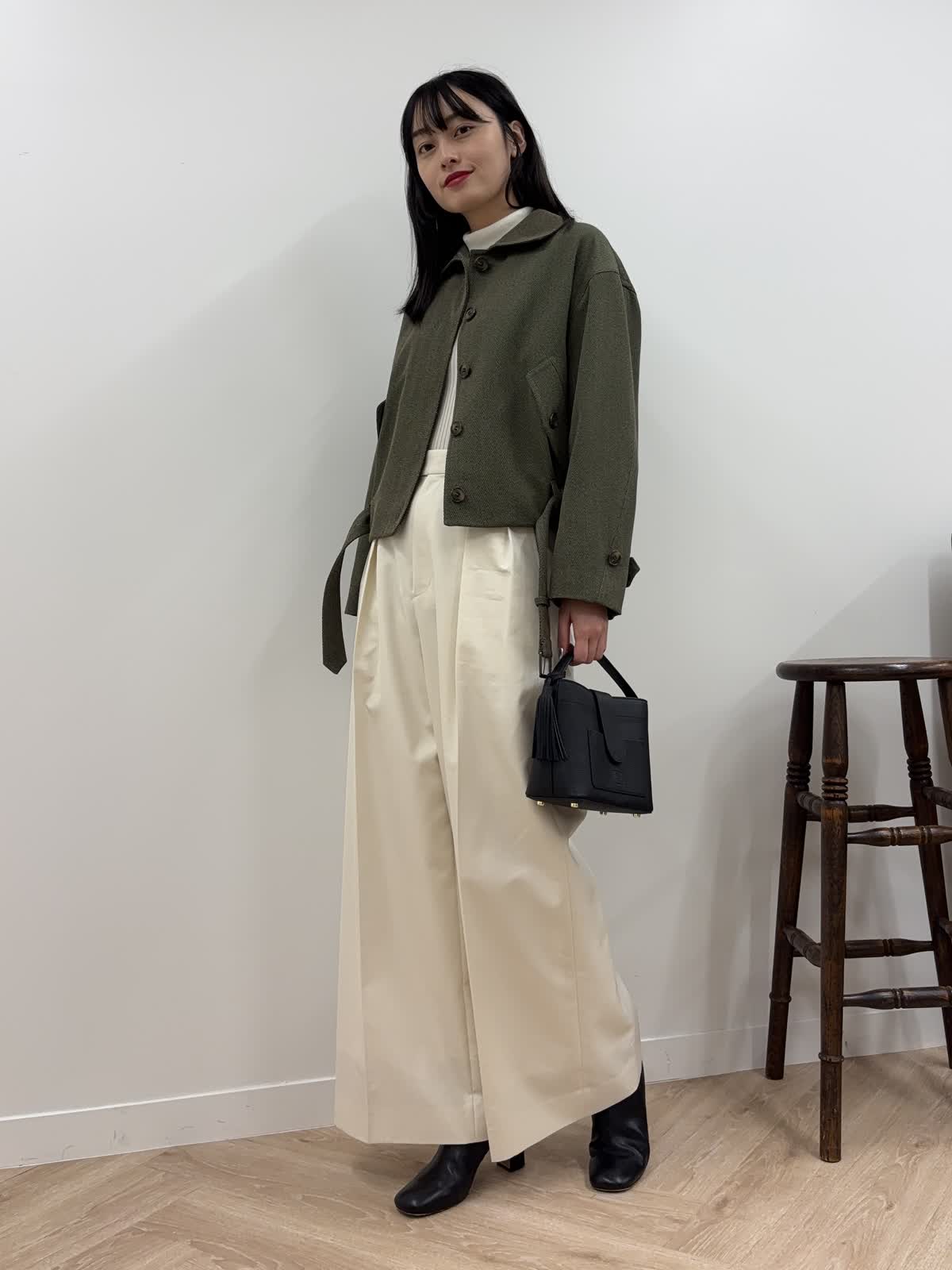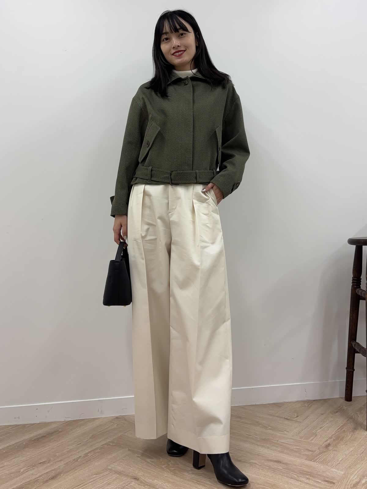【着用カラー】ブルゾン:カーキ、ニット:オフホワイト、パンツ:オフホワイト、バッグ:ブラック 【着用サイズ】ブルゾン:9号、ニット:9号、パンツ:9号 コーディネートのテーマは秋のおでかけコーデです。エディターの三尋木さんコラボのブルゾンは、若干短めで、ワイドパンツやスカート合わせも決まるアイテム。太めの袖やショルダーの丸みが今年らしく、羽織るだけで今年の秋冬はばっちり。前のボタンを開けても、閉じてウエストのベルトをしめても、違ったシルエットが楽しめるアイテムです。中はカットソーやニット、ワンピースなど様々なアイテムを組み合わせることができます。今回はタートルネックのニットにしてみました。ちなみにカーキはweb・POP UP・一部店舗の限定カラー。パンツは9月発売の三尋木さんコラボのワイドチノ。結構ワイドなので、足さばきもよく楽ちん。ニットの白と合わせて、統一感のあるコーデを意識しました。ブーツとバッグは黒でかっこよくしめて、秋の少しハンサムなお出かけコーデを組んでみました。