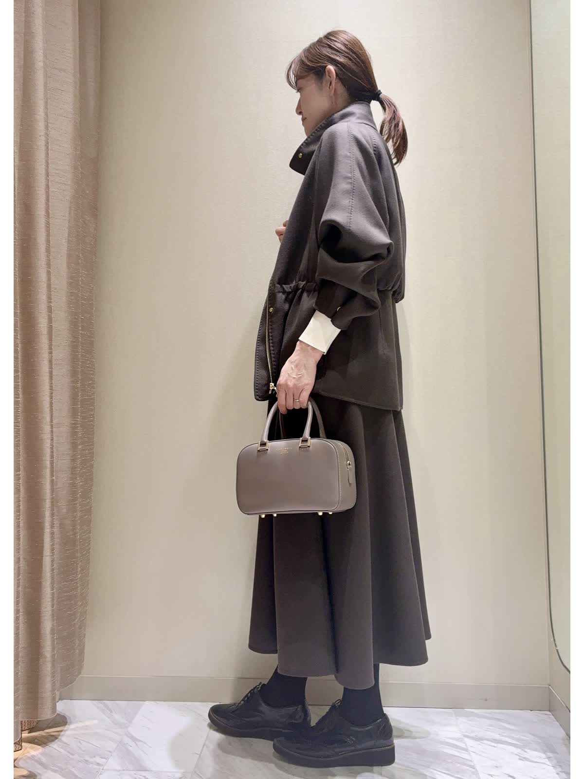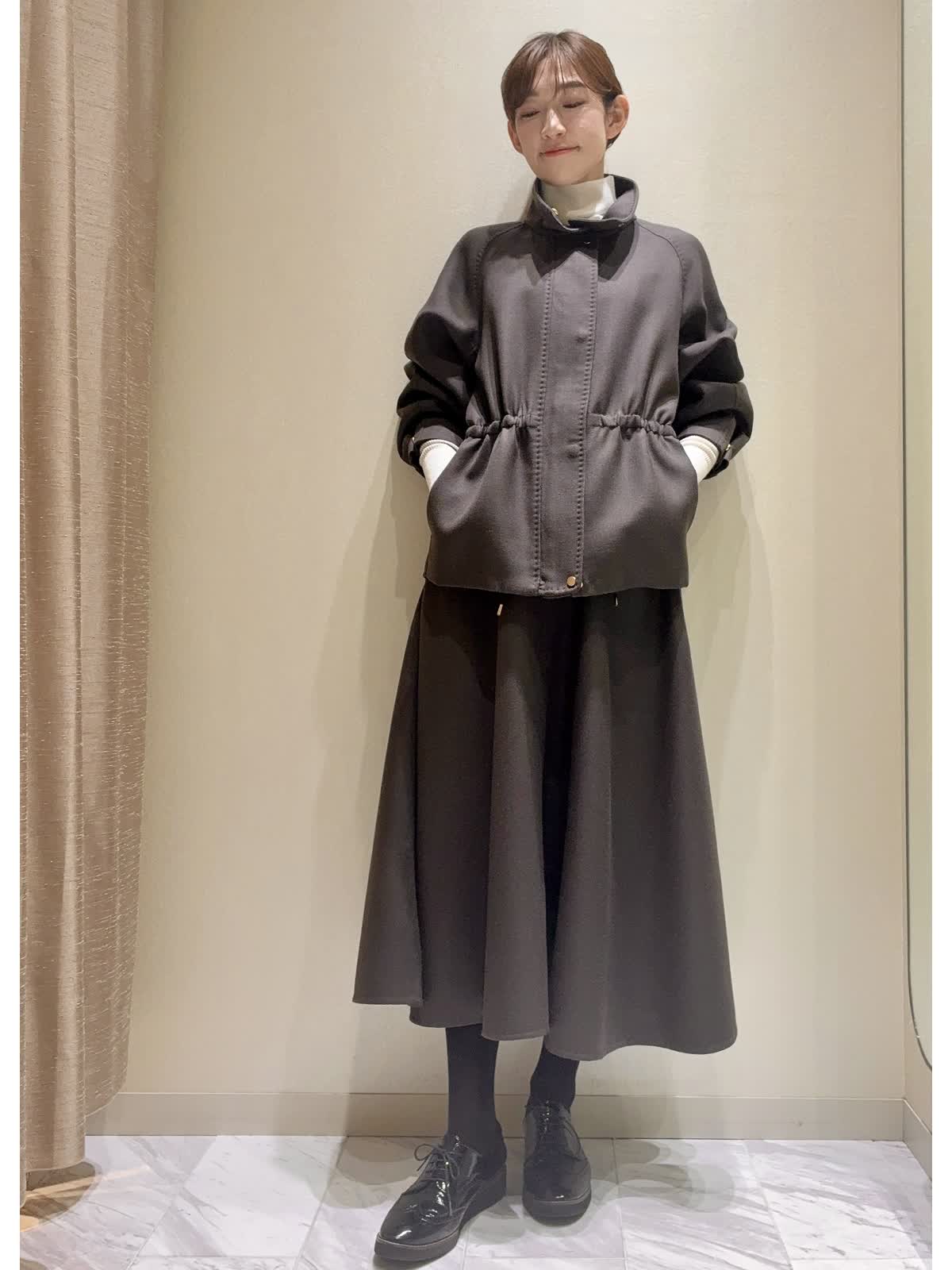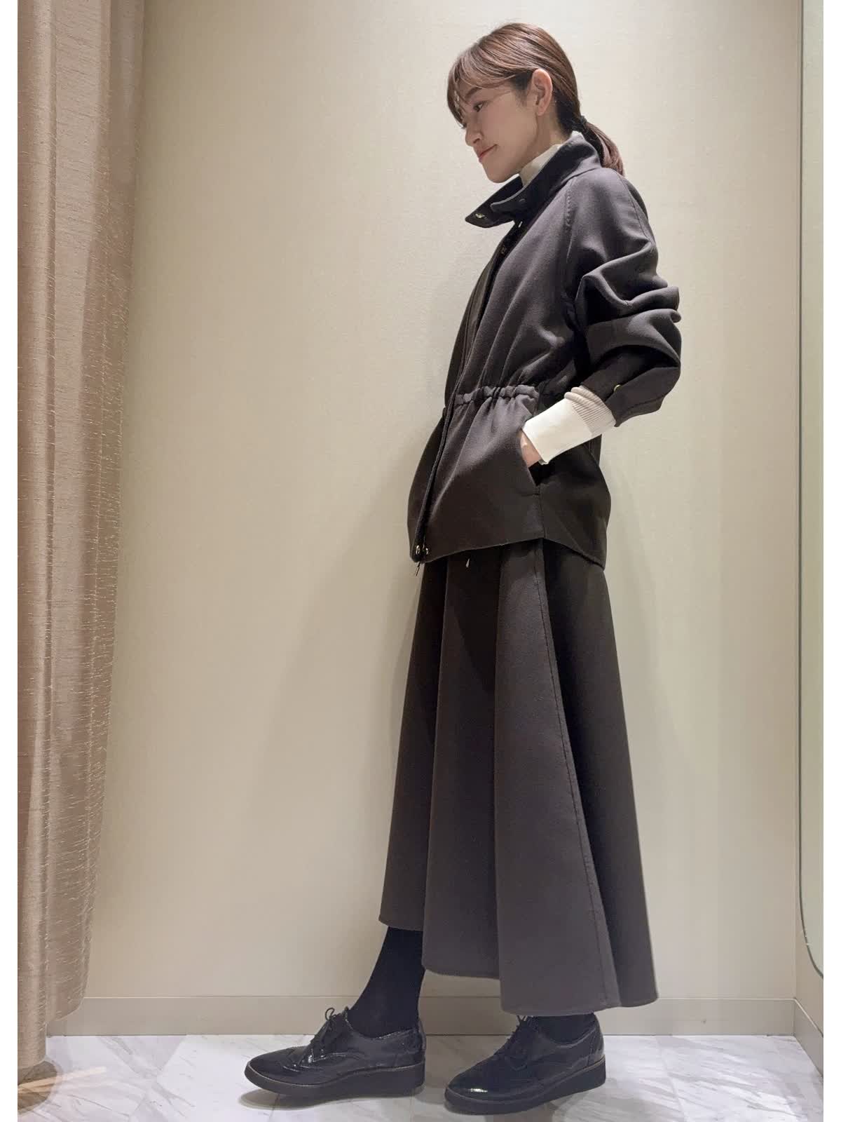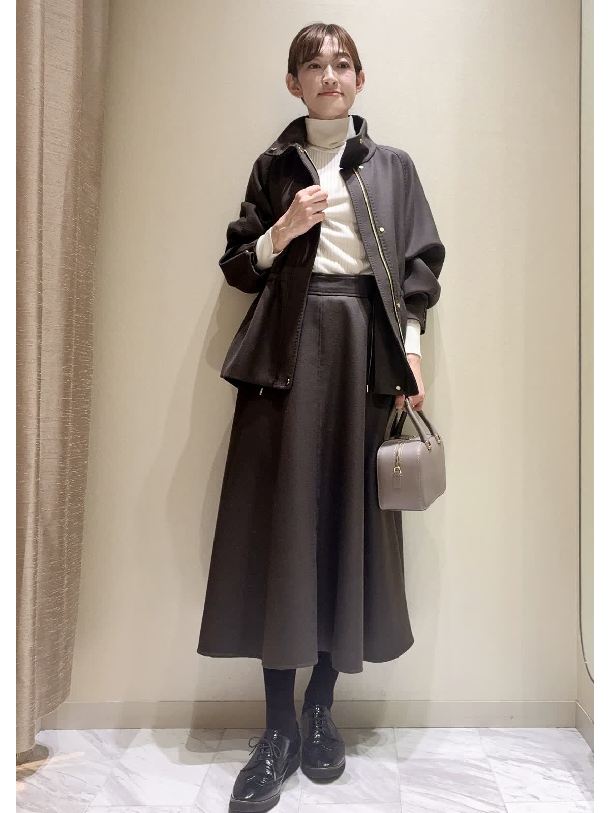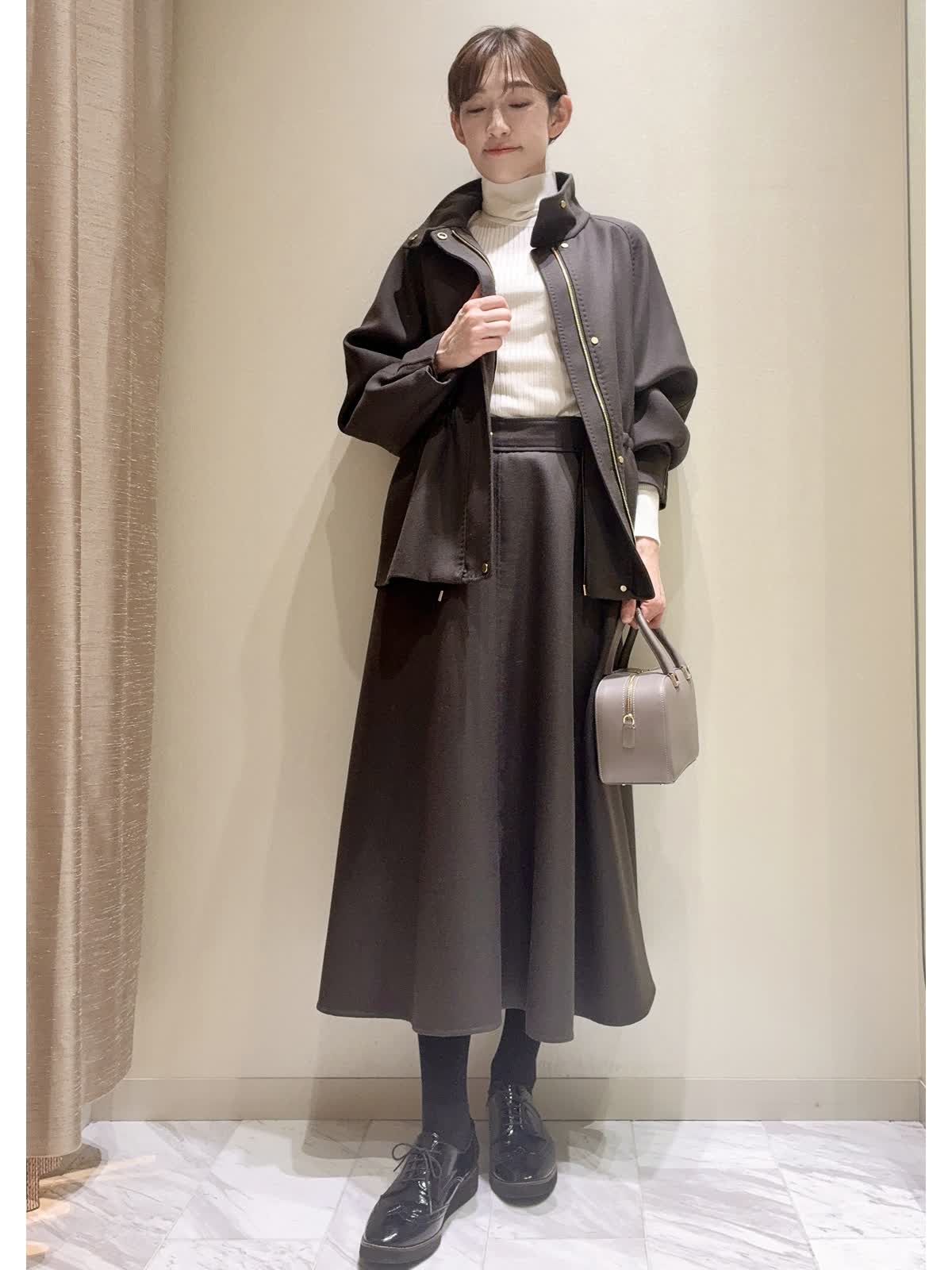 【着用サイズ】全て:9号 【着用カラー】ブルゾン/スカート:ダークブラウン ニット:オフホワイト バッグ:グレーベージュ きれいめカジュアル、セットアップスタイルです。 ブルゾンは、ウールコートより少し薄手で、肌寒くなってきたこの時期の羽織りにおすすめです。内側からウエストが絞れて、ボトムに合わせてボリュームの調整ができます。 袖口もお好みでスナップボタンで絞り、すっきりブラウンジングもできます。アームがゆったりで、厚手のニットも着込めます。 同素材のサーキュラースカートや、インナーにホワイトカラー合わせた、カジュアルすぎないブルゾンスタイルです。 深みのある、すてきなダークブラウンカラーです。