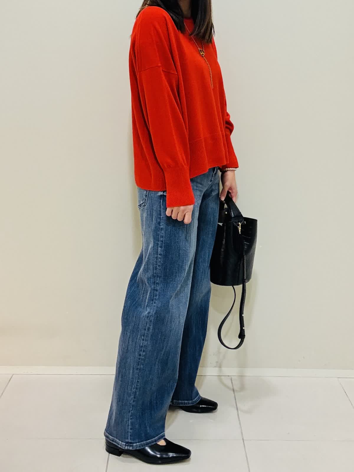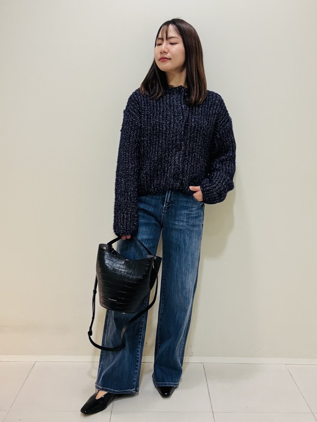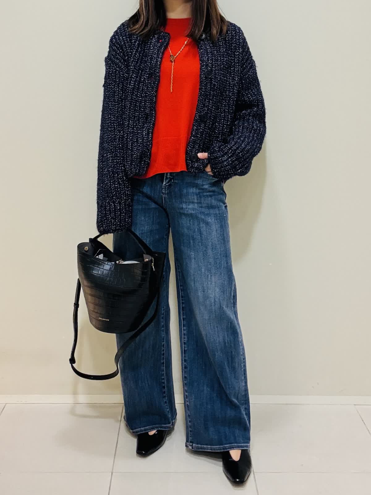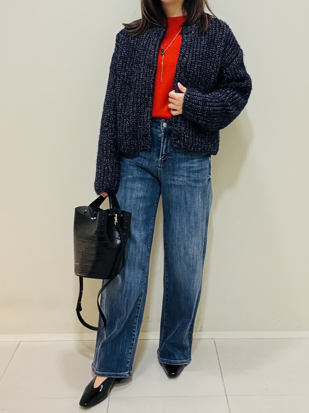 【着用サイズ】カーディガン:ネイビー:9号サイズ ニット:シュイロ:9号サイズ デニムパンツ:インディゴ:9号サイズ 『お出かけラフスタイリング』 デニムに綺麗な朱色のニットでラメのカーディガンが映えるコーデです。 ニットは薄手で丸首なので着やすいです。重ね着もおすすめです。 デニムは広がり過ぎないスッキリとしたシルエットです。 カーディガンはざっくりと編まれており、ツイードのような高級感もあります。ネイビーだけど、華やかな印象になります。