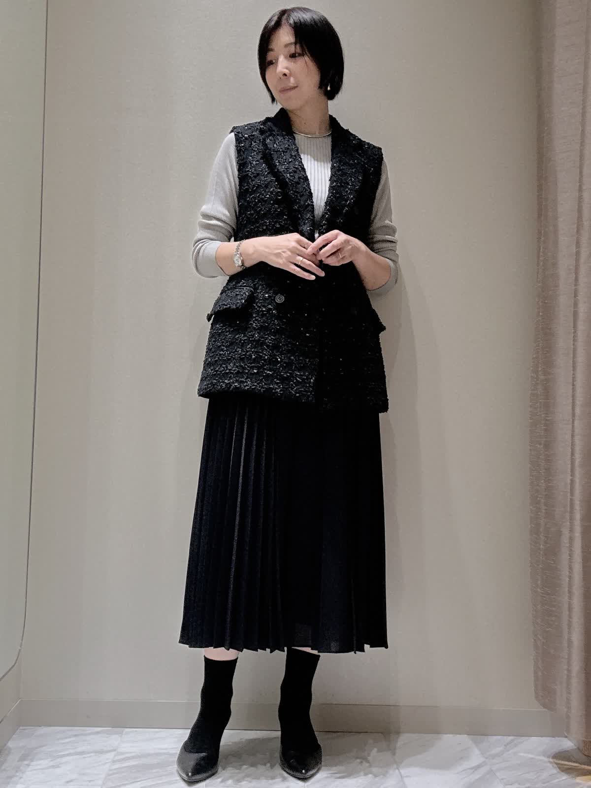 着用サイズ】全て:9号 【着用カラー】ジレ:ネイビー ニット:ミディアムグレー スカート: ネイビー ツィード生地で広めのラペル、セミダブルに配したモードな印象の一枚。ほど良くシェイプさせたウエストラインで女性らしく見えます。Tシャツやニット、ブラウスを合わせてカジュアルダウンしたコーディネートもおすすめ。 デイリーからオフィスシーンまで幅広く活躍してくれる上質なアイテムです。