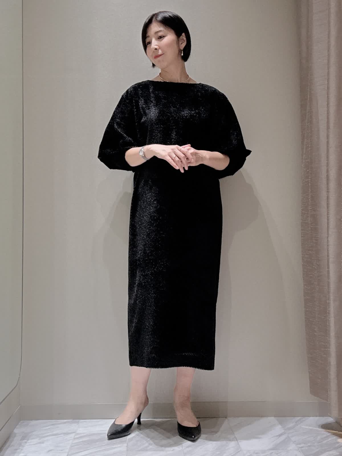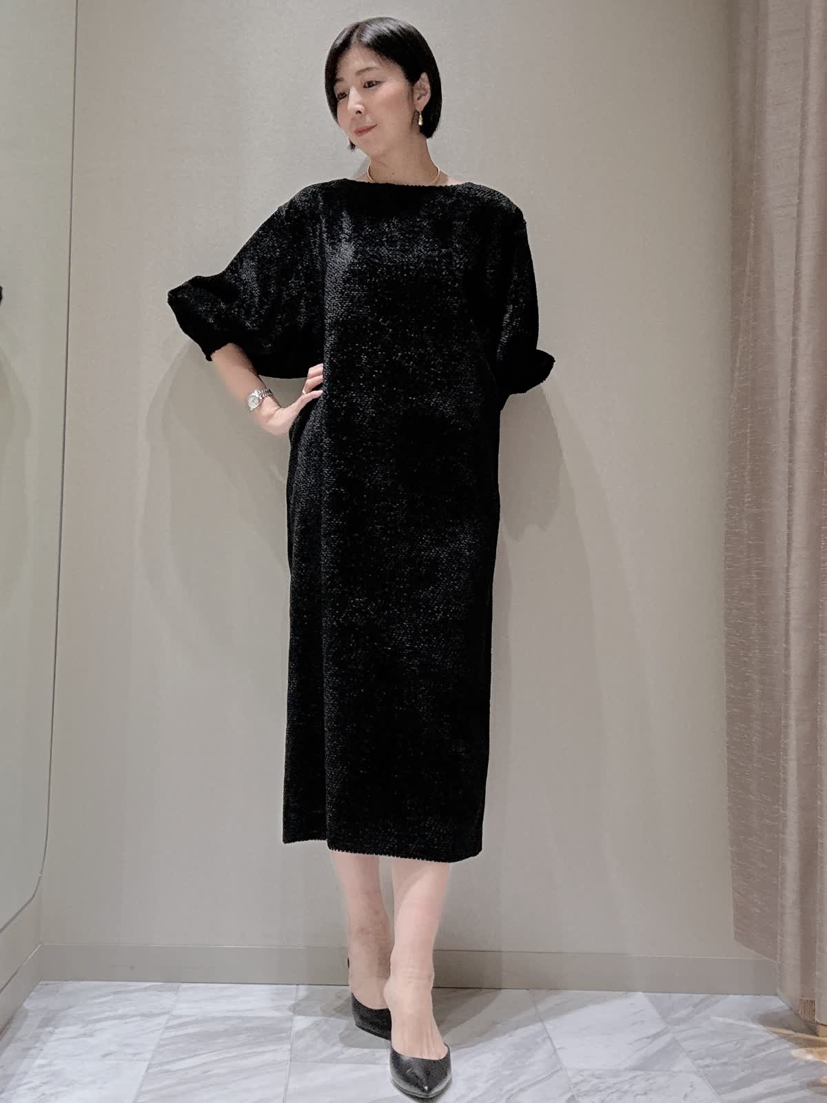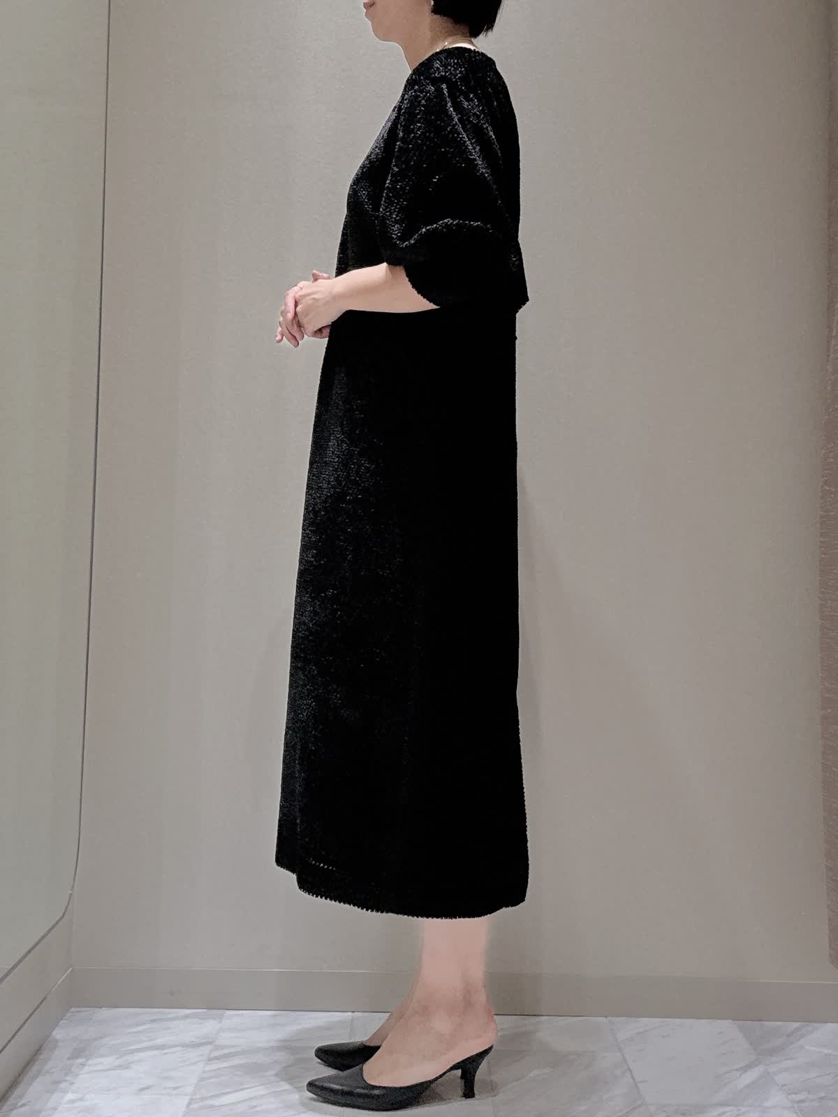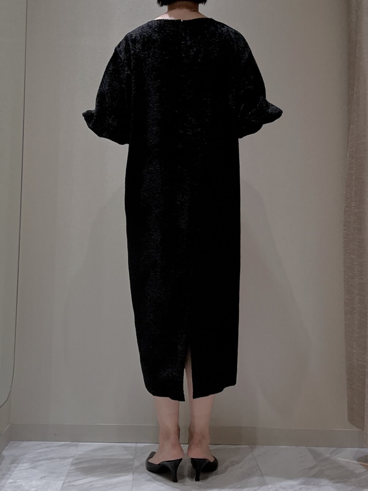 【着用サイズ】全て:9号 【着用カラー】ワンピース: ブラック ワンピースは裾に向かってすとんと落ち、身体のラインを拾わないゆったりとしたシルエット。ドロップショルダー、やや横広いネックラインでリラックスムード漂う女性らしいバランスに。袖口のタックデザインがクラシカルな印象です。