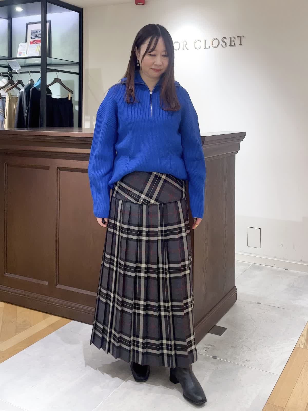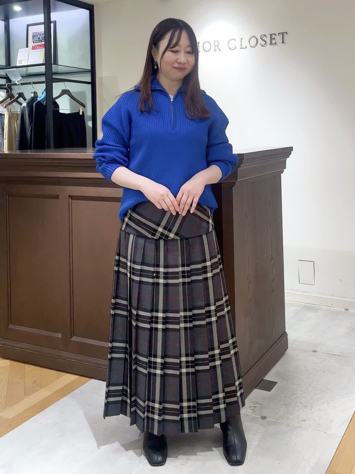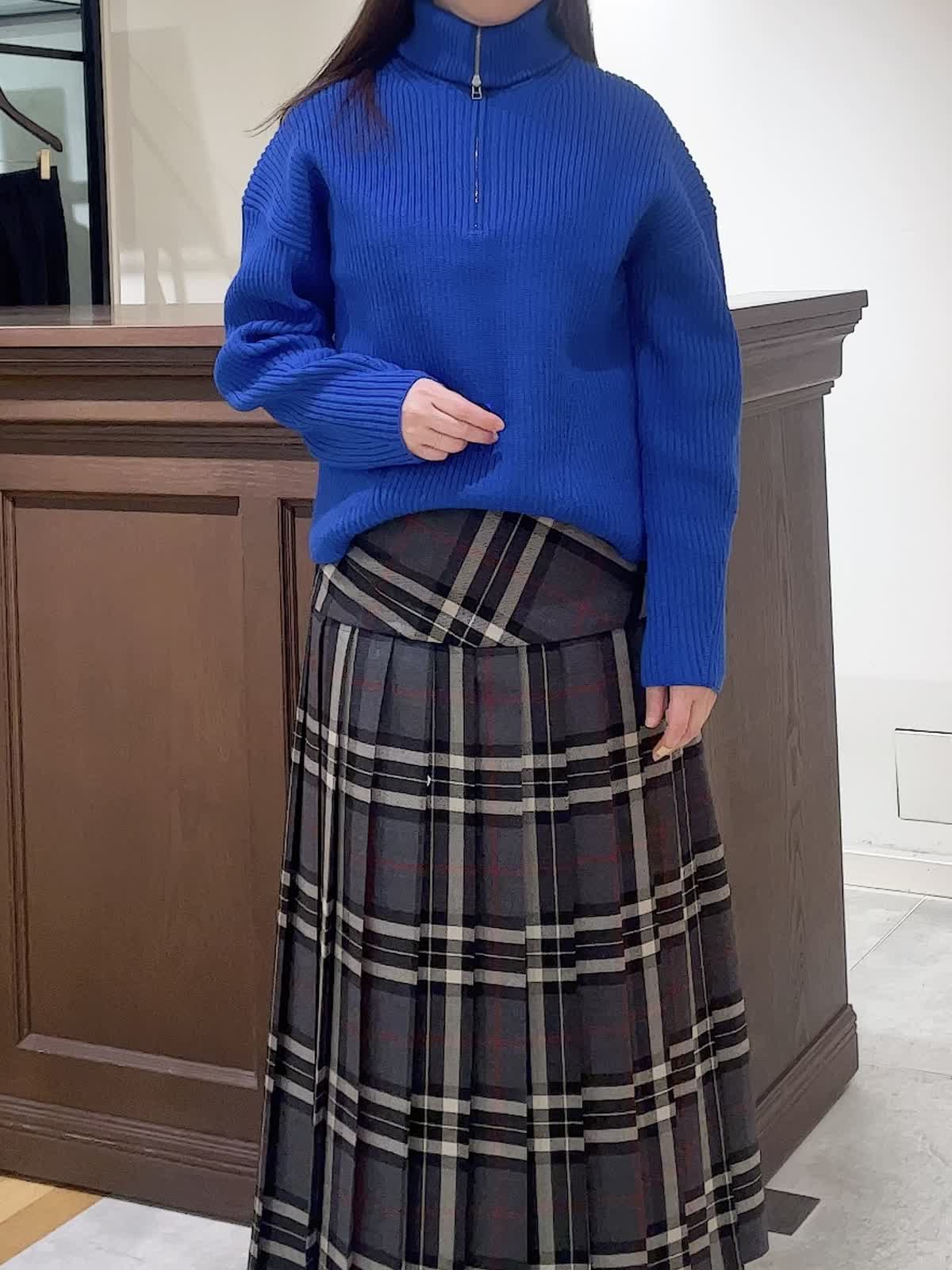 【着用サイズ】全て9号【着用カラー】ニット:ブルー スカート:グレー ハーフジップのプルオーバーは冬の着こなしの主役になるニット。オーバーサイズなのでインナーを入れたり、一枚着でジップの位置を調整したりとお好みでアレンジを楽しめます。合わせたオニールのスカートはヨーク切り替えで腰回りをスッキリ見せてくれます。インでもアウトでもバランスのいい着こなしが実現します。カラーニットが映えるスタイリングにしました。
