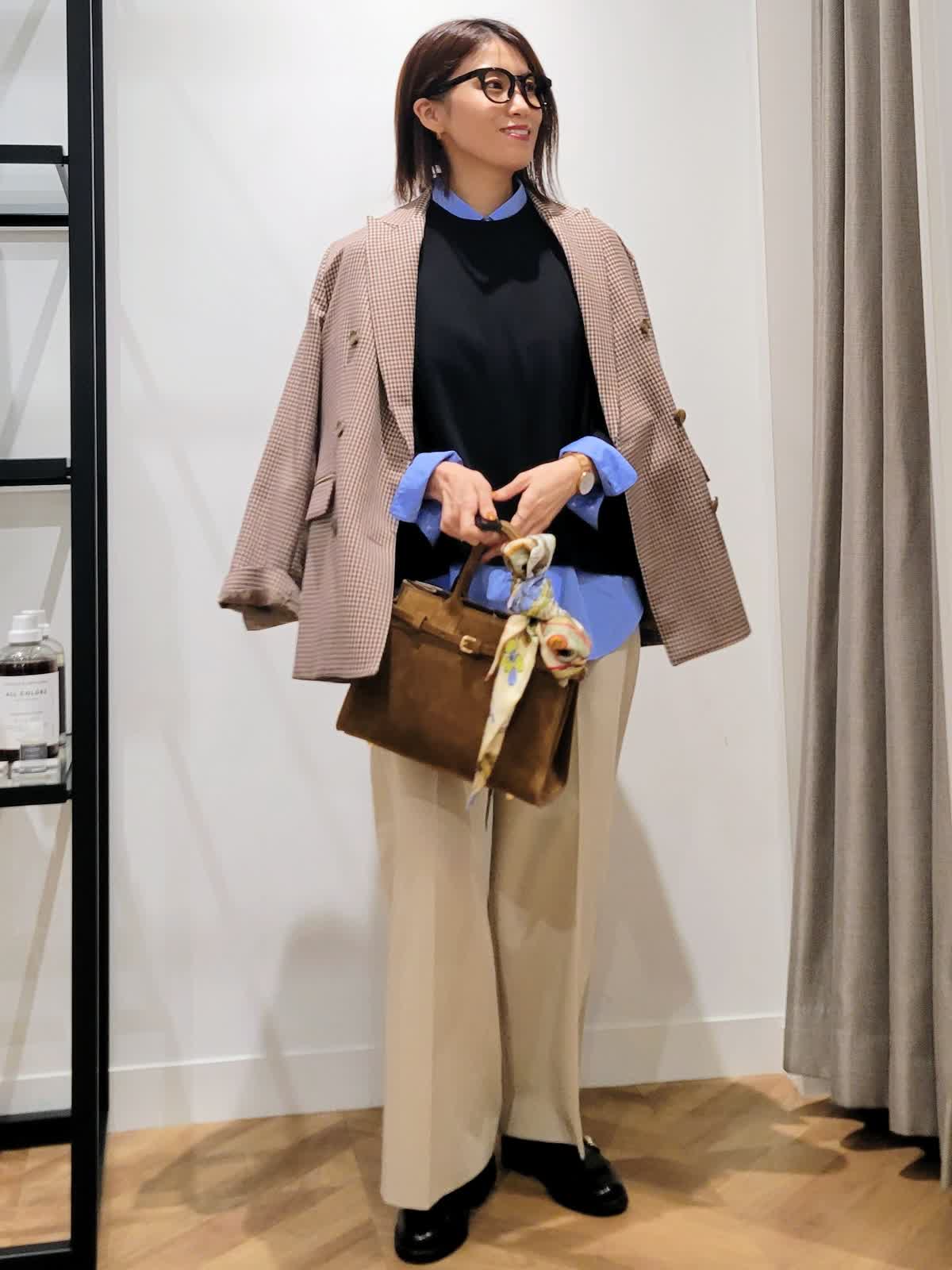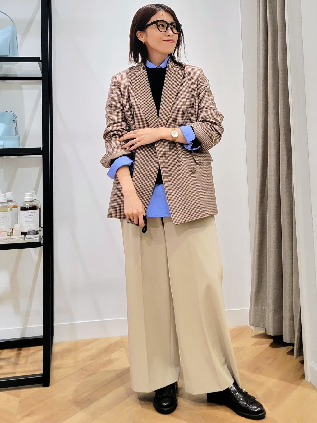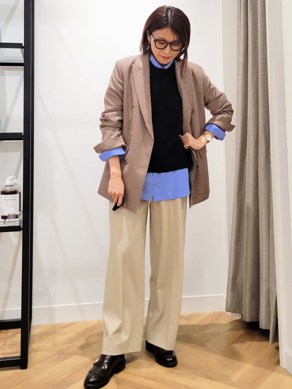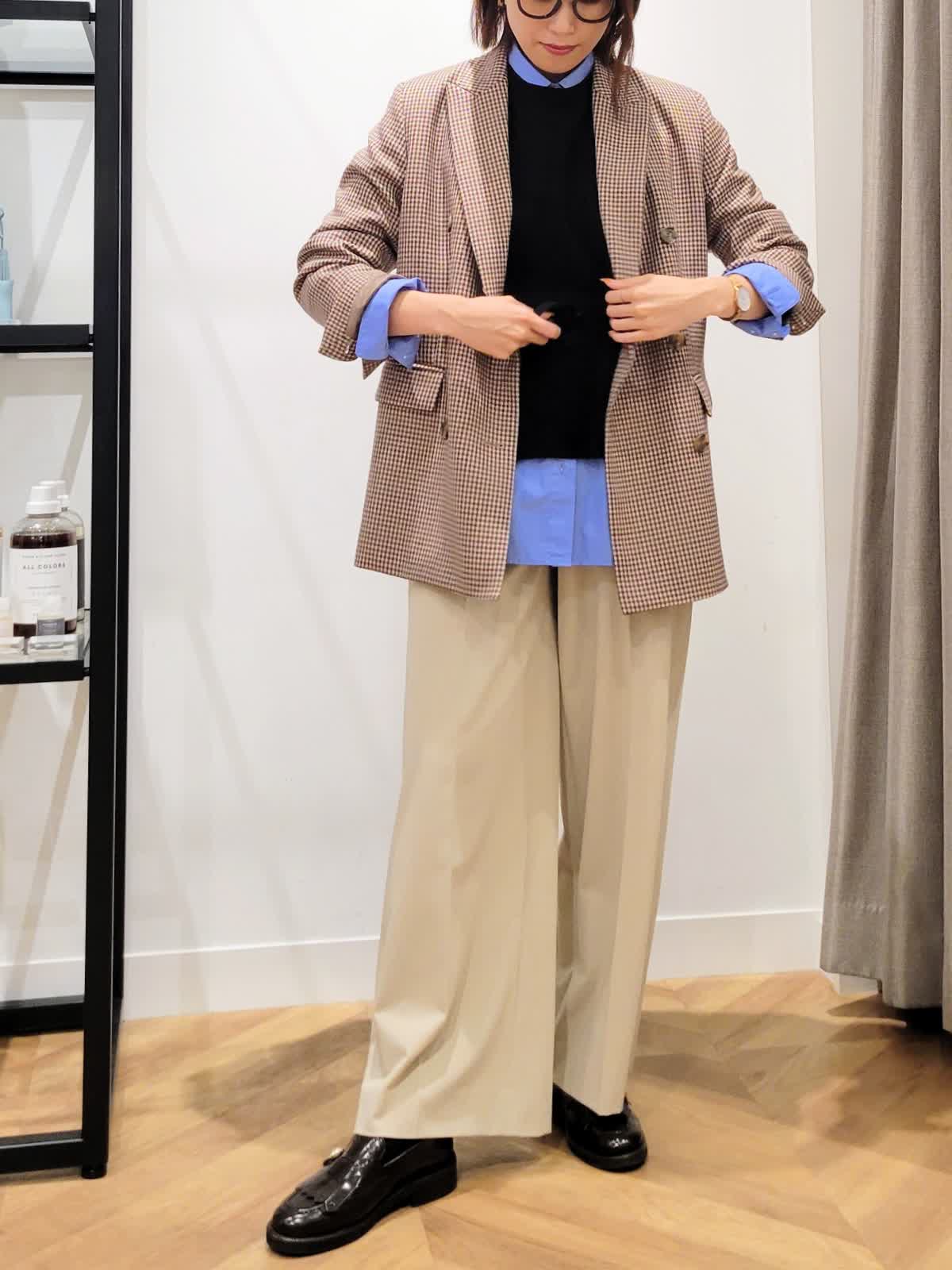 【着用サイズ】ジャケット?柄小?7号 ニット?ブラック?9号 ブラウス?サックス?9号 パンツ:ベージュ:9号 三尋木奈保さんコラボジャケットコーデ。人と差を付けれるチェックのカラーが素敵なメンズライクシルエットジャケット。トラッドっぽく仕上げたかったのでニット×ブラウスのレイヤードスタイルにしてみました。ブラックニットに差し色のブルー。ジャケットに合わせてベージュのワイドパンツをセレクト。シンプルでキメすぎないでもお洒落に見えるコーデ。ニットは洗えるウール。もちろん一枚で着るのも◎是非お試しくださいませ。