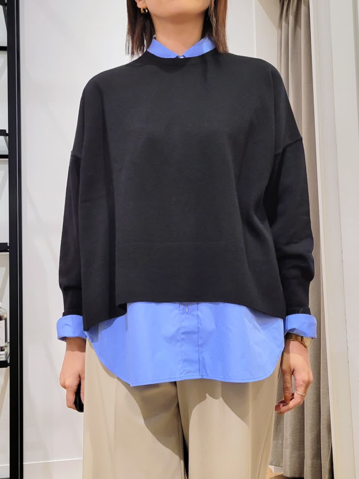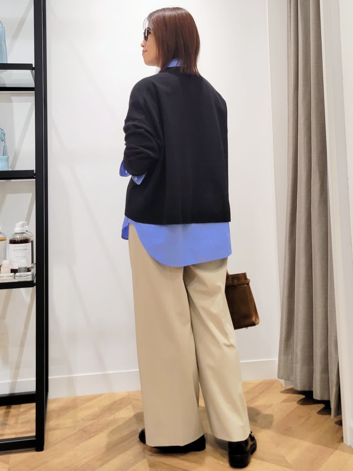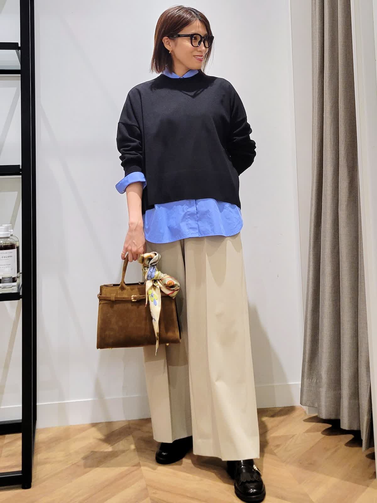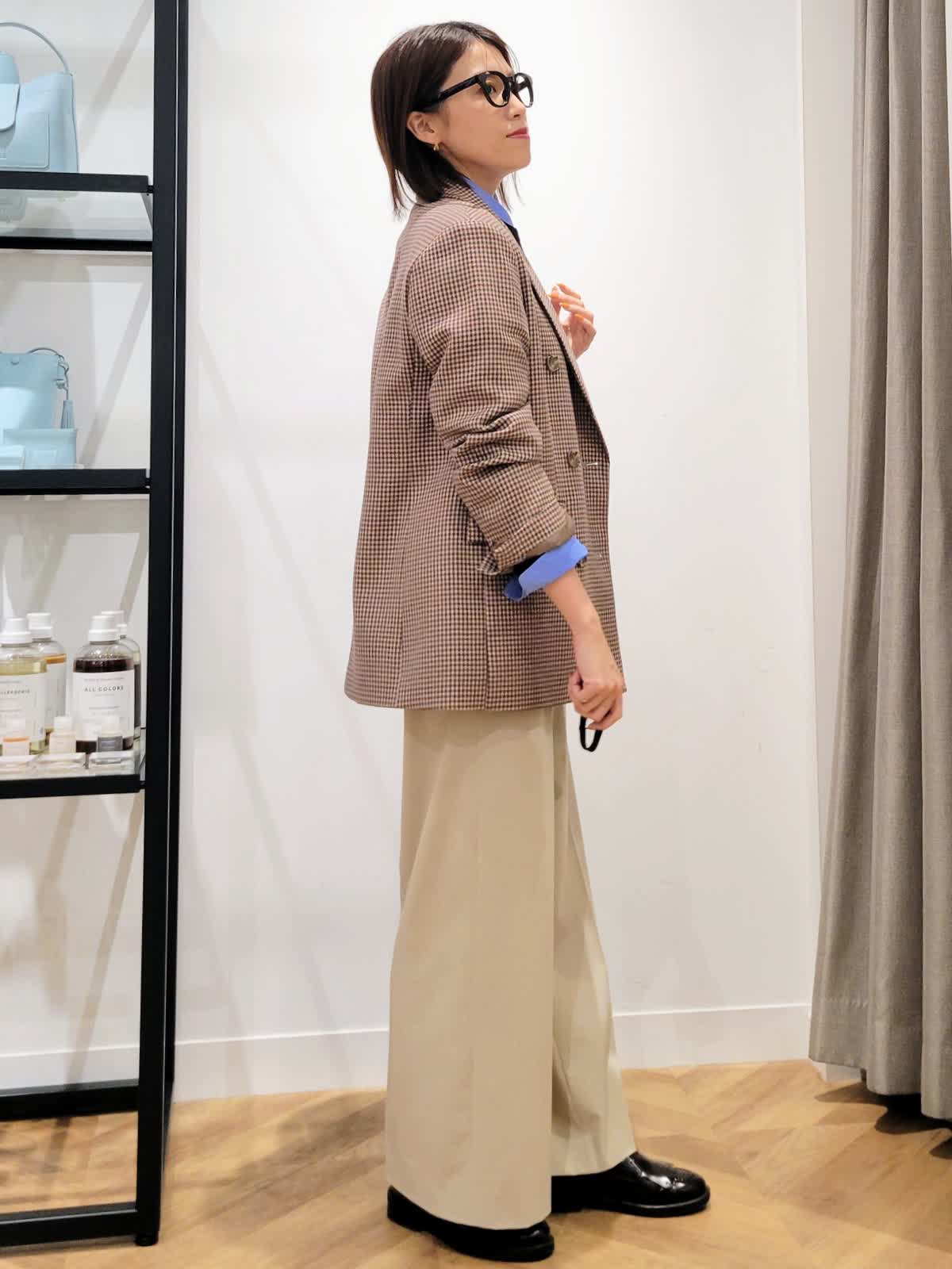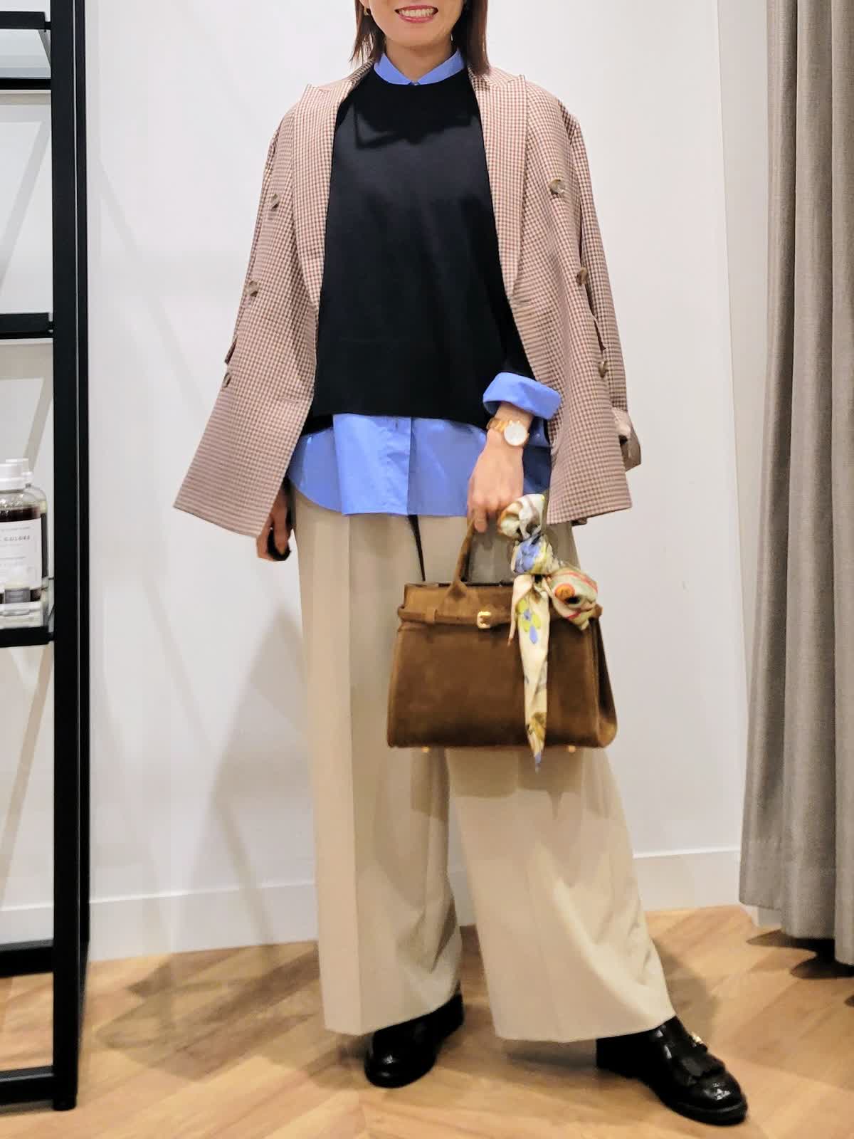 【着用サイズ】ジャケット?柄小?7号 ニット?ブラック?9号 ブラウス?サックス?9号 パンツ:ベージュ:9号 三尋木奈保さんコラボジャケットコーデ。人と差を付けれるチェックのカラーが素敵なメンズライクシルエットジャケット。トラッドっぽく仕上げたかったのでニット×ブラウスのレイヤードスタイルにしてみました。ブラックニットに差し色のブルー。ジャケットに合わせてベージュのワイドパンツをセレクト。シンプルでキメすぎないでもお洒落に見えるコーデ。ニットは洗えるウール。もちろん一枚で着るのも◎是非お試しくださいませ。