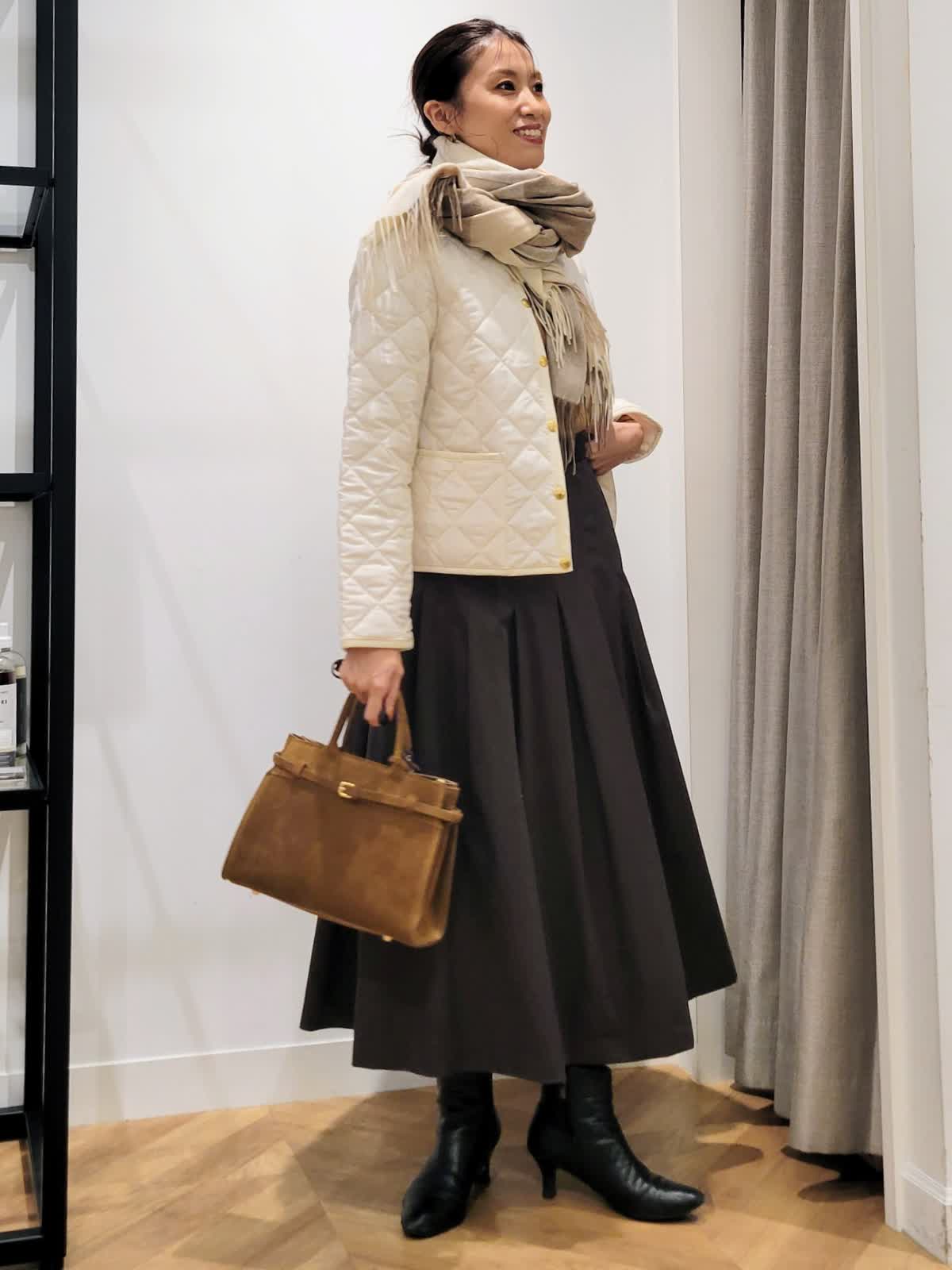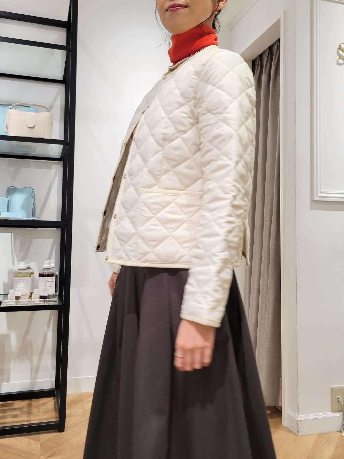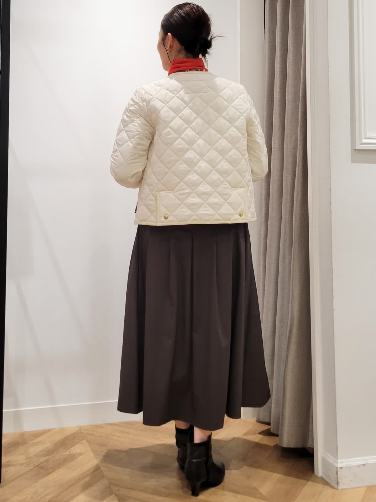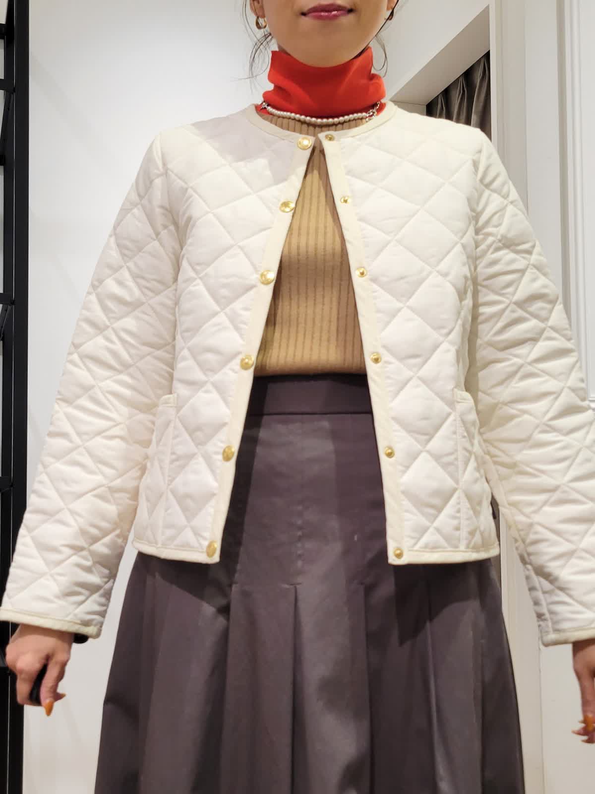 【着用サイズ】ブルゾン?アイボリー?7号 タートルニット?モカチャ?9号 スカート?チャコールグレー?9号 ニット:サックス:9号 カットソー:オフホワイト:9号 あると便利キルティングコーデ。カーデガンとコートの間の時期、困っていませんか?ちょうどいい羽織りのご紹介です。コンパクトな丈感でバランスよくきていただけます。上からコートを羽織ってライナー代わりにも◎オレンジ×モカチャのニットと合わせてみました。スカートはヒップ周りが気になりにくいフレアスカート。珍しいカラーですが使いやすく寒色との組み合わせも素敵です。