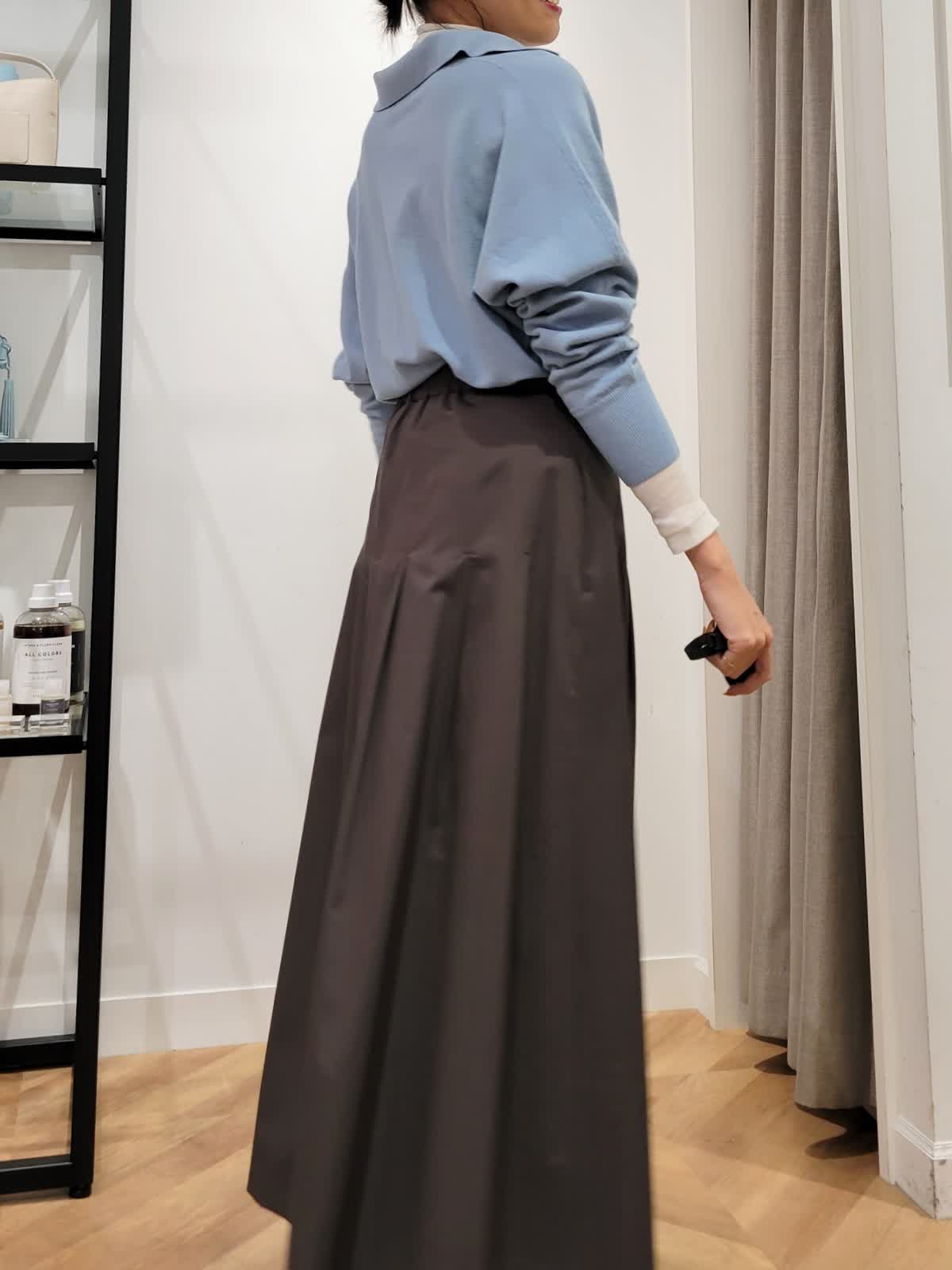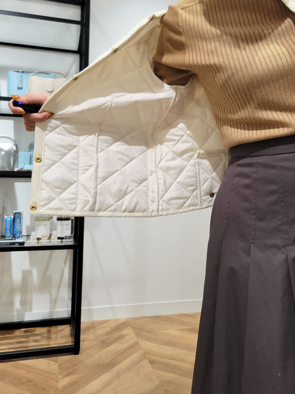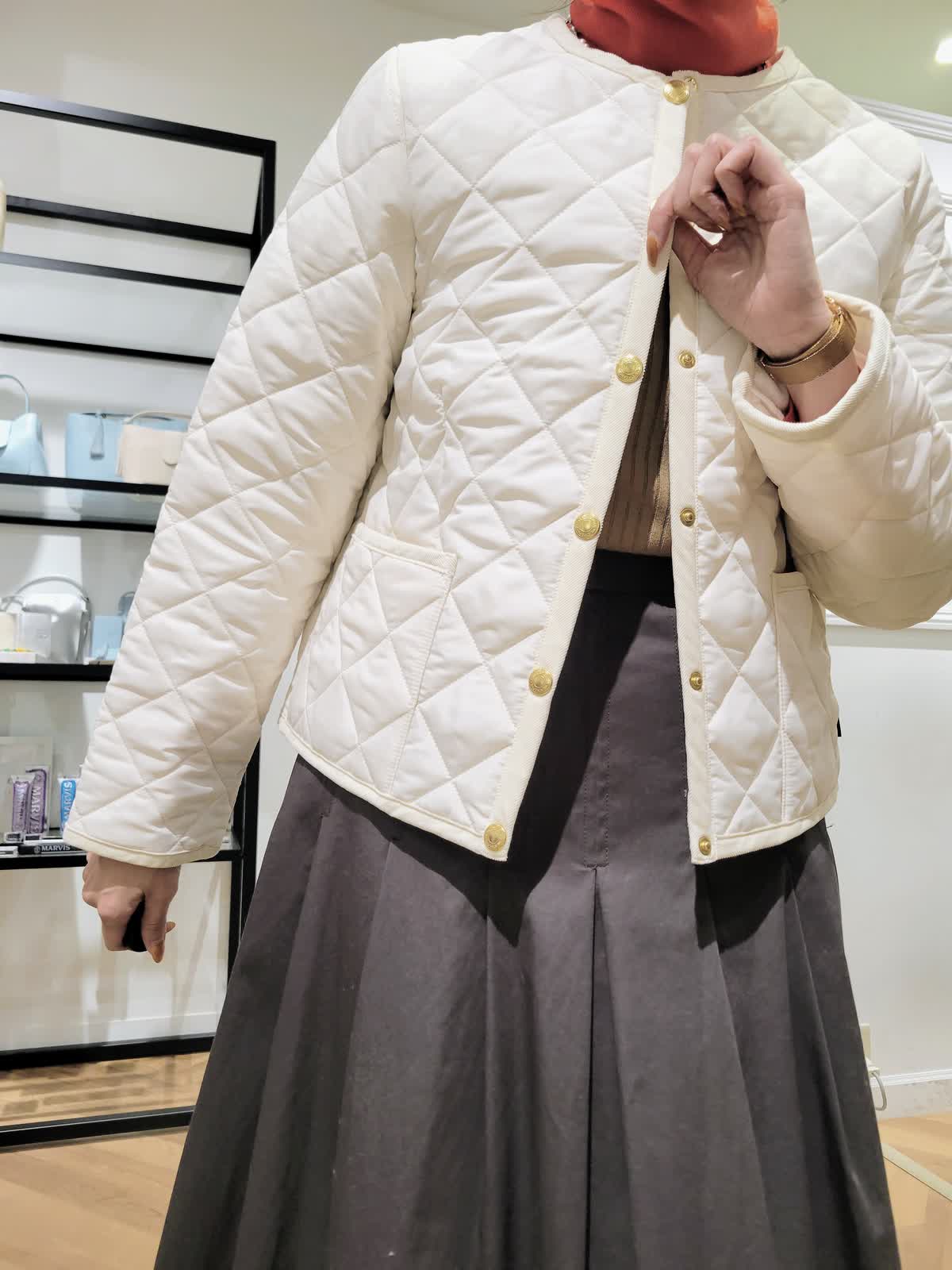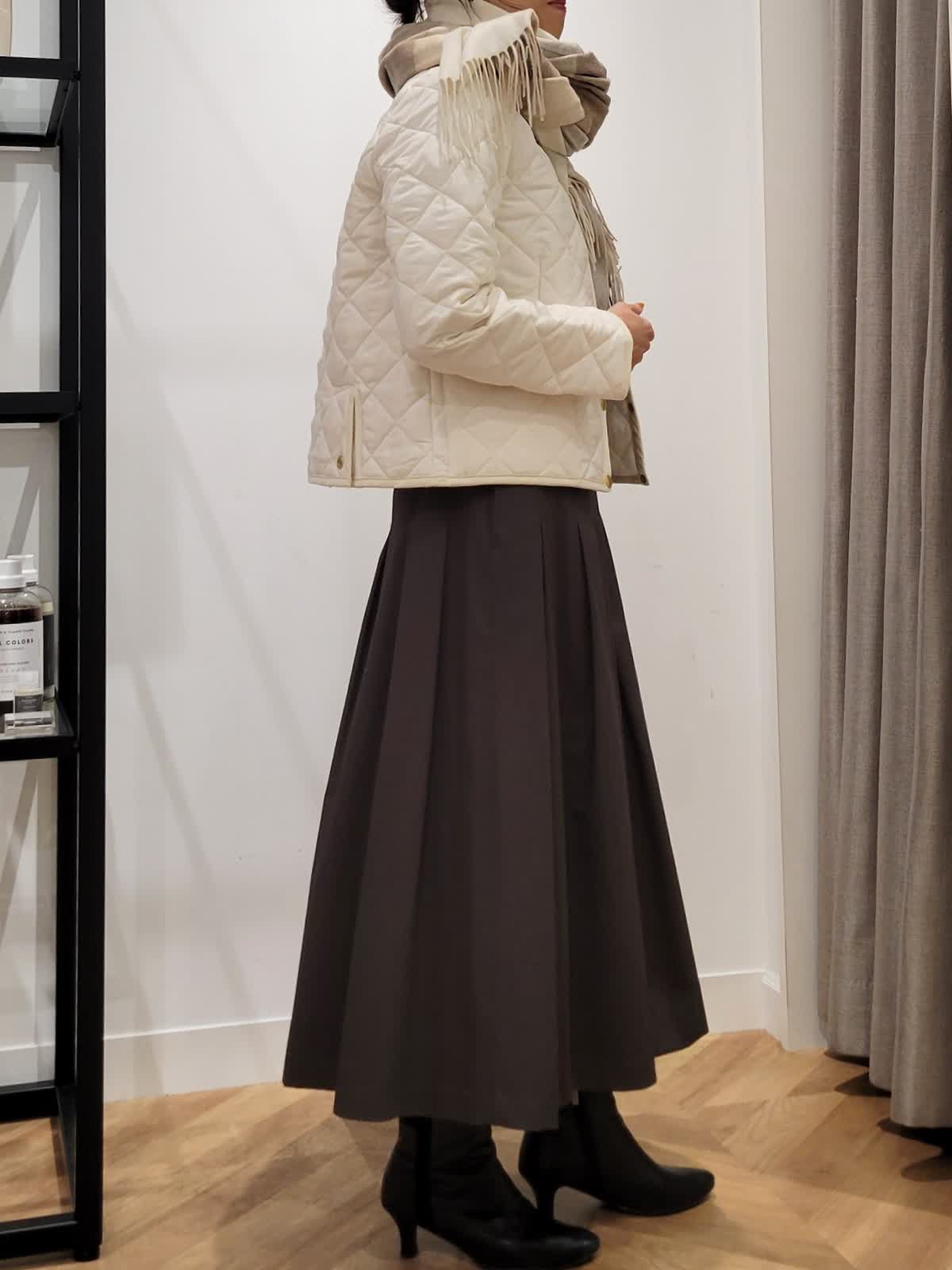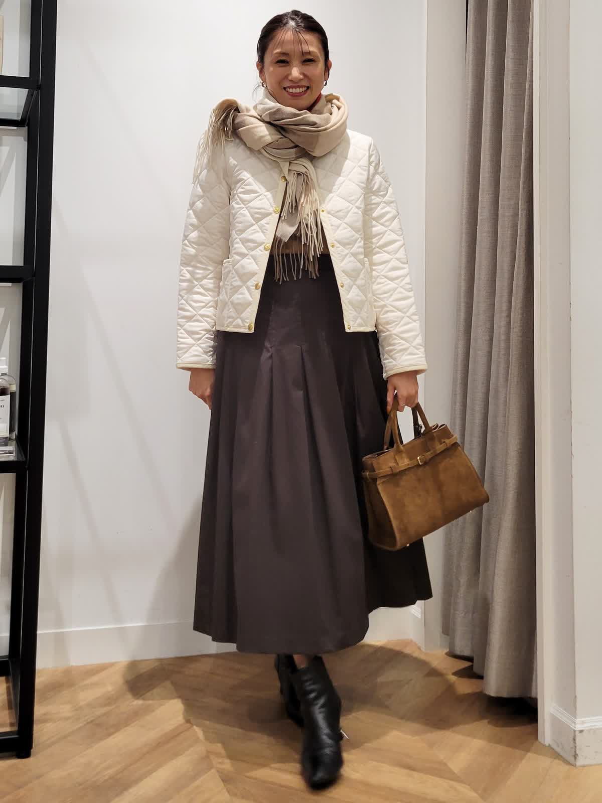 【着用サイズ】ブルゾン?アイボリー?7号 タートルニット?モカチャ?9号 スカート?チャコールグレー?9号 ニット:サックス:9号 カットソー:オフホワイト:9号 あると便利キルティングコーデ。カーデガンとコートの間の時期、困っていませんか?ちょうどいい羽織りのご紹介です。コンパクトな丈感でバランスよくきていただけます。上からコートを羽織ってライナー代わりにも◎オレンジ×モカチャのニットと合わせてみました。スカートはヒップ周りが気になりにくいフレアスカート。珍しいカラーですが使いやすく寒色との組み合わせも素敵です。