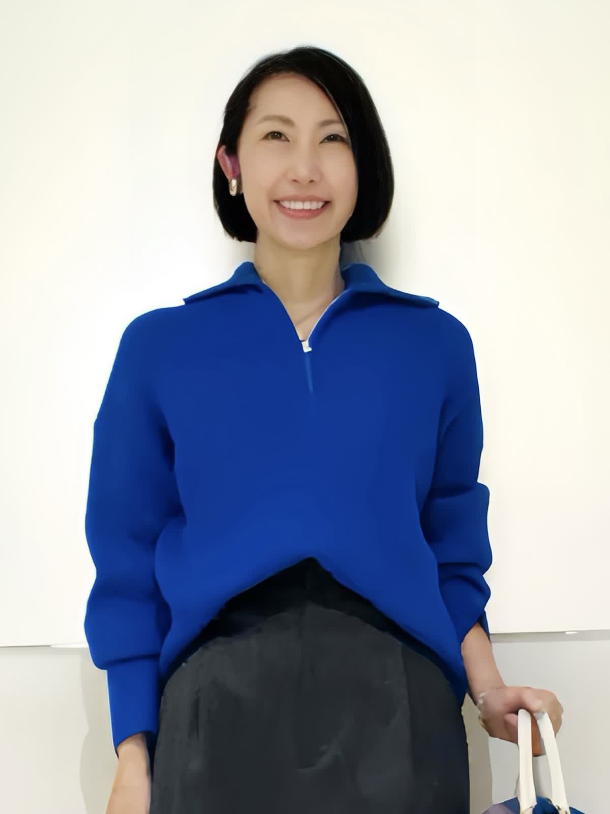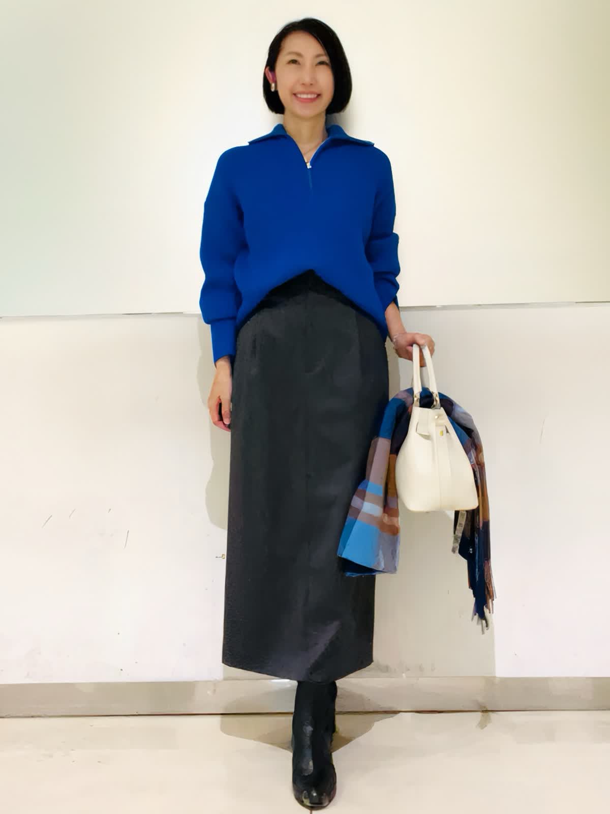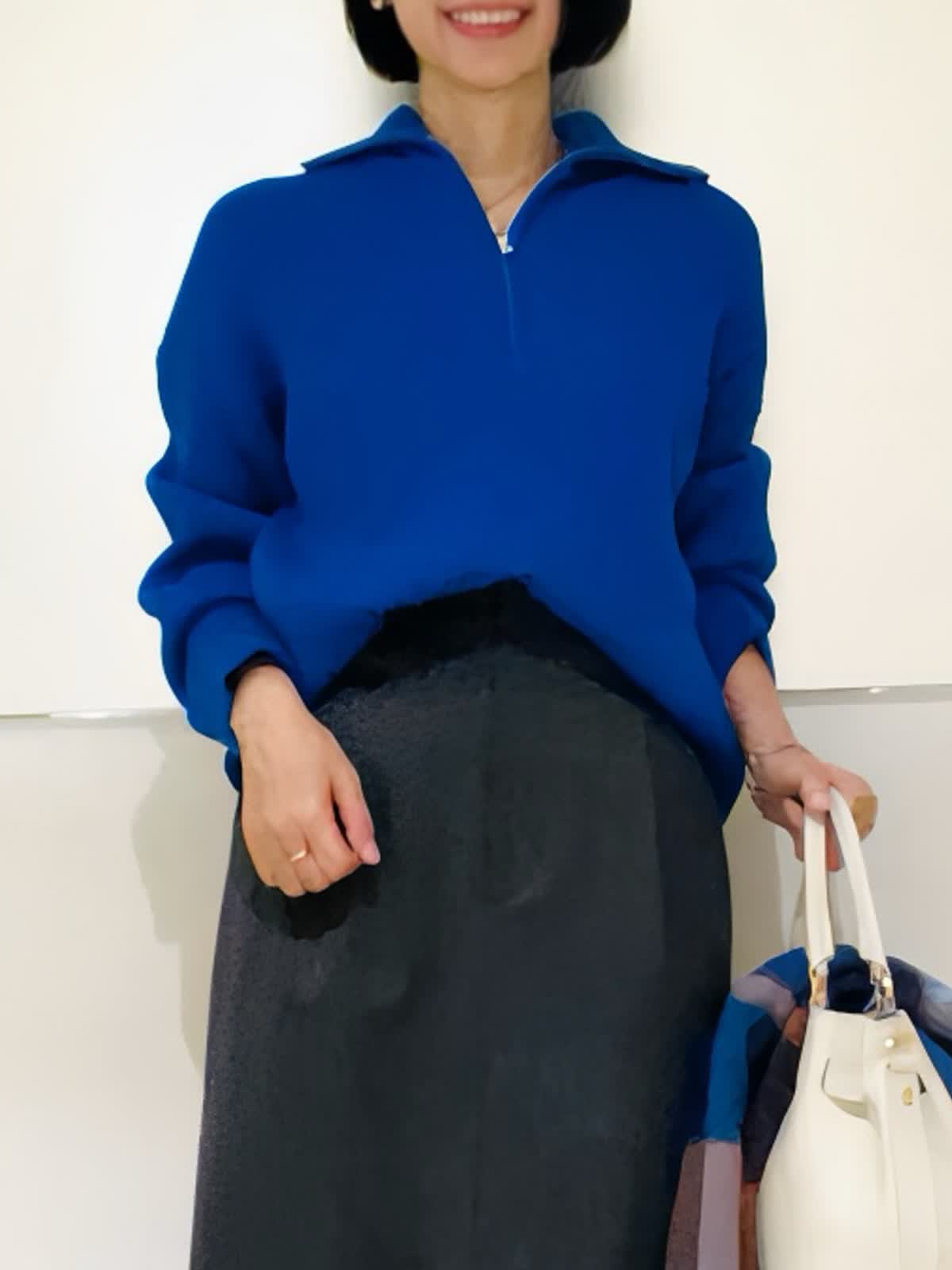 【着用アイテム】すべて9号 【着用カラー】ニット:ブルー スカート:チャコールグレー 旬顔になれるトレンドのジップニット。ざっくりとした編み地がリュクス感があります。高見えするゴールドジップで、胸元の開きが調節出来ます。スポーティなテイストのニットに、女性らしいタイトスカートを合わせた大人のこなれスタイリングです。