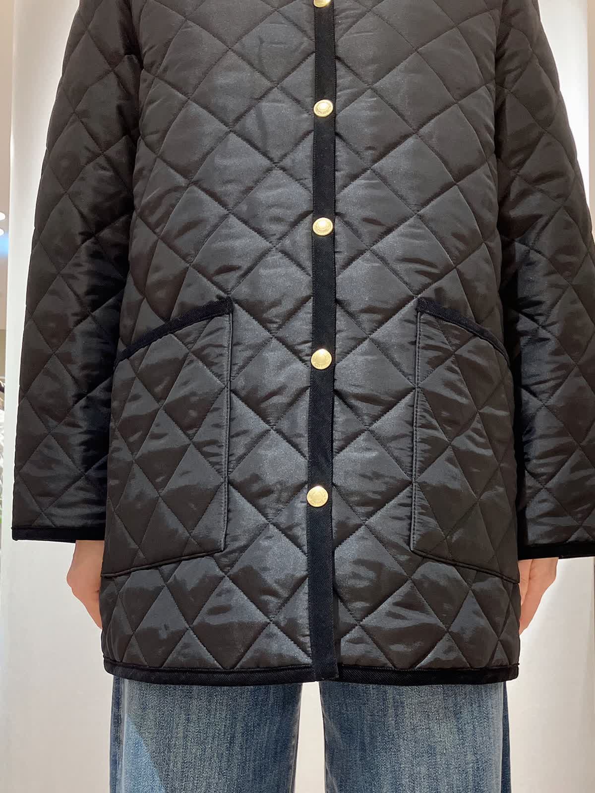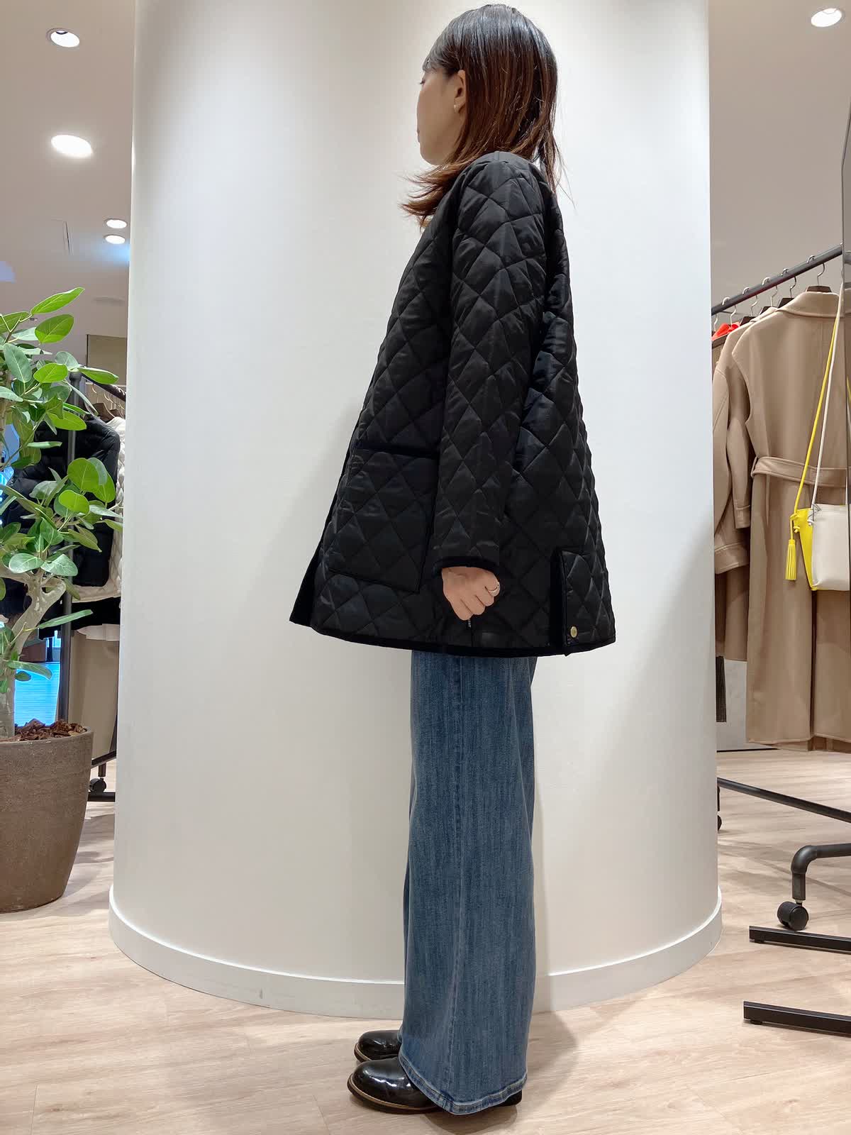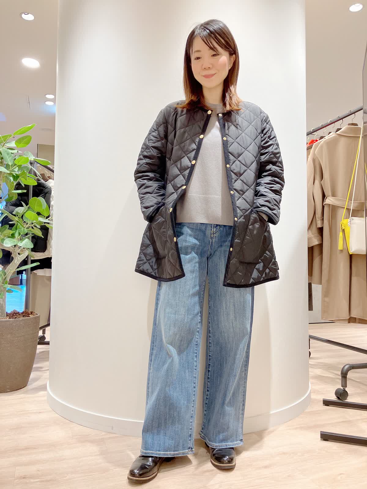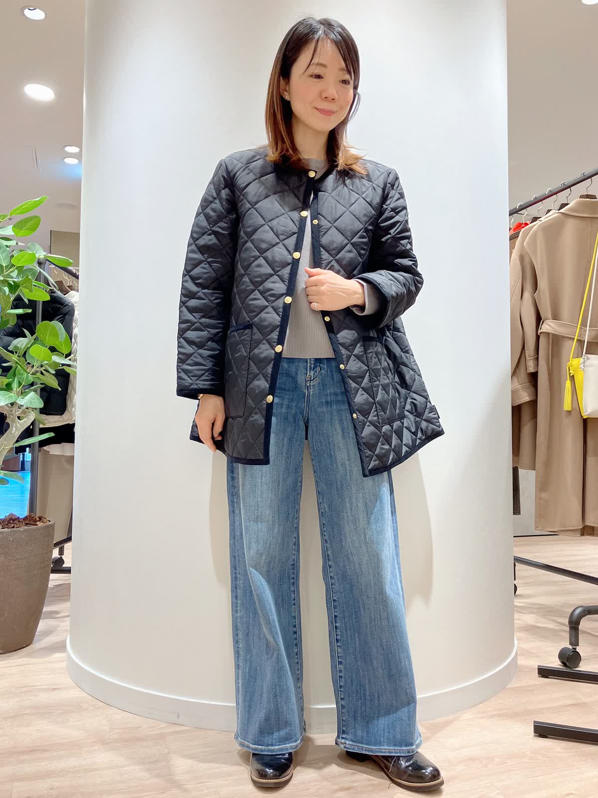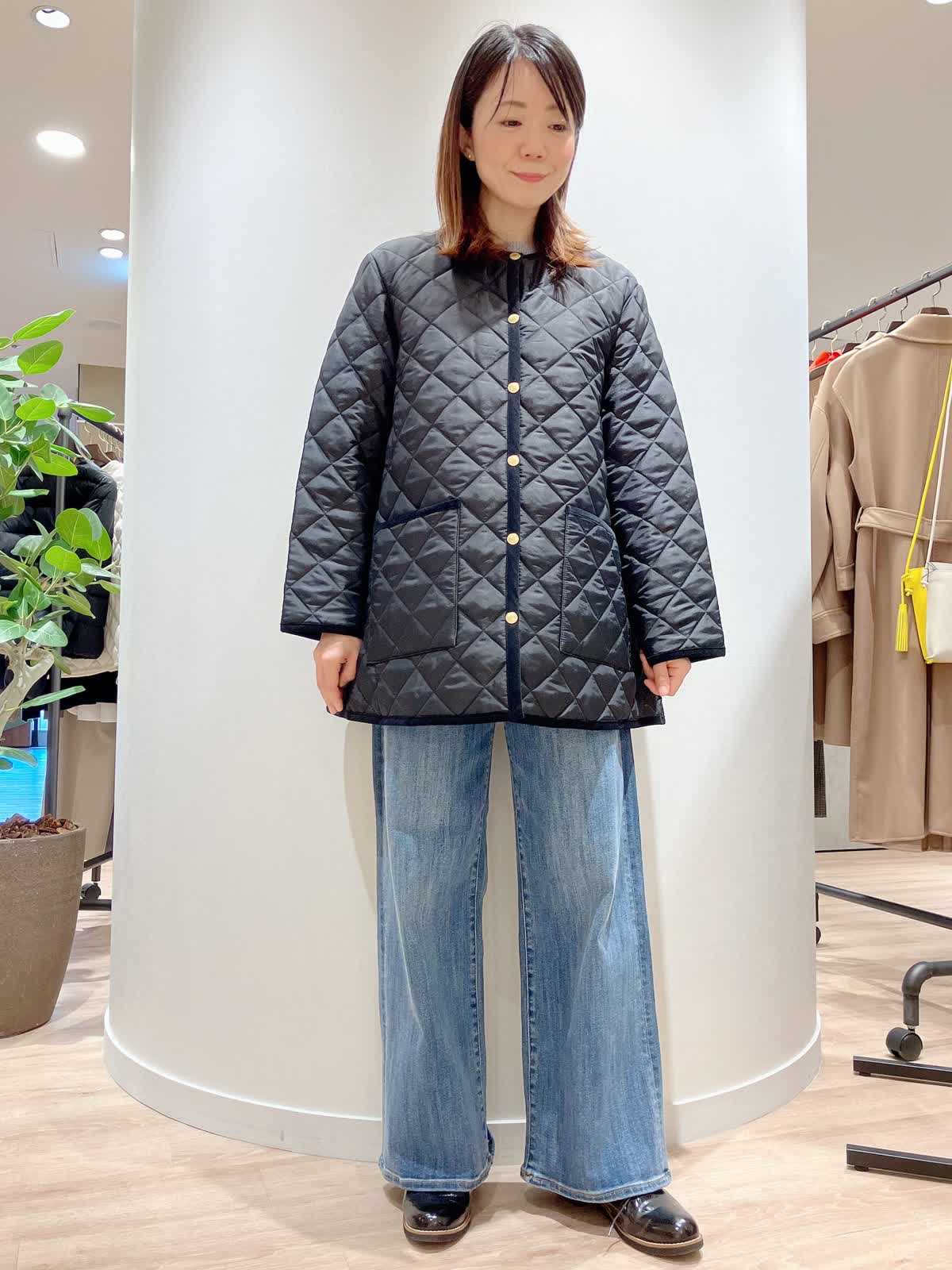 【着用サイズ】コート:7号 ニット:9号 パンツ:7号 【着用カラー】コート:ブラック ニット:グレー パンツ:サックス コーディネートのテーマは今、ジャストのコートスタイリングです。 トラディショナルウェザーウェアのキルティングコートは、ゴールドのボタンや、パイピングにこだわった上品な1着。トレンドのワイドデニムのシンプルなコーディネートもさまになります。 軽くて、暖かく、綺麗めカジュアルどちらのコーディネートにも合う、冬の万能アイテムです。