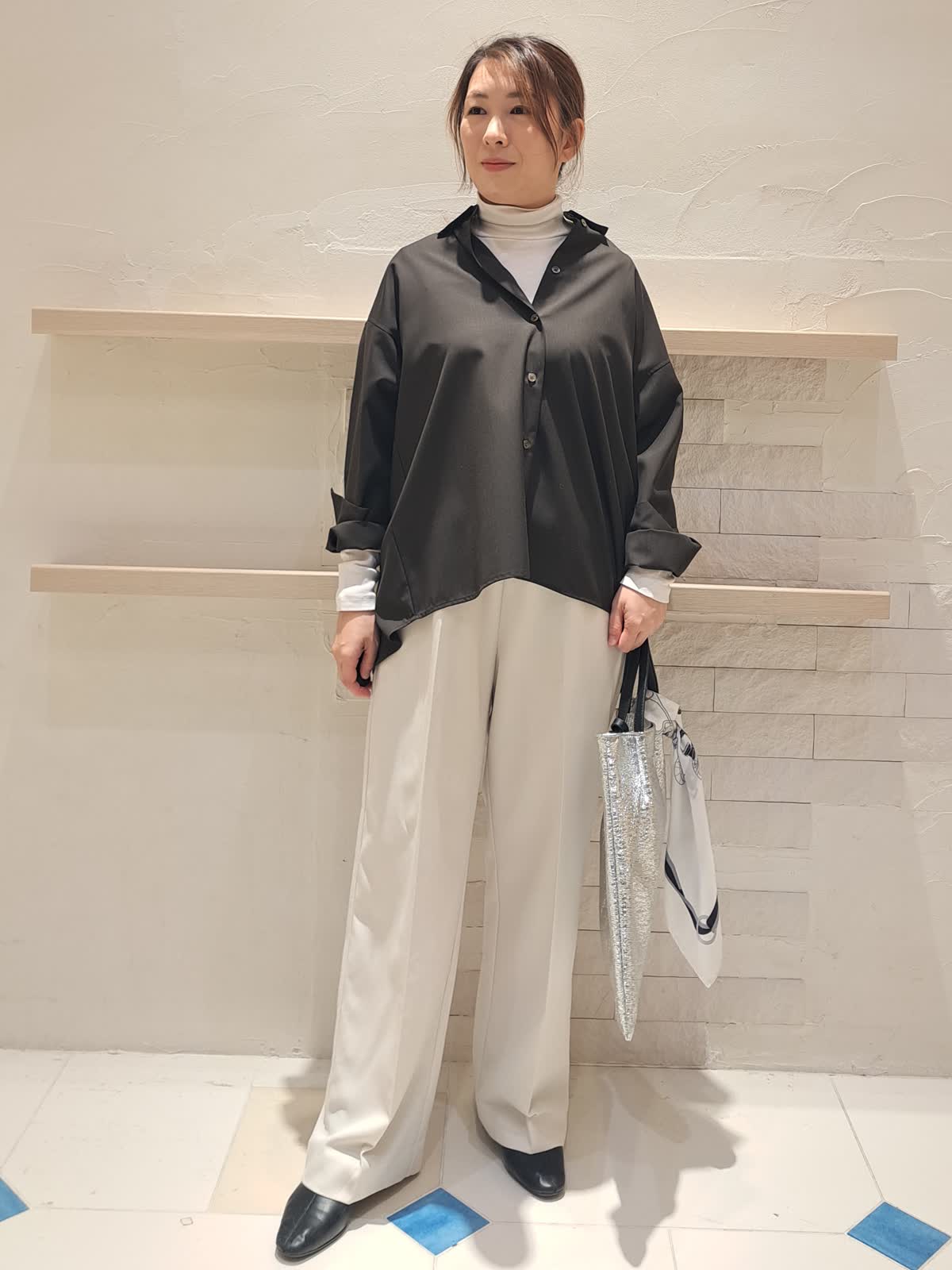 【着用サイズ】ブラウス:フリー パンツ:9号 インナー:9号 バッグ:フリー 【着用カラー】ブラウス:ブラウン パンツ:オフホワイト インナー:グレー バッグ:シルバー オフィスカジュアルコーディネート 毛100%の上品ブラウスとシワになりにくく履きやすいパンツを合わせました。小柄な方にもオススメのきれいめカジュアルコーディネートです。