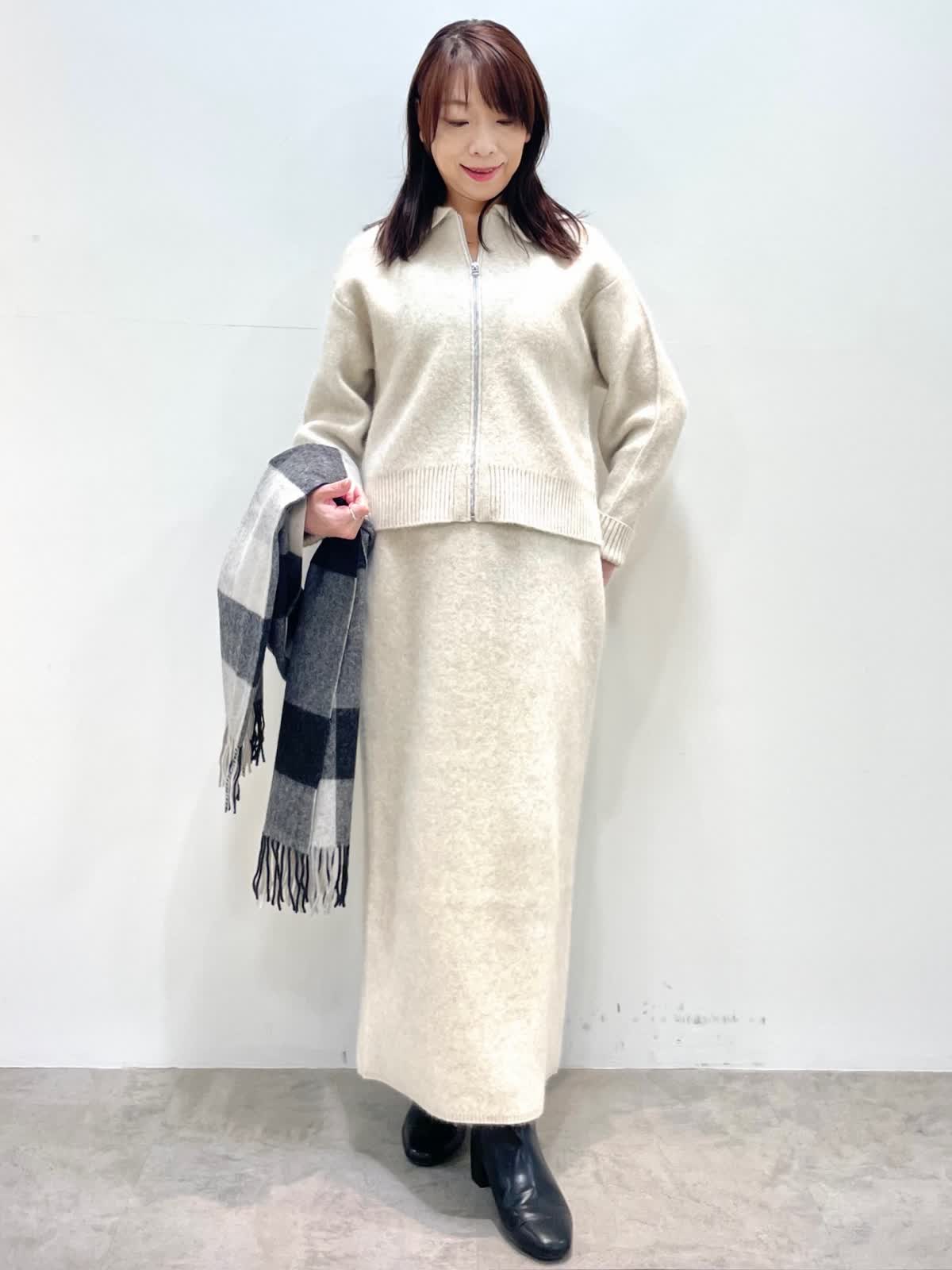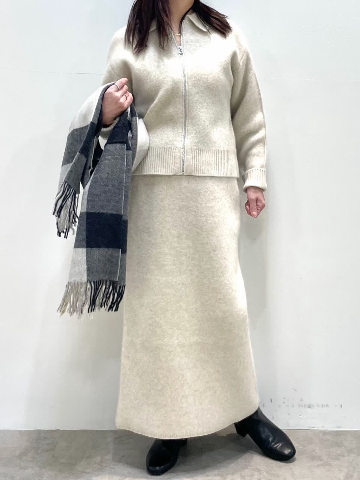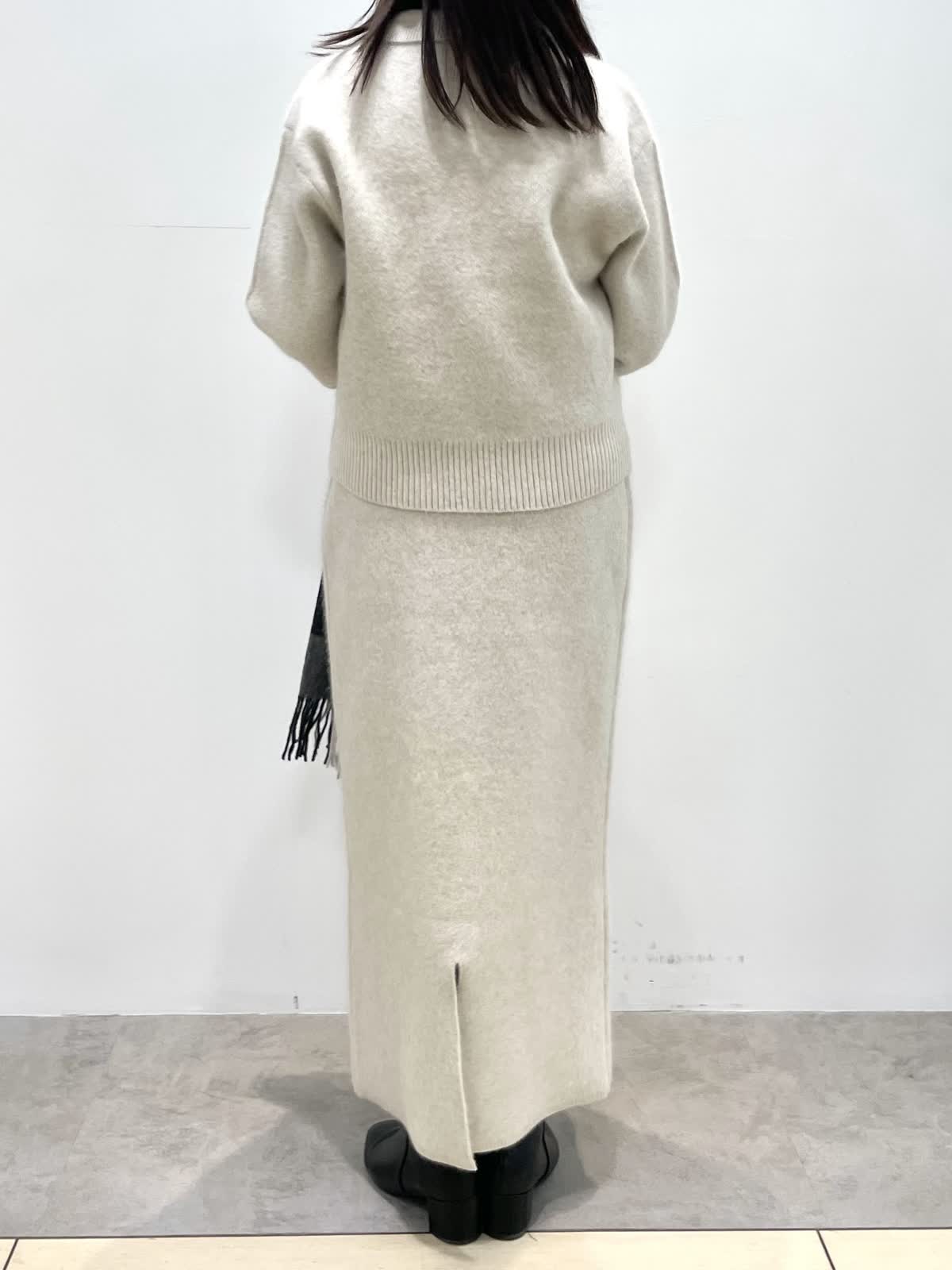 【着用サイズ】全て9号 【着用カラー】ニット:スカート: アイボリー 大人カジュアルスタイル。肌ざわりが優しいフォックスをミックスしたセットアップ。ジップカーディガンはゆったり過ぎない程よいサイズ感で、1枚着としても着回しがしやすいです。スカートはすっきりとしたシルエットながら、しっかりとした編地なので身体のラインを拾いません。後ろにスリットがあり動きやすいです。